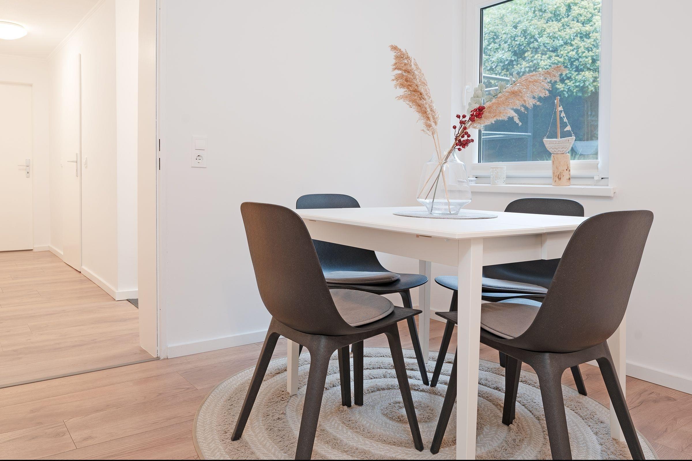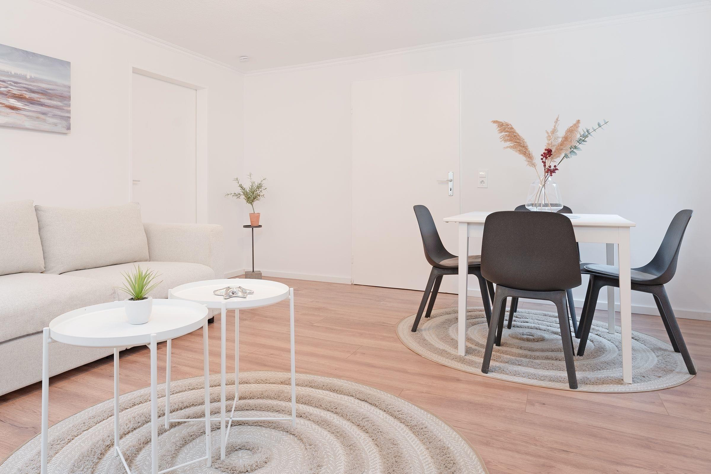 Im hellen und modernen Wohnzimmer erwartet Sie eine gemütliche Schlafcouch (140x200 cm) und Essbereich, der zum gemeinsamen Essen oder Spiele-Abenden einlädt. Ein Flachbild-TV sowie kostenfreies WLAN sorgt für weitere Unterhaltung. Lieber raus an die frische Luft? Im gepflegten Gemeinschaftsgarten können Sie zahlreiche Sonnenstunden genießen.