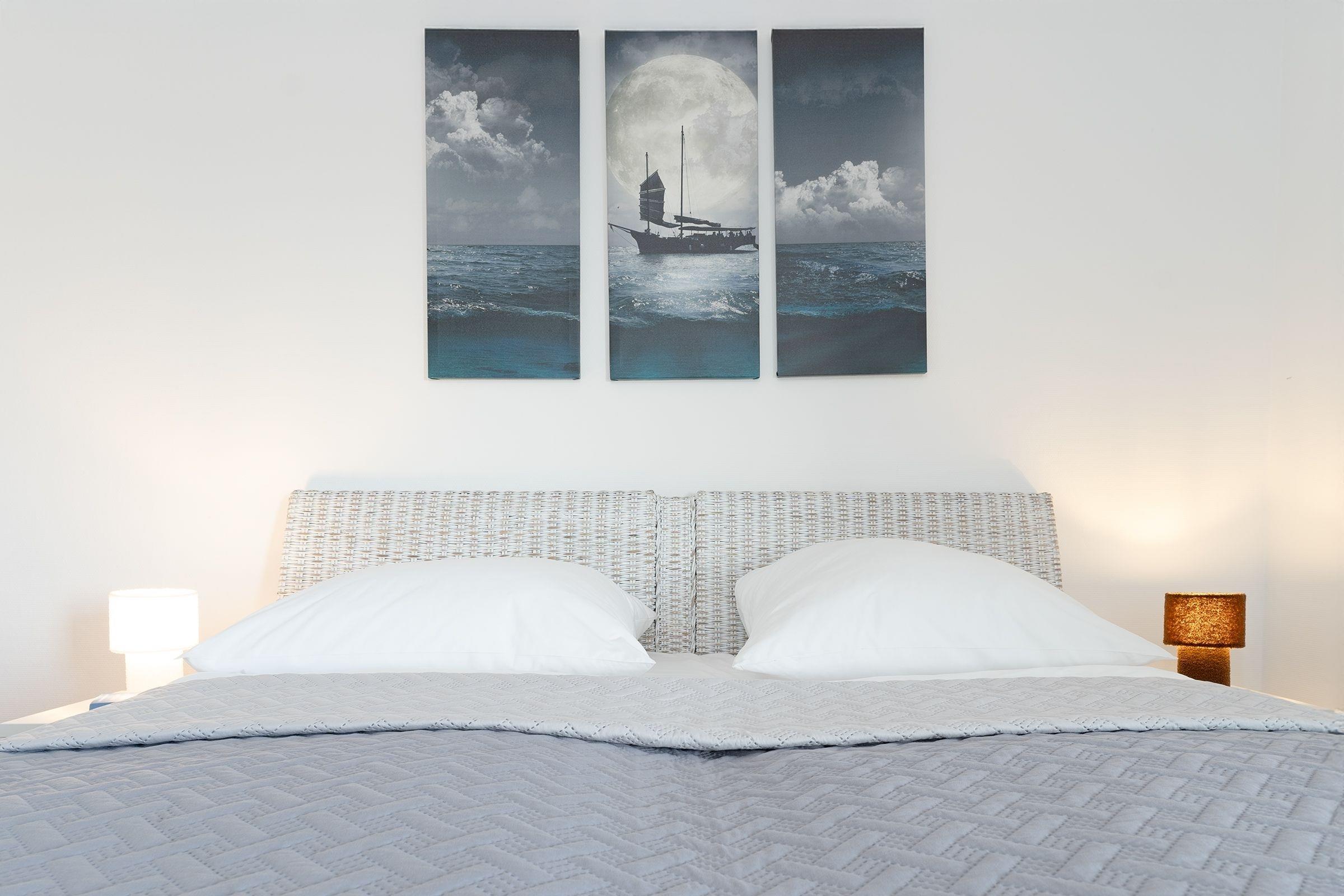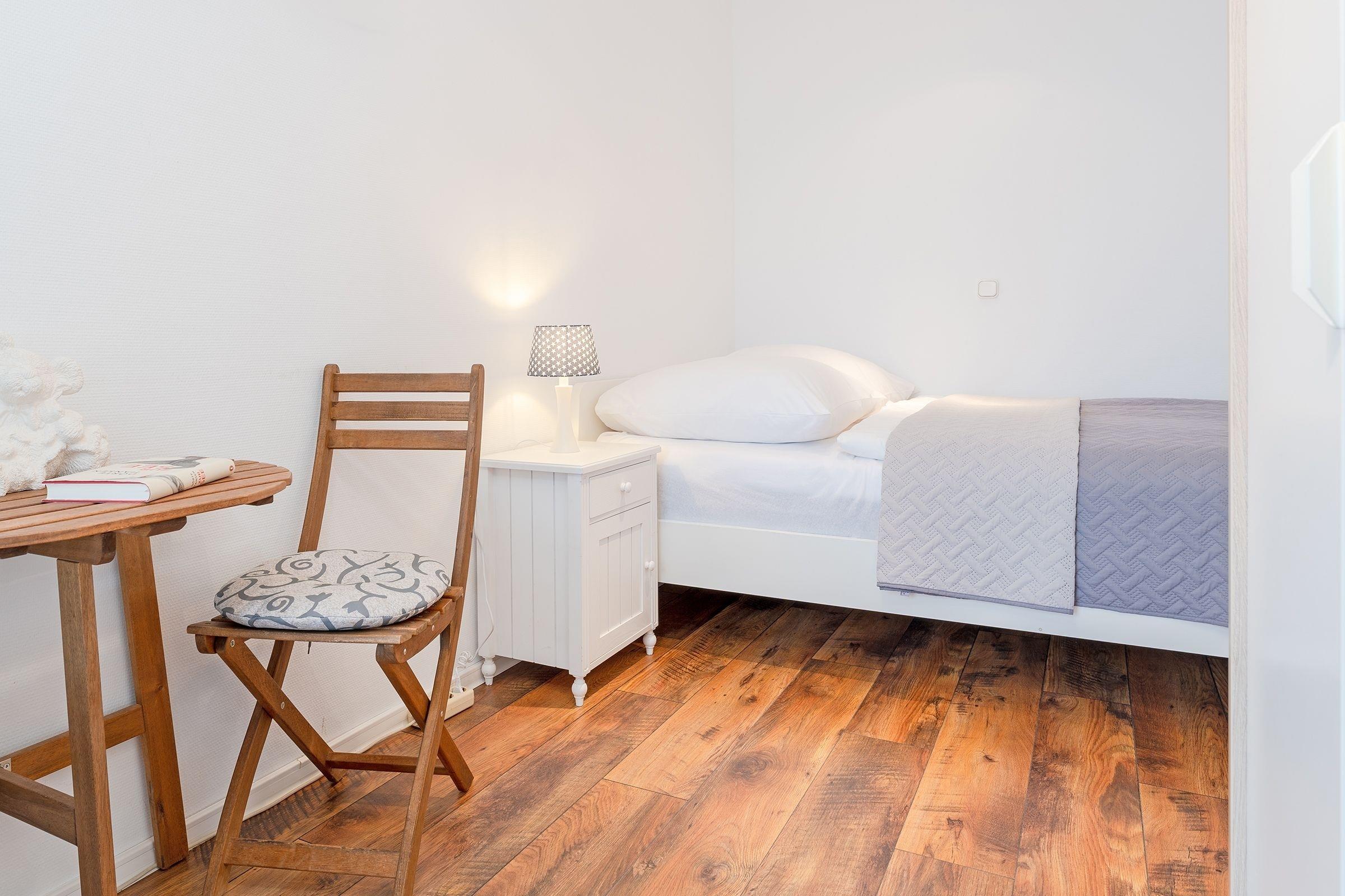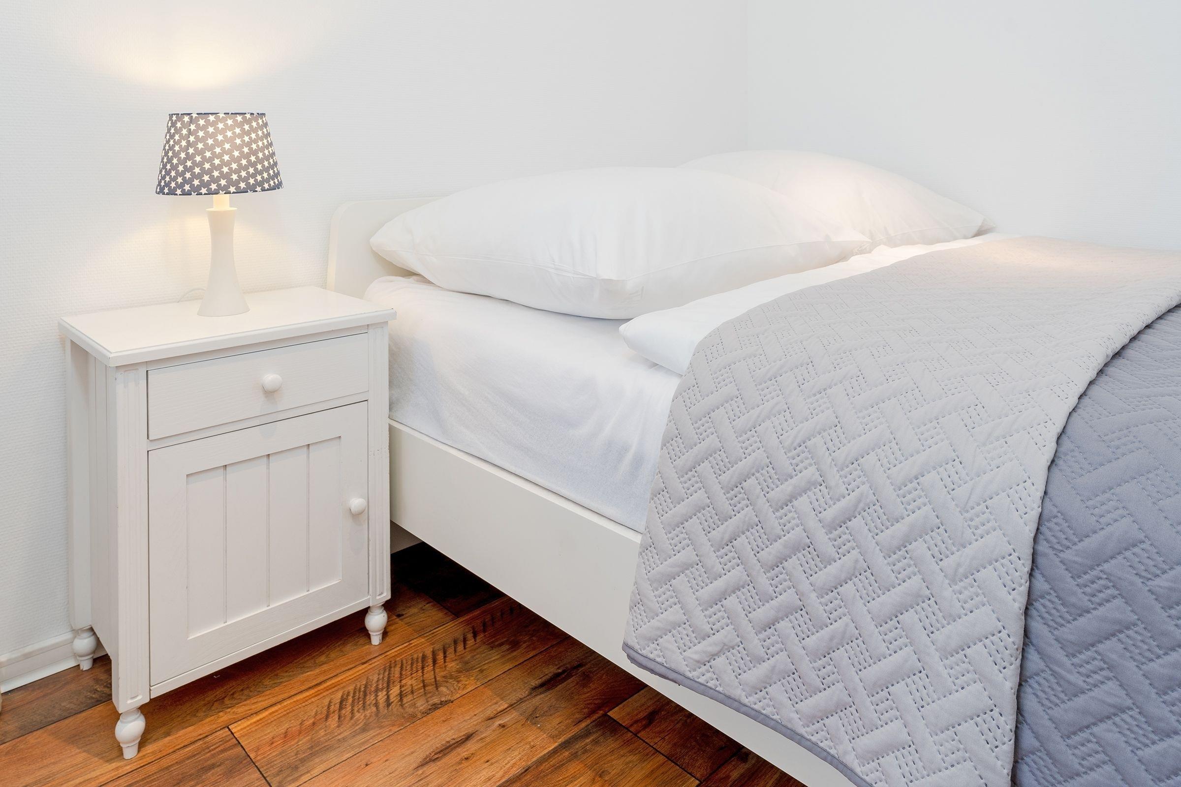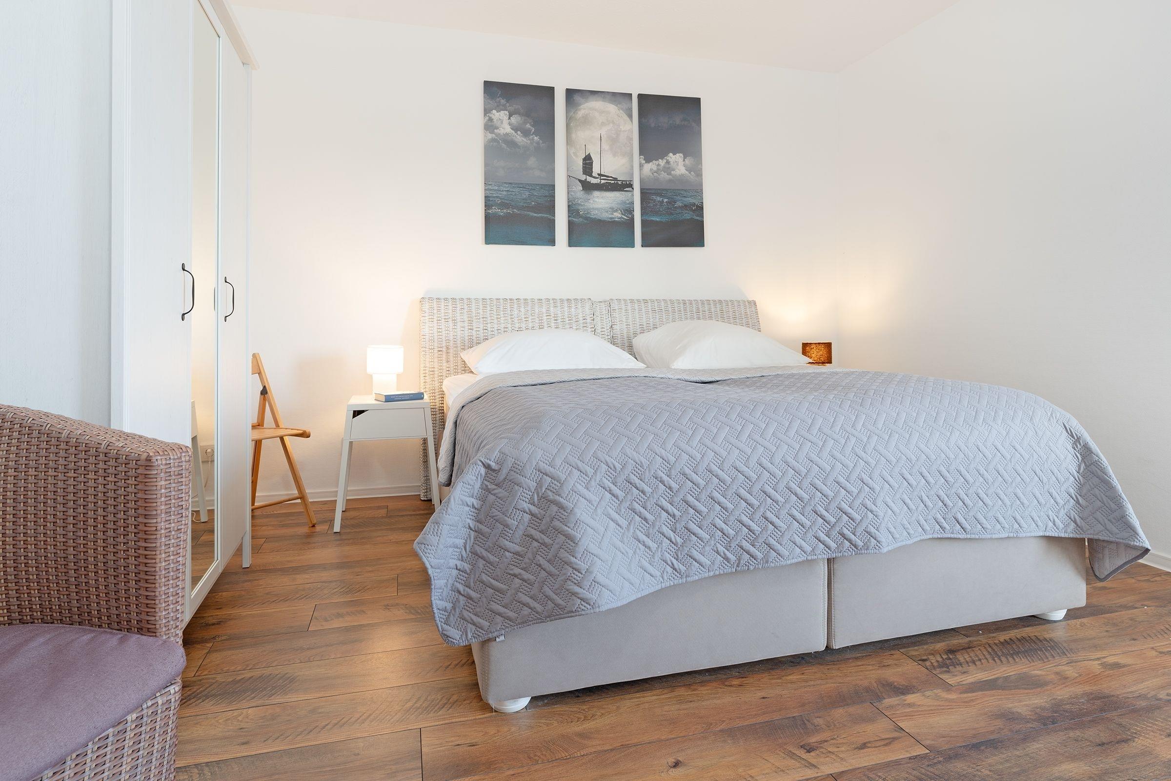 Schlafzimmer 1: 1 Boxspringbett (180x200 cm), Kleiderschrank, Verdunkelung: Vorhang, Platz für ein Babybett vorhanden