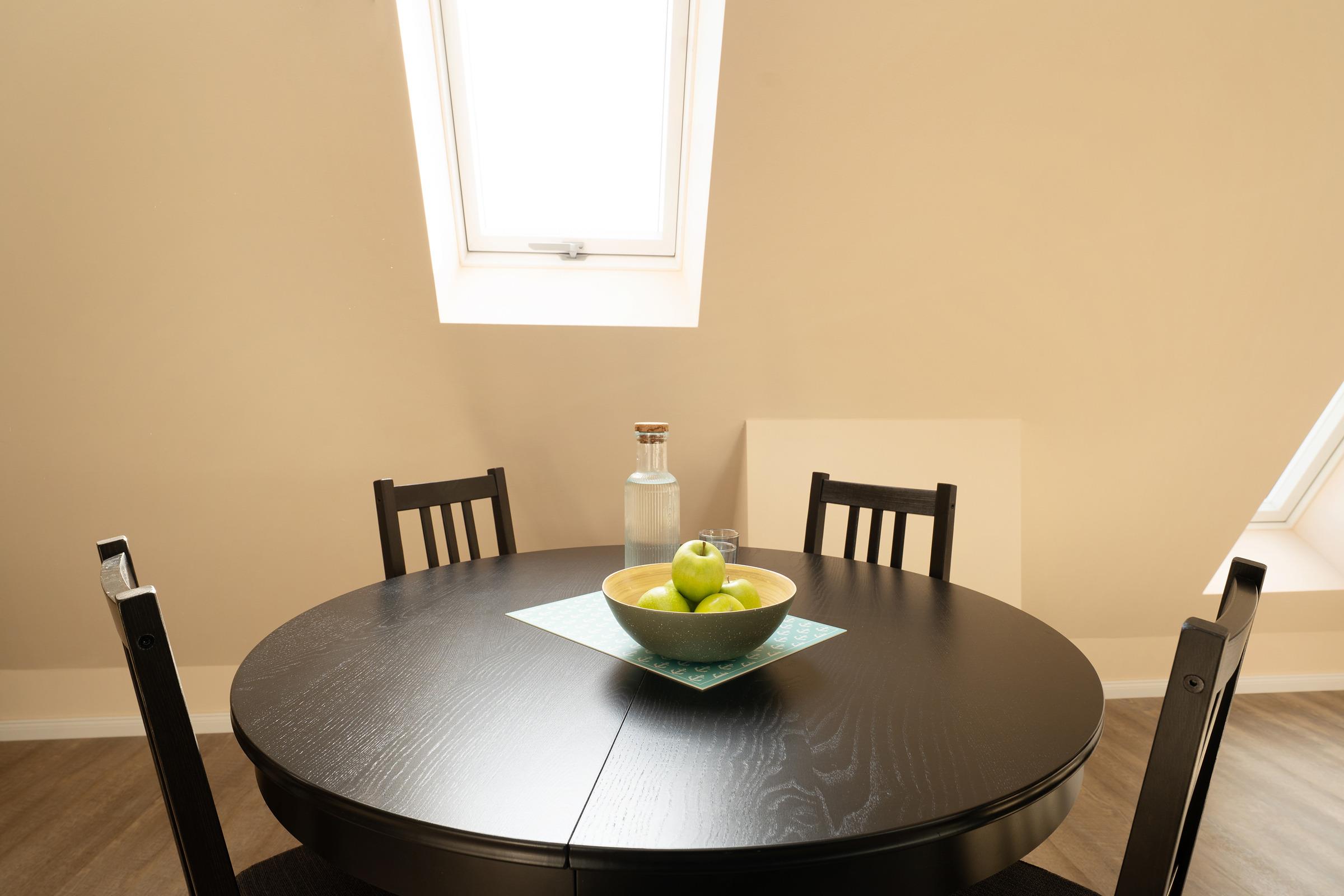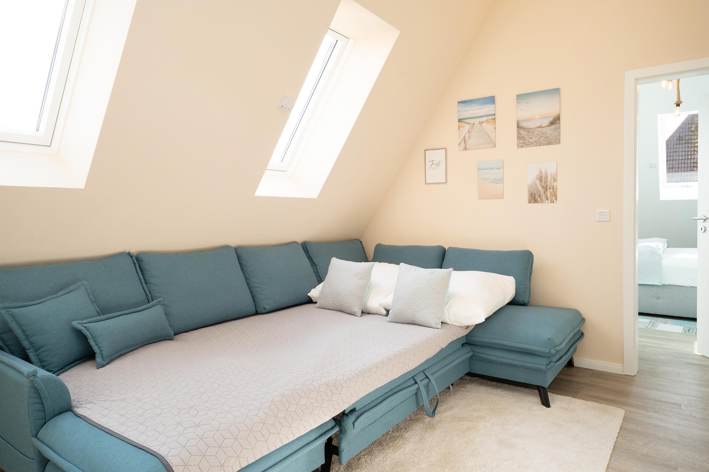 Der lichtdurchflutete Wohnbereich überzeugt mit einem gemütlichen Sofa, TV und Radio. Große Fenster sorgen für ein angenehmes Raumgefühl und Sichtschutz für Privatsphäre. Der offene Küchen- und Essbereich grenzt direkt an das Wohnzimmer und ist mit Induktionsherd, Backofen, Kühlschrank mit Gefrierfach, Mikrowelle, Spülmaschine, Toaster, Wasserkocher und Senseo-Kapselmaschine umfassend ausgestattet.