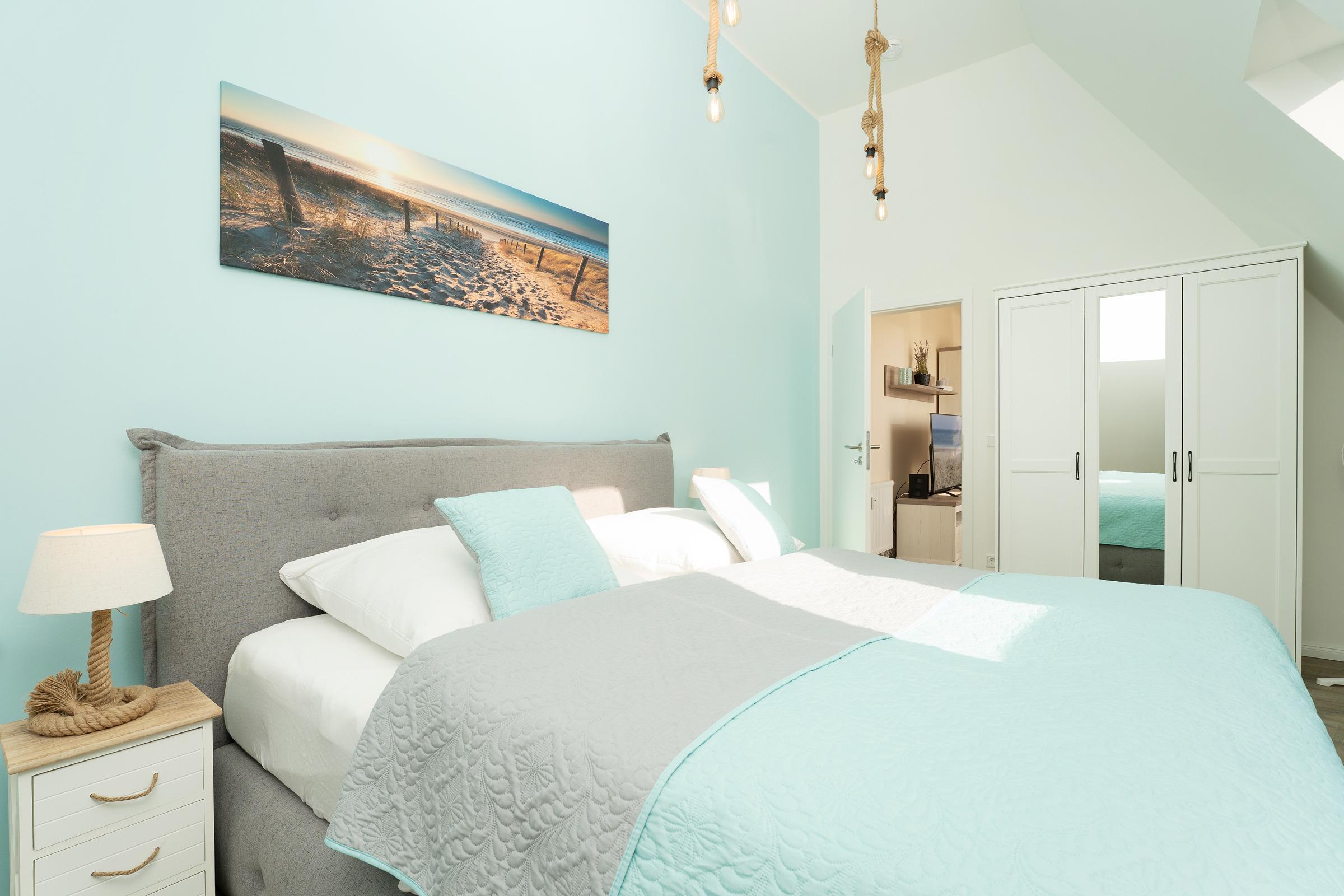 Schlafzimmer: 1 Doppelboxspringbett (180x200 cm), Kleiderschrank, TV, Verdunkelung: Rollläden, Platz für ein Babybett vorhanden