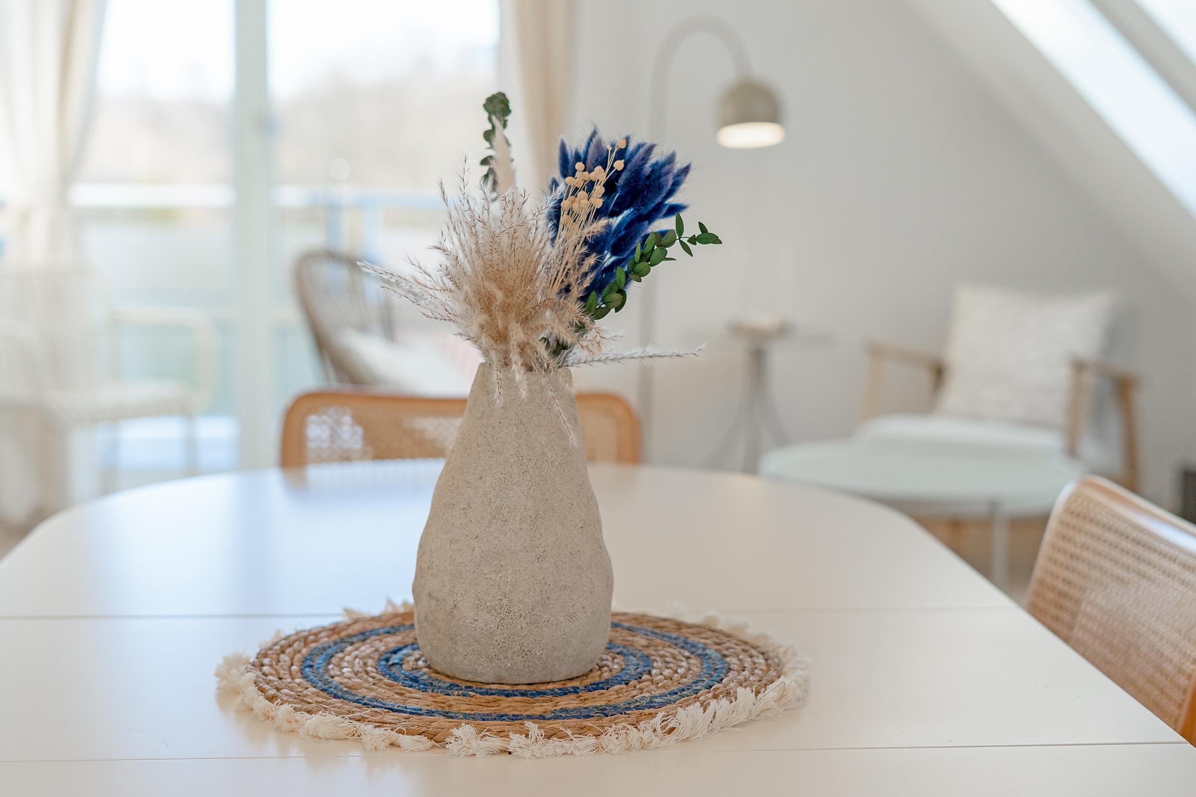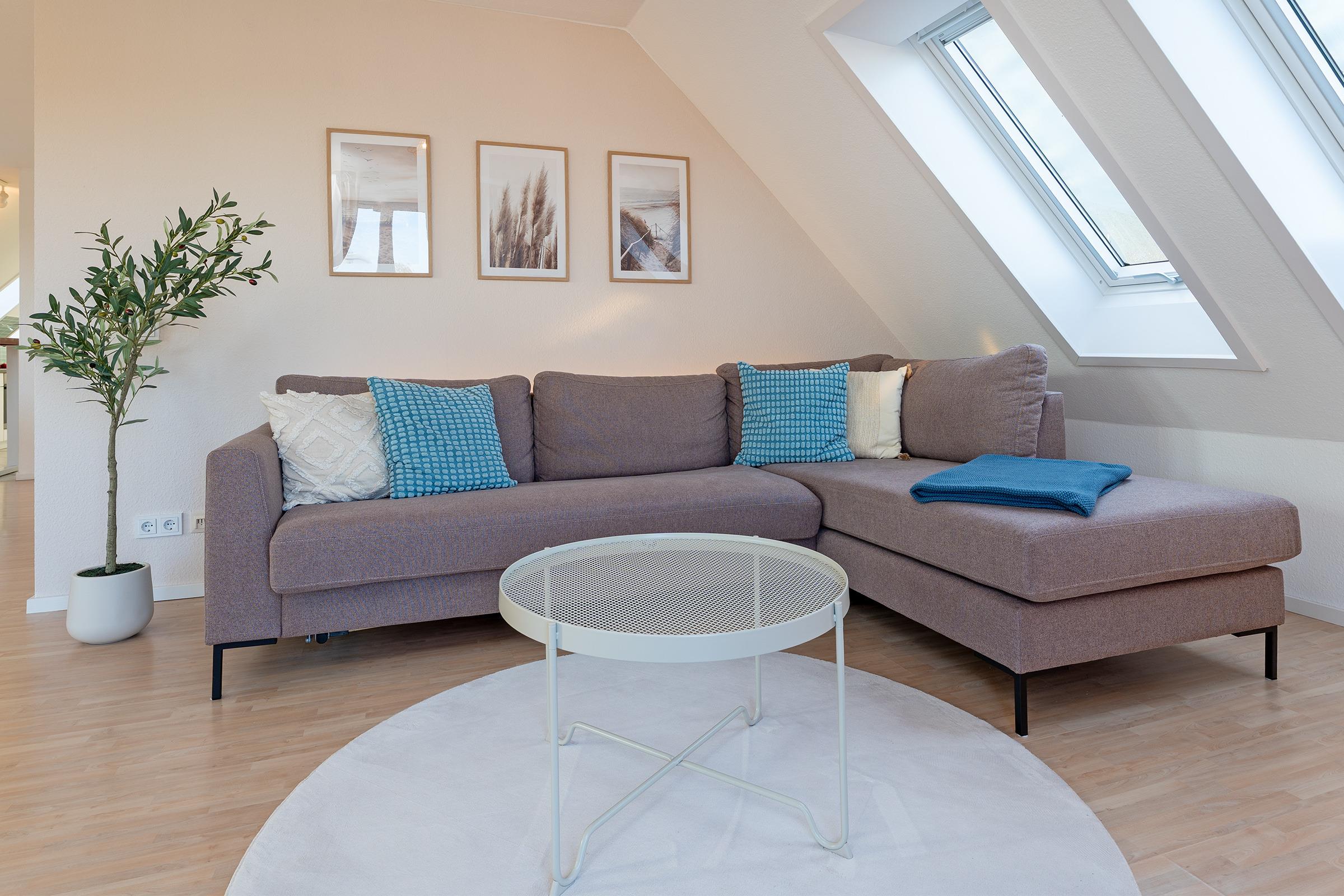 Das Herzstück der Wohnung bildet der helle Wohnbereich mit komfortablem Schlafsofa, Flachbild-TV und gemütlicher Sitzecke, die zu entspannten Stunden einlädt. Ein Elektrokamin rundet das gemütliche Ambiente ab. Vom Wohnzimmer aus gelangen Sie auf den 3m² großen Balkon mit Südwest-Ausrichtung, der für sonnige Stunden sorgt – bitte beachten Sie, dass Grillen hier nicht gestattet ist. Die angrenzende, moderne Küche ist bestens ausgestattet mit Backofen, Geschirrspülmaschine, Kühlschrank, Herd sowie einer Nespresso-Kapselmaschine und einem Airfryer – ideal, um sich im Urlaub selbst zu versorgen. Zwei separate Schlafzimmer mit Doppelbetten sorgen für erholsame Nächte. Die Wohnung verfügt über zwei Badezimmer, beide ausgestattet mit Dusche (Einstiegshöhe ca. 37 cm), WC und Haartrockner. Für Familien mit Kleinkindern stehen ein Kinderreisebett und ein Kinderhochstuhl zur Verfügung.