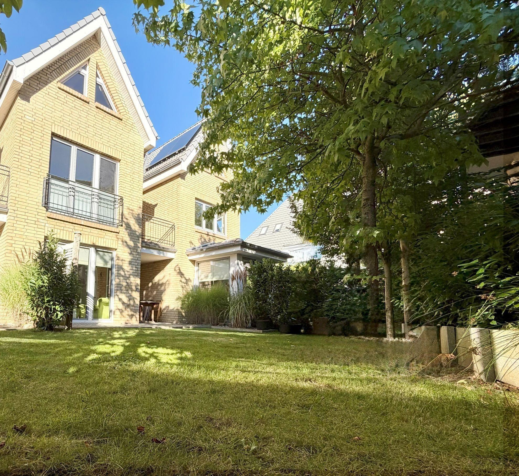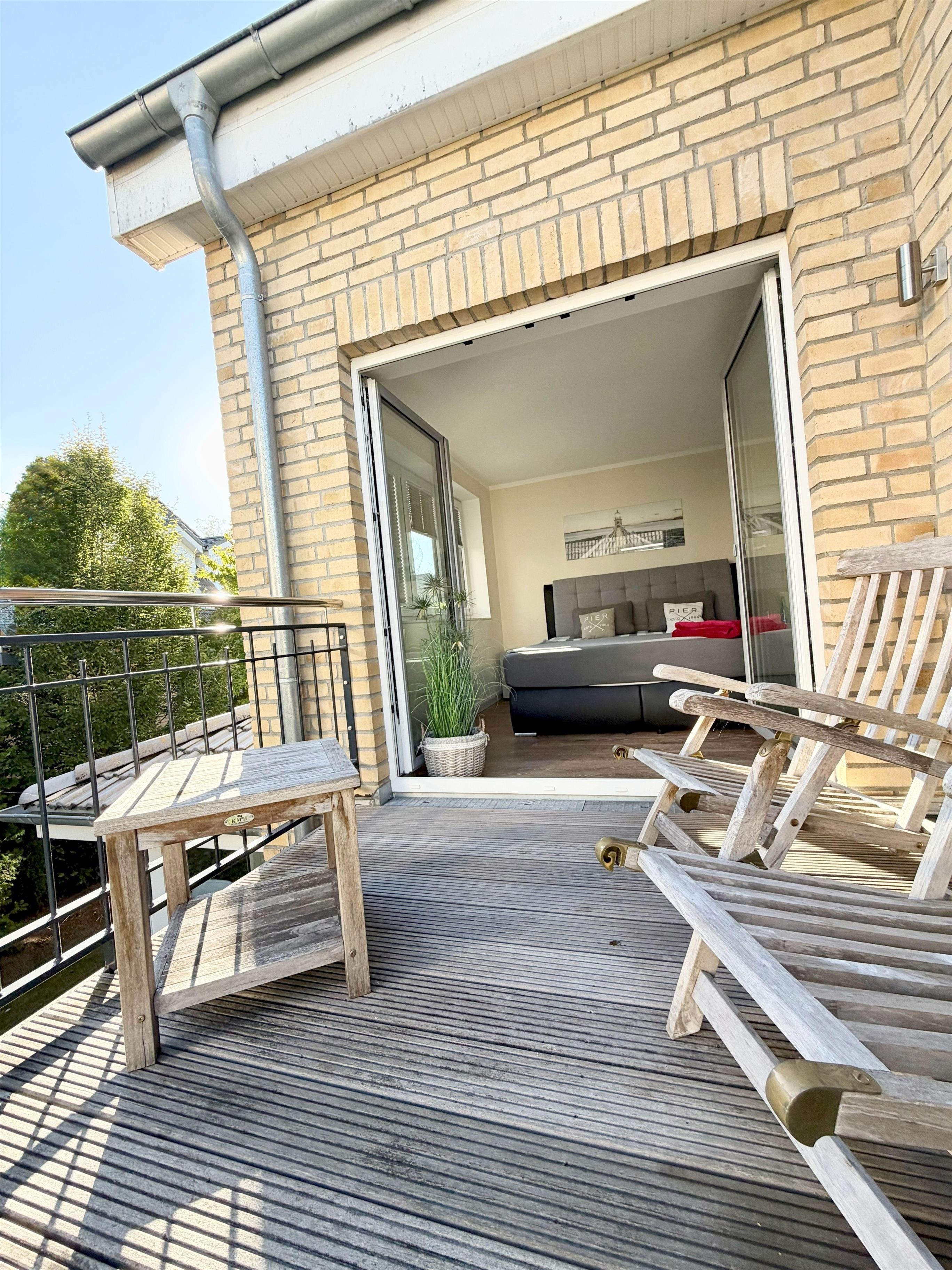 Das Haus verfügt neben dem Südbalkon über eine eigene geräumige Terrasse mit Gartenanteil in Südlage. Die an das Wohnzimmer angrenzende Terrasse ist zum Teil vom Balkon überdacht und mit Markise ausgestattet. Es gibt einen kostenlosen Stellplatz. Das Grundstück ist mit Hecken und Schilfgras eingegrenzt und eingewachsen.