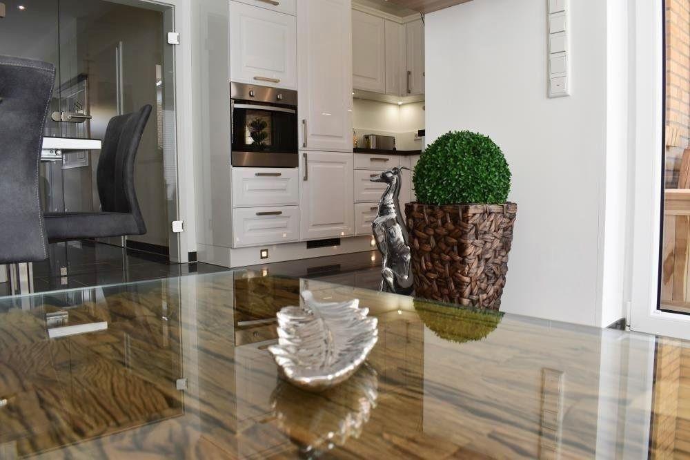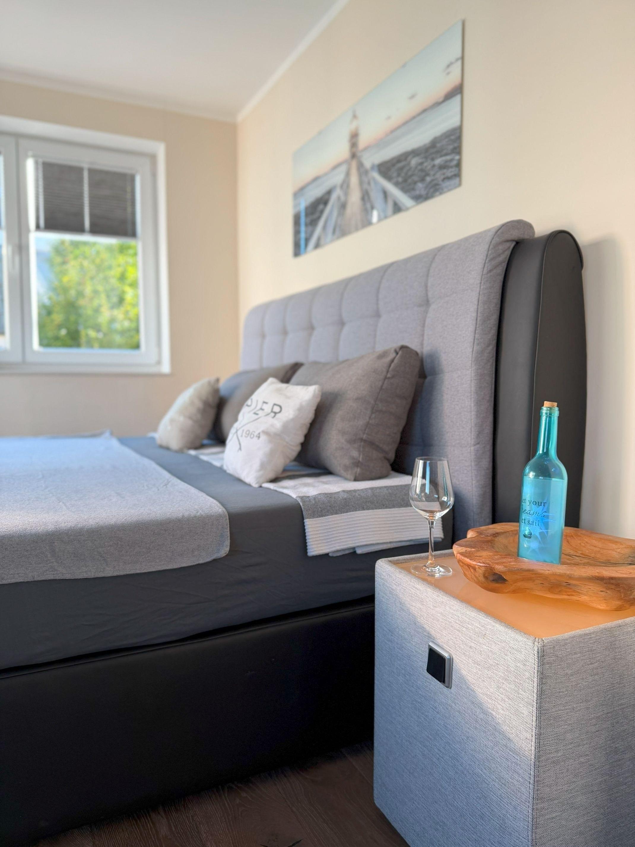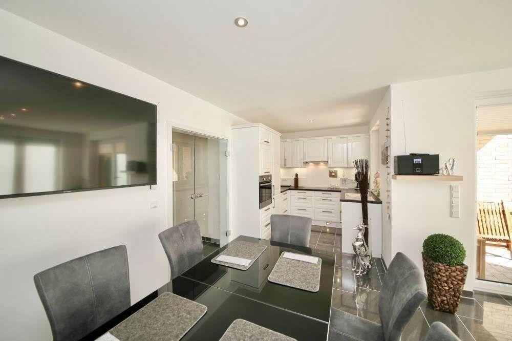 Das stilvolle Haus ist Ende 2018 fertiggestellt und modern, maritim eingerichtet. Große bodentiefe Fenster im Wohn- und Schlafbereich und moderne Bodenbeläge sorgen für eine helle und gemütliche Atmosphäre. Im Wohnzimmer befinden sich eine bequeme Couch und ein hochwertiger Essbereich im maritimen Stil für sechs Personen. An das Wohnzimmer grenzt die Terrasse und der sonnige Garten. Im Erdgeschoss können Sie neben dem Gäste-WC die hauseigene, moderne Sauna im geräumigen Saunaraum erleben. Die offene Marken-Küche ist unter anderem mit Kochplatte, Kühl-/Gefrierschrank, Backofen, Mikrowelle, Kaffeevollautomat und Geschirrspülmaschine ausgestattet. Im Obergeschoss befinden sich zwei Schlafzimmer jeweils mit Boxspringbetten. Das eine Schlafzimmer ist geräumig geschnitten und komfortabel mit Doppelbett und hochwertigen Elektrokamin ausgestattet. Vom Schlafzimmer aus gelangen Sie zum Südbalkon. Das weitere Schlafzimmer im Obergeschoss ist ebenfalls mit Doppelbett versehen. Beide Schlafzimmer sind mit Verdunkelungs-Plissee´s für ein angenehmen Schlaf ausgestattet. Das modern geflieste Badezimmer ist als Vollbad mit Dusche, WC und großer Badewanne für 2 Personen ausgestattet. Das Dachgeschoss hat seinen Charm durch die hohe Giebel-Decke und bietet weiteren Schlafraum mit einem Doppelbett. Schlafraum sowie das Wohnzimmer sind mit großen, modernen Flachbild-Fernsehern mit Telekom MagentaTV ausgestattet. Schnelles Glasfasernetz mit WLan und Fußbodenheizung sind im ganzen Haus vorhanden.