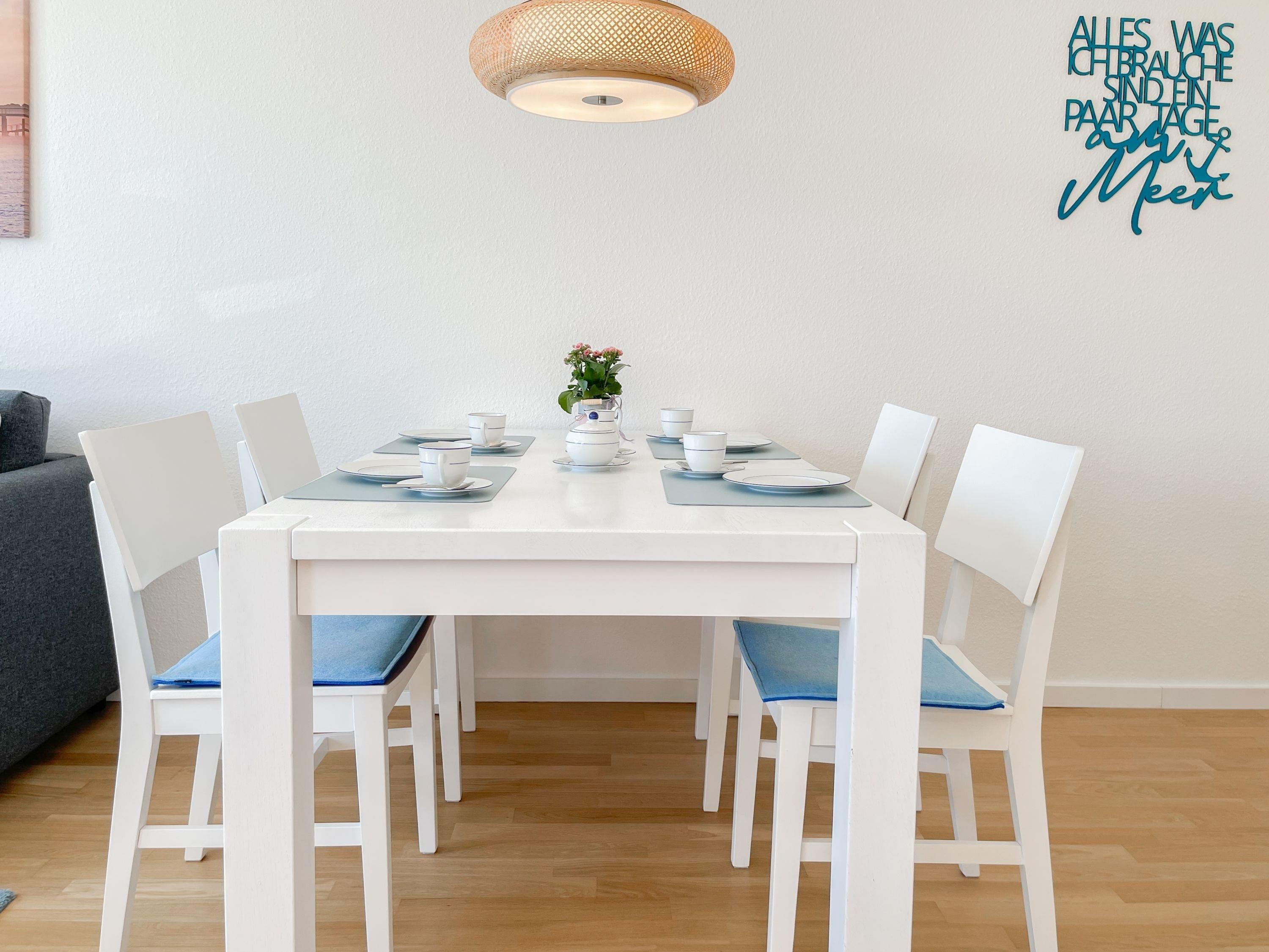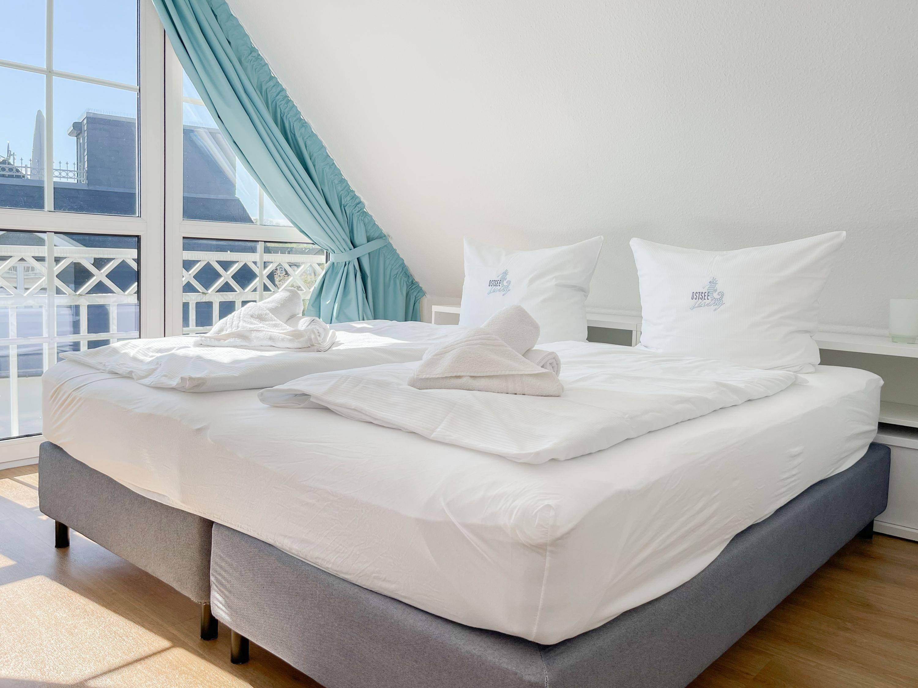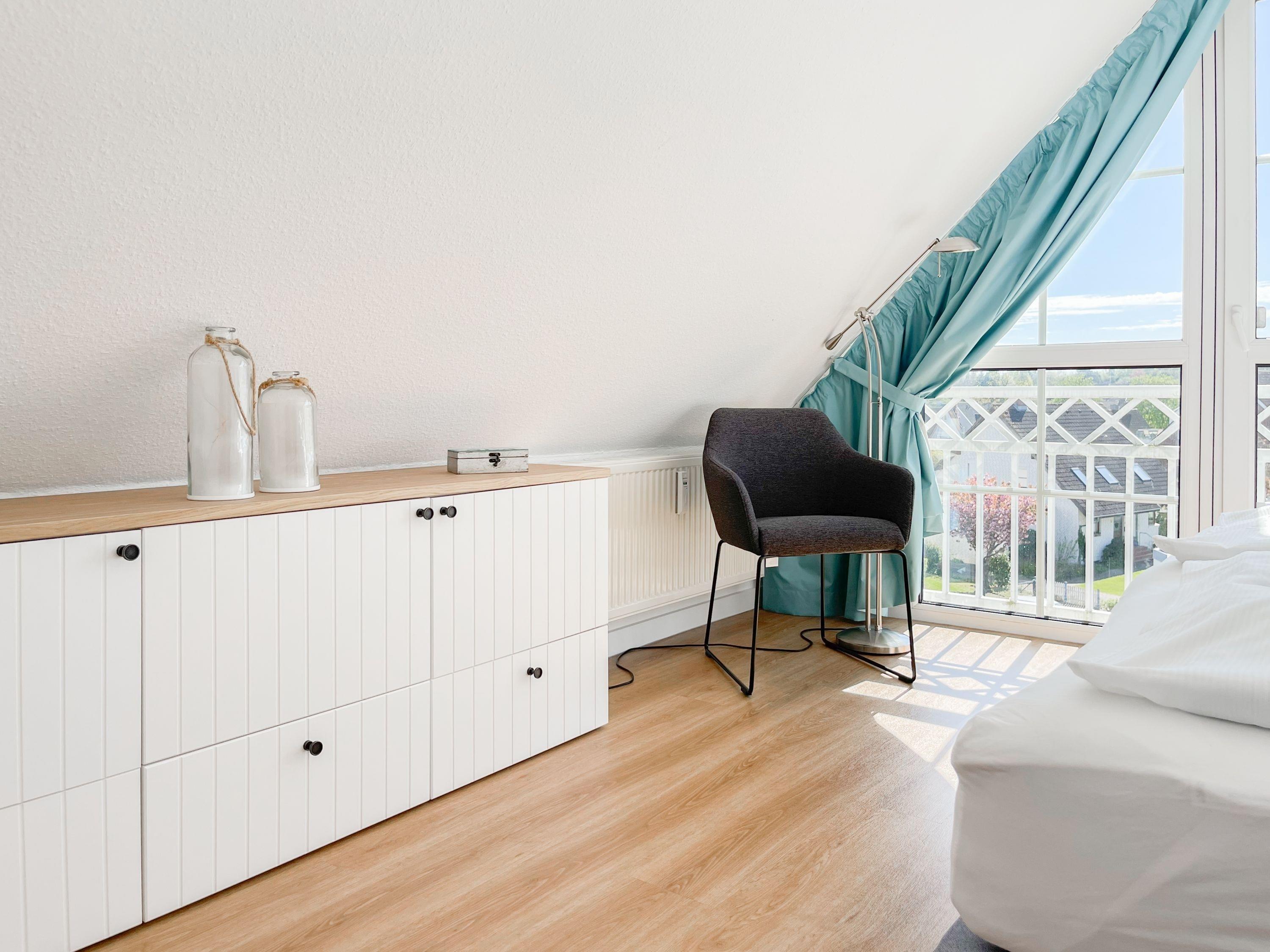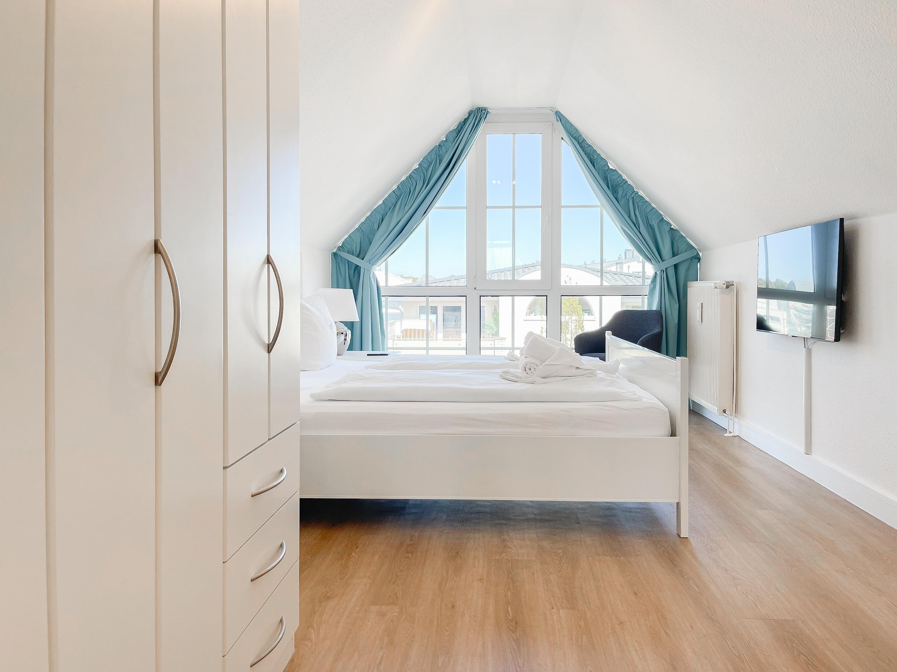 Die Ferienwohnung Ankerplatz[nbsp] liegt[nbsp] in der 2. Etage im Haus Sonnenpark und erstreckt sich über 2 Wohnebenen bis ins Dachgeschoss. Ein herrlicher Sonnenbalkon, ausgestattet mit Gartenmöbeln und einer elektrischen Markise, verläuft über den[nbsp] gesamten Wohnbereich und bietet einen tollen Rückzugsort bis zum letzten Sonnenstrahl. Die frisch renovierte Wohnung verfügt über ein gelungenes Raumkonzept mit neuer Küche, neuem Duschbad und Gäste WC. Die Ausstattung ist hochwertig und bietet 4 Personen ausreichend Raum zum Wohlfühlen in Strandnähe. Es erwartet Sie ein heller, großzügiger Wohnraum mit bodentiefen Fensterflächen, geschmackvoll gestaltet und mit einem komfortablen Sofa und zwei Sesseln eingerichtet, TV, Hifi-Anlage und ein Essbereich mit ausreichend Platz für 4 Personen. WLAN steht selbstverständlich zur kostenlosen Nutzung zur Verfügung. Die integrierte Küche ist bestens ausgestattet, unter anderem mit Spülmaschine, Backofen, Nespressomaschine und vielem mehr. Im Eingangsbereich befindet sich eine Garderobe und ein separates Gäste WC. Auf der oberen Ebene, die über eine Treppe vom Wohnbereich zu erreichen ist, bietet die Wohnung zwei separate Schlafzimmer mit Doppelbetten (180x200), Kleiderschränken und Verdunkelungsvorhängen sowie ein äußerst großzügiges, modernes Duschbad mit einem Doppelwaschtisch und viel Tageslicht. Schlafzimmer 1 verfügt zusätzlich über einen TV und Schlafzimmer 2 über einen Schreibtisch und das Bett besteht aus 2 Einzelbetten, die beliebig zusammengeschoben oder getrennt genutzt werden können.