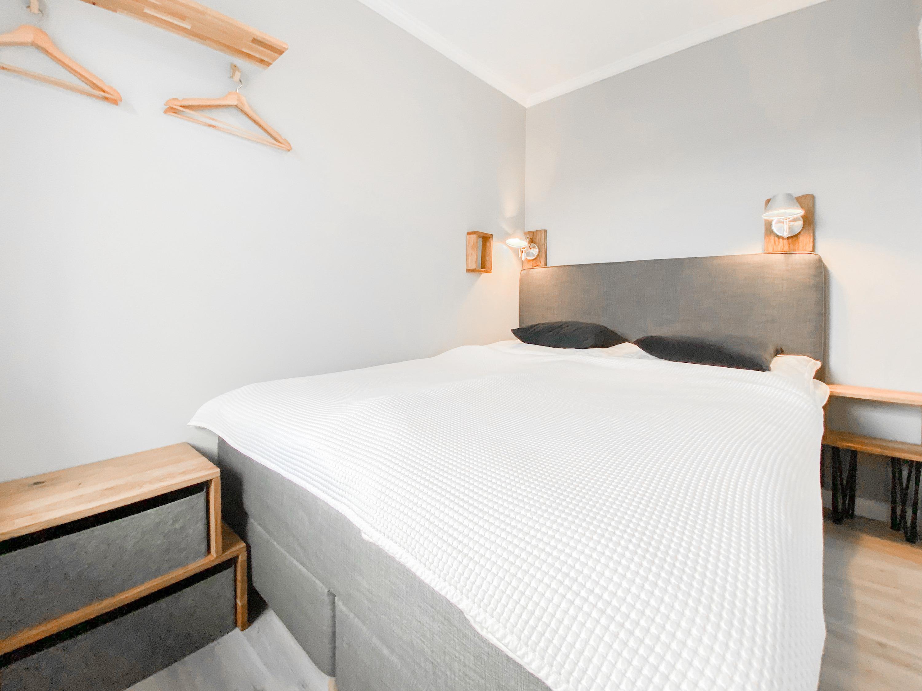 Klein aber fein, gespickt mit liebevollen Details und geschmackvoller Einrichtung präsentiert sich das kleine Piratennest für 2 Personen. Es erwartet Sie ein stylischer Wohnbereich mit Sofa, TV, Bluetooth Lautsprecher und kostenloses WLAN sowie ein Essbereich für 2 Personen. Die integrierte Küche ist bestens ausgestattet, unter anderem mit Spülmaschine, Backofen, Cerankochfeld und vielem mehr. Es ist gelungen jeden qm optimal zu nutzen und eine tolle Wohnatmosphäre zu schaffen. Der große, umlaufende Eckbalkon mit Sonnenliege, Tisch und 2 Stühlen bietet herrliche Ausblicke in den Kurpark. In dem gemütlichen sehr kleinen Schlafzimmer befindet sich ein hochwertiges Boxspringbett (160x200), das den Raum bereits fast ausfüllt und mit der einen Seite an der Wand steht. Das Fenster kann durch blickdichte Vorhänge verdunkelt werden. Für die Urlaubsgarderobe stehen Wandhaken und Schubladen im Schlafzimmer und Flur zur Verfügung, ein Kleiderschrank gehört nicht zur Ausstattung. Das Duschbad ist vom Flur zu erreichen. Eine Waschmaschine ist im Keller untergebracht und kann kostenfrei genutzt werden.