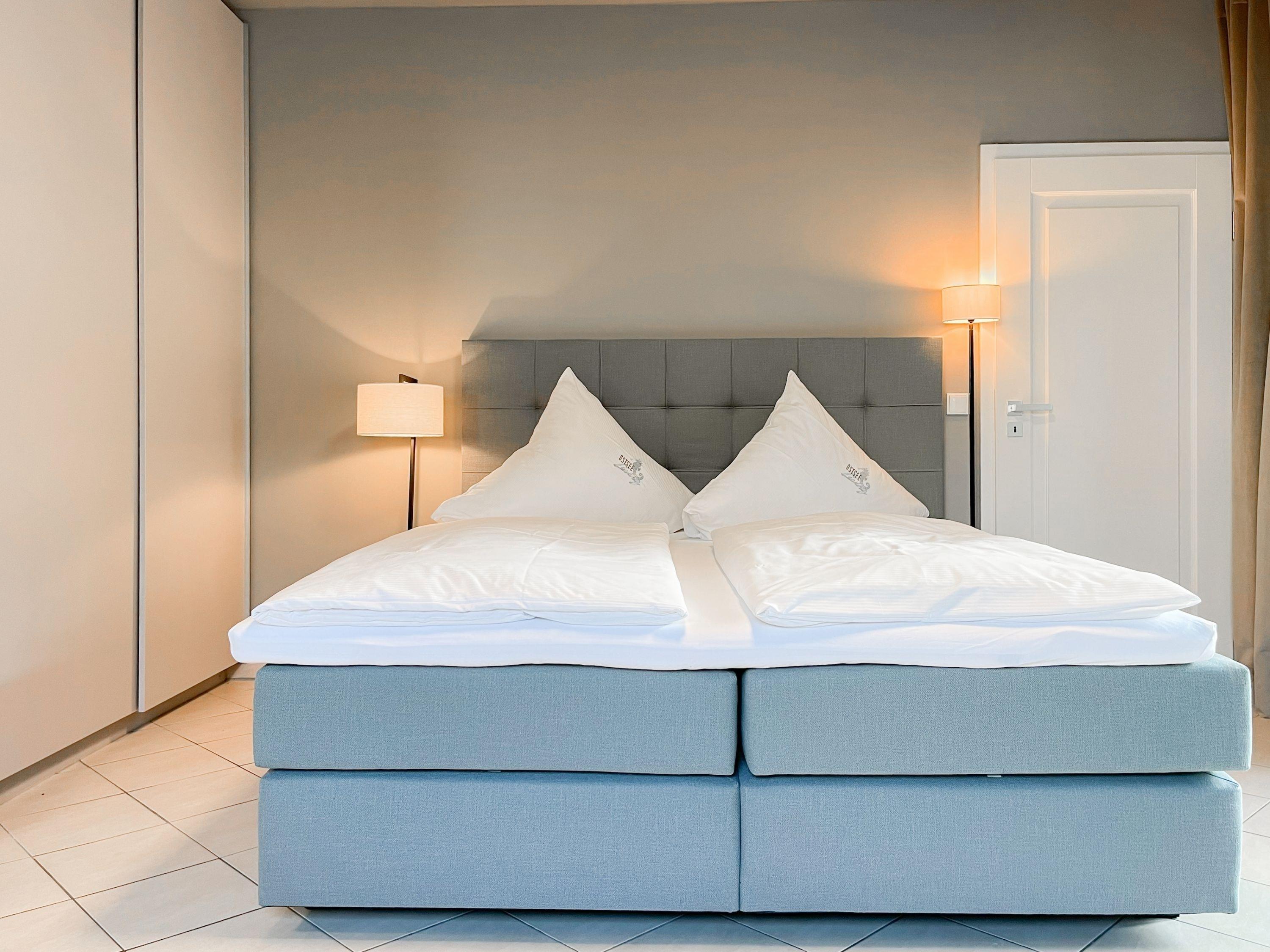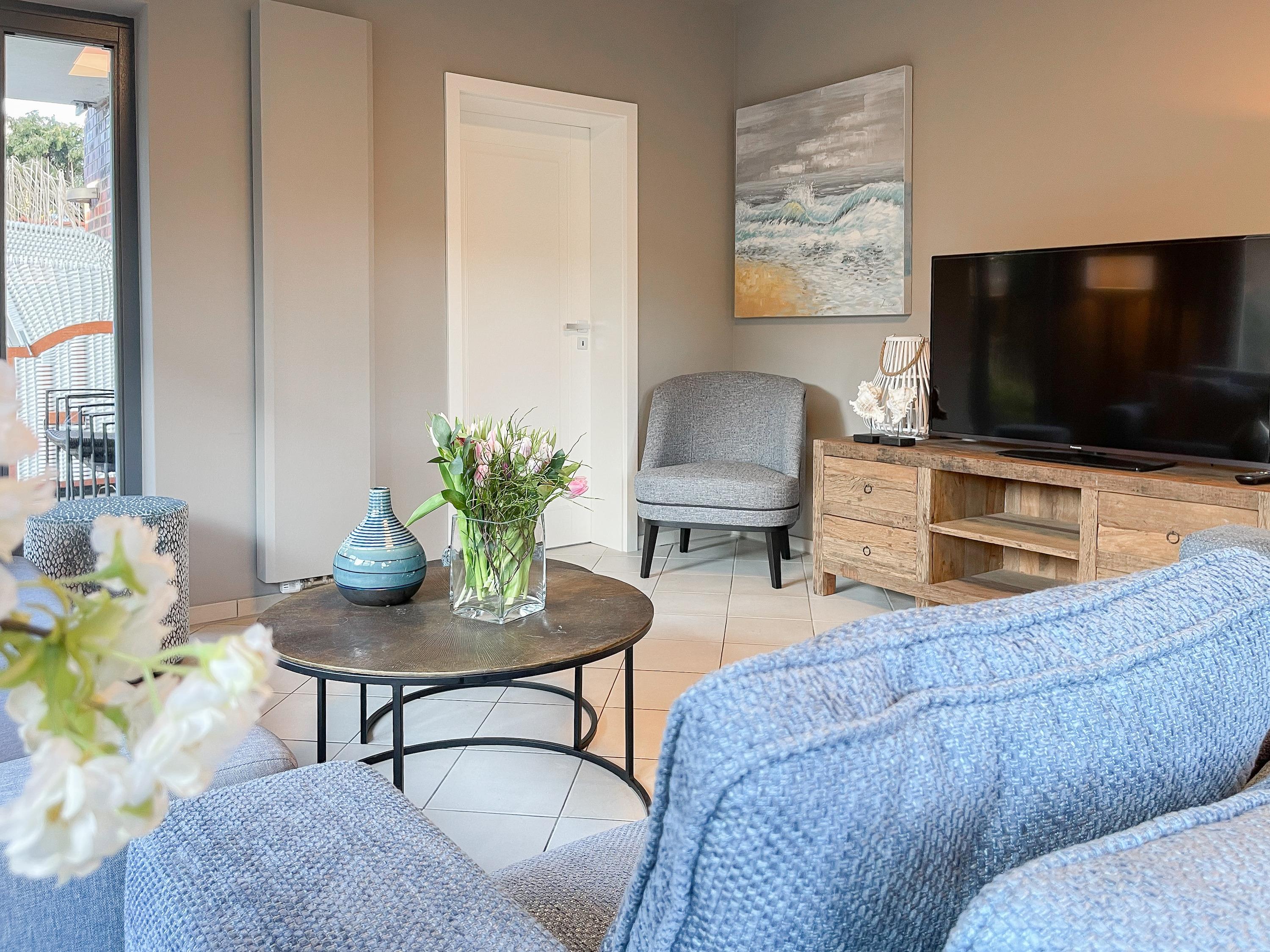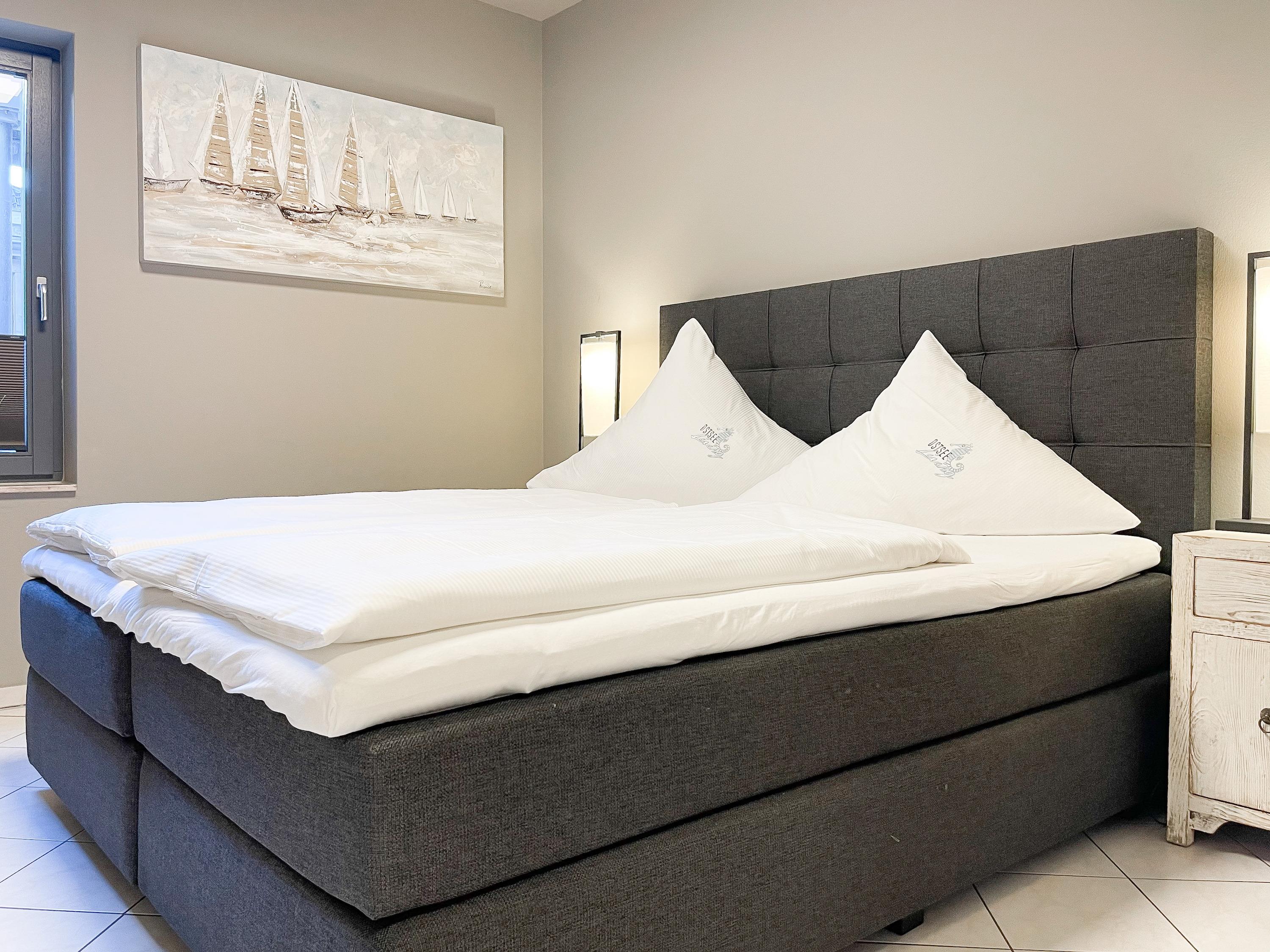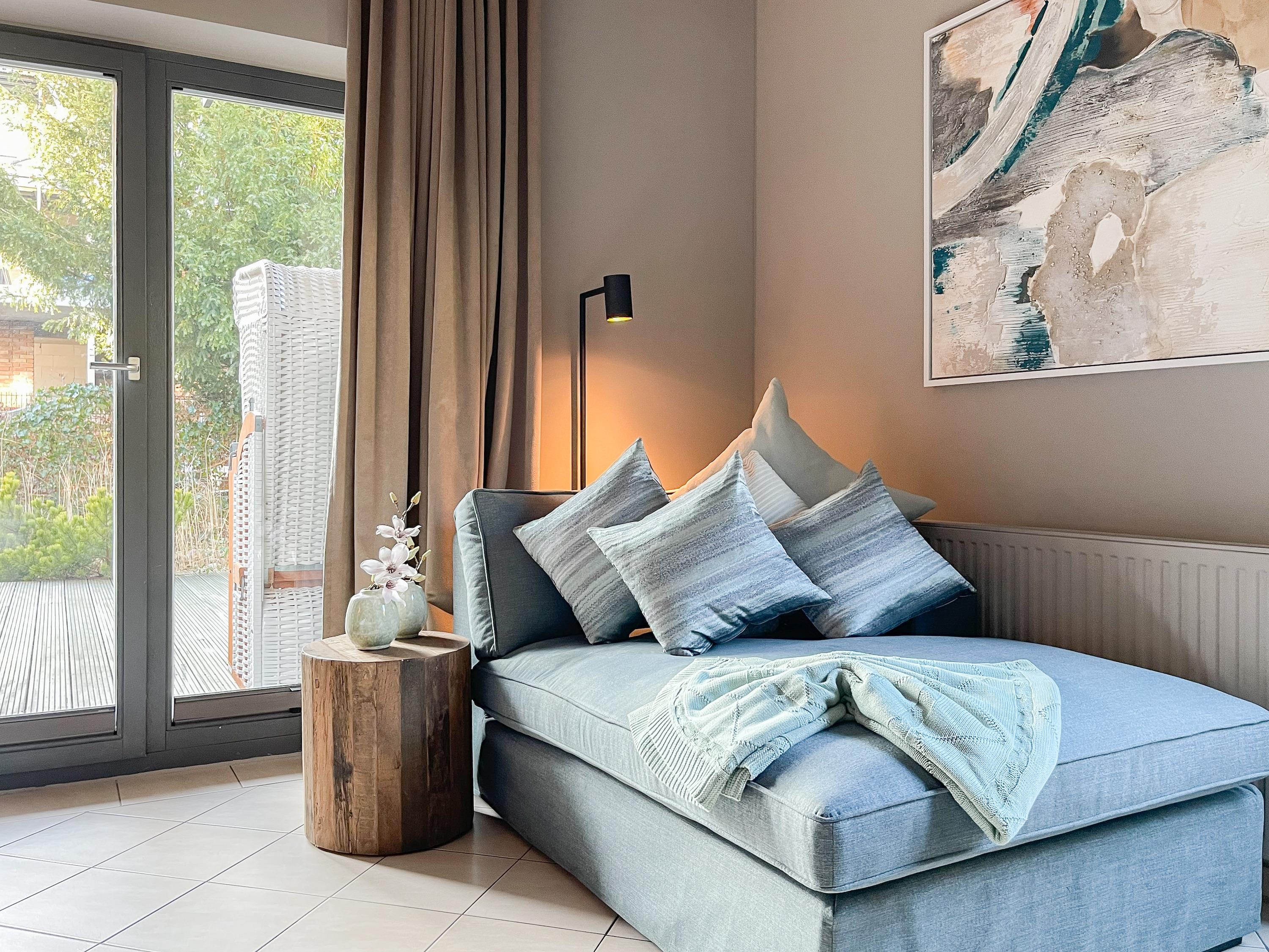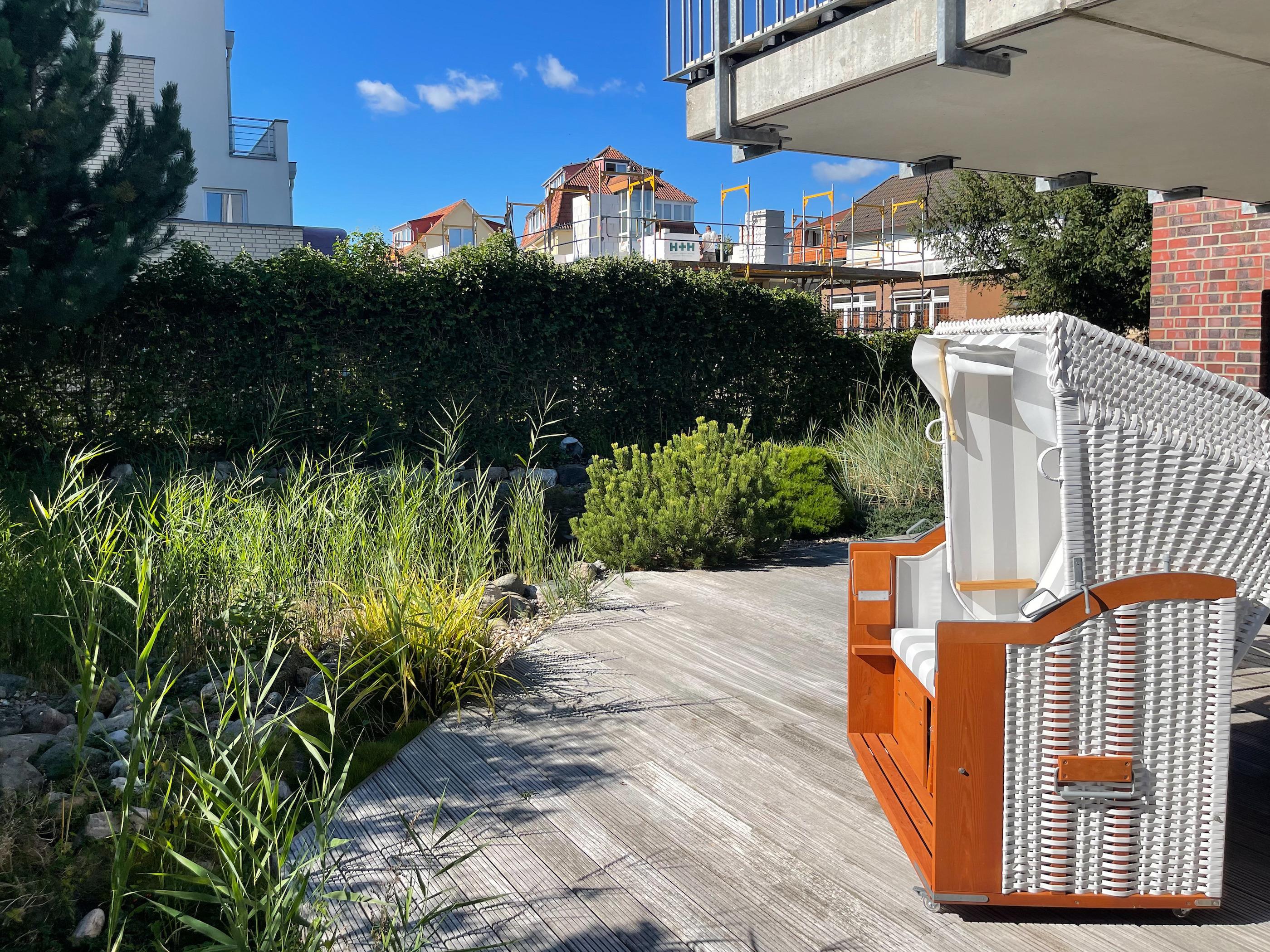 Deck 1 befindet sich im Erdgeschoss eines Ferienhauses mit nur 2 Wohnungen und bietet auf 90 qm Wohnfläche ausreichend Raum für 4 Personen, um einen erholsamen Ostseeurlaub zu verleben. Die hochwertige, äußerst geschmackvolle Einrichtung im Hampton Style schafft ein herrliches Ambiente zum Wohlfühlen, große, bodentiefe Fensterelemente sorgen für lichtdurchflutete Räumlichkeiten. Es stehen zwei separate Schlafzimmer zur Verfügung, die mit Boxspringbetten, Verdunklungsplissees, geräumigen Kleiderschränken und TV ausgestattet sind sowie 2 moderne Bäder mit Walk In Duschen, Waschtisch, WC[nbsp] und Fenster. Mittelpunkt der Wohnung bildet der großzügige Wohnbereich mit gemütlichen Sofas und herrlichem Blick in den wunderschön angelegten Garten. Der anschließende Essbereich ist für 4 Personen eingerichtet und die offene Küche ist selbstverständlich bestens ausgestattet. Der Außenbereich mit der 25 qm großen Terrasse (Südausrichtung), ausgestattet mit[nbsp] 2 Strandkörben und Gartenmöbeln,[nbsp] sowie der liebevoll gestaltete Gartenbereich mit großer Teichanlage, Goldfischen, Gräsern und Bambus stellt ein besonderes Highlight dar und wird garantiert zu jeder Tageszeit zum Lieblingsplatz. So bezaubernd die Teichanlage auch ist, könnte sie insbesondere für kleine Kinder eine Gefahr darstellen. Die Waschmaschine ist in einem separaten Raum innerhalb der Wohnung untergebracht. WLAN steht selbstverständlich zu kostenlosen Nutzung zur Verfügung. Fahrradständer befinden sich vor dem Eingang. Es fester Tiefgaragenstellplatz (Einfahrt 2 m) gehört zur Wohnung.