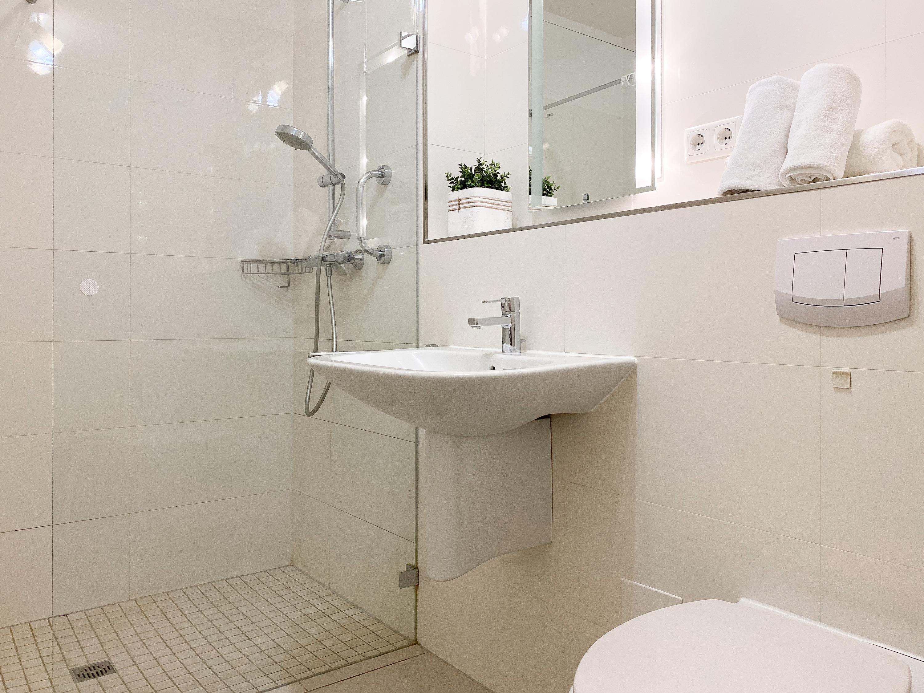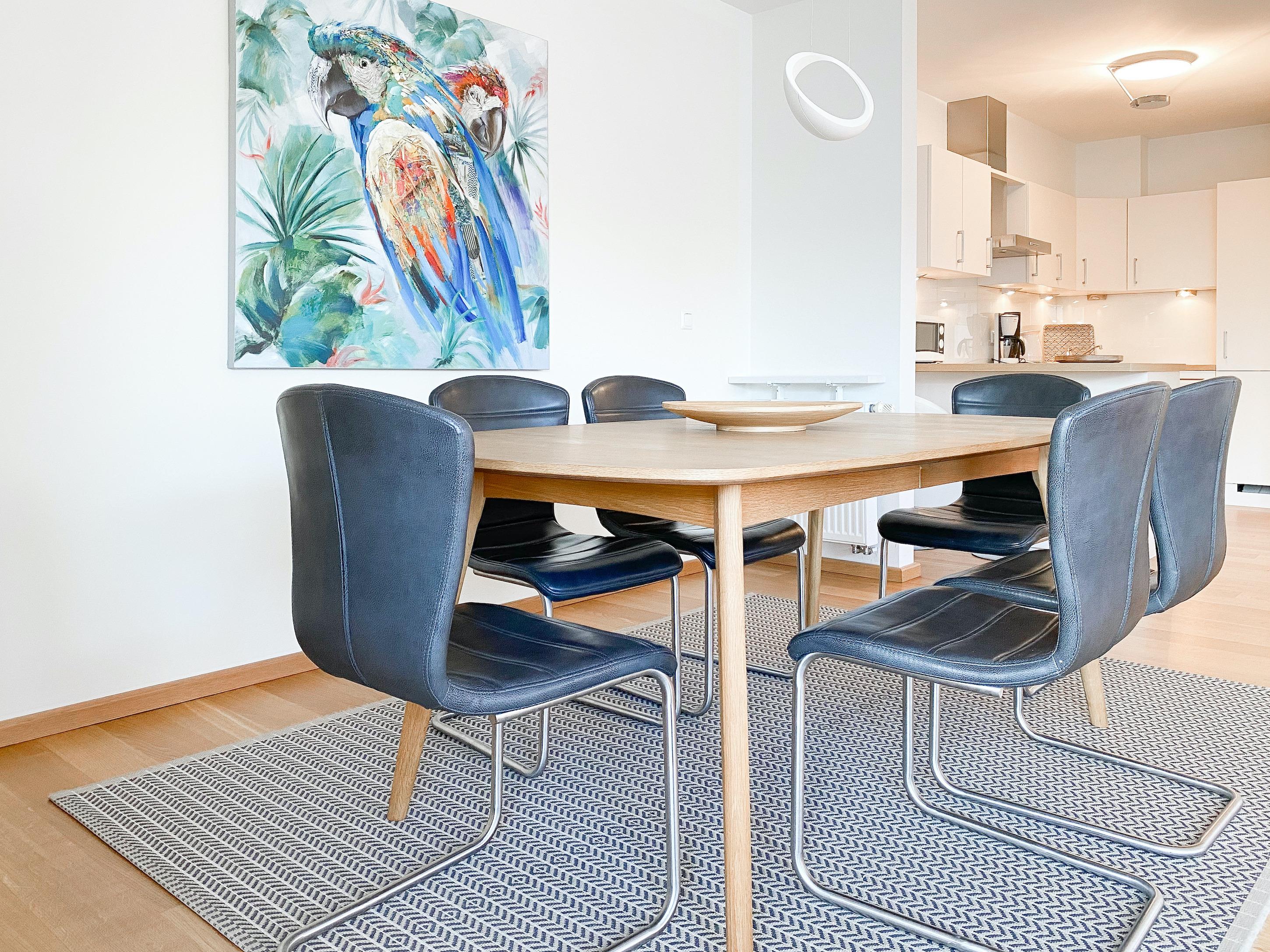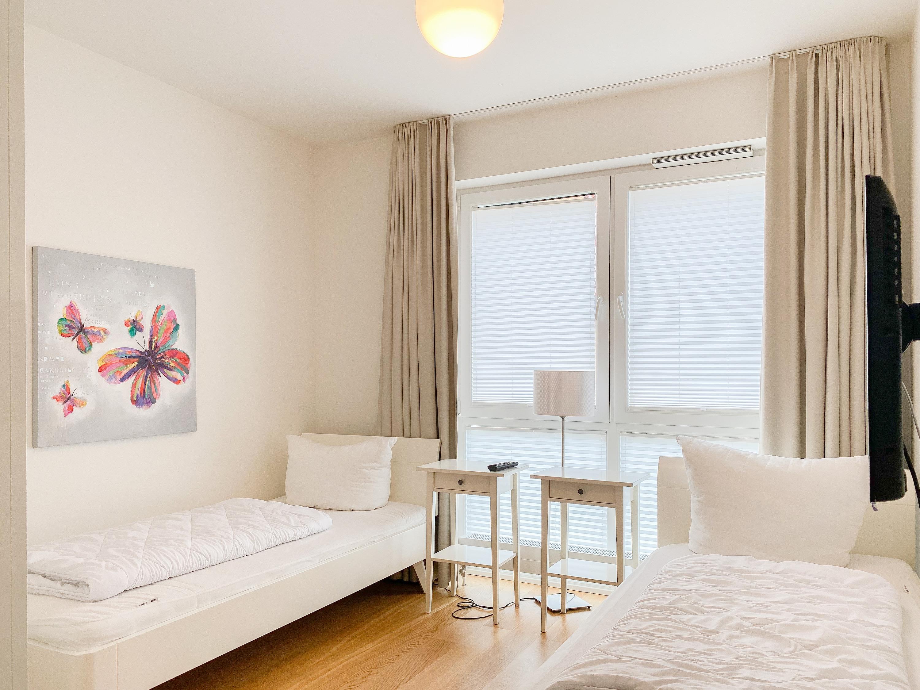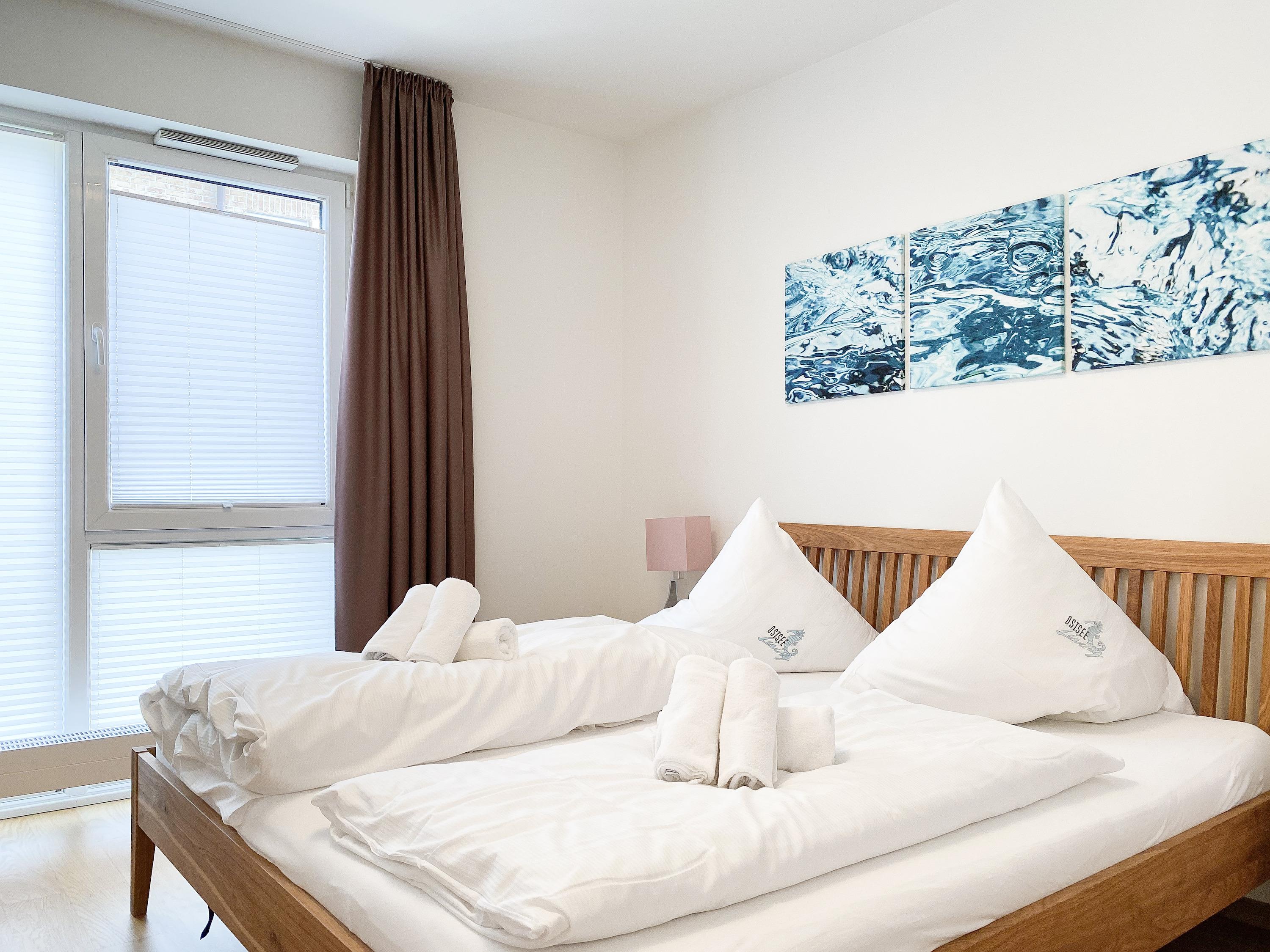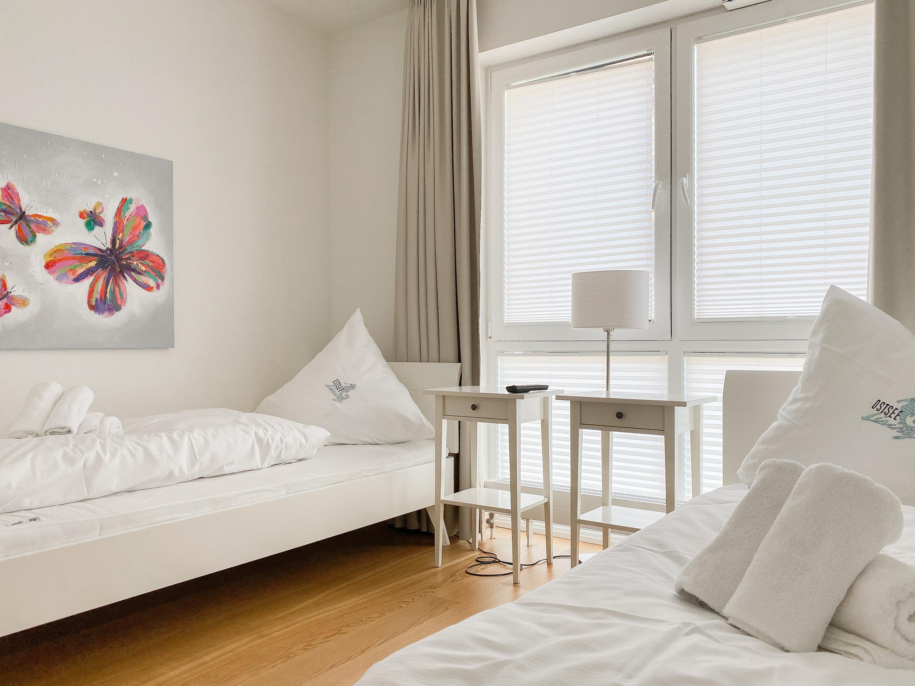 Die 92 qm große Wohnung befindet sich im ersten Obergeschoss und verfügt über zwei separate Schlafzimmer - ausgestattet mit Doppelbett (180x200) und zwei Einzelbetten (80x200) mit TV - [nbsp]ein komfortables Duschbad mit Fußbodenheizung sowie ein separates Gäste WC.[nbsp] Es gibt einen geschmackvollen Wohnbereich mit TV, Radio und WLAN, einen großzügigen Essbereich und eine offene Einbauküche, bestens ausgestattet mit Backofen und Spülmaschine.[nbsp] Der großzügige, überdachte Südbalkon bietet in östlicher Richtung einen schönen Blick auf den gegenüberliegenden Park und die Ostsee. Die großen Fensterelemente und das verwendete Echtholzparkett in diesem Objekt sorgen für eine helle, freundliche Wohnatmosphäre. Ankommen und Wohlfühlen!