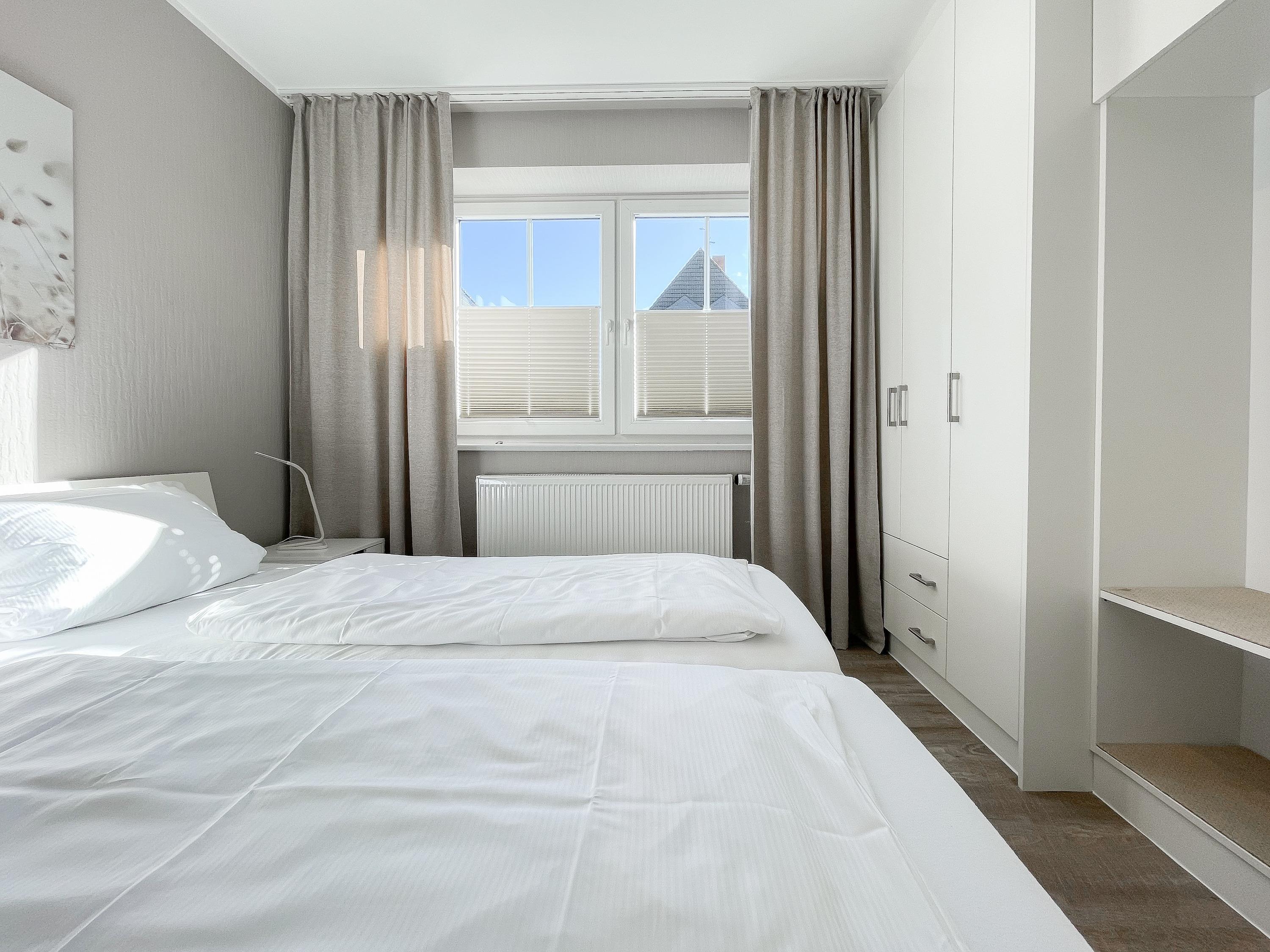 Es erwartet Sie eine gepflegte Ferienwohnung mit zwei separaten Schlafzimmern, die mit Doppelbetten (180x200 und 140x200) und Verdunkelungsvorhängen ausgestattet sind und ein helles Duschbad mit Fenster und Handtuchwärmer. Das Wohnzimmer ist komfortabel mit einer Couchgarnitur und einer integrierten Essecke für 4 Personen eingerichtet. TV, Hifi Anlage und kostenloses WLAN stehen zur Verfügung. Die offene Einbauküche ist gut ausgestattet. Dank großer Fensterflächen sind die Räumlichkeiten hell und freundlich. Als idealer Rückzugsort[nbsp][nbsp]während eines entspannten Urlaubs eignet sich die großzügige, umlaufende Sonnenterrasse in Südausrichtung. Das Haus verfügt selbstverständlich über einen Aufzug. Zur Wohnung gehört ein Stellplatz auf dem Grundstück. Ein Fahrradständer ist vorhanden.