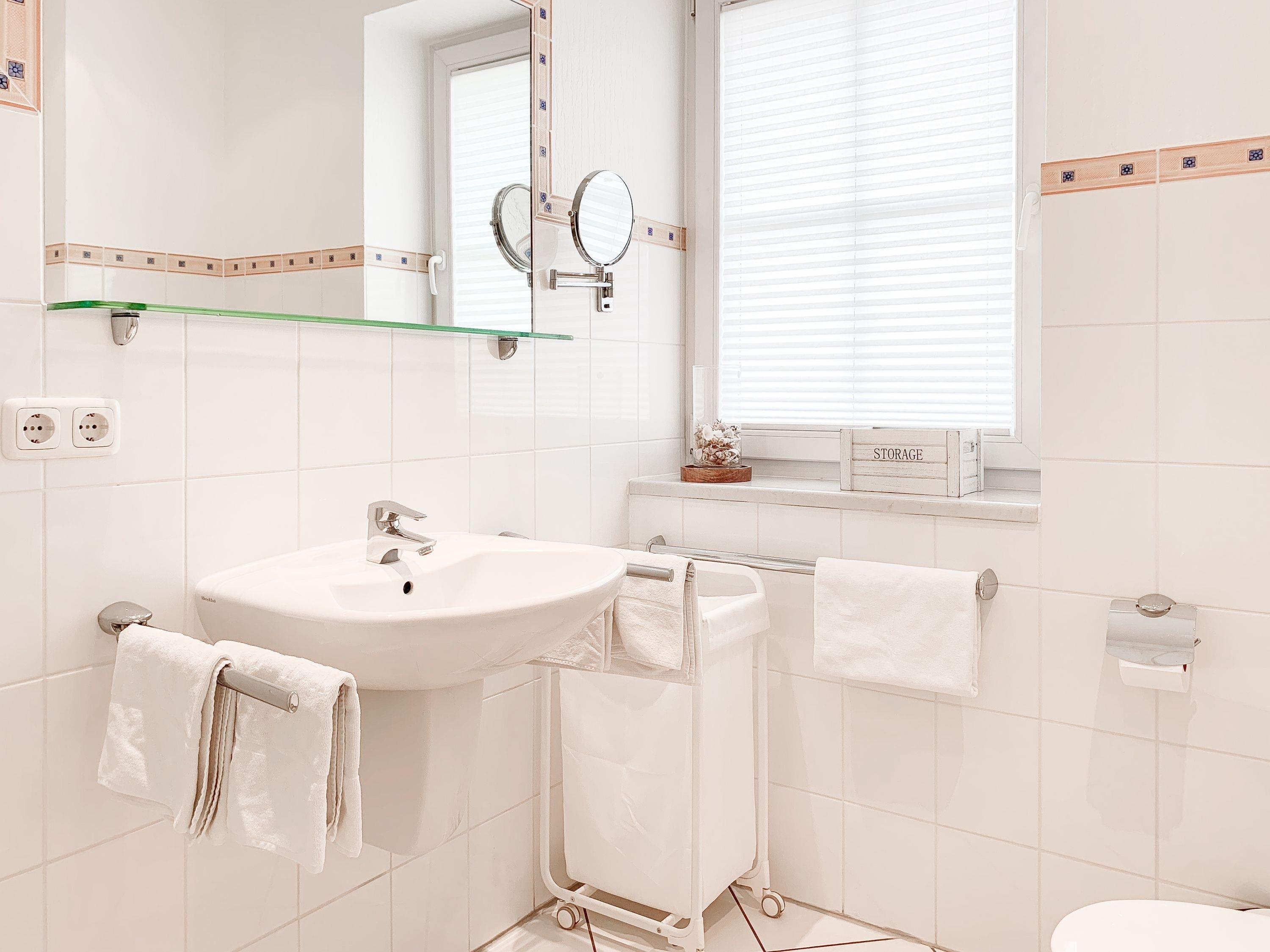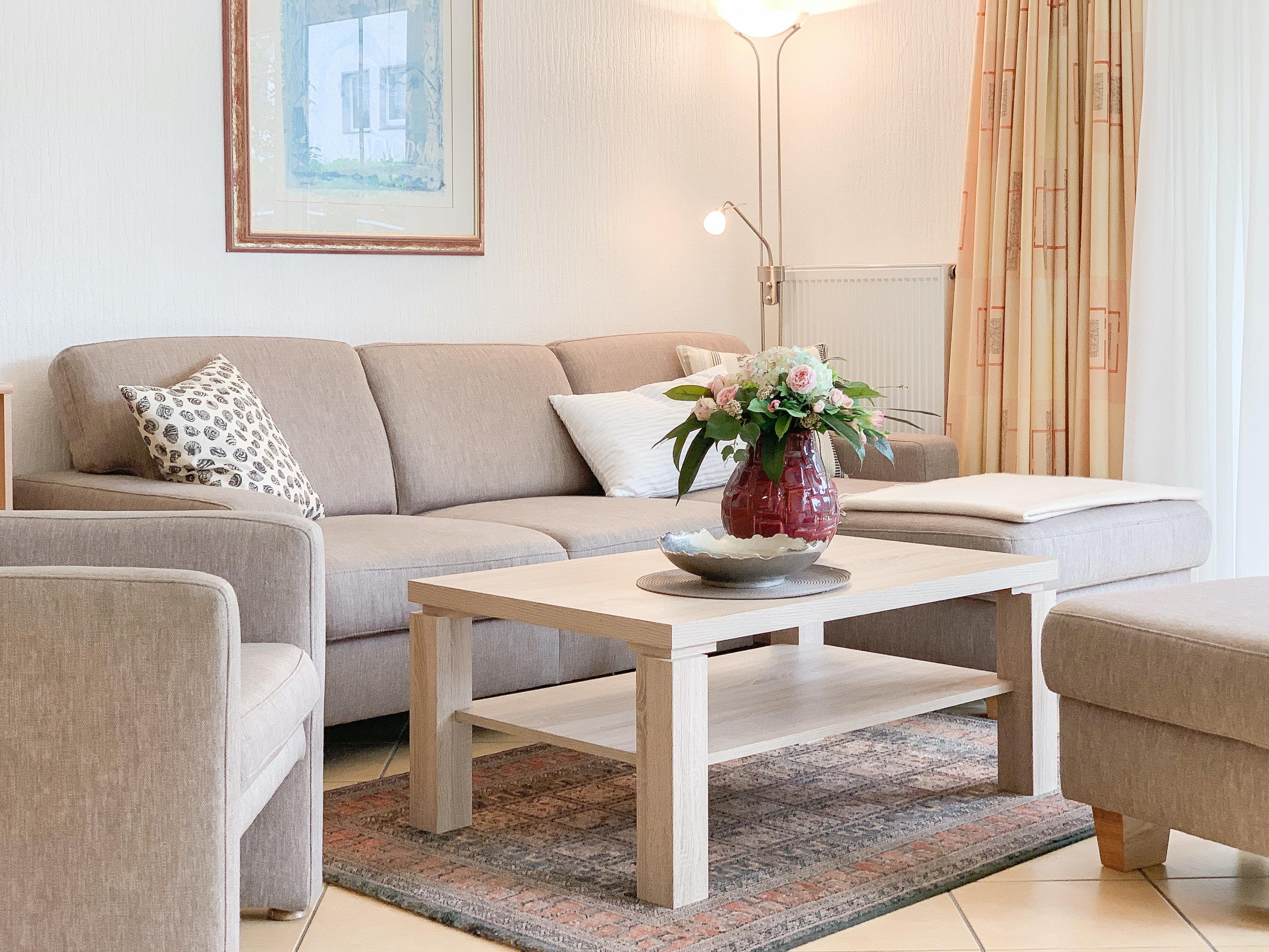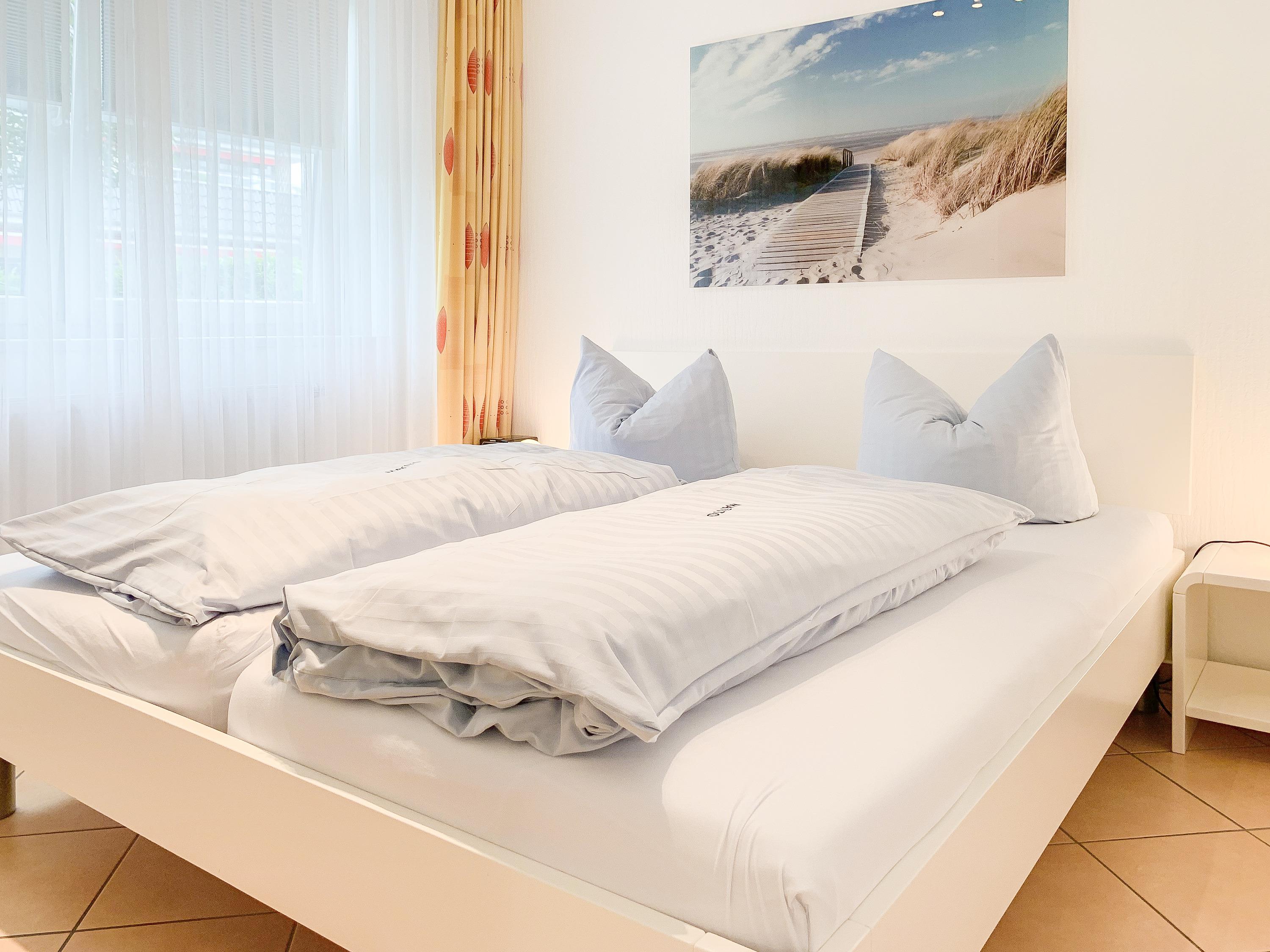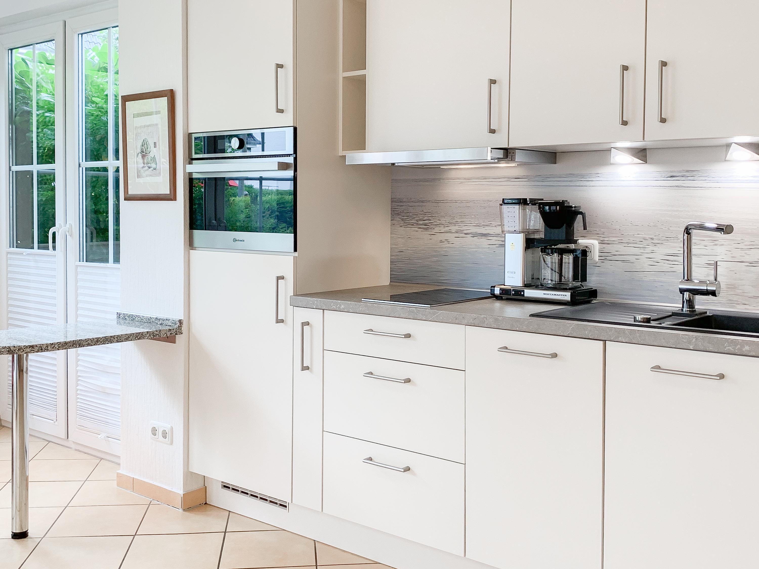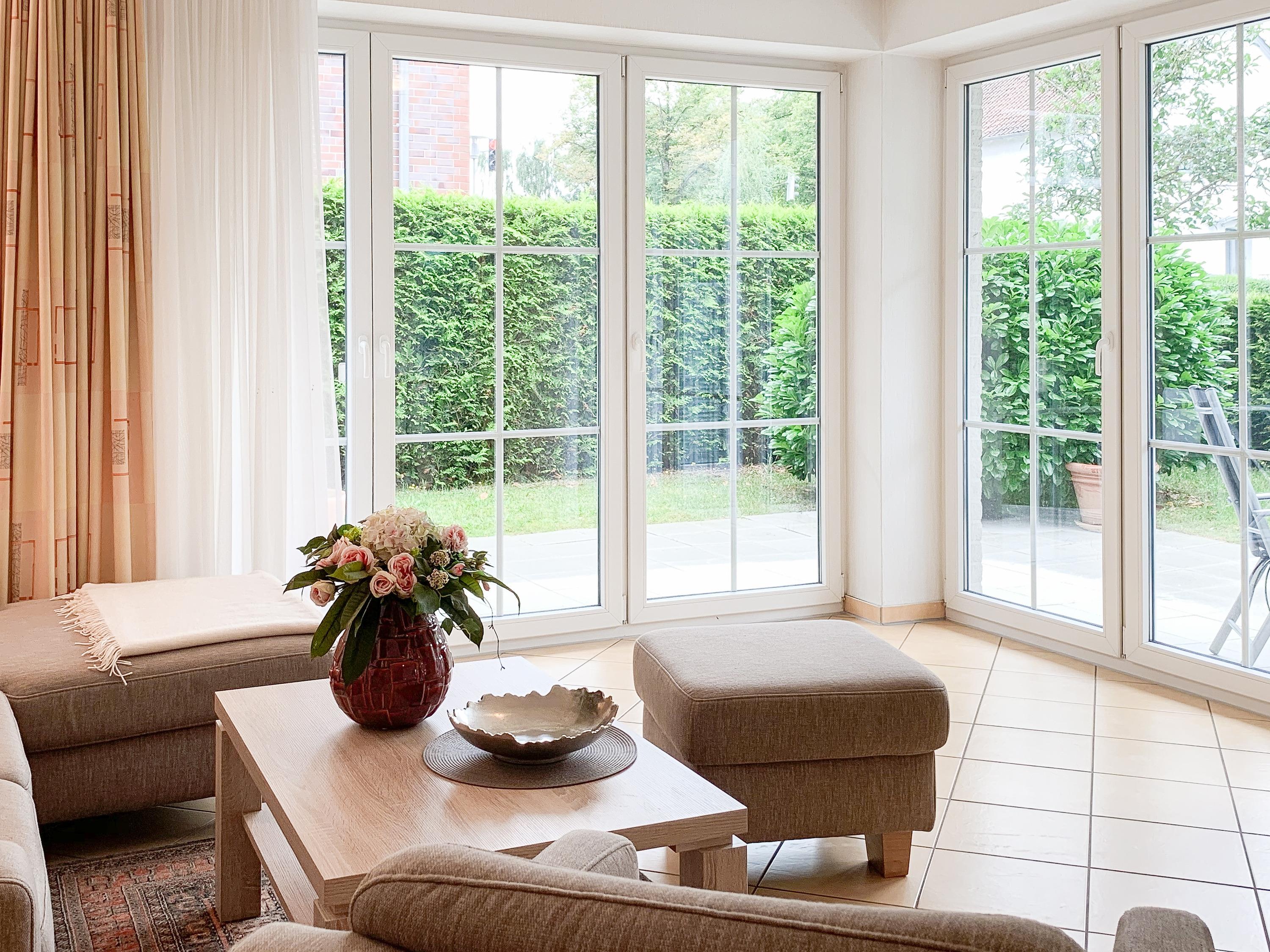 Die gepflegte, gut ausgestattete Ferienwohnung befindet sich im Erdgeschoss und bietet ausreichend Raum für 4 Personen, um einen entspannten Urlaub zu verleben. Es erwartet Sie eine gut ausgestattete Küche mit angrenzendem Essbereich sowie ein großzügig angelegter Wohnbereich mit hochwertiger Couchgarnitur und komfortablem Schrankbett, TV, Hifi Anlage und WLAN. Riesige, bodentiefe Fensterflächen sorgen für eine helle und freundliche Wohnatmosphäre und einen schönen Blick auf die große, umlaufende Sonnenterrasse mit Gartenbereich, ein herrlicher Rückzugsort zu jeder Tageszeit. Das separate Schlafzimmer ist mit einem Doppelbett ausgestattet, die Fenster sind mit Verdunkelungsplissees versehen. Das moderne, helle Duschbad verfügt über einen[nbsp] Handtuchwärmer, Föhn und Kosmetikspiegel.