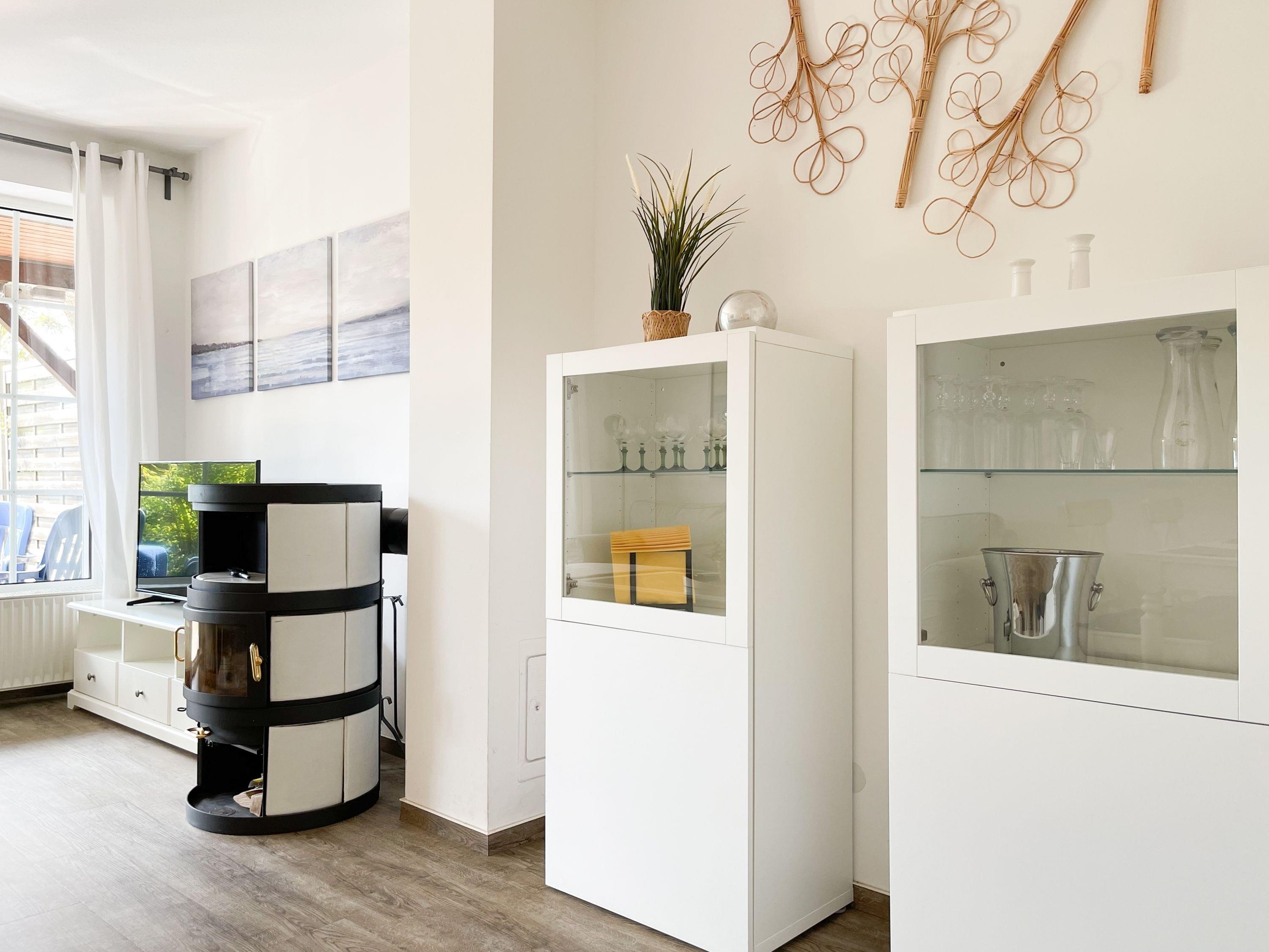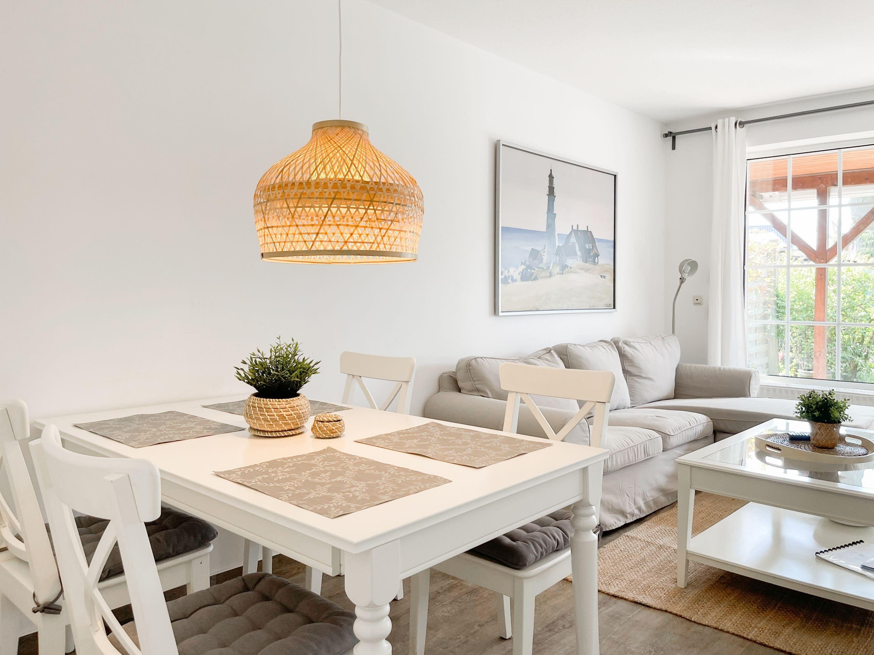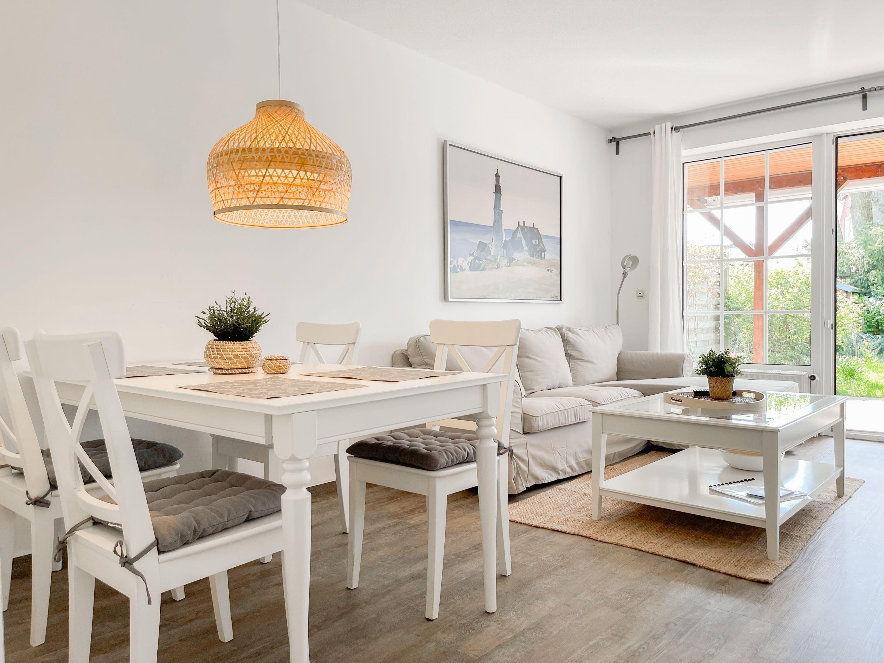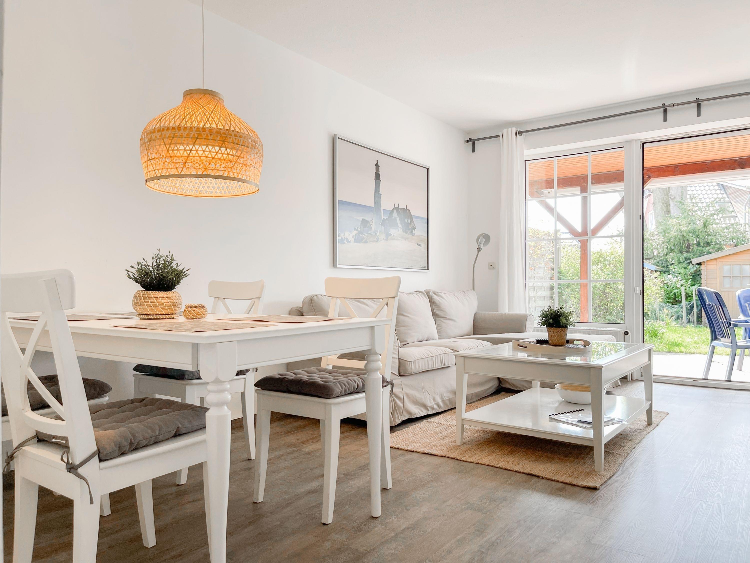 Das Ferienhaus bietet auf ca. 75 qm Wohnfläche über 2 Ebenen[nbsp] ausreichend Platz für 4 Personen (+Baby im Reisebett). Im Erdgeschoss[nbsp] befindet sich eine moderne, abgeschlossene Einbauküche mit Mikrowelle, Backofen, Kochfeld und Spülmaschine. Im hellen, freundlichen Wohnraum mit integriertem Essbereich befindet sich eine gemütliche Sitzecke und ein Kamin. TV und Radio sowie kostenloser Internetzugang über WLAN stehen zur Verfügung. Vom Wohnraum ist die großzügige, überdachte Südterrasse mit anschließendem, kleinen Garten zu betreten. Eine elektrische Markise sorgt für ausreichend Schatten. Der Außenbereich bietet einen herrlichen Rückzugsort zu jeder Tageszeit. Ein Gäste WG ist ebenfalls im EG untergebracht. Im Obergeschoss befinden sich zwei separate Schlafzimmer, die beide mit einem Boxspringbett (180x200) und Verdunkelungsplissees ausgestattet sind sowie das Duschbad. Eine Garage gehört zum Objekt.