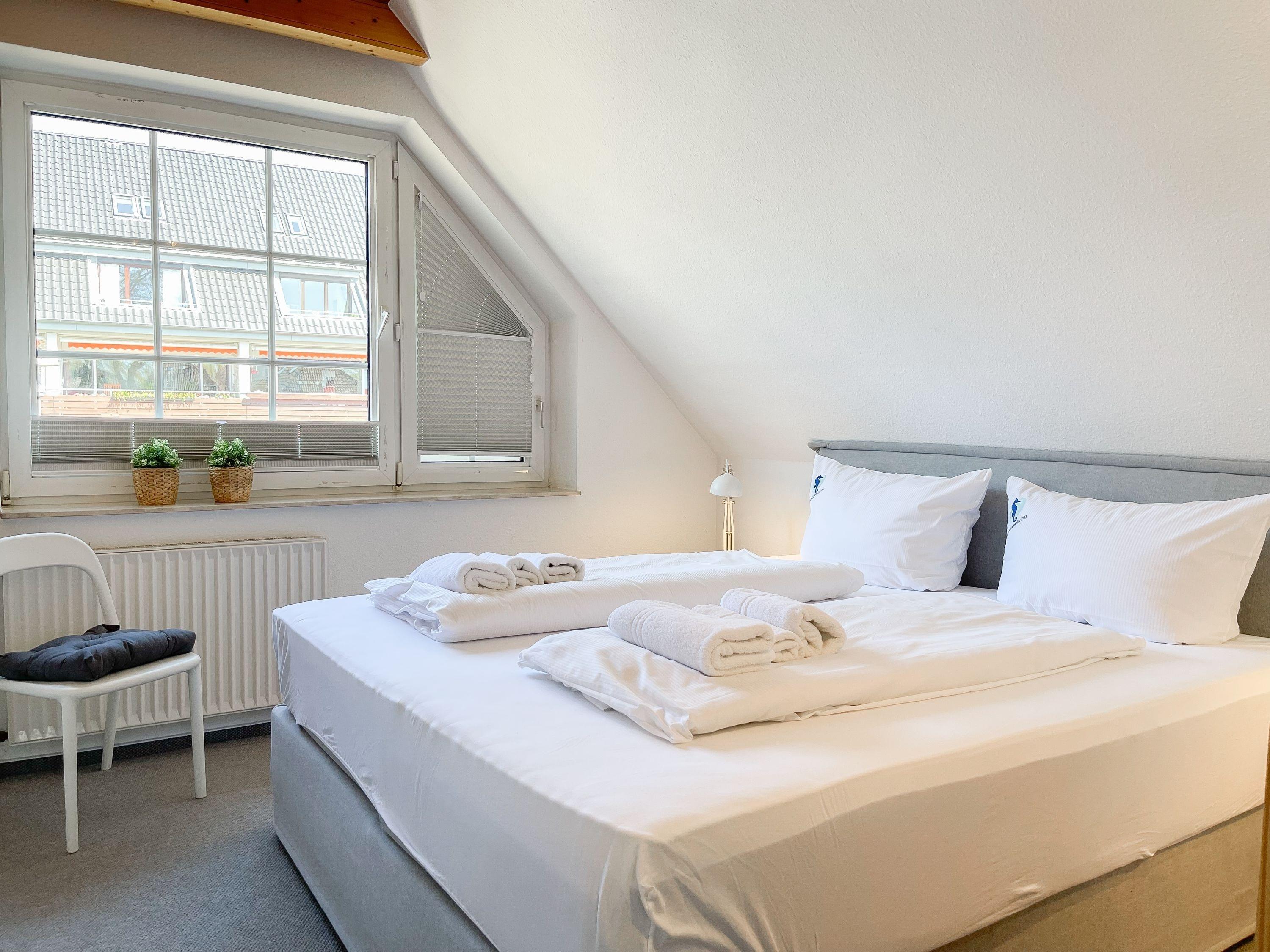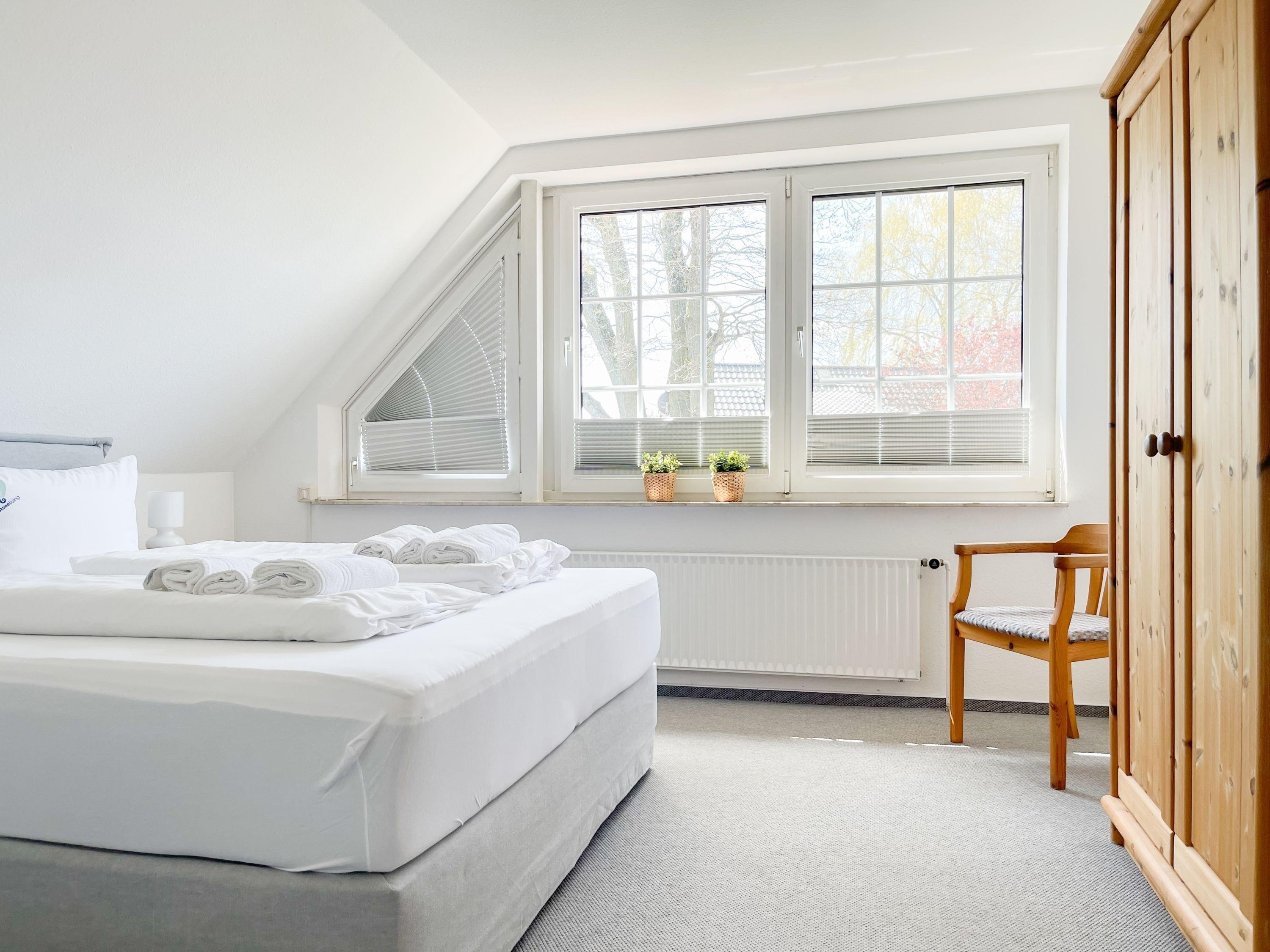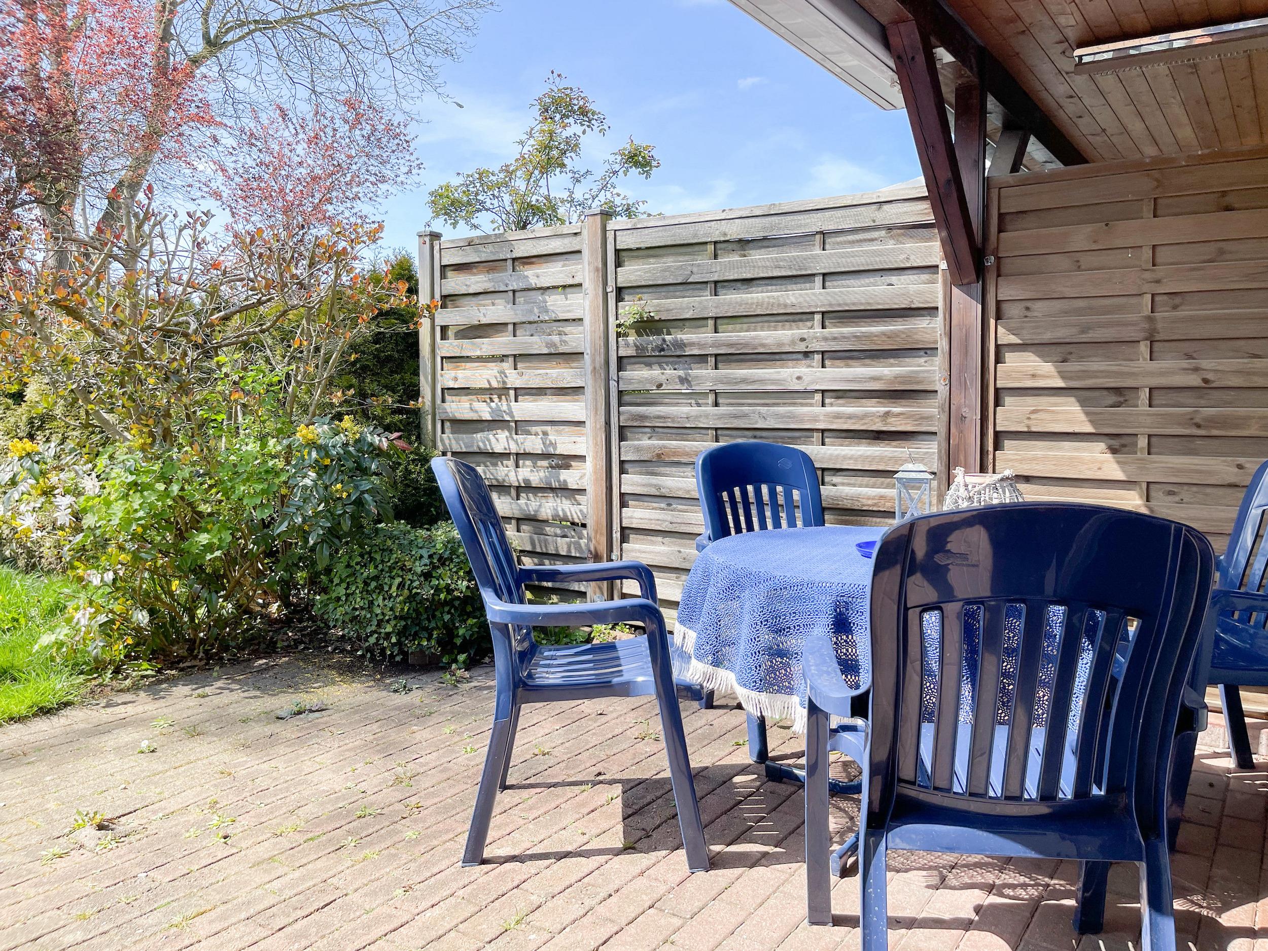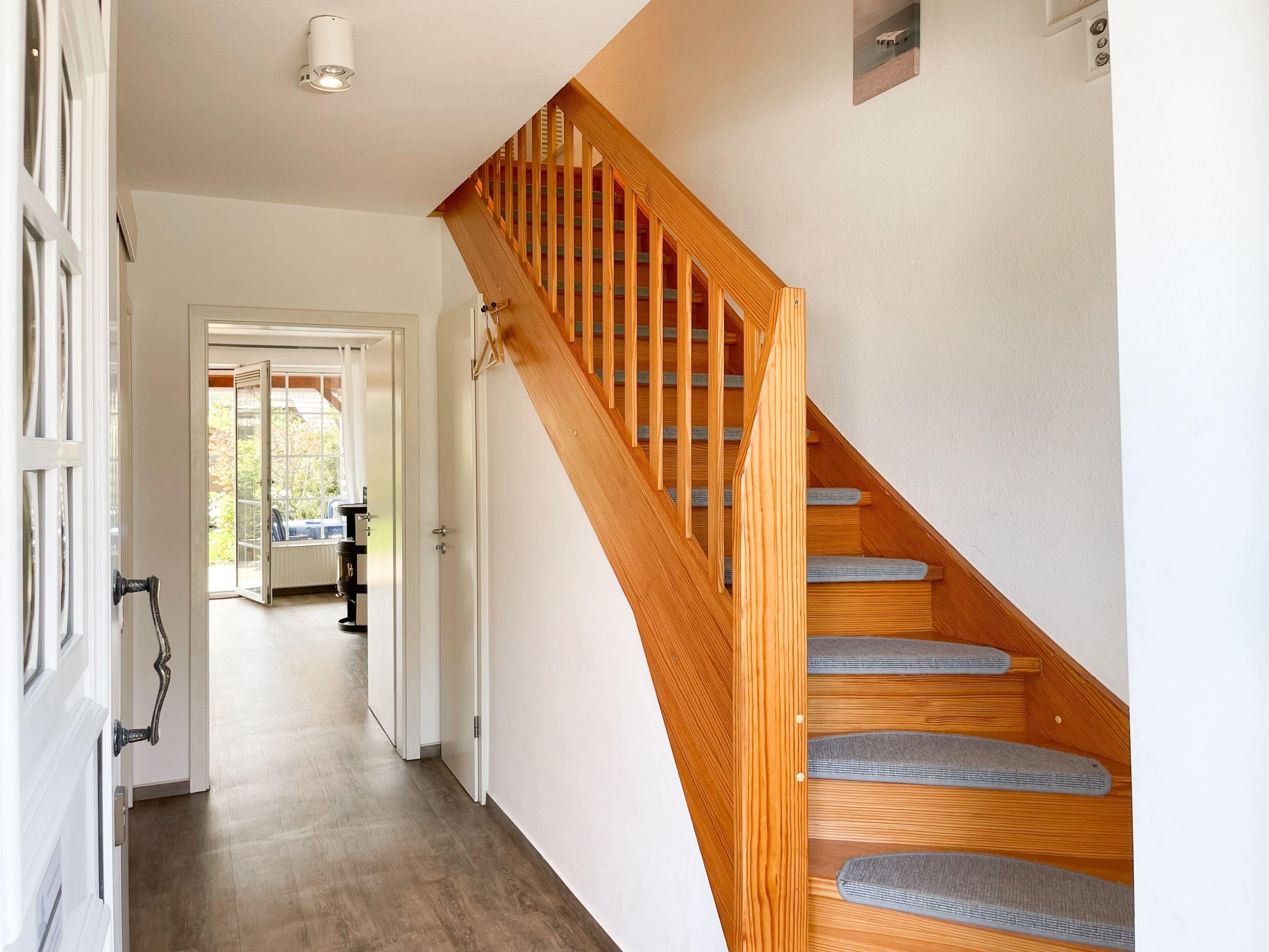 Das Ferienhaus bietet auf ca. 75 qm Wohnfläche über 2 Ebenen[nbsp] ausreichend Platz für 4 Personen (+Baby im Reisebett). Im Erdgeschoss[nbsp] befindet sich eine moderne, abgeschlossene Einbauküche mit Mikrowelle, Backofen, Kochfeld und Spülmaschine. Im hellen, freundlichen Wohnraum mit integriertem Essbereich befindet sich eine gemütliche Sitzecke und ein Kamin. TV und Radio sowie kostenloser Internetzugang über WLAN stehen zur Verfügung. Vom Wohnraum ist die großzügige, überdachte Südterrasse mit anschließendem, kleinen Garten zu betreten. Eine elektrische Markise sorgt für ausreichend Schatten. Der Außenbereich bietet einen herrlichen Rückzugsort zu jeder Tageszeit. Ein Gäste WG ist ebenfalls im EG untergebracht. Im Obergeschoss befinden sich zwei separate Schlafzimmer, die beide mit einem Boxspringbett (180x200) und Verdunkelungsplissees ausgestattet sind sowie das Duschbad. Eine Garage gehört zum Objekt.