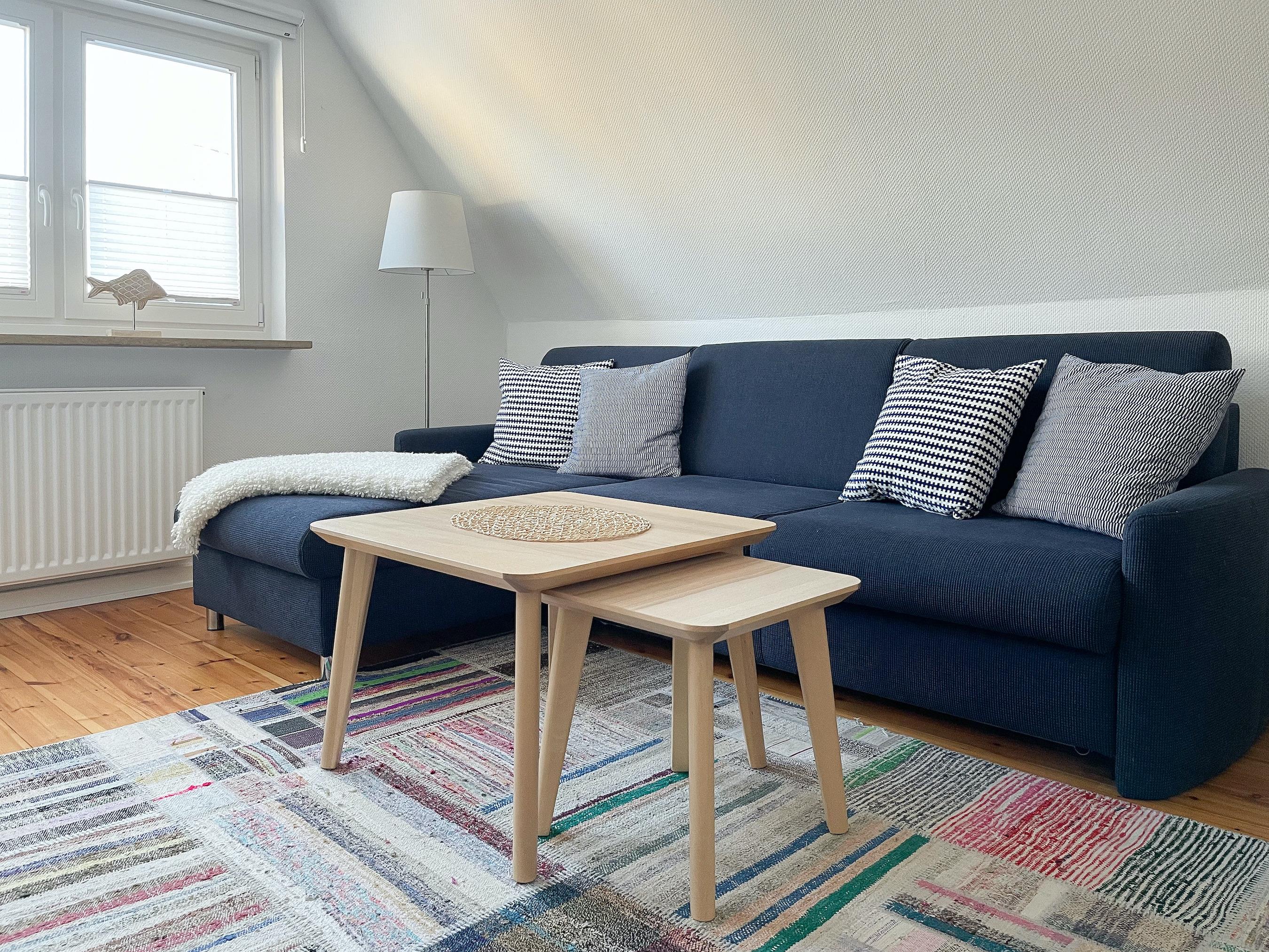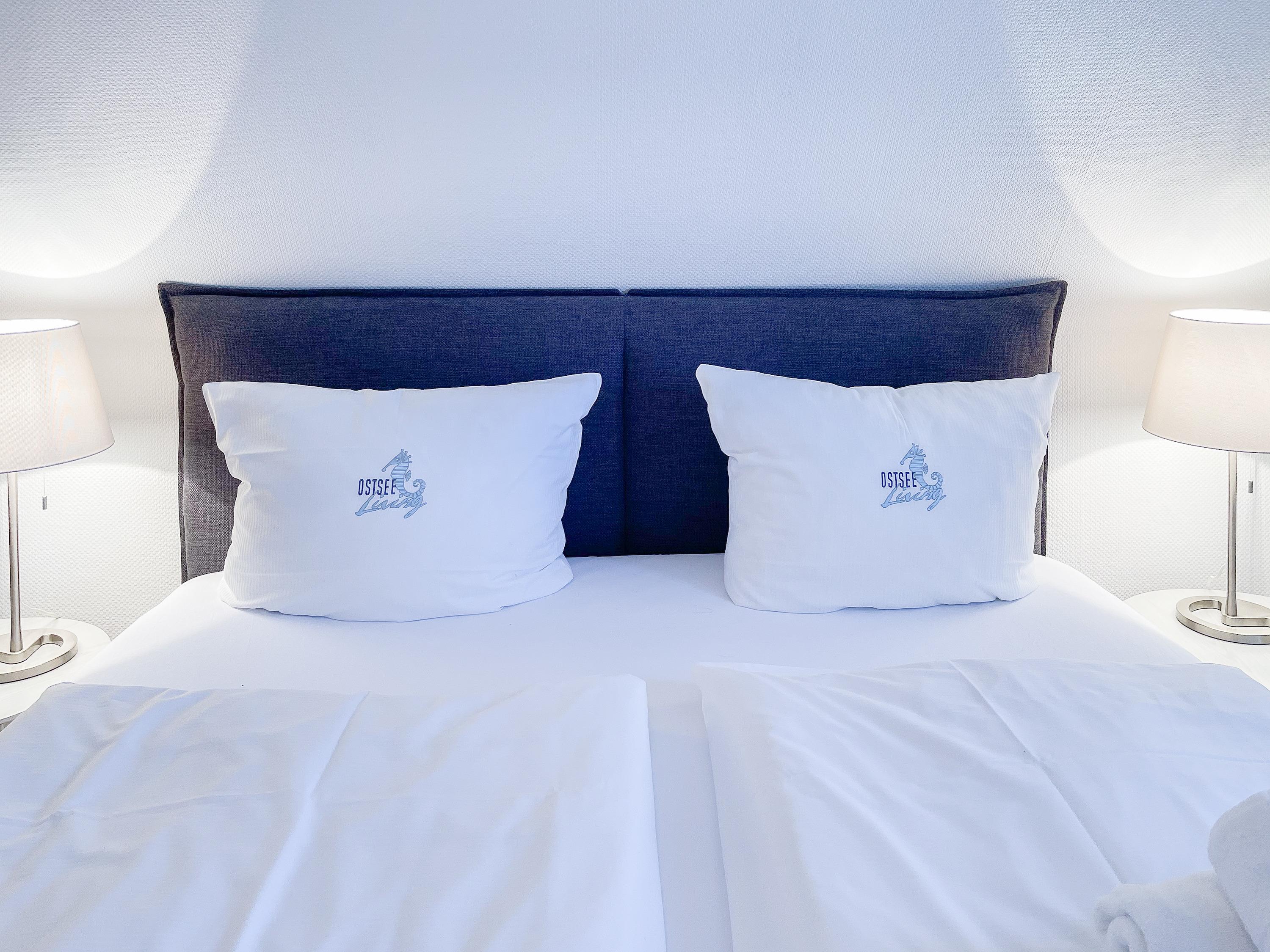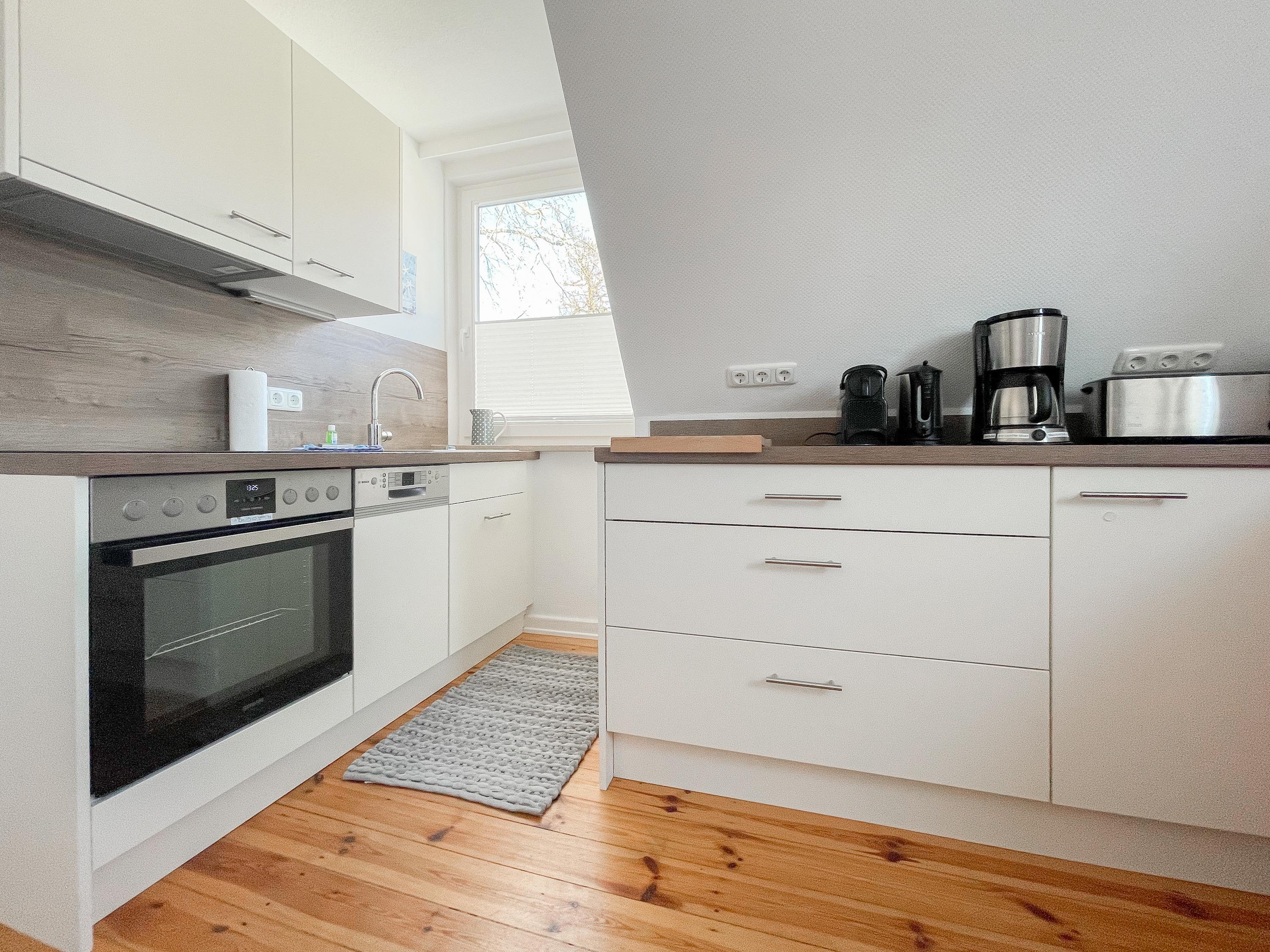 Die Wohnung verfügt über ein großzügiges Schlafzimmer mit Boxspringbett (180x200) und TV, ein helles Duschbad mit viel Tageslicht und ein gemütliches Wohnzimmer mit Schlafsofa (140x200), TV,[nbsp] Bluetoothanlage und WLAN. Die gesamte Einrichtung ist hochwertig und vermittelt eine tolle Strandatmosphäre. Die separate, neue Küche mit Essbereich für 2 - 4 Personen, ist bestens ausgestattet mit Spülmaschine, Backofen und Mikrowelle.