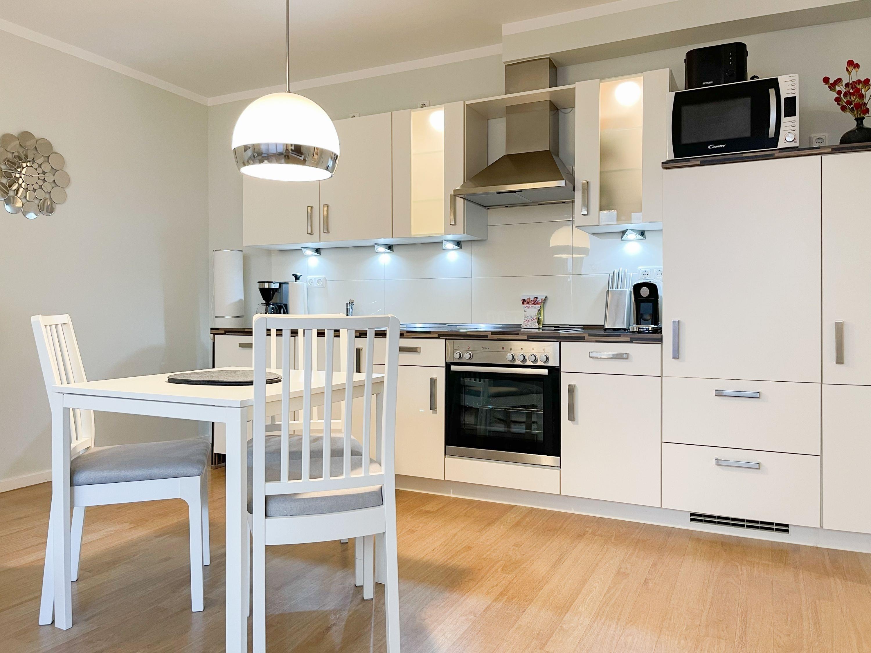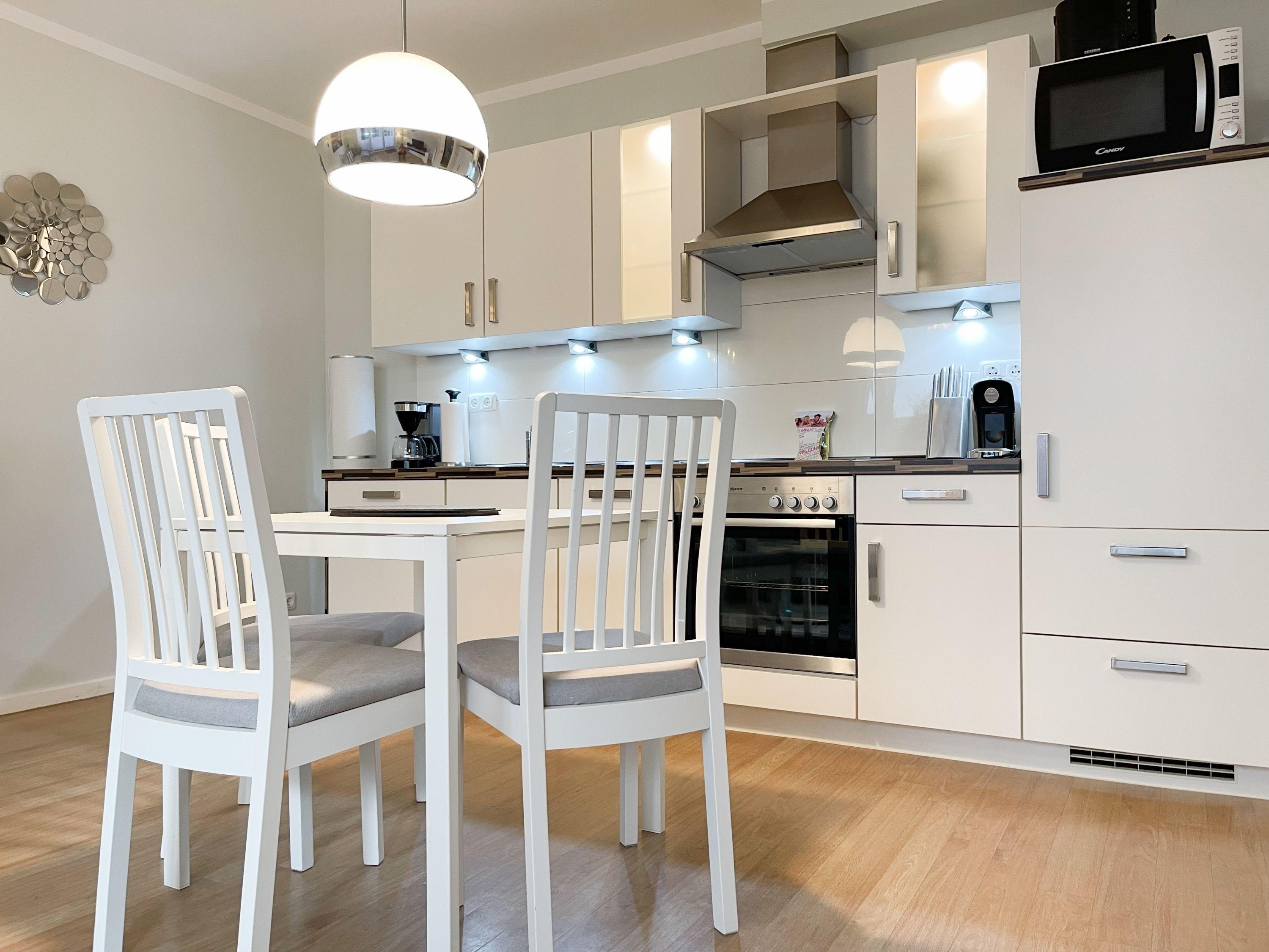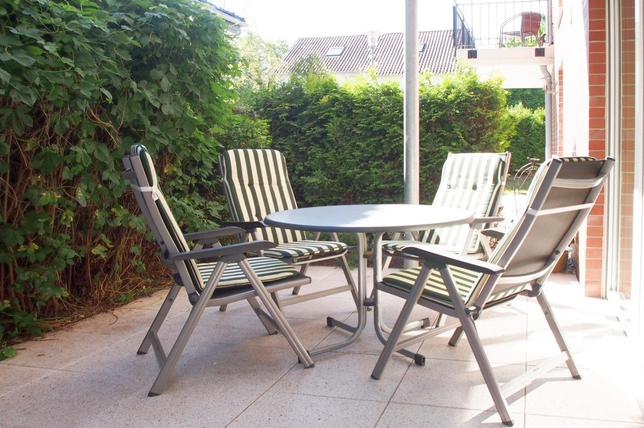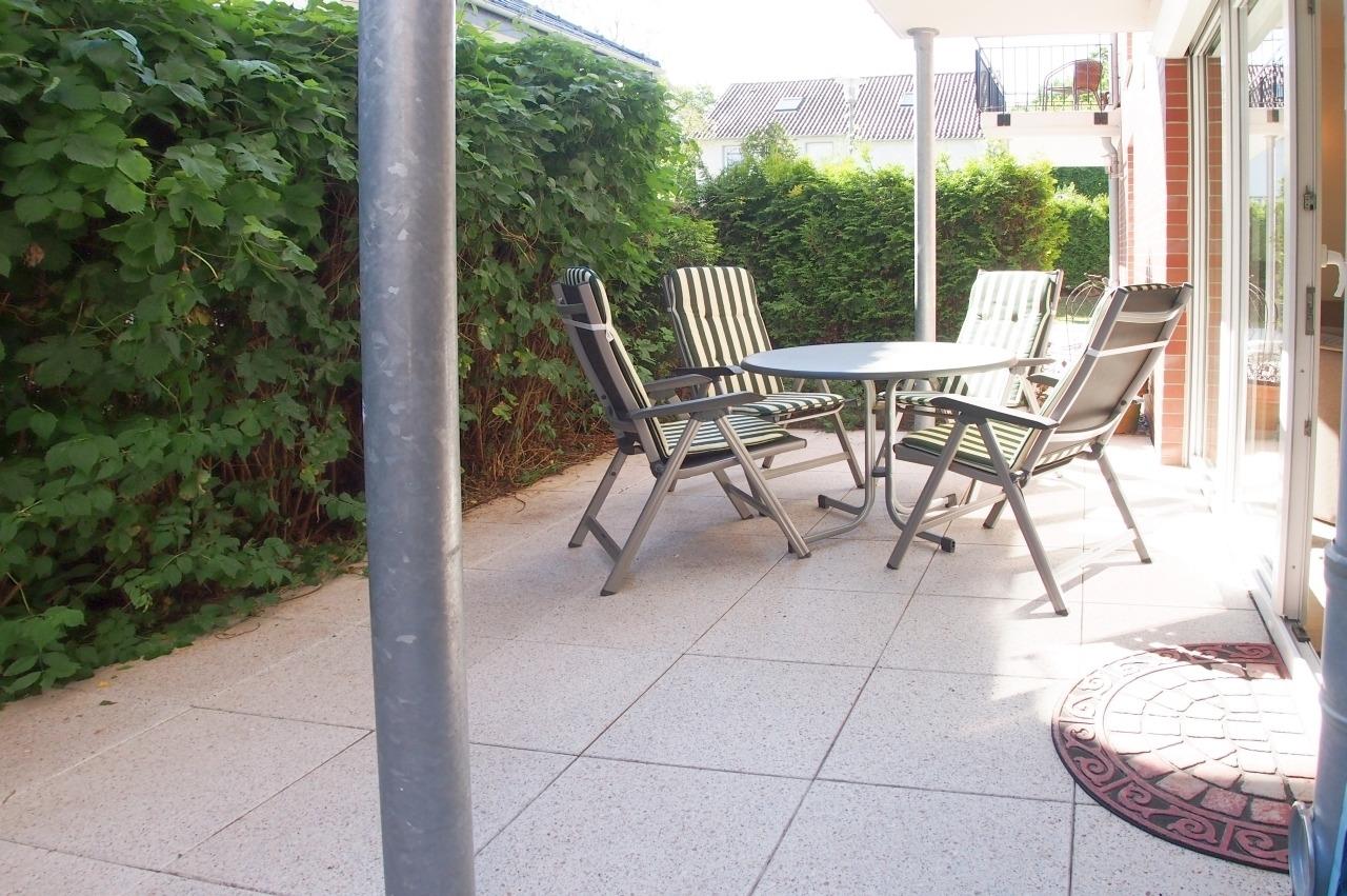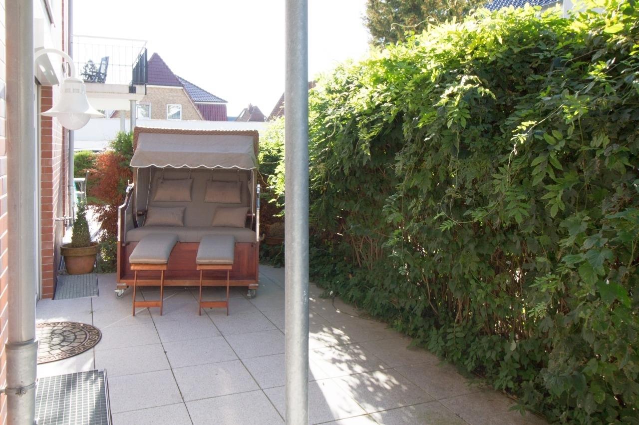 Die Ferienwohnung ist modern eingerichtet und gespickt mit netten Details. Über eine Diele geht es in die voll ausgestattete hochwertige, offene Küche. Dort findet man vom Kaffee- und Espresso-Automat über Mikrowelle bis zum Geschirrspüler alles was das Selbstversorgerherz begehrt. Im gemütlichen Wohn- und Esszimmerbereich tragen ein TV, Stereoanlage und kostenloser Internetzugang über WLAN zur Unterhaltung bei. Die hochwertige und bequeme Ledercouch wird im Handumdrehen zum komfortablen Bett (160x200). Die elektrischen Außenrollos lassen auch mal den Tag zur Nacht werden. Im Wohnzimmer finden sie auch einen der zwei Zugänge zur ca. 24 qm großen möblierten Terrasse. Mit dem extra großen Strandkorb auf Rollen haben Sie immer einen Platz an der Sonne. Der 2. Zugang zur Terrasse führt aus dem Schlafzimmer. Selbstverständlich sorgen auch hier Außenrollos für die Verdunkelung. Im Schlafzimmer steht ein Doppelbett (160x200),[nbsp] von dem aus Sie das Programm auf dem TV oder auch DVD sehen können. Das moderne Duschbad hat eine bodenebene Dusche und ist mit Haartrockner, Kosmetikspiegel und Musik ausgestattet. Ein fester PKW-Stellplatz befindet sich direkt auf dem Grundstück. Im Gemeinschaftskeller befinden sich Waschmaschine und Trockner zur kostenlosen Nutzung.