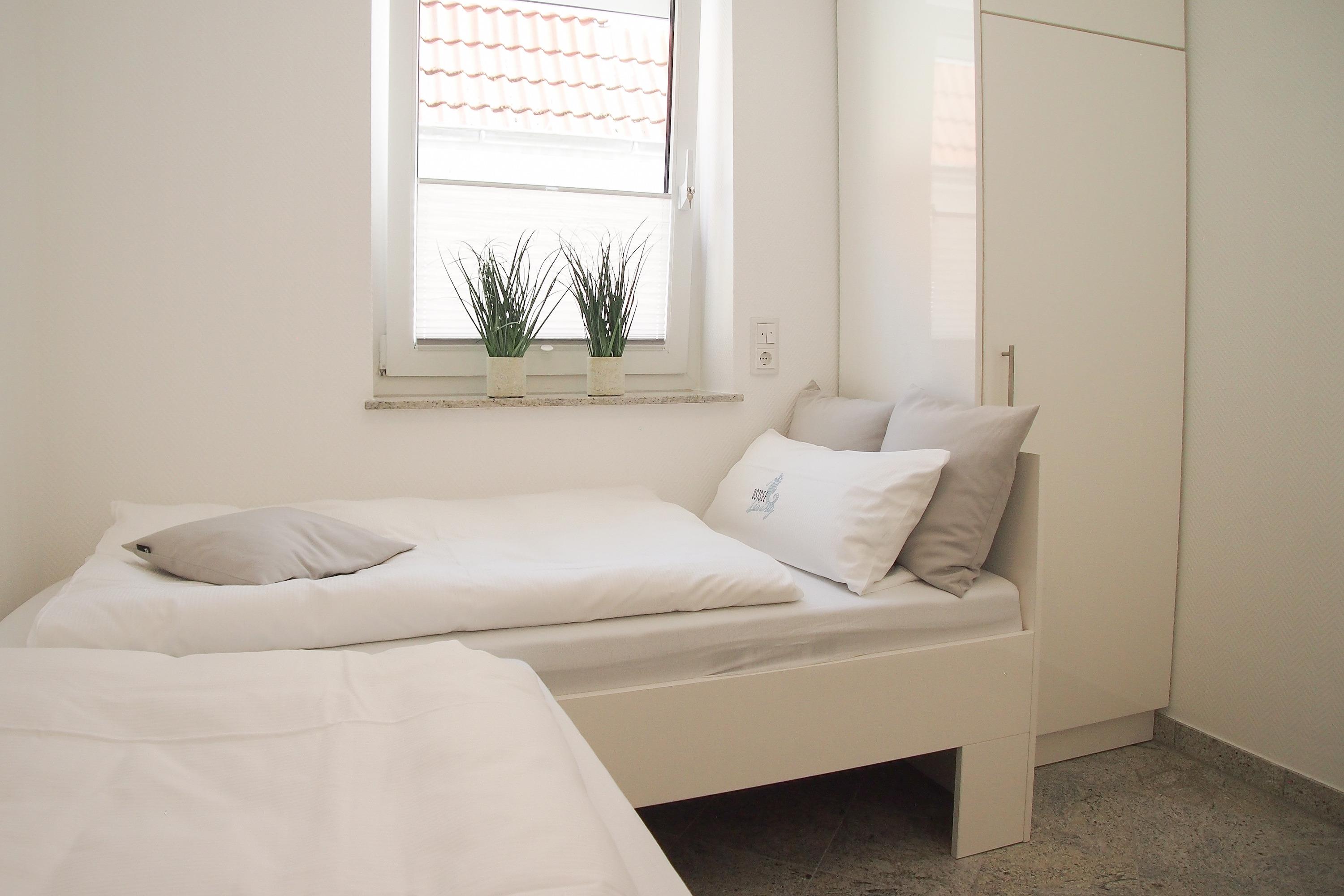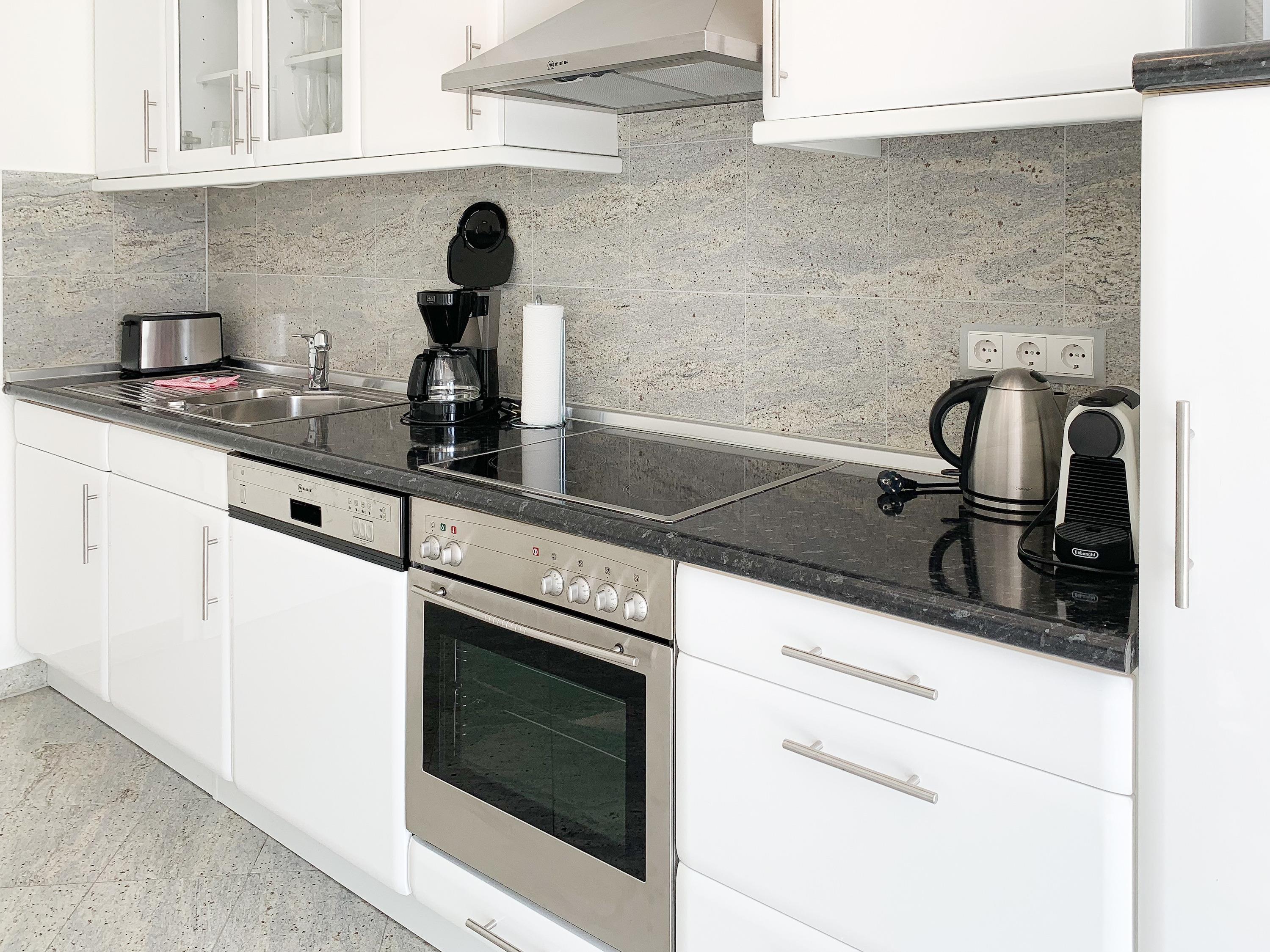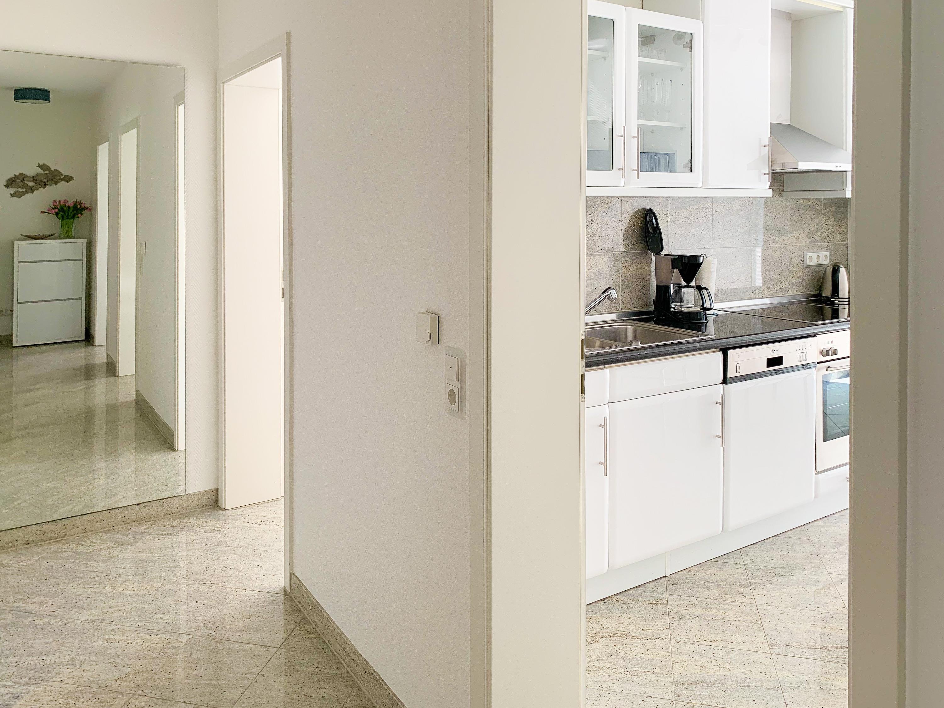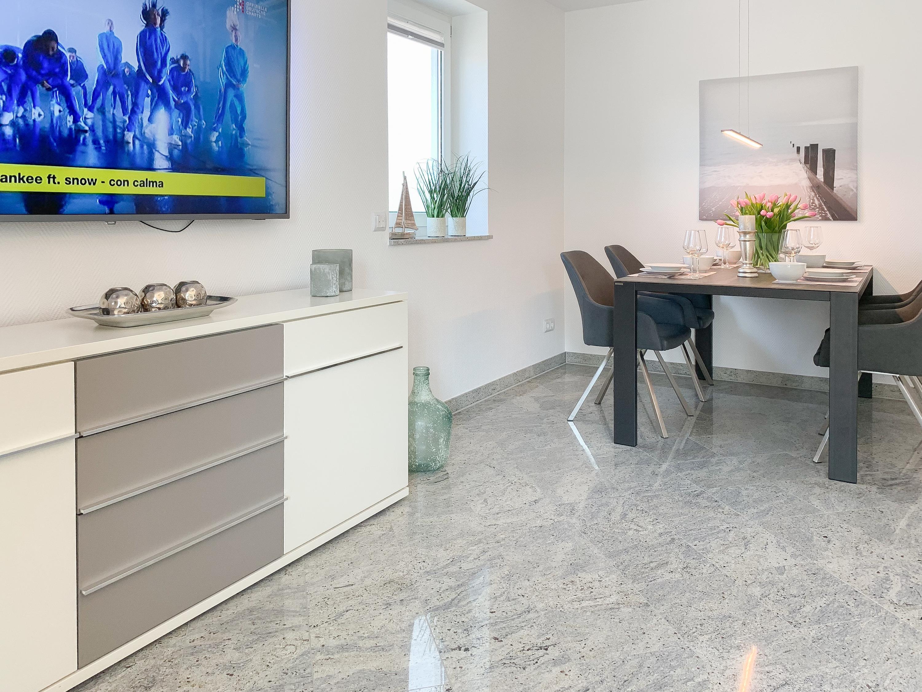 Mittelpunkt der Ferienwohnung ist der großzügige, geschmackvoll gestaltete Wohnbereich mit angrenzendem Essbereich, der 4 Personen ausreichend Platz bietet. TV, Radio, Bose Bluetooth Lautsprecher und kostenloser Internetzugang über WLAN sind selbstverständlich vorhanden. Die moderne, abgeschlossene Küche ist bestens ausgestattet und verfügt über alle technischen Geräte. Ein Bartisch mit zwei Stühlen dient als zusätzlicher Frühstücksbereich oder als Treffpunkt für gemeinsames Kochen. Zwei separate Schlafzimmer liegen[nbsp] ruhig zur straßenabgewandten Seite. Sie sind mit[nbsp] maßgefertigten Einbauschränken und elektrischen Außenjalousien ausgestattet. Das eine Schlafzimmer verfügt über zwei Einzelbetten (90x200), das andere über ein Doppelbett (180x200) und einen zusätzlichen TV. Das Bad ist mit einem weiteren Bluetooth Lautsprecher, Dusche, Waschtisch, WC, Handtuchwärmer und einer Waschmaschine ausgestattet.