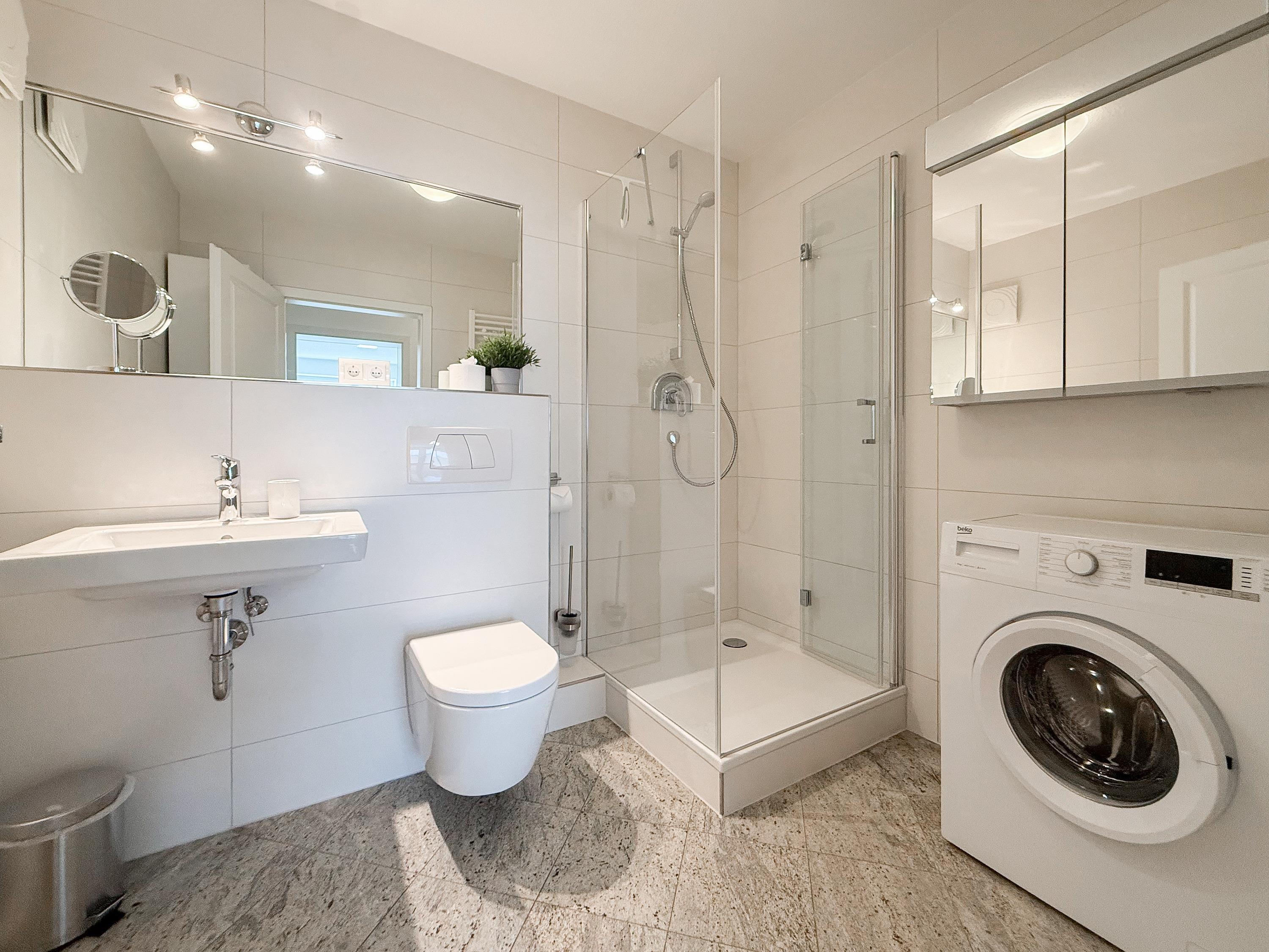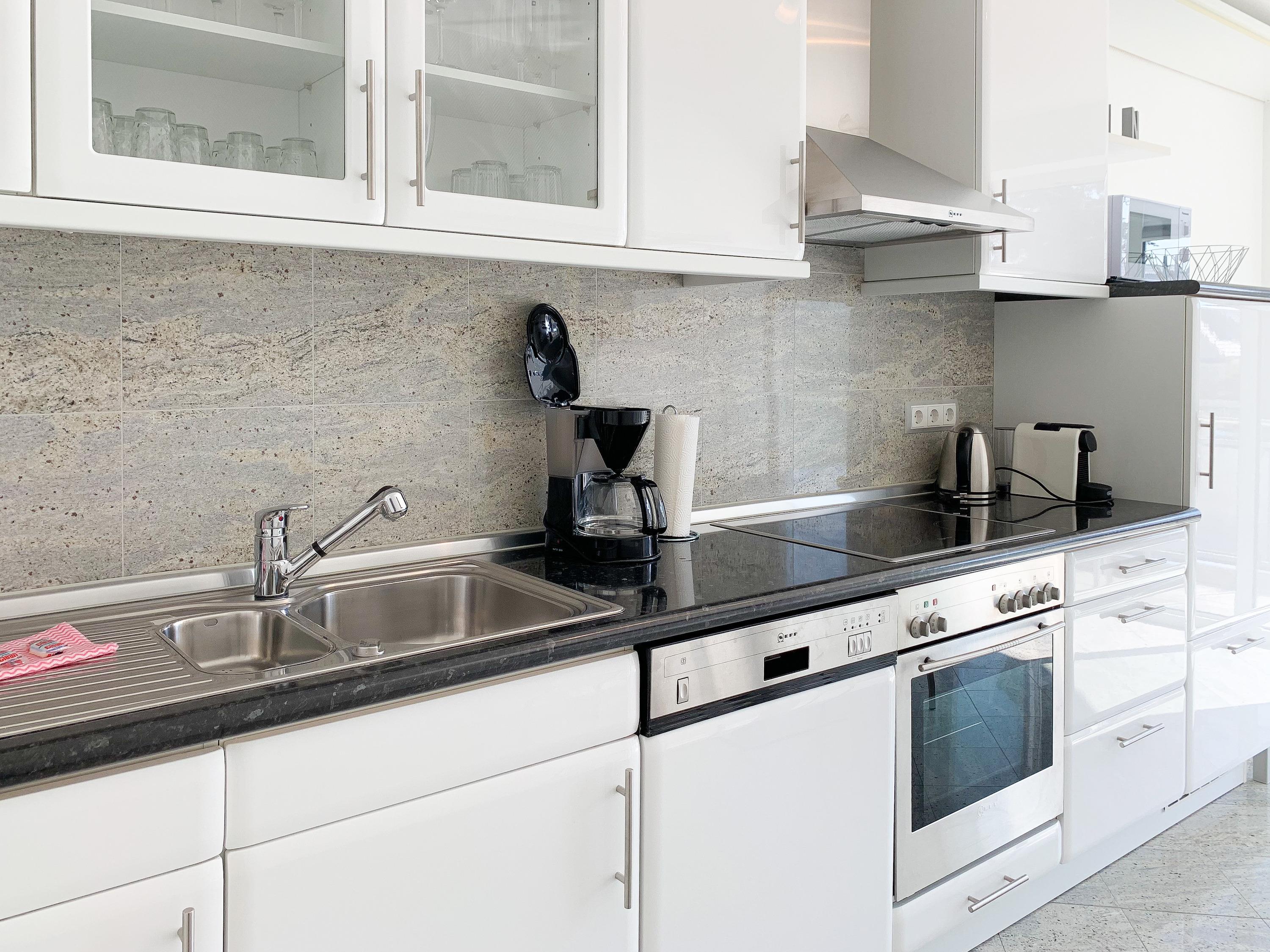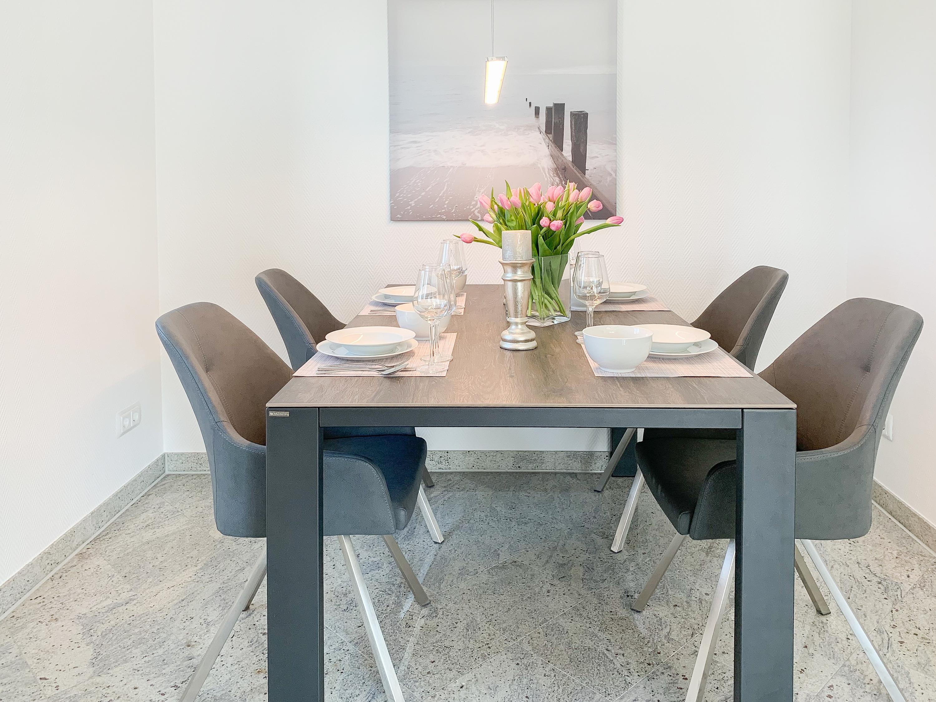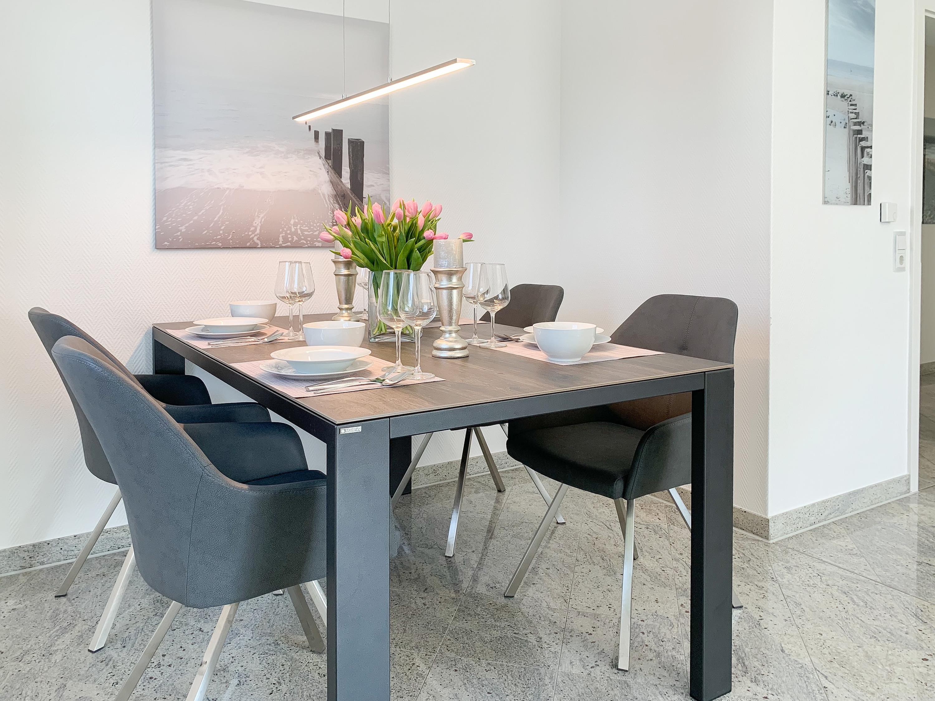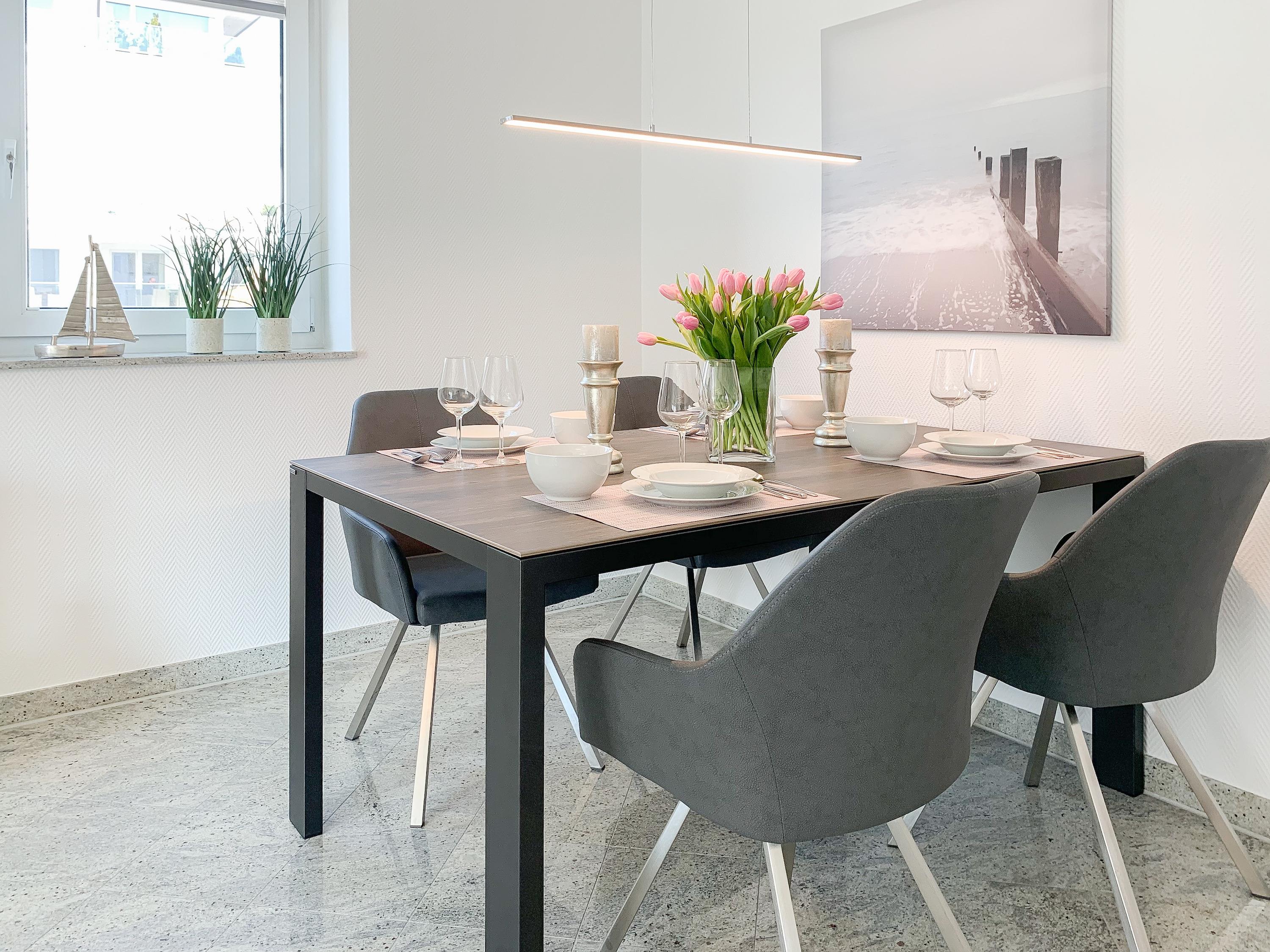 Mittelpunkt der Ferienwohnung ist der großzügige, geschmackvoll gestaltete Wohnbereich mit angrenzendem Essbereich, der 4 Personen ausreichend Platz bietet. TV, Radio, Bose Bluetooth Lautsprecher und kostenloser Internetzugang über WLAN sind selbstverständlich vorhanden. Die moderne, abgeschlossene Küche ist bestens ausgestattet und verfügt über alle technischen Geräte. Ein Bartisch mit zwei Stühlen dient als zusätzlicher Frühstücksbereich oder als Treffpunkt für gemeinsames Kochen. Zwei separate Schlafzimmer liegen[nbsp] ruhig zur straßenabgewandten Seite. Sie sind mit[nbsp] maßgefertigten Einbauschränken und elektrischen Außenjalousien ausgestattet. Das eine Schlafzimmer verfügt über zwei Einzelbetten (90x200), das andere über ein Doppelbett (180x200) und einen zusätzlichen TV. Das Bad ist mit einem weiteren Bluetooth Lautsprecher, Dusche, Waschtisch, WC, Handtuchwärmer und einer Waschmaschine ausgestattet.