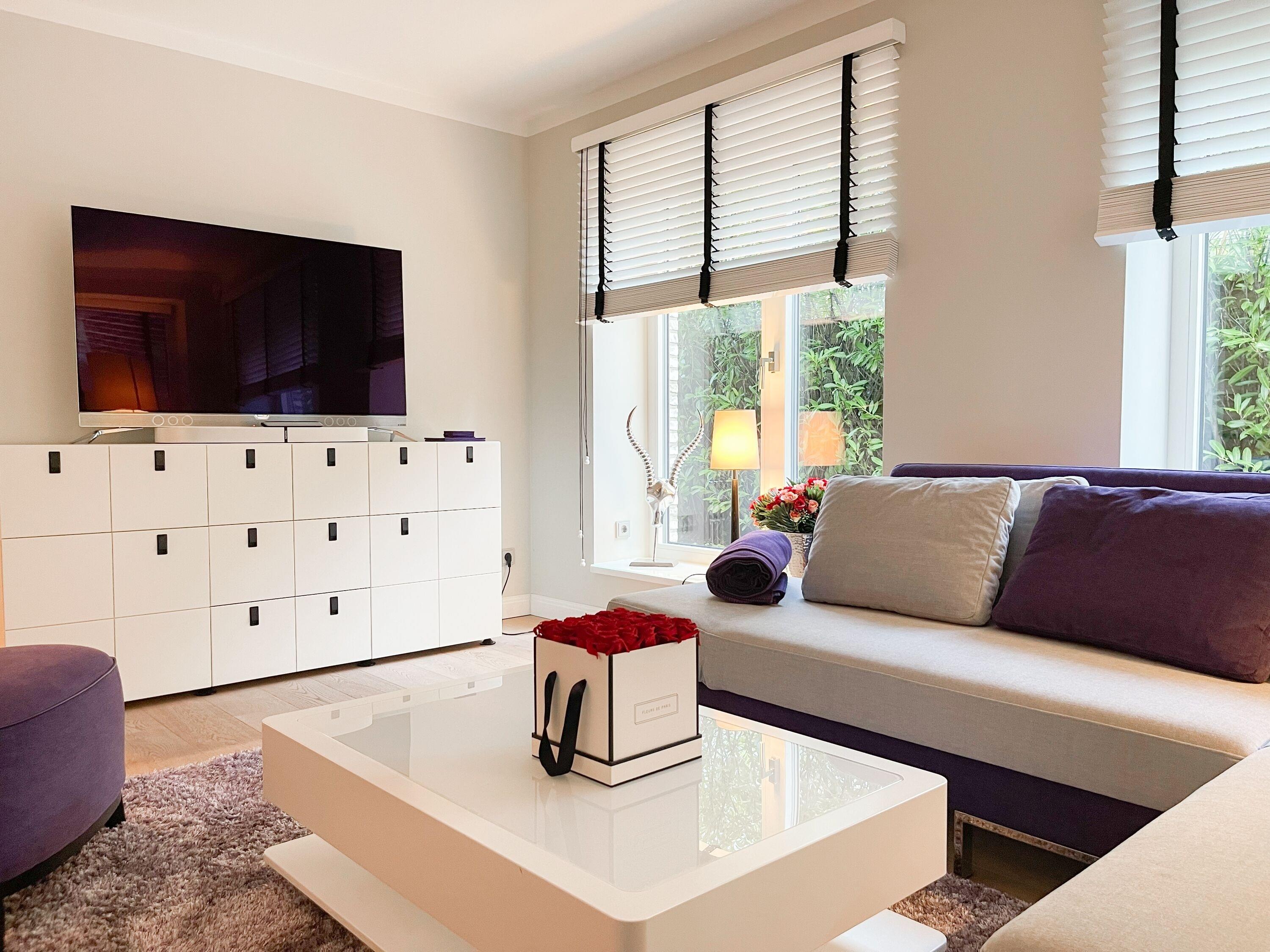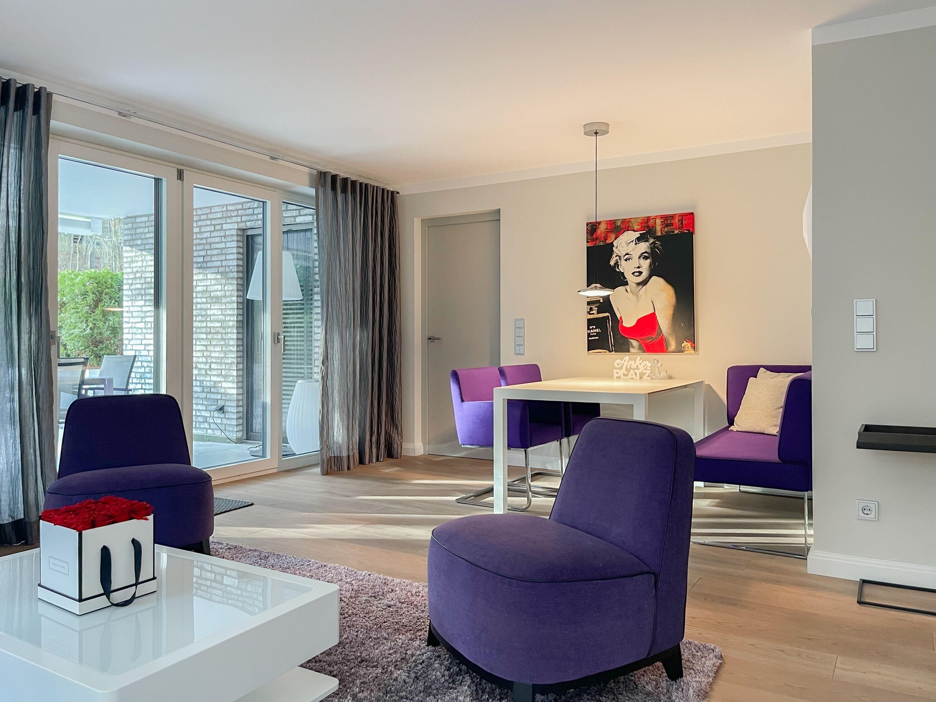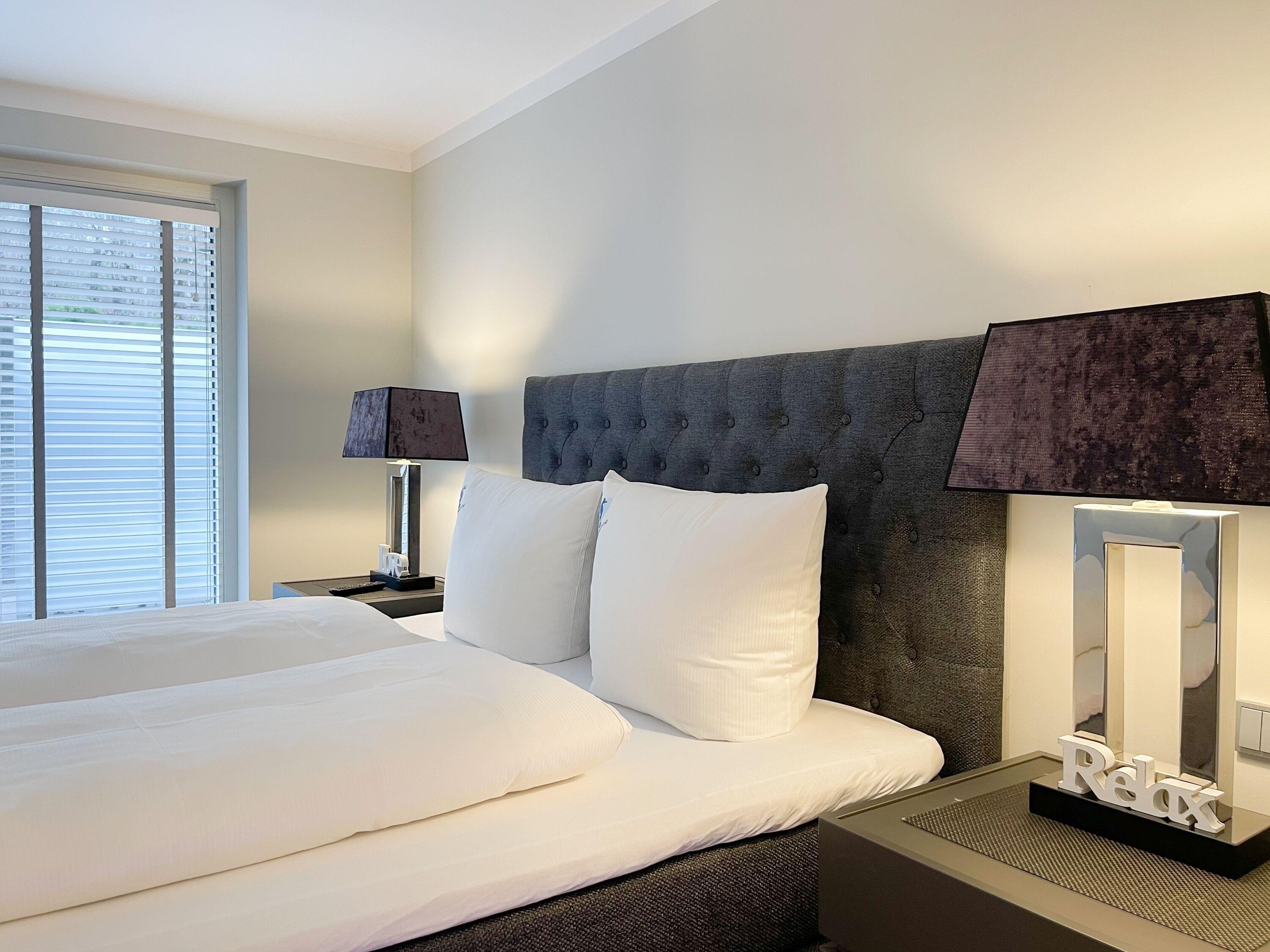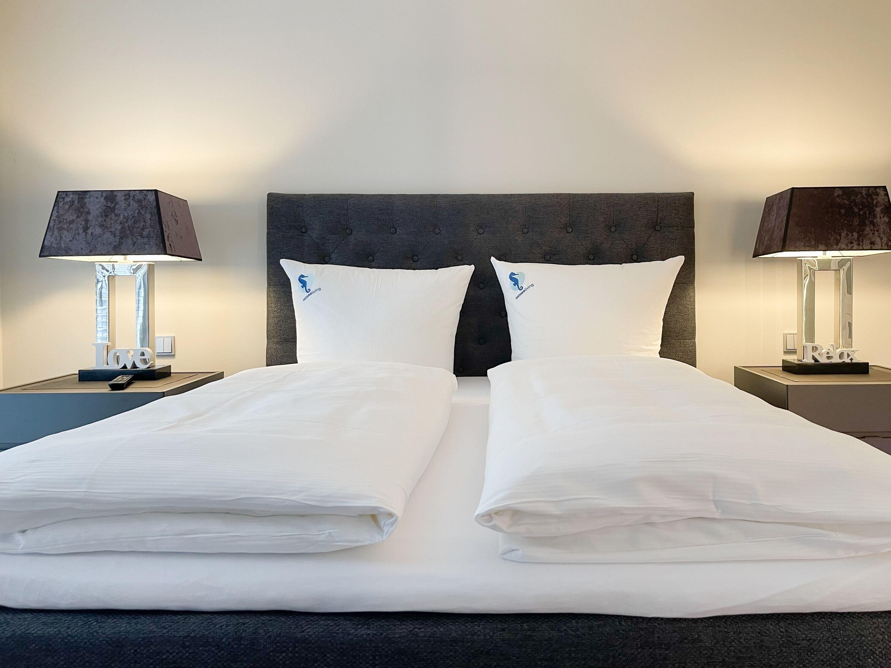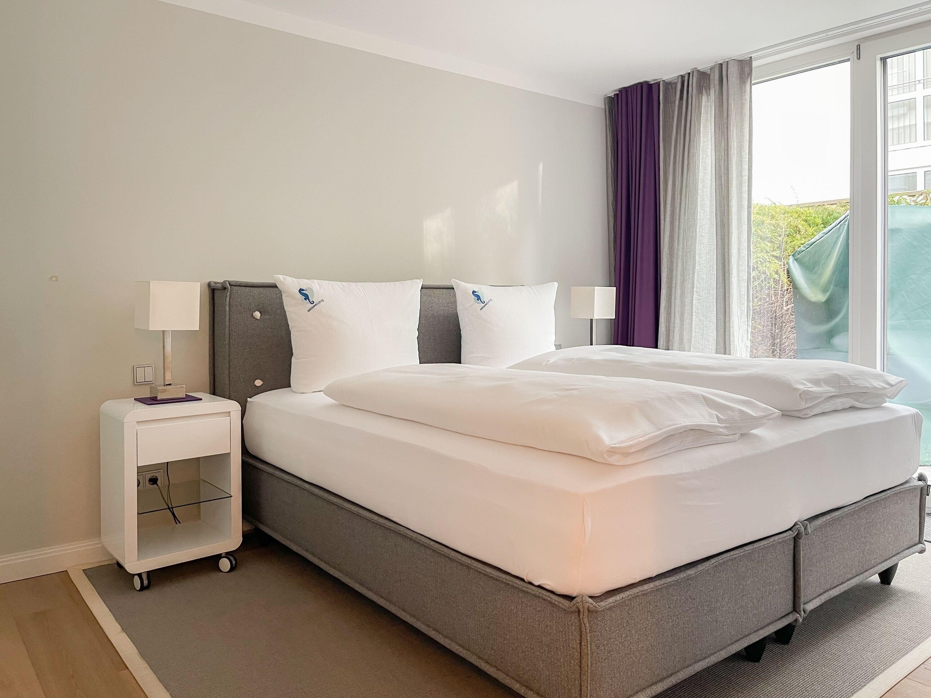 Die Wohnung bietet zeitgemäßen Luxus auf 85 qm Wohnfläche für 4 Personen und jeglichen Komfort wie Fußbodenheizung, Echtholzböden und bodentiefe Fensterelemente für ein offenes Raumgefühl. Die äußerst hochwertige Ausstattung der Wohnung gewährleistet einen respektablen Wohnstandard in einem herrlichen Ambiente. Es erwartet Sie ein offener, großzügig gestalteter Wohn-/Essbereich mit Blick auf die umlaufende, teilweise überdachte XL-Terrasse in Südausrichtung, die mit einer Markise ausgestattet ist und ausreichend Privatsphäre bietet. Die Highend Küche in perfekter Ausstattung wird Hobbyköche begeistern. Bei der Anordnung der zwei separaten Schlafzimmer, ausgestattet mit Boxspringbetten (180x200) und TV, wurde viel Wert auf Privatsphäre gelegt, indem die Räume vollständig durch die Wohnbereiche getrennt wurden. Die Fenster des einen Schlafzimmers sind mit blackout Vorhängen versehen, das andere mit Raffstores. Beide Schlafzimmer haben einen Zugang zur umlaufenden Terrasse. Es stehen zwei moderne, hochwertige Bäder zur Verfügung, ein Duschbad mit Walk In Dusche und ein Wannenbad ensuite. Zur technischen Ausstattung gehören unter anderem 3 TV, eine Sonos Soundbar, ein Radio und WLAN steht selbstverständlich zur Verfügung.