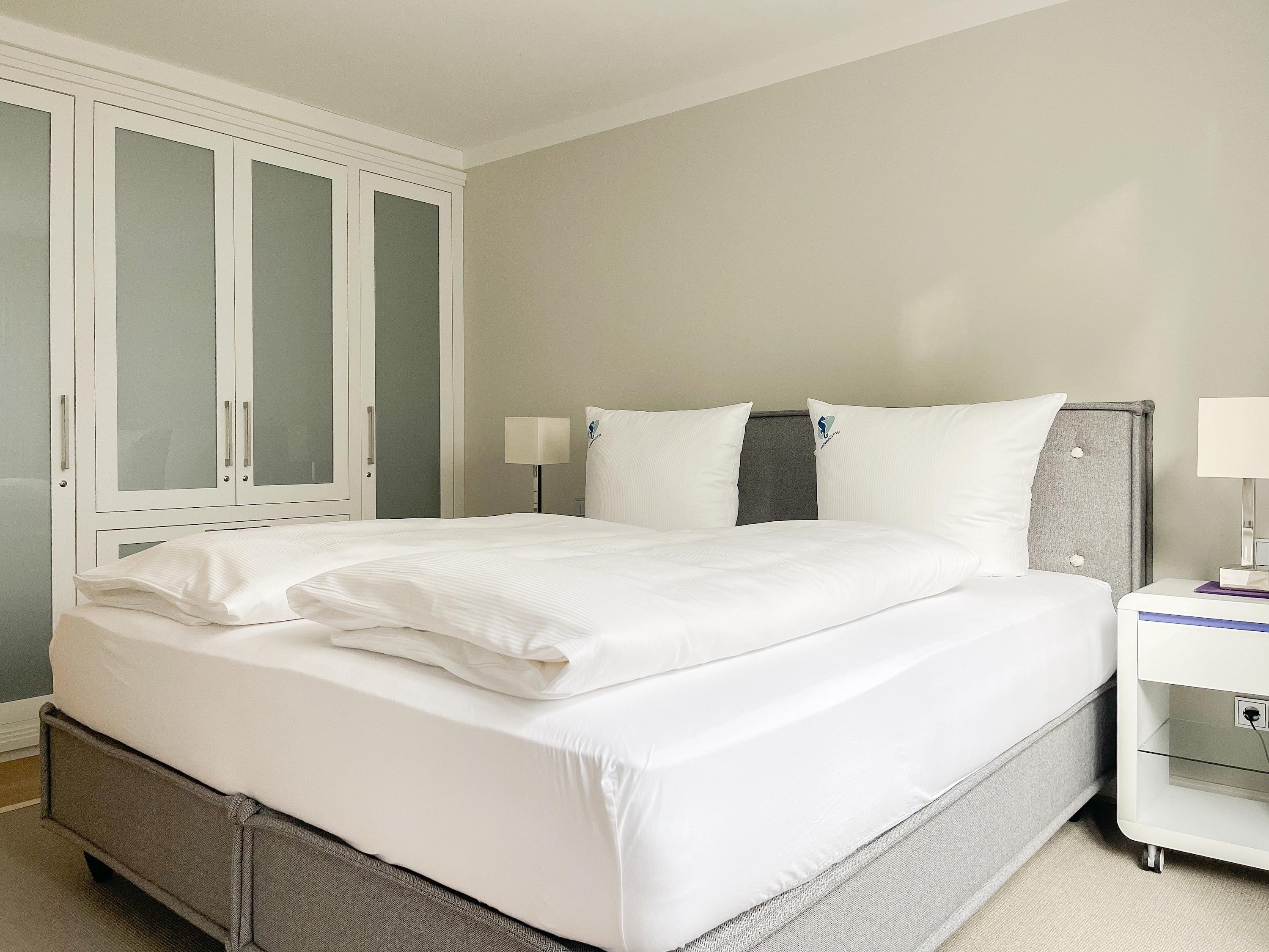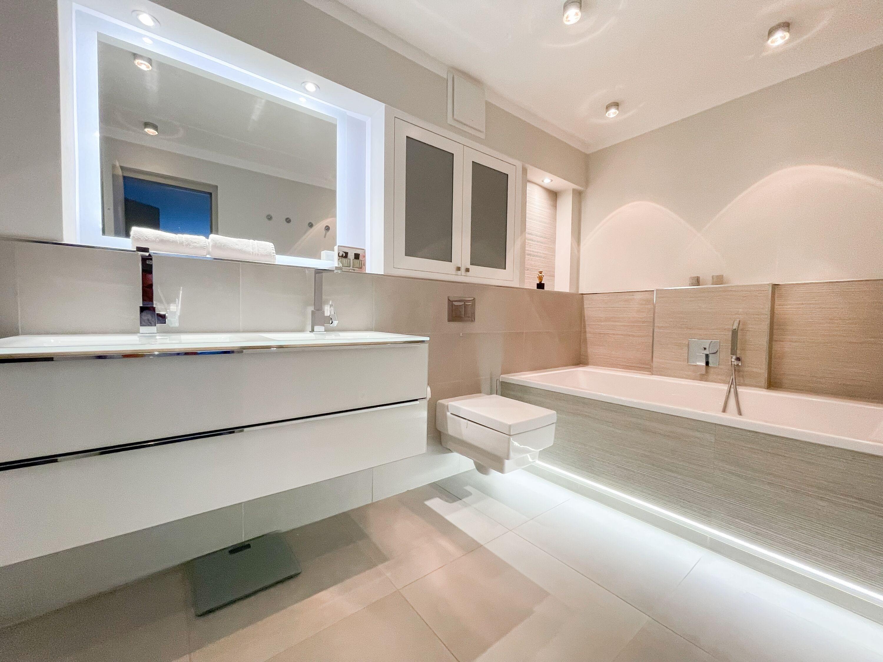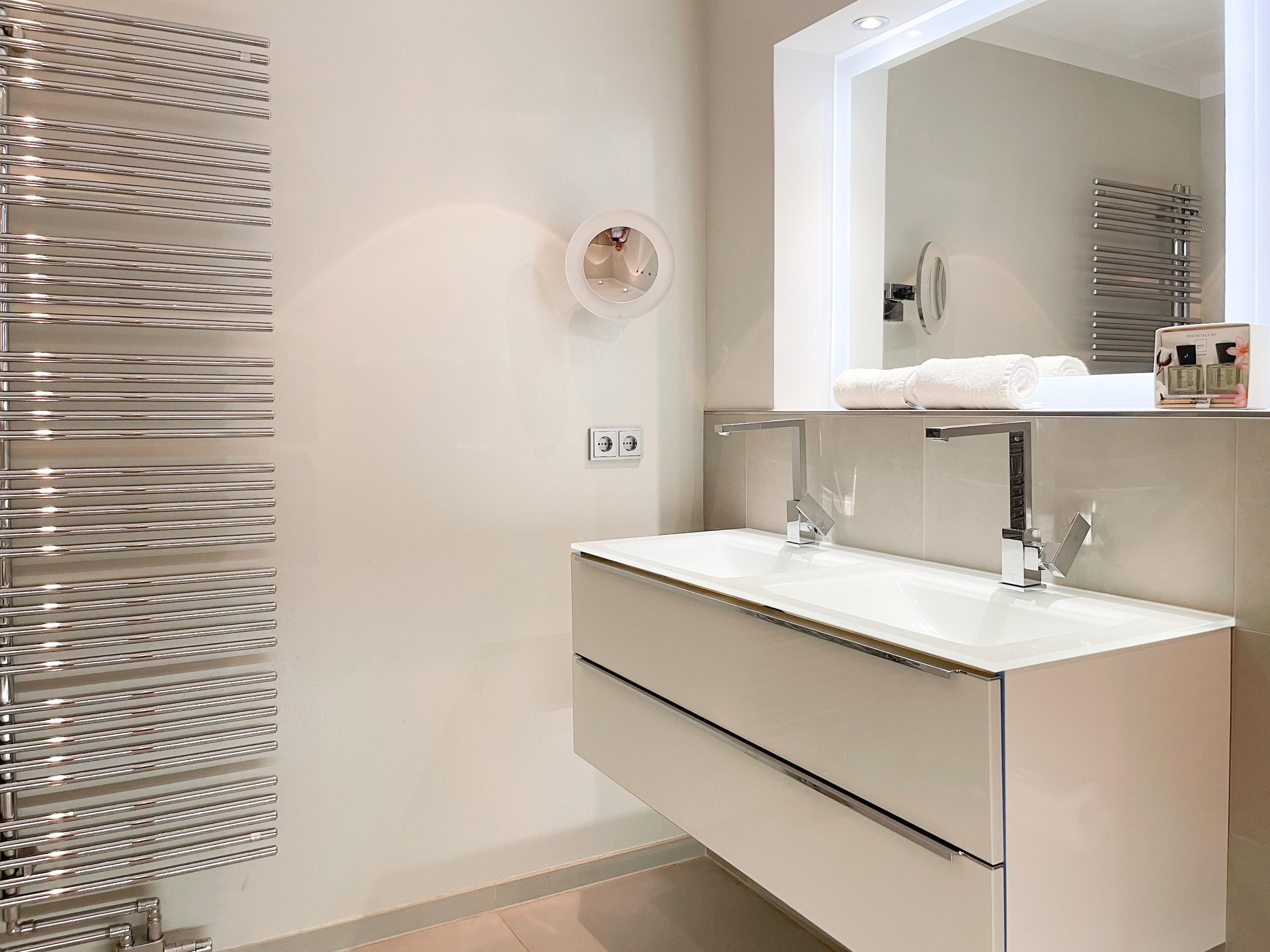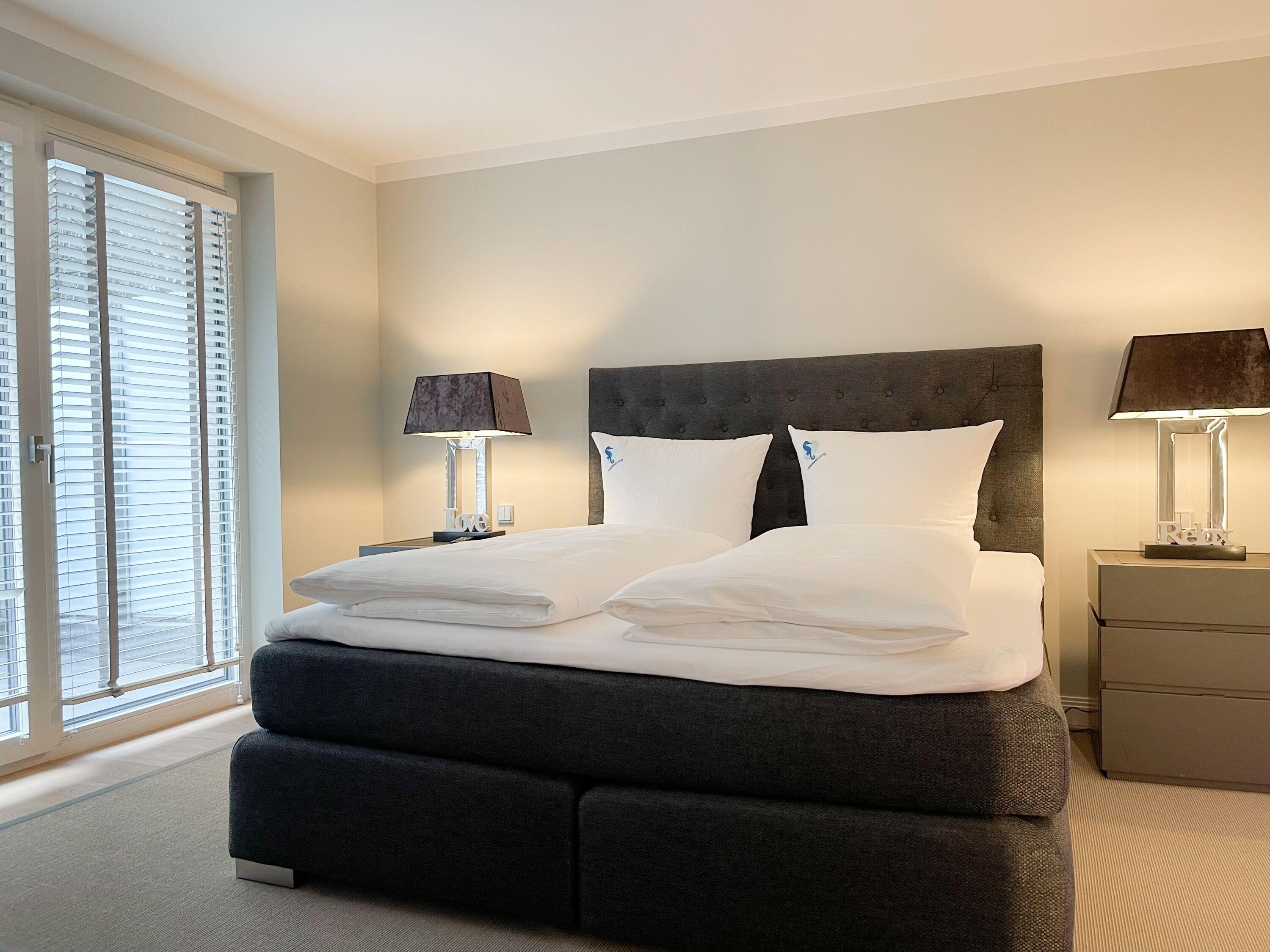 Die Wohnung bietet zeitgemäßen Luxus auf 85 qm Wohnfläche für 4 Personen und jeglichen Komfort wie Fußbodenheizung, Echtholzböden und bodentiefe Fensterelemente für ein offenes Raumgefühl. Die äußerst hochwertige Ausstattung der Wohnung gewährleistet einen respektablen Wohnstandard in einem herrlichen Ambiente. Es erwartet Sie ein offener, großzügig gestalteter Wohn-/Essbereich mit Blick auf die umlaufende, teilweise überdachte XL-Terrasse in Südausrichtung, die mit einer Markise ausgestattet ist und ausreichend Privatsphäre bietet. Die Highend Küche in perfekter Ausstattung wird Hobbyköche begeistern. Bei der Anordnung der zwei separaten Schlafzimmer, ausgestattet mit Boxspringbetten (180x200) und TV, wurde viel Wert auf Privatsphäre gelegt, indem die Räume vollständig durch die Wohnbereiche getrennt wurden. Die Fenster des einen Schlafzimmers sind mit blackout Vorhängen versehen, das andere mit Raffstores. Beide Schlafzimmer haben einen Zugang zur umlaufenden Terrasse. Es stehen zwei moderne, hochwertige Bäder zur Verfügung, ein Duschbad mit Walk In Dusche und ein Wannenbad ensuite. Zur technischen Ausstattung gehören unter anderem 3 TV, eine Sonos Soundbar, ein Radio und WLAN steht selbstverständlich zur Verfügung.