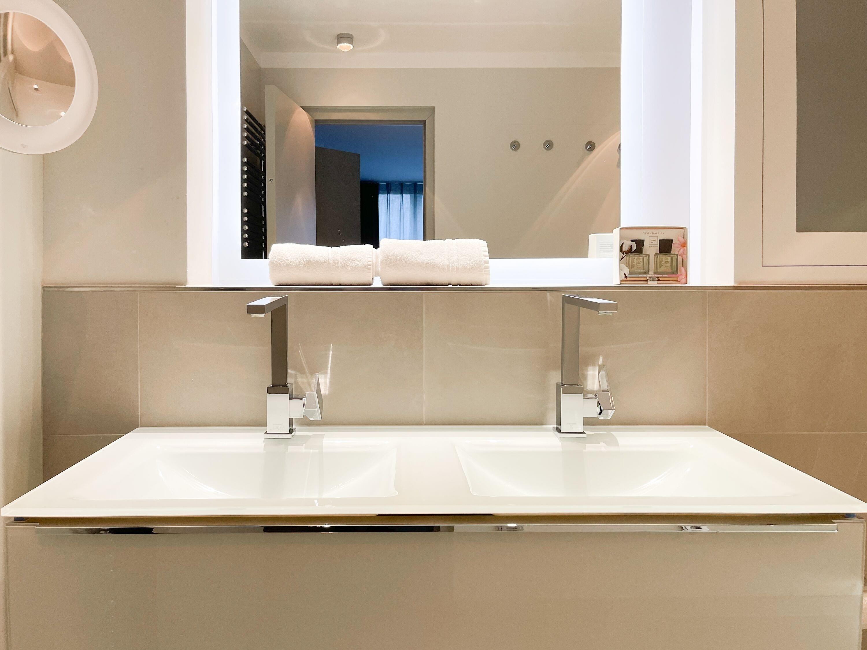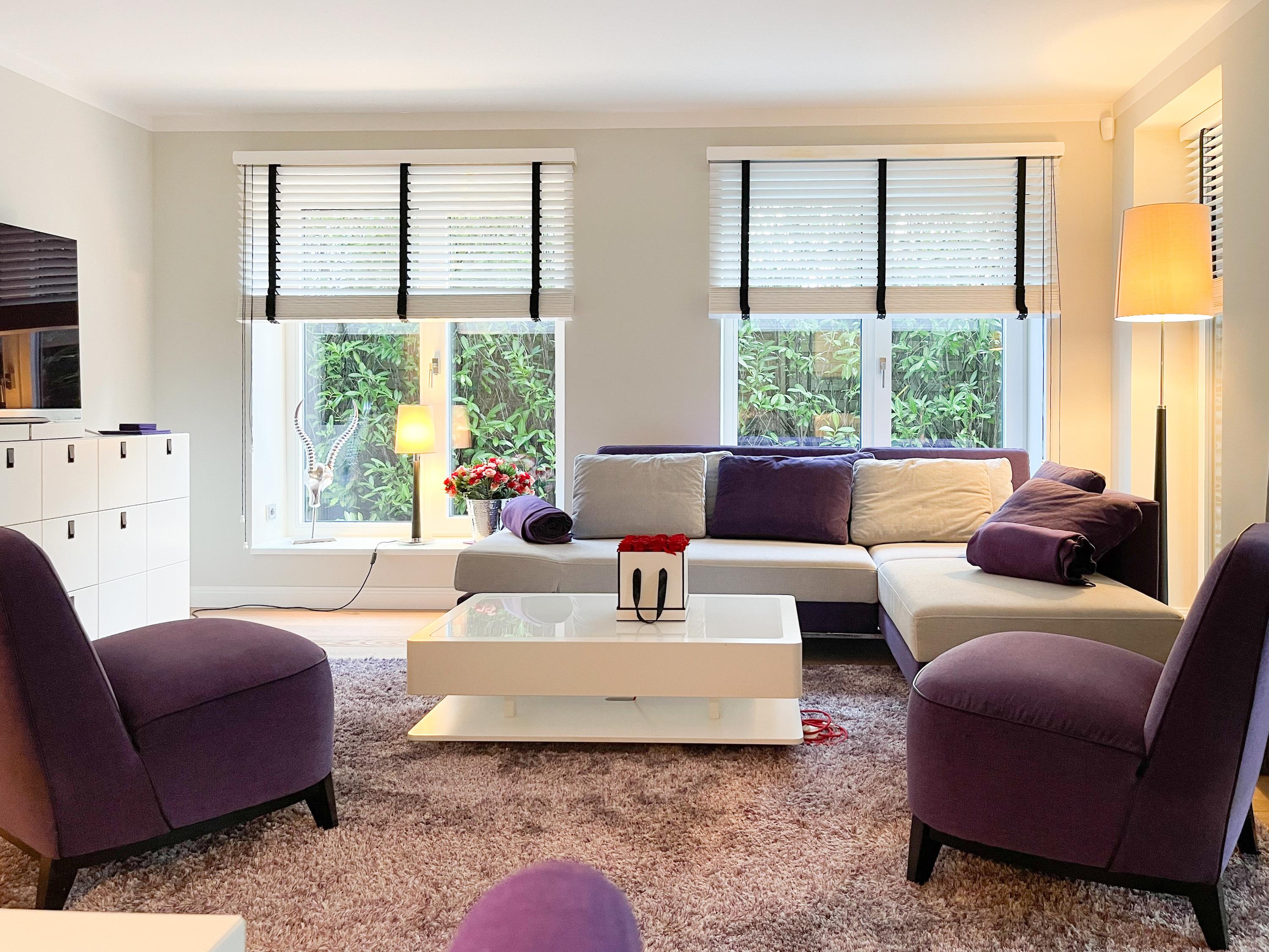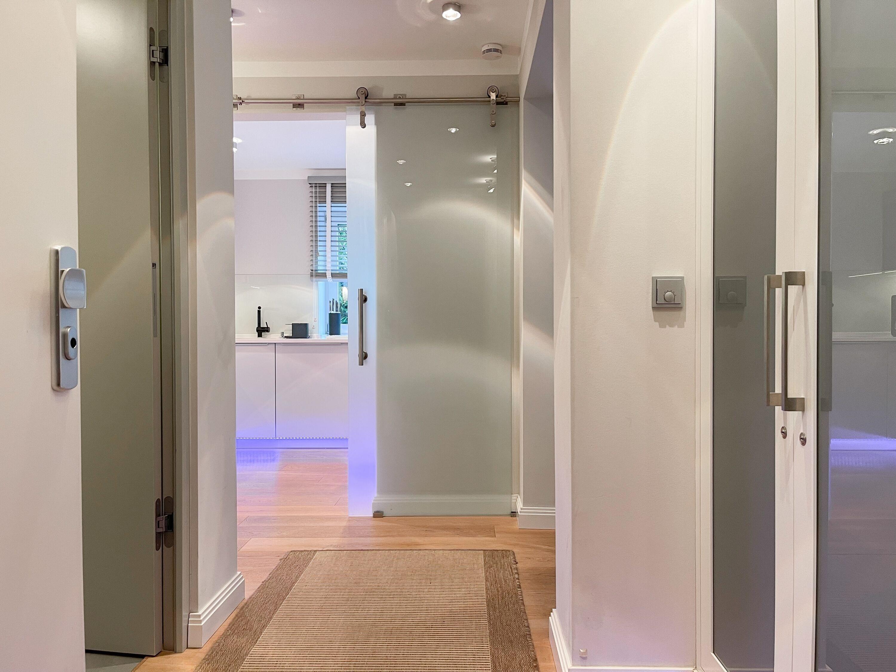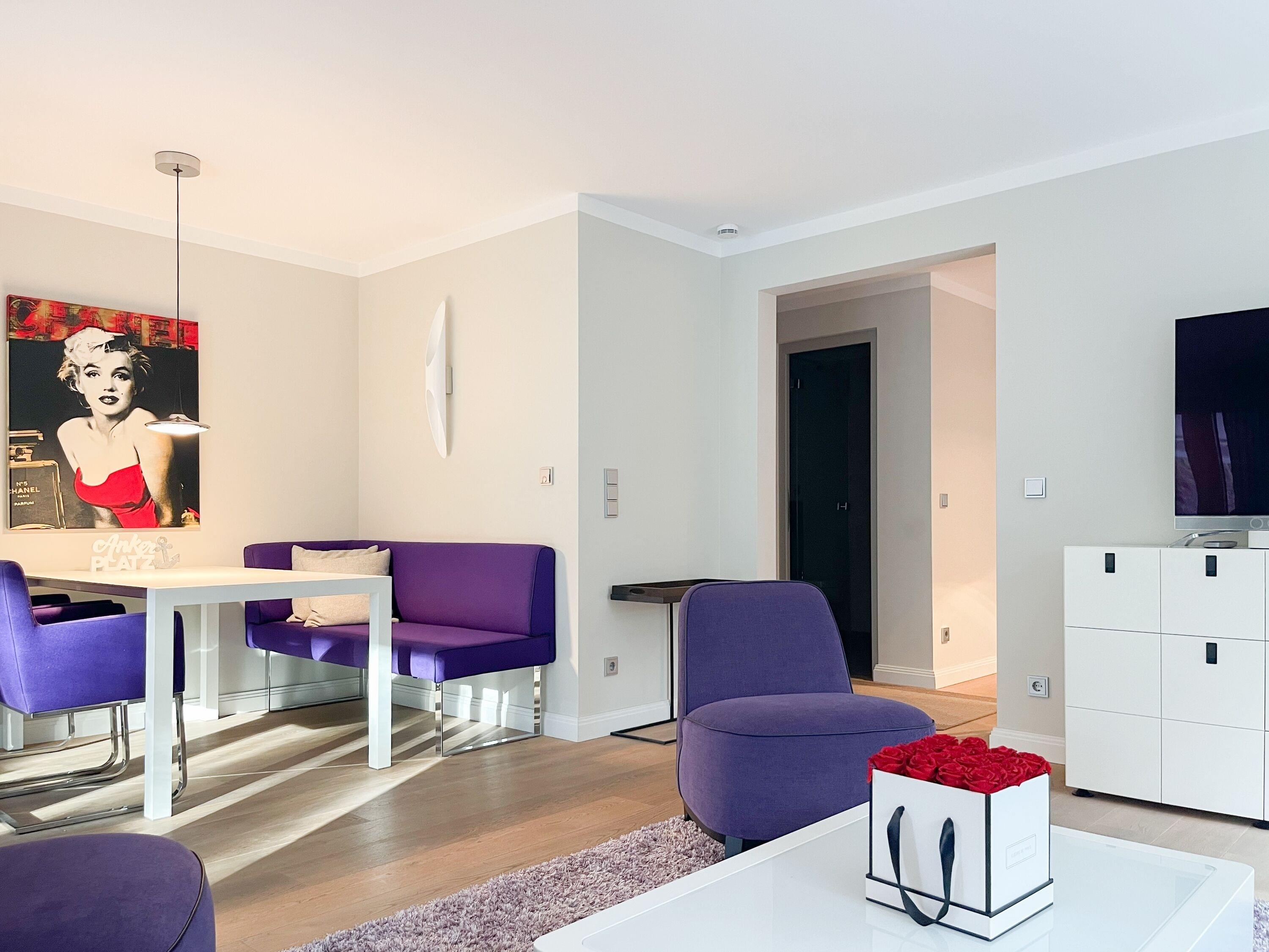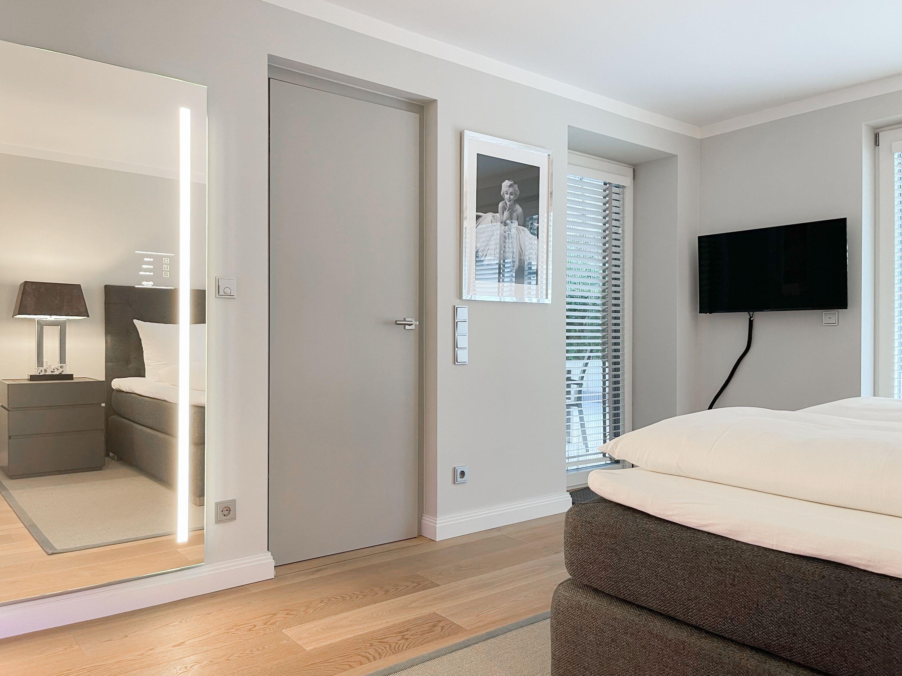 Die Wohnung bietet zeitgemäßen Luxus auf 85 qm Wohnfläche für 4 Personen und jeglichen Komfort wie Fußbodenheizung, Echtholzböden und bodentiefe Fensterelemente für ein offenes Raumgefühl. Die äußerst hochwertige Ausstattung der Wohnung gewährleistet einen respektablen Wohnstandard in einem herrlichen Ambiente. Es erwartet Sie ein offener, großzügig gestalteter Wohn-/Essbereich mit Blick auf die umlaufende, teilweise überdachte XL-Terrasse in Südausrichtung, die mit einer Markise ausgestattet ist und ausreichend Privatsphäre bietet. Die Highend Küche in perfekter Ausstattung wird Hobbyköche begeistern. Bei der Anordnung der zwei separaten Schlafzimmer, ausgestattet mit Boxspringbetten (180x200) und TV, wurde viel Wert auf Privatsphäre gelegt, indem die Räume vollständig durch die Wohnbereiche getrennt wurden. Die Fenster des einen Schlafzimmers sind mit blackout Vorhängen versehen, das andere mit Raffstores. Beide Schlafzimmer haben einen Zugang zur umlaufenden Terrasse. Es stehen zwei moderne, hochwertige Bäder zur Verfügung, ein Duschbad mit Walk In Dusche und ein Wannenbad ensuite. Zur technischen Ausstattung gehören unter anderem 3 TV, eine Sonos Soundbar, ein Radio und WLAN steht selbstverständlich zur Verfügung.