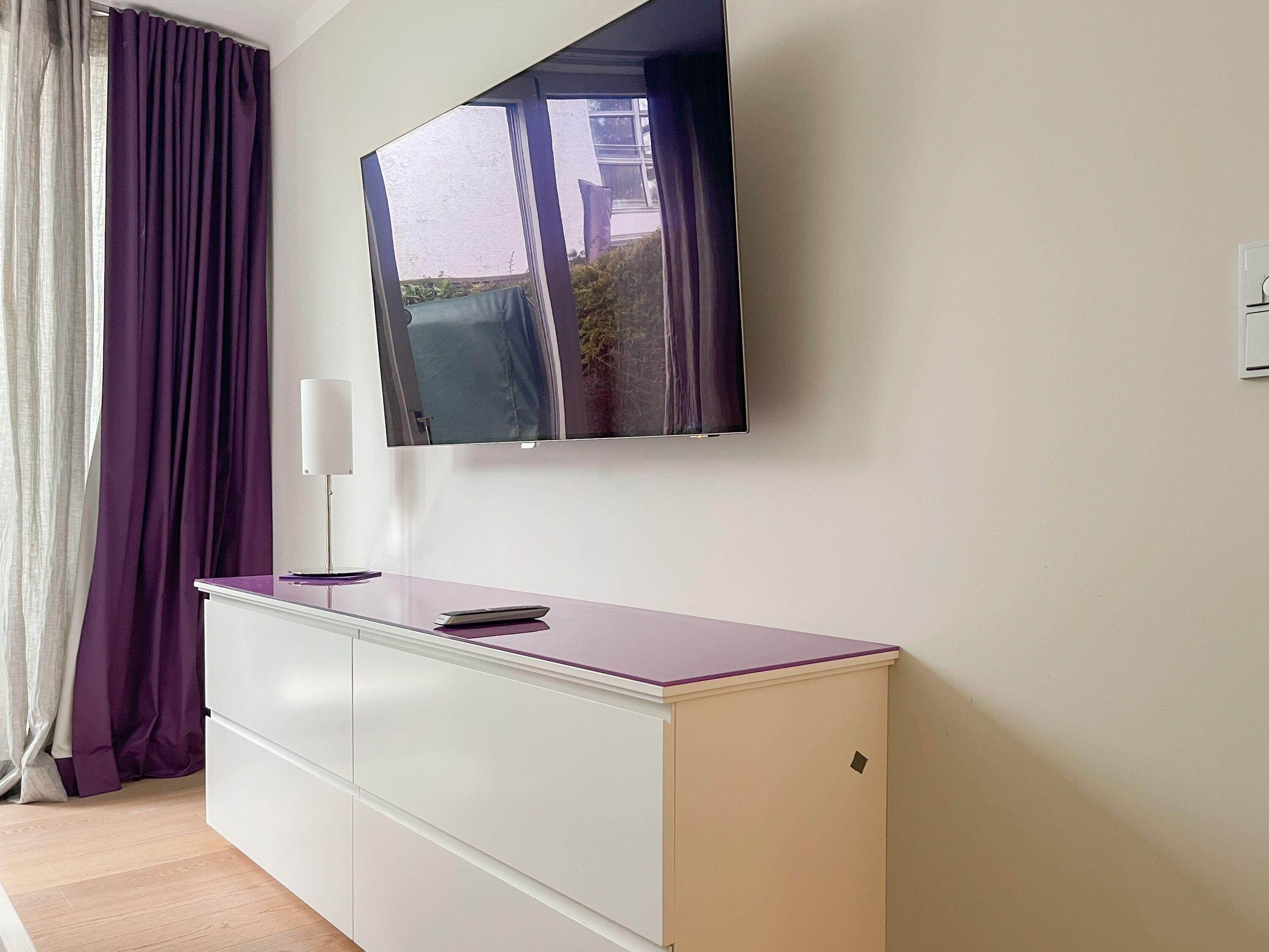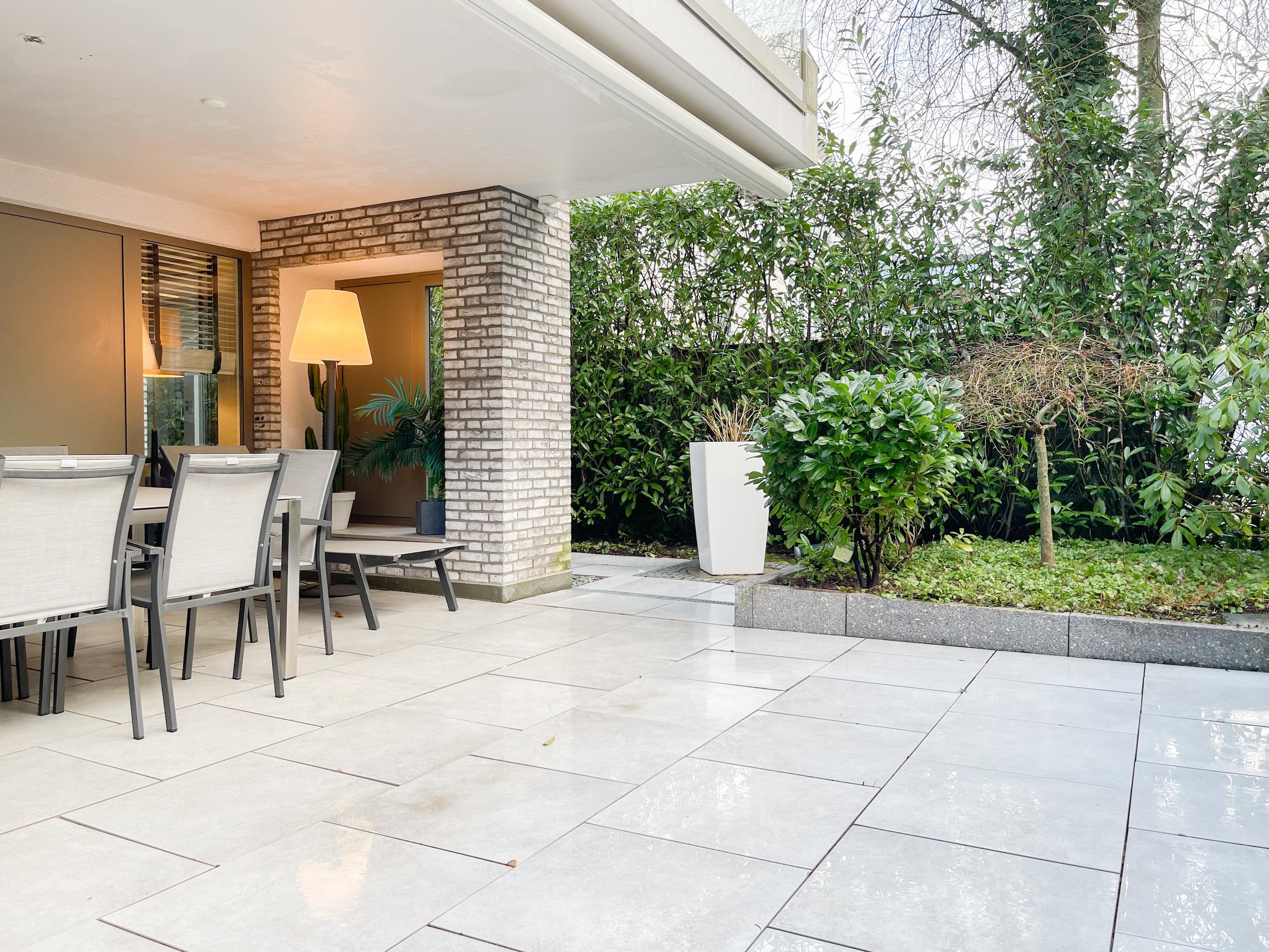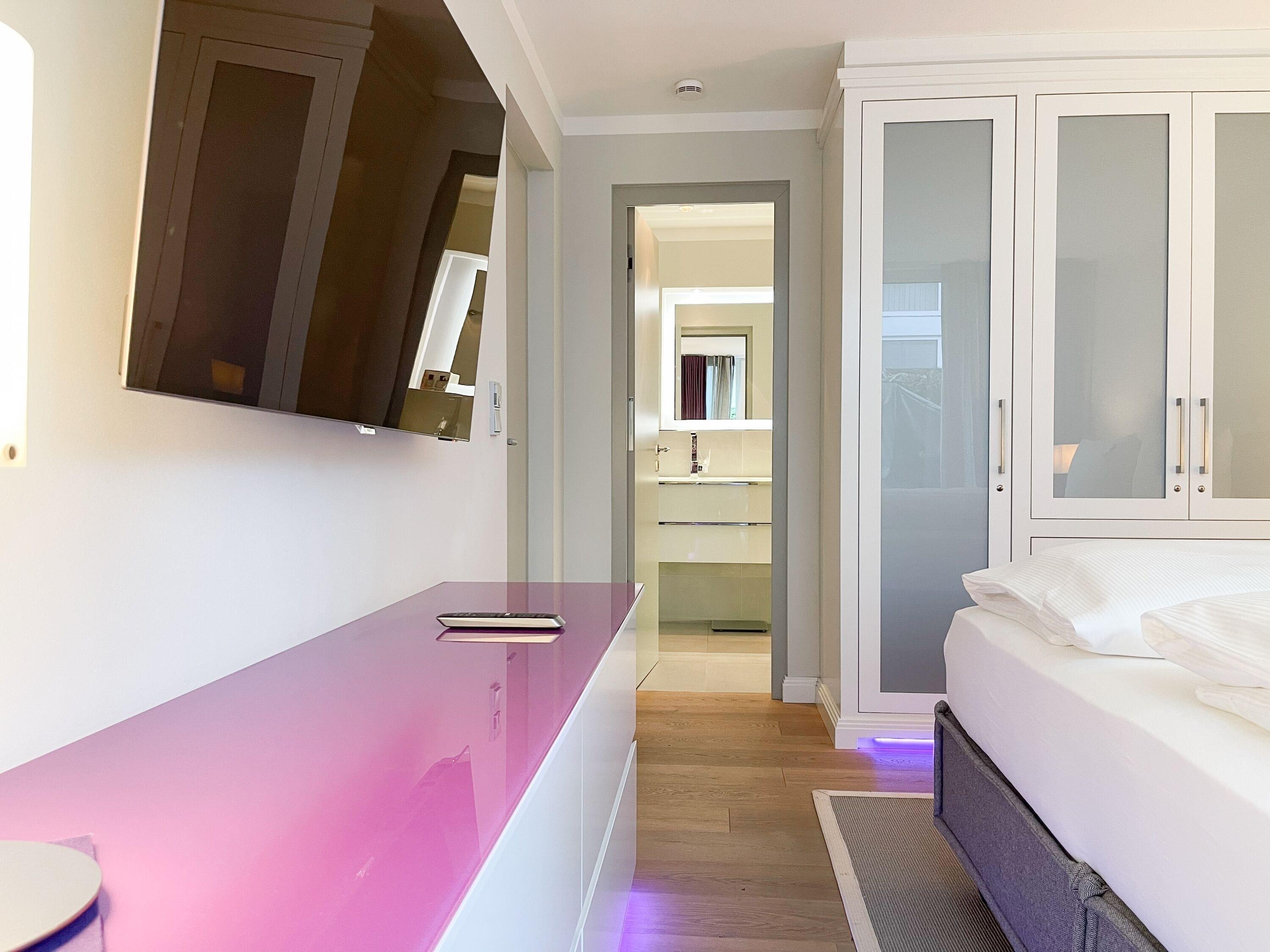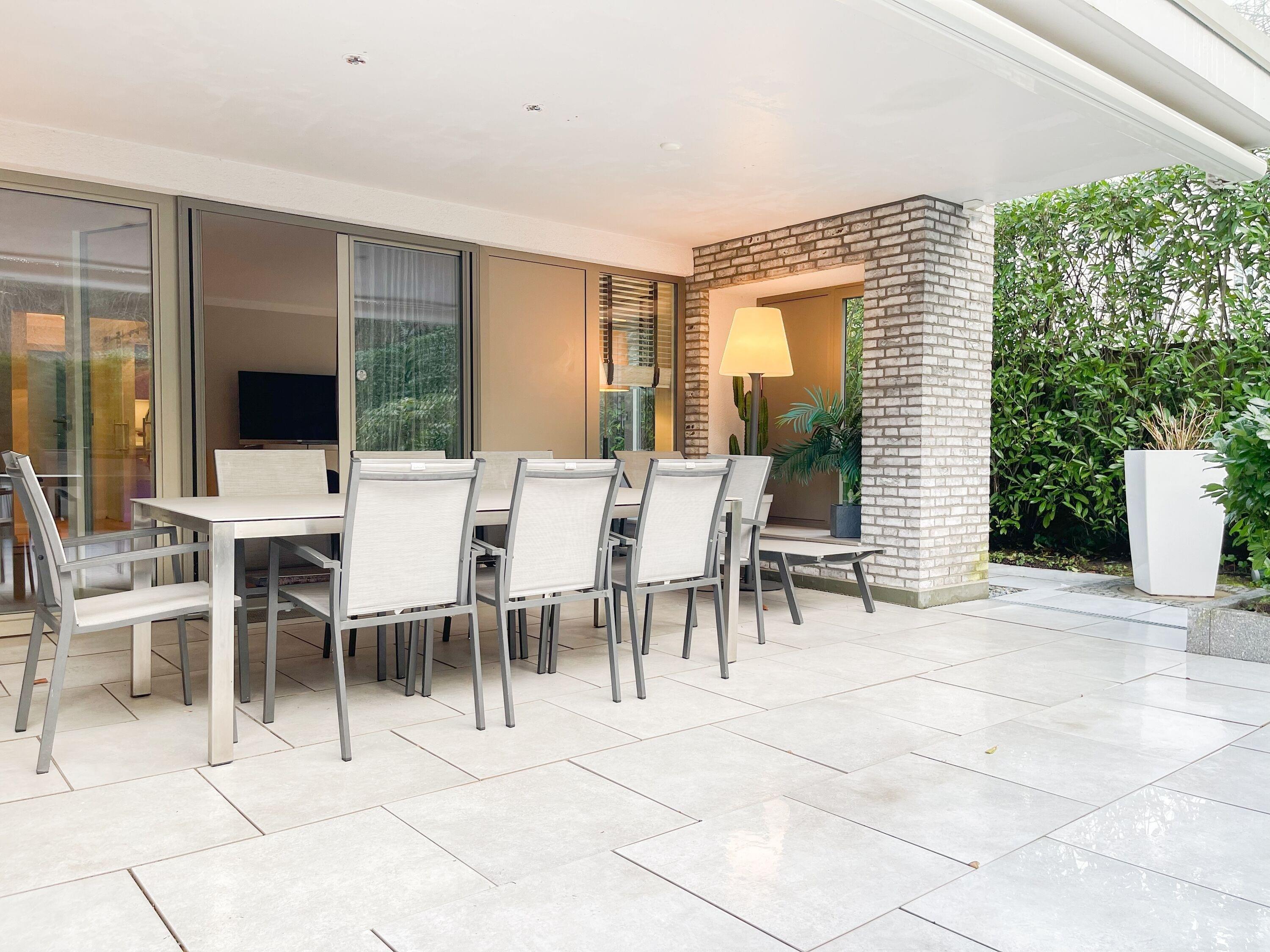 Die Wohnung bietet zeitgemäßen Luxus auf 85 qm Wohnfläche für 4 Personen und jeglichen Komfort wie Fußbodenheizung, Echtholzböden und bodentiefe Fensterelemente für ein offenes Raumgefühl. Die äußerst hochwertige Ausstattung der Wohnung gewährleistet einen respektablen Wohnstandard in einem herrlichen Ambiente. Es erwartet Sie ein offener, großzügig gestalteter Wohn-/Essbereich mit Blick auf die umlaufende, teilweise überdachte XL-Terrasse in Südausrichtung, die mit einer Markise ausgestattet ist und ausreichend Privatsphäre bietet. Die Highend Küche in perfekter Ausstattung wird Hobbyköche begeistern. Bei der Anordnung der zwei separaten Schlafzimmer, ausgestattet mit Boxspringbetten (180x200) und TV, wurde viel Wert auf Privatsphäre gelegt, indem die Räume vollständig durch die Wohnbereiche getrennt wurden. Die Fenster des einen Schlafzimmers sind mit blackout Vorhängen versehen, das andere mit Raffstores. Beide Schlafzimmer haben einen Zugang zur umlaufenden Terrasse. Es stehen zwei moderne, hochwertige Bäder zur Verfügung, ein Duschbad mit Walk In Dusche und ein Wannenbad ensuite. Zur technischen Ausstattung gehören unter anderem 3 TV, eine Sonos Soundbar, ein Radio und WLAN steht selbstverständlich zur Verfügung.