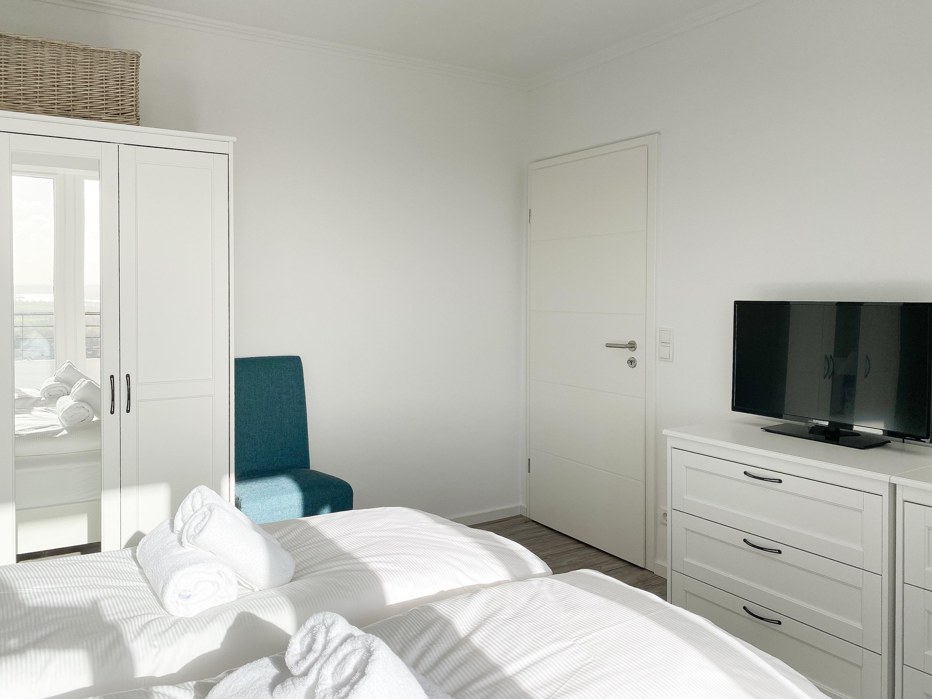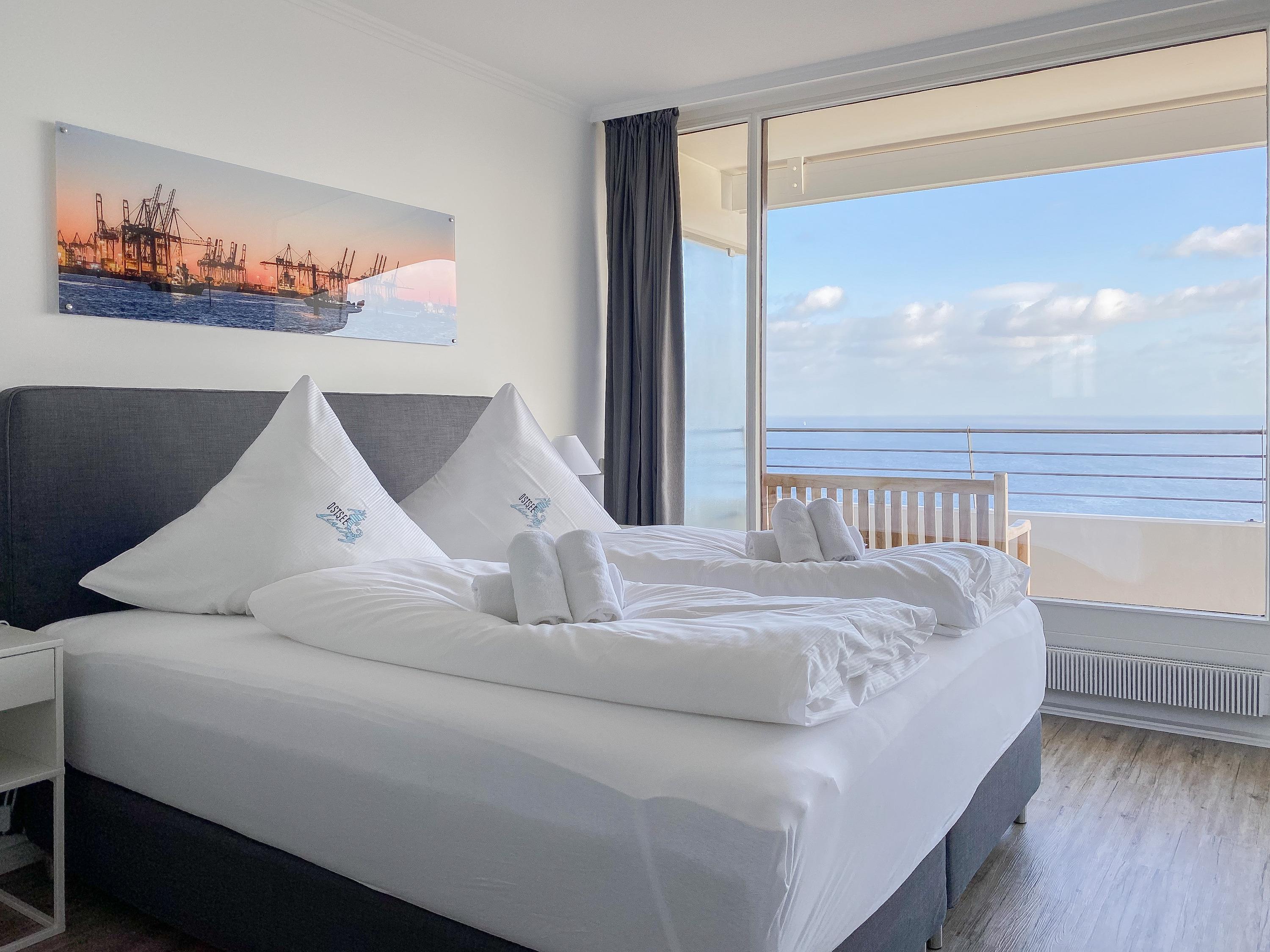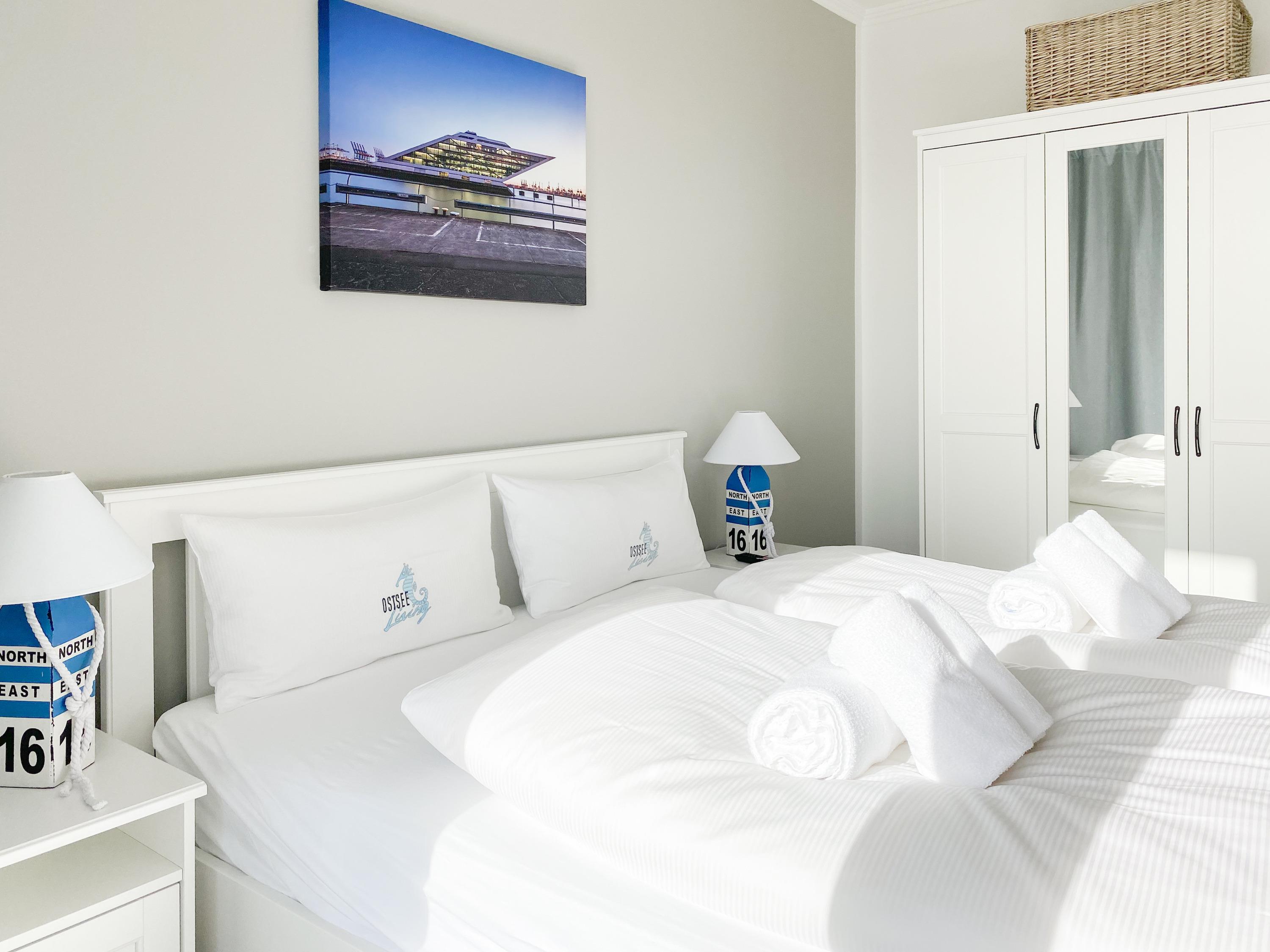 Die großzügige Eckwohnung bietet mit 2 Schlafzimmern und 2 Bädern höchsten Wohnkomfort auf 120 qm für 4 Personen. Sie verfügt über einen umlaufenden Sonnenbalkon mit elektrischer Markise, der sowohl vom Wohnbereich als auch von beiden Schlafzimmern zugänglich ist. Genießen Sie tagsüber das traumhafte Meerblickpanorama aus nahezu jedem Raum und bei Dunkelheit die besondere Atmosphäre der beleuchteten Lübecker Bucht. Es steht ein großzügiges[nbsp] Wohnzimmer mit anschließendem Essbereich für 4 Personen zur Verfügung. In der offenen, bestens ausgestatteten Designküche mit Induktionskochfeld und Spülmaschine, ist zusätzlich eine Waschmaschine integriert. Die beiden Schlafzimmer mit wunderschönem Meerblick sind jeweils mit einem Doppelbett (180x200 und 160x200) und TV ausgestattet. Die Fenster sind mit Verdunkelungsvorhängen versehen. Zwei neue, hochwertige Duschbäder runden das Angebot ab. Ein fester PKW Stellplatz in der Hotelgarage (Einfahrtshöhe 1,90/kein Aufzug) ist inklusive. Bei Verlust der Parkkarte ist Ersatz zu leisten.