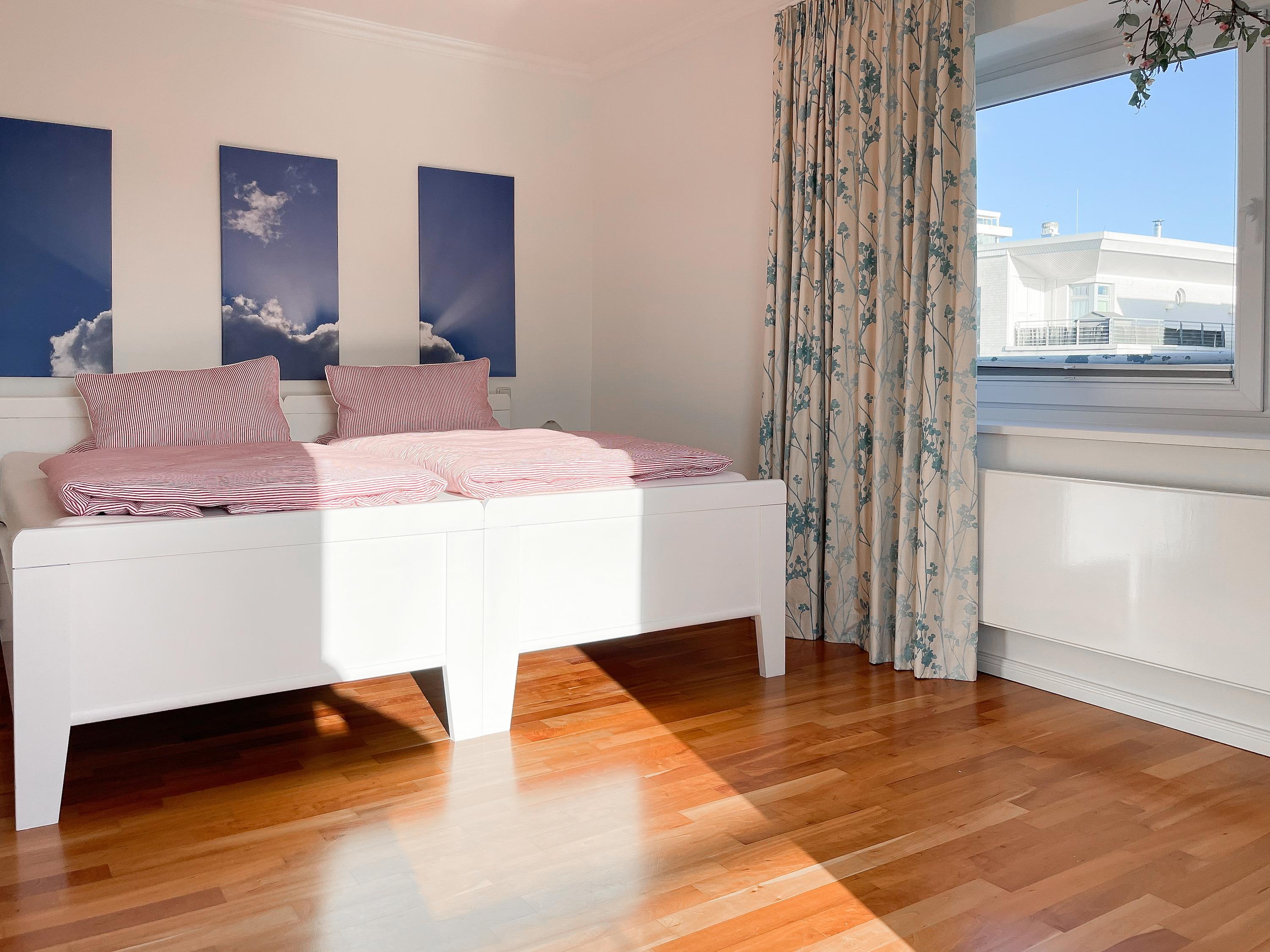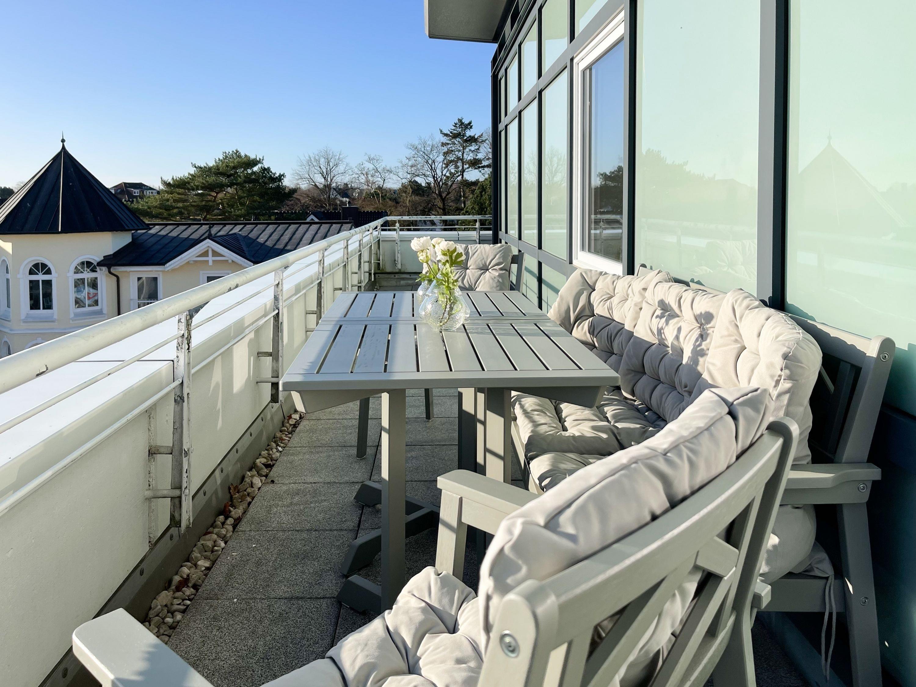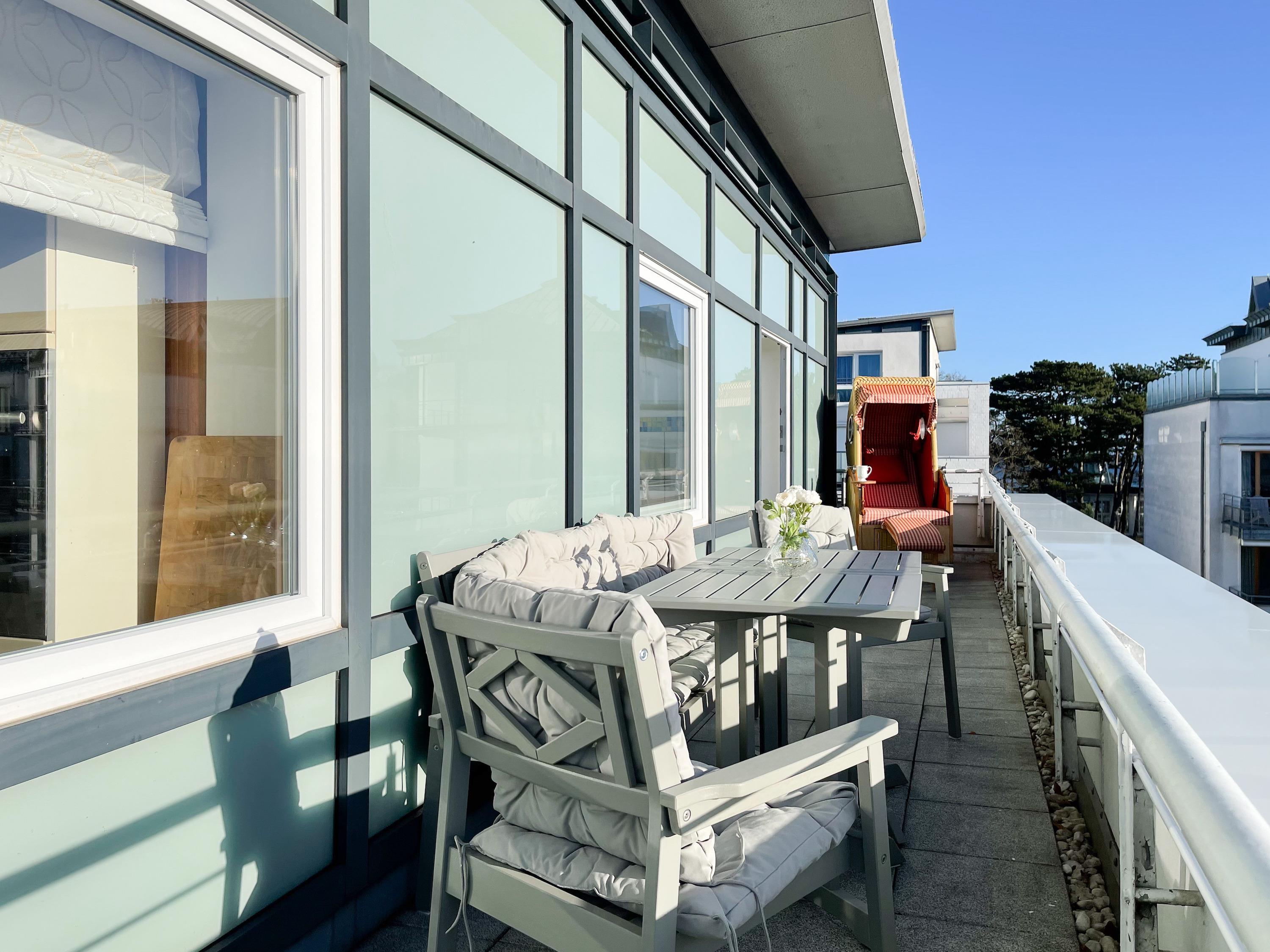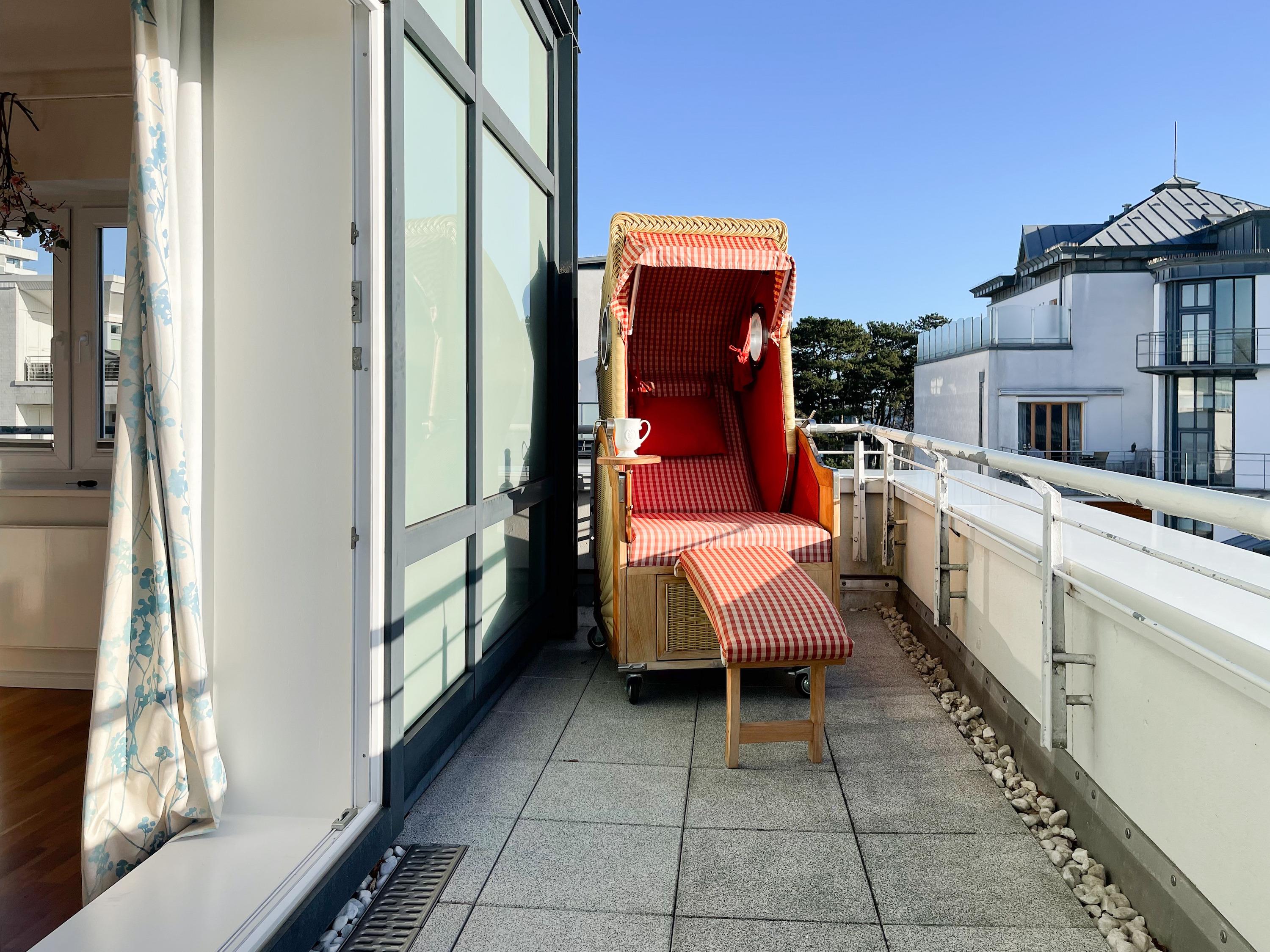 Mittelpunkt der Wohnung bildet die gemütliche Wohnküche mit integriertem Essbereich und Zugang auf die kleine Dachterrasse in westlicher Ausrichtung. Genießen Sie hier die letzten Sonnenstunden bei einem Glas Wein mit herrlichem Blick auf den Kurpark. Der anschließende Wohnbereich ist mit zwei Sofas, TV und einem bequemen Relaxsessel ausgestattet. Es gibt 2 separate Schlafzimmer, die beide mit Doppelbetten (200x200 und 180x200), Kleiderschränken mit ausreichend Stauraum sowie Verdunkelungsplissees und zusätzlichen Verdunkelungsvorhängen ausgestattet sind.[nbsp] Schlafzimmer 1 verfügt zusätzlich über elektromotorisch verstellbare Lattenroste (200x200) und Zugang auf die große Dachterrasse 2 in südlicher Ausrichtung mit Gartenmöbeln, Strandkorb (für 1 Person) und kleinem Meerblick. Schlafzimmer 2 mit einem weiteren TV bietet den Zugang zu Dachterrasse 2 in nordwestlicher Ausrichtung, ebenfalls mit kleinem Meerblick. Das großzügig angelegte Bad verfügt über Badewanne, Dusche, Waschtisch und einen kombinierten Waschtrockner. Ein separates Gäste WC ist ebenfalls vorhanden. WLAN steht selbstverständlich zur kostenlosen Nutzung zur Verfügung.