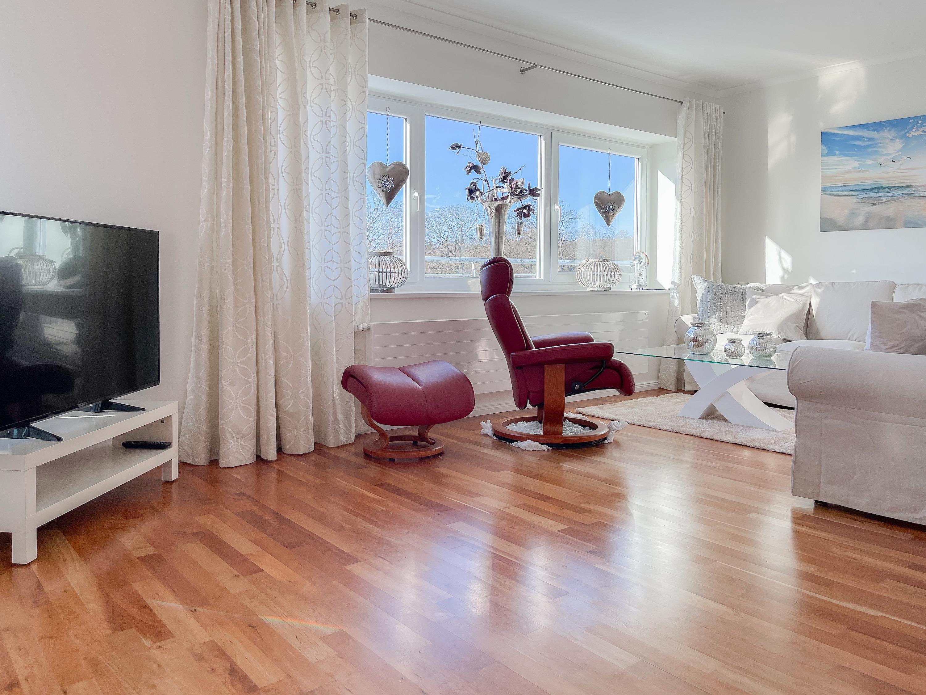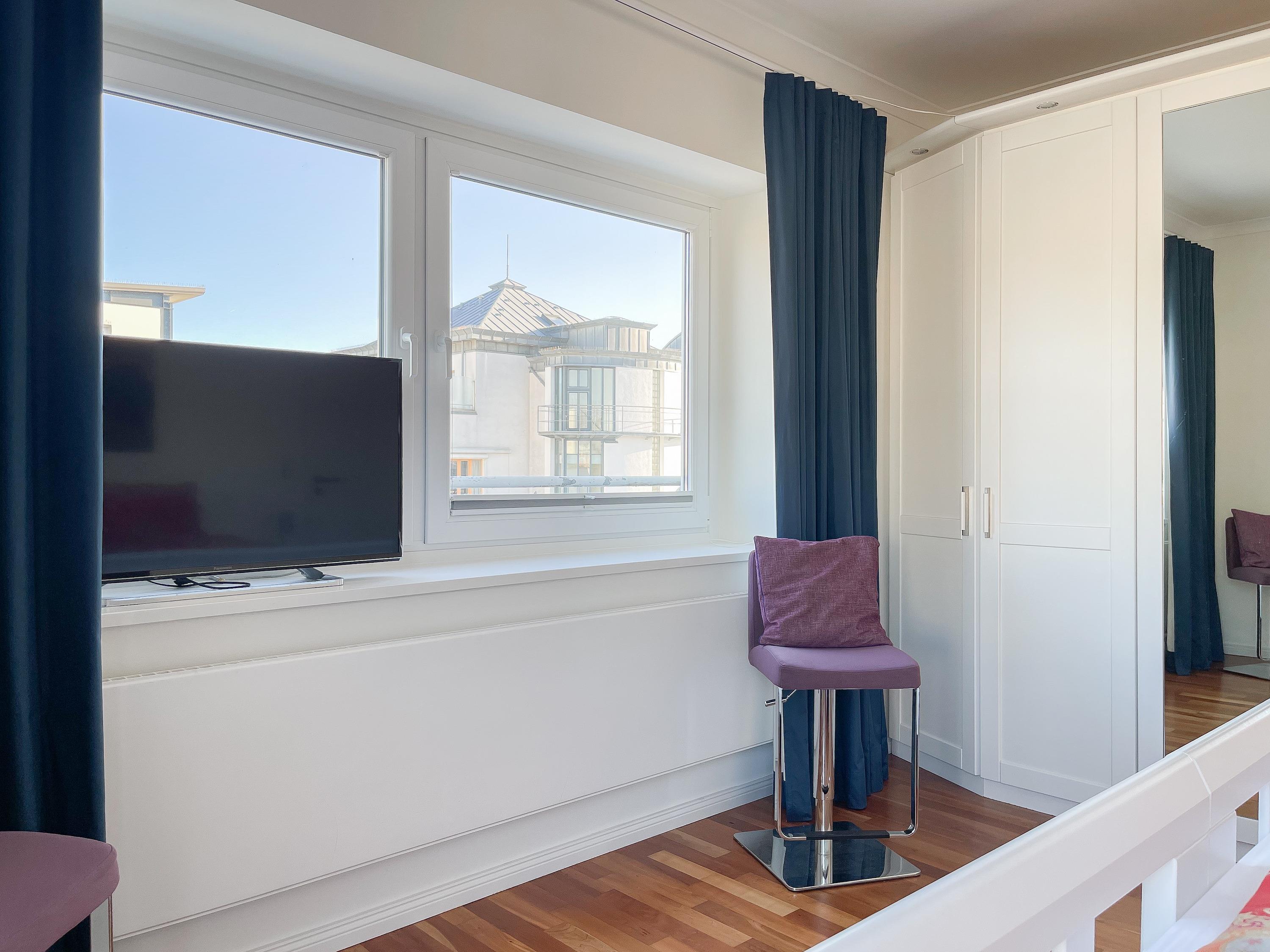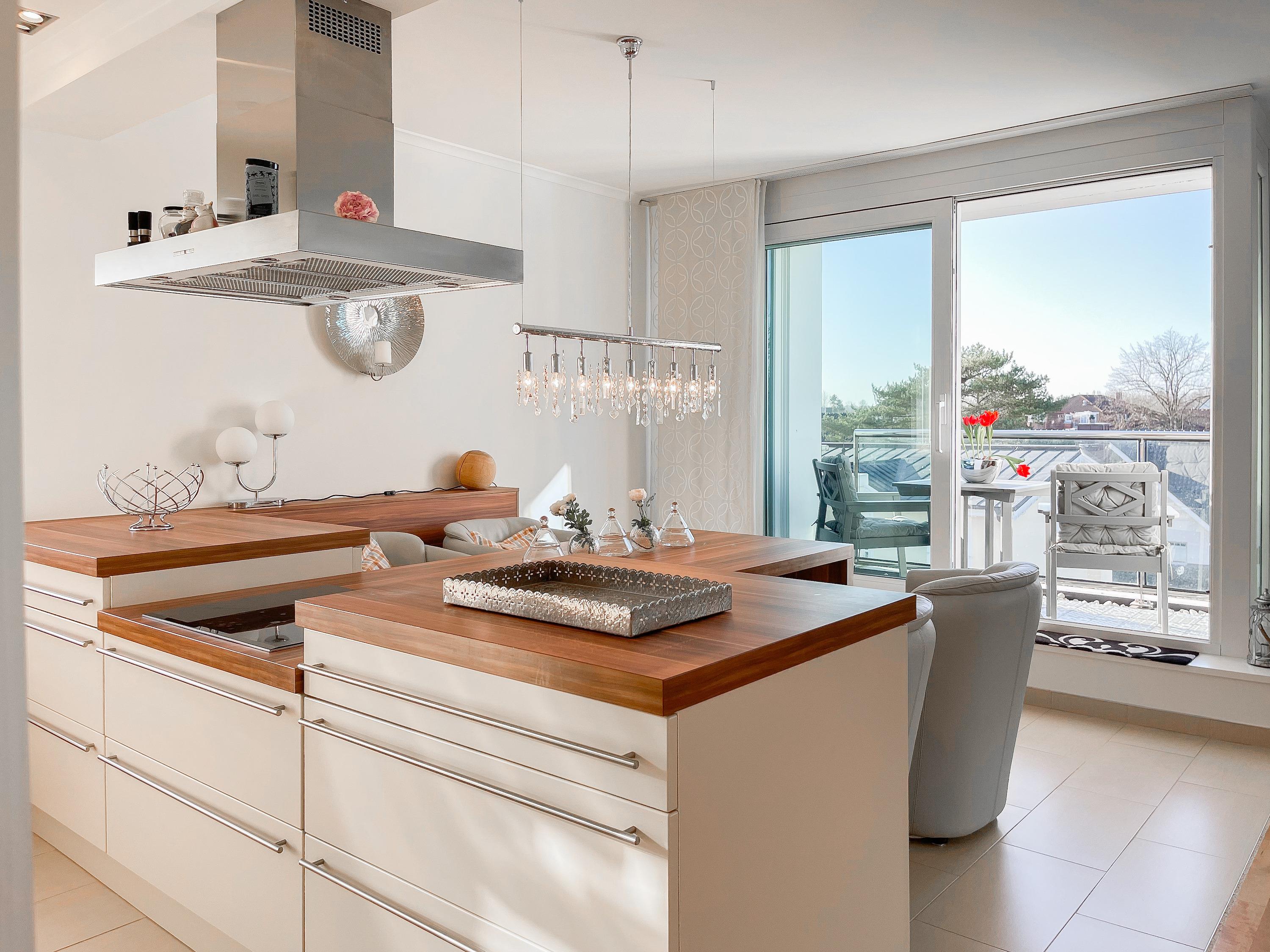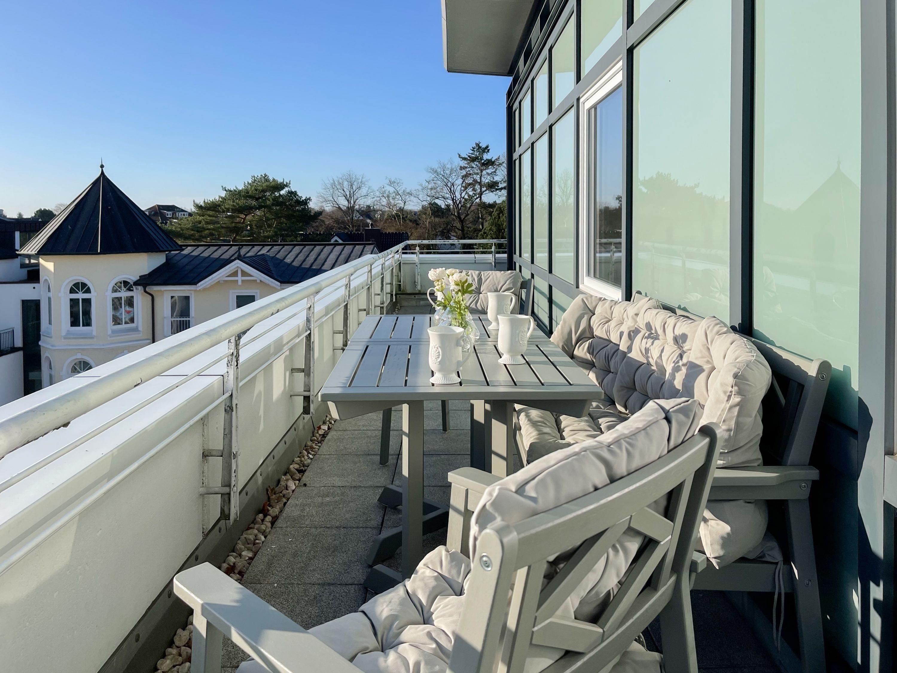 Mittelpunkt der Wohnung bildet die gemütliche Wohnküche mit integriertem Essbereich und Zugang auf die kleine Dachterrasse in westlicher Ausrichtung. Genießen Sie hier die letzten Sonnenstunden bei einem Glas Wein mit herrlichem Blick auf den Kurpark. Der anschließende Wohnbereich ist mit zwei Sofas, TV und einem bequemen Relaxsessel ausgestattet. Es gibt 2 separate Schlafzimmer, die beide mit Doppelbetten (200x200 und 180x200), Kleiderschränken mit ausreichend Stauraum sowie Verdunkelungsplissees und zusätzlichen Verdunkelungsvorhängen ausgestattet sind.[nbsp] Schlafzimmer 1 verfügt zusätzlich über elektromotorisch verstellbare Lattenroste (200x200) und Zugang auf die große Dachterrasse 2 in südlicher Ausrichtung mit Gartenmöbeln, Strandkorb (für 1 Person) und kleinem Meerblick. Schlafzimmer 2 mit einem weiteren TV bietet den Zugang zu Dachterrasse 2 in nordwestlicher Ausrichtung, ebenfalls mit kleinem Meerblick. Das großzügig angelegte Bad verfügt über Badewanne, Dusche, Waschtisch und einen kombinierten Waschtrockner. Ein separates Gäste WC ist ebenfalls vorhanden. WLAN steht selbstverständlich zur kostenlosen Nutzung zur Verfügung.
