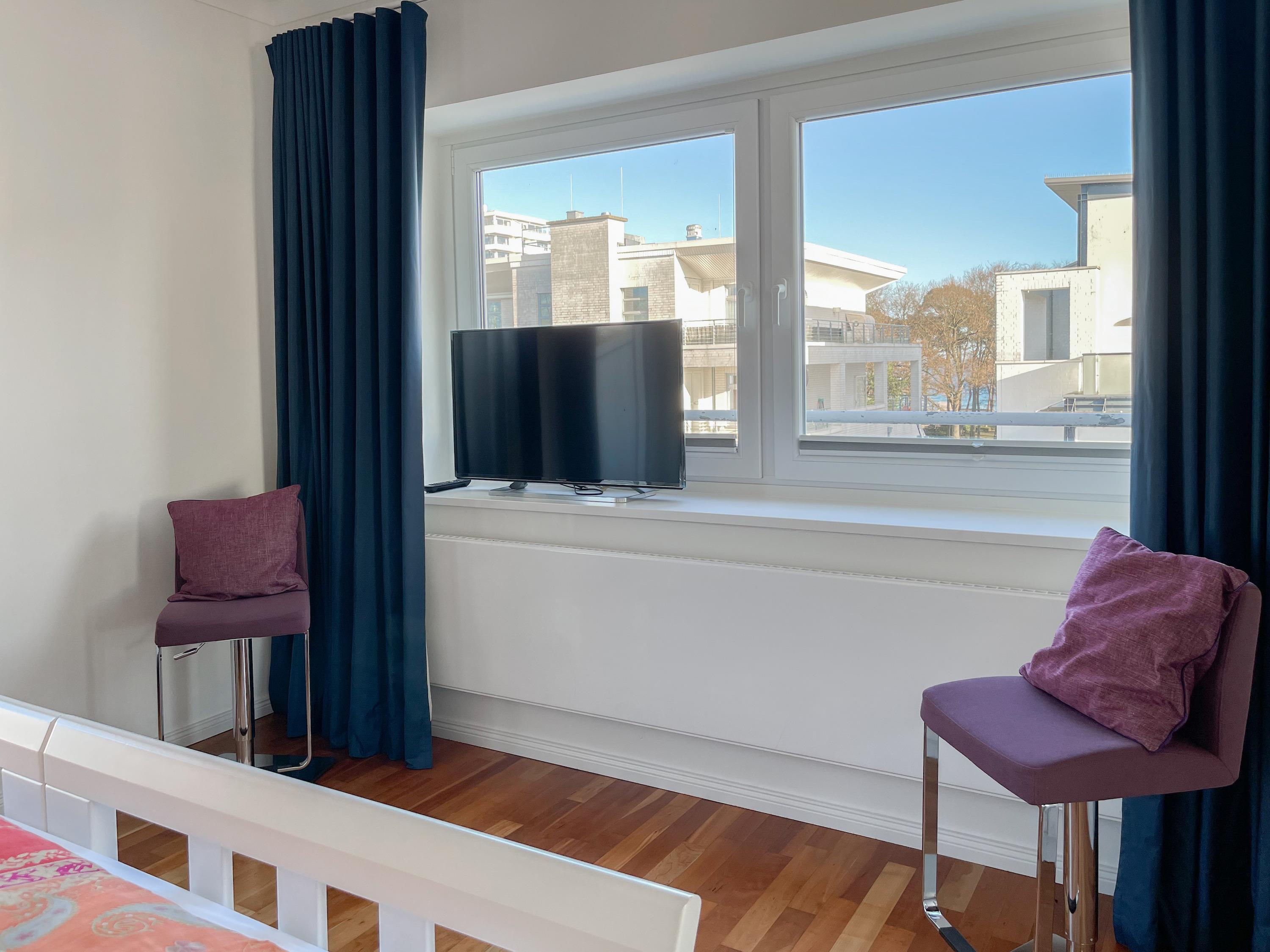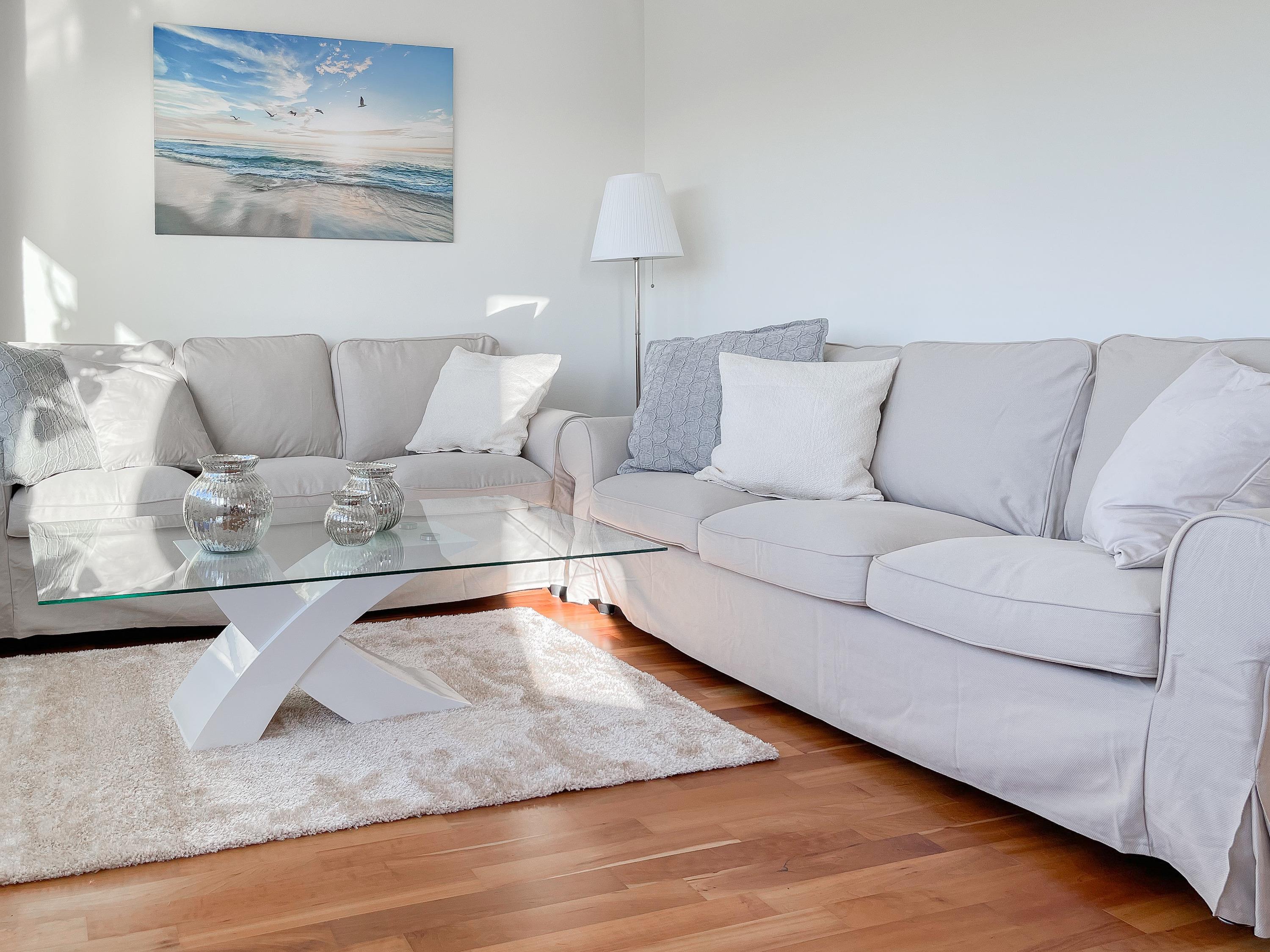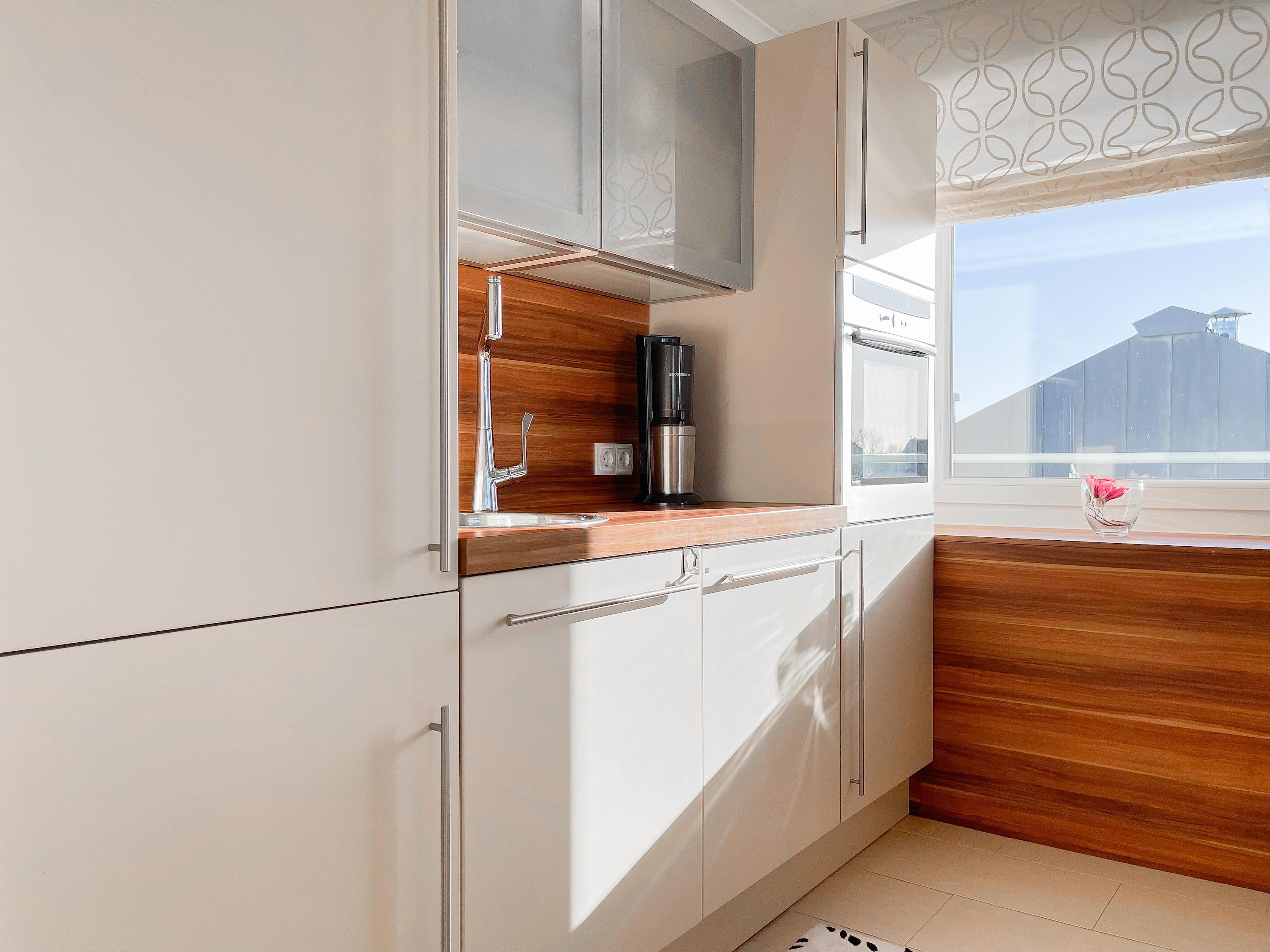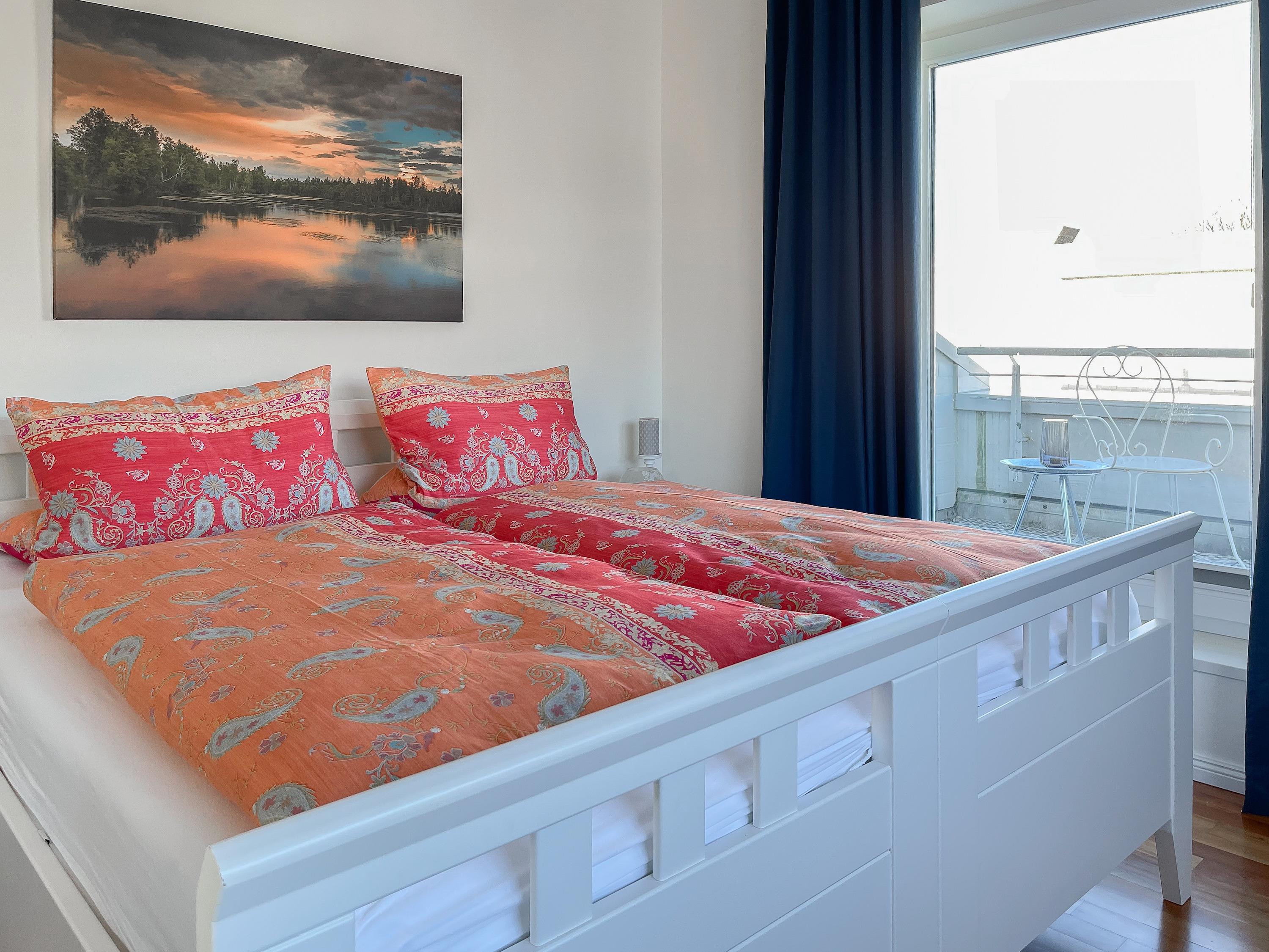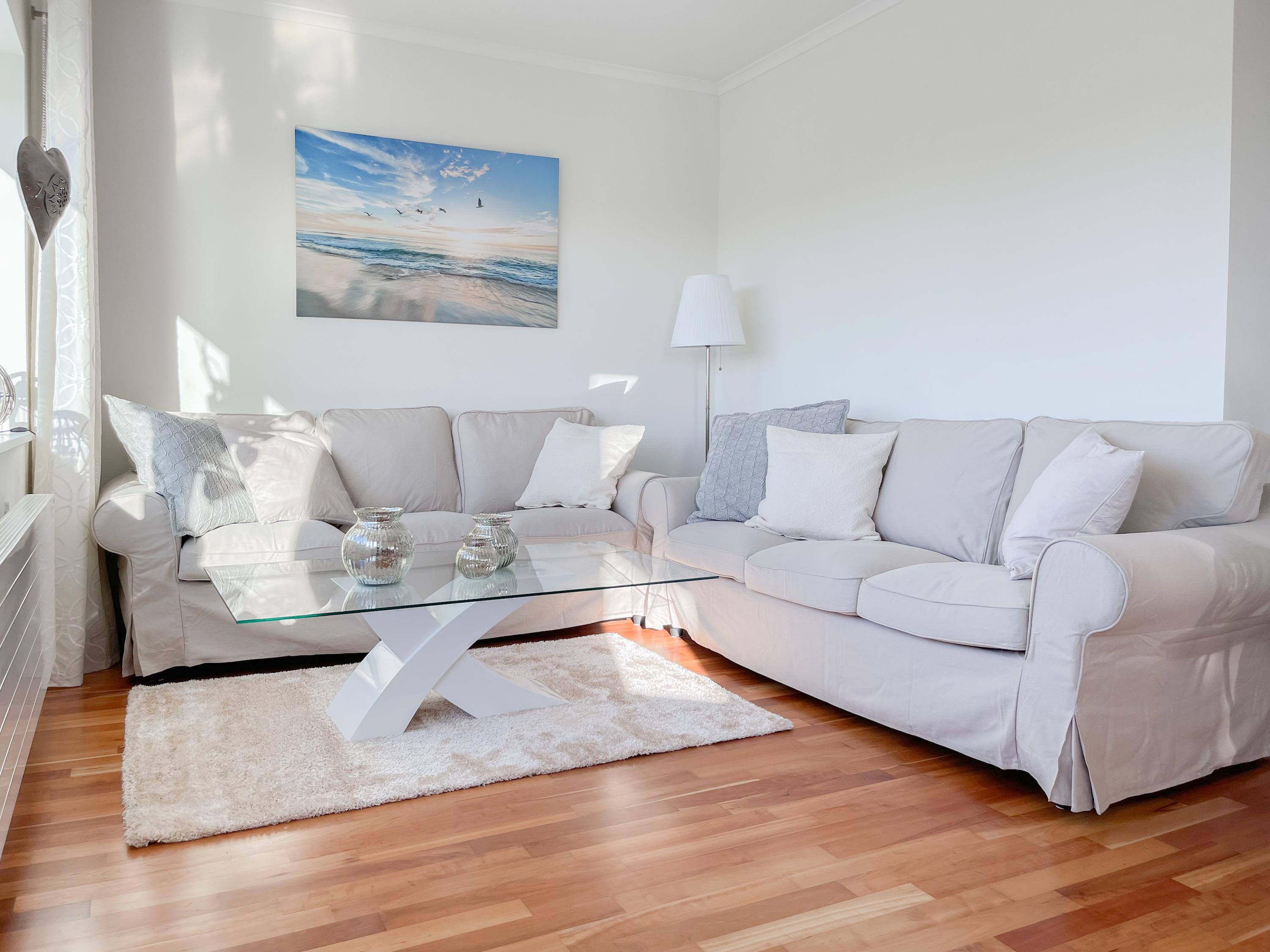 Mittelpunkt der Wohnung bildet die gemütliche Wohnküche mit integriertem Essbereich und Zugang auf die kleine Dachterrasse in westlicher Ausrichtung. Genießen Sie hier die letzten Sonnenstunden bei einem Glas Wein mit herrlichem Blick auf den Kurpark. Der anschließende Wohnbereich ist mit zwei Sofas, TV und einem bequemen Relaxsessel ausgestattet. Es gibt 2 separate Schlafzimmer, die beide mit Doppelbetten (200x200 und 180x200), Kleiderschränken mit ausreichend Stauraum sowie Verdunkelungsplissees und zusätzlichen Verdunkelungsvorhängen ausgestattet sind.[nbsp] Schlafzimmer 1 verfügt zusätzlich über elektromotorisch verstellbare Lattenroste (200x200) und Zugang auf die große Dachterrasse 2 in südlicher Ausrichtung mit Gartenmöbeln, Strandkorb (für 1 Person) und kleinem Meerblick. Schlafzimmer 2 mit einem weiteren TV bietet den Zugang zu Dachterrasse 2 in nordwestlicher Ausrichtung, ebenfalls mit kleinem Meerblick. Das großzügig angelegte Bad verfügt über Badewanne, Dusche, Waschtisch und einen kombinierten Waschtrockner. Ein separates Gäste WC ist ebenfalls vorhanden. WLAN steht selbstverständlich zur kostenlosen Nutzung zur Verfügung.