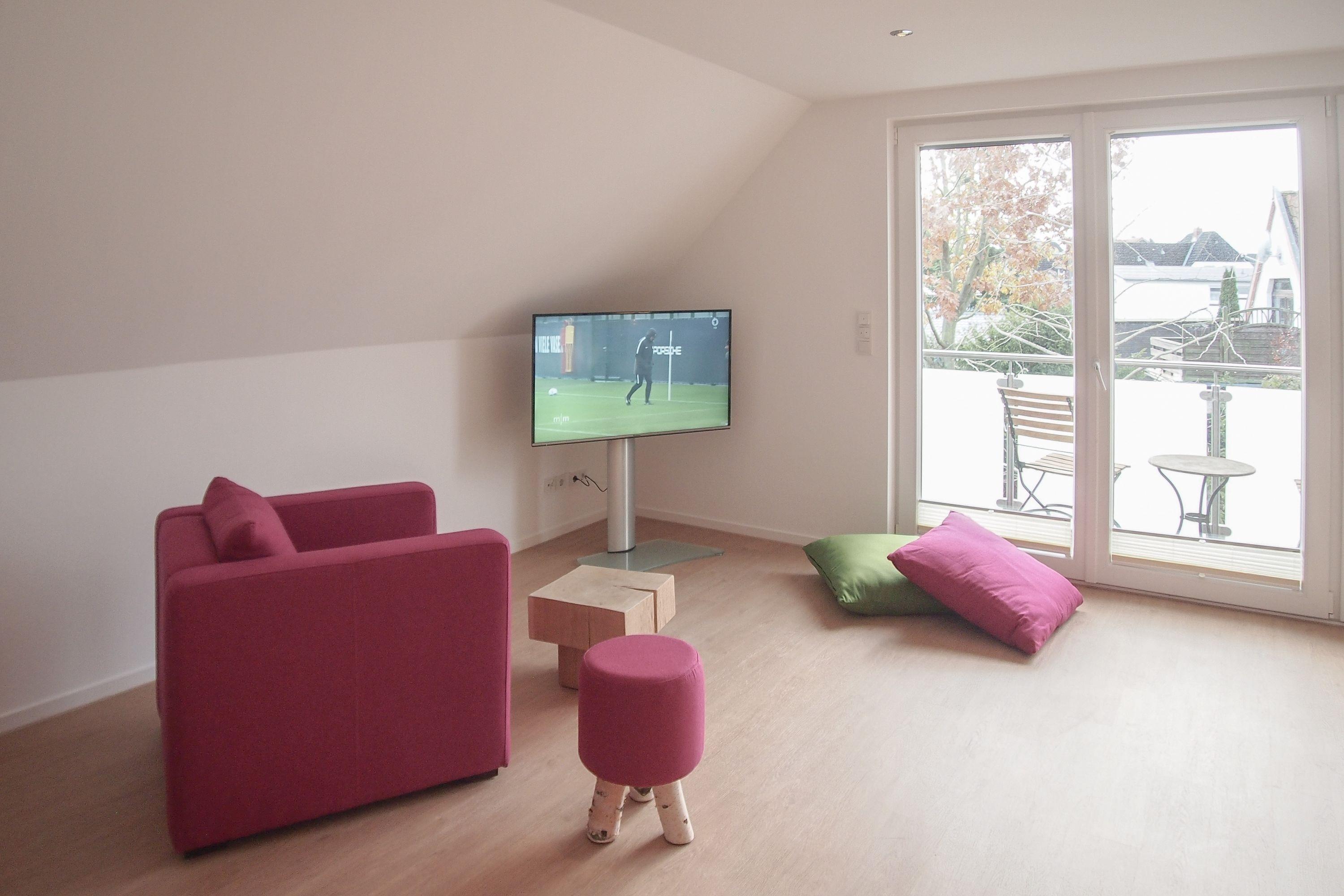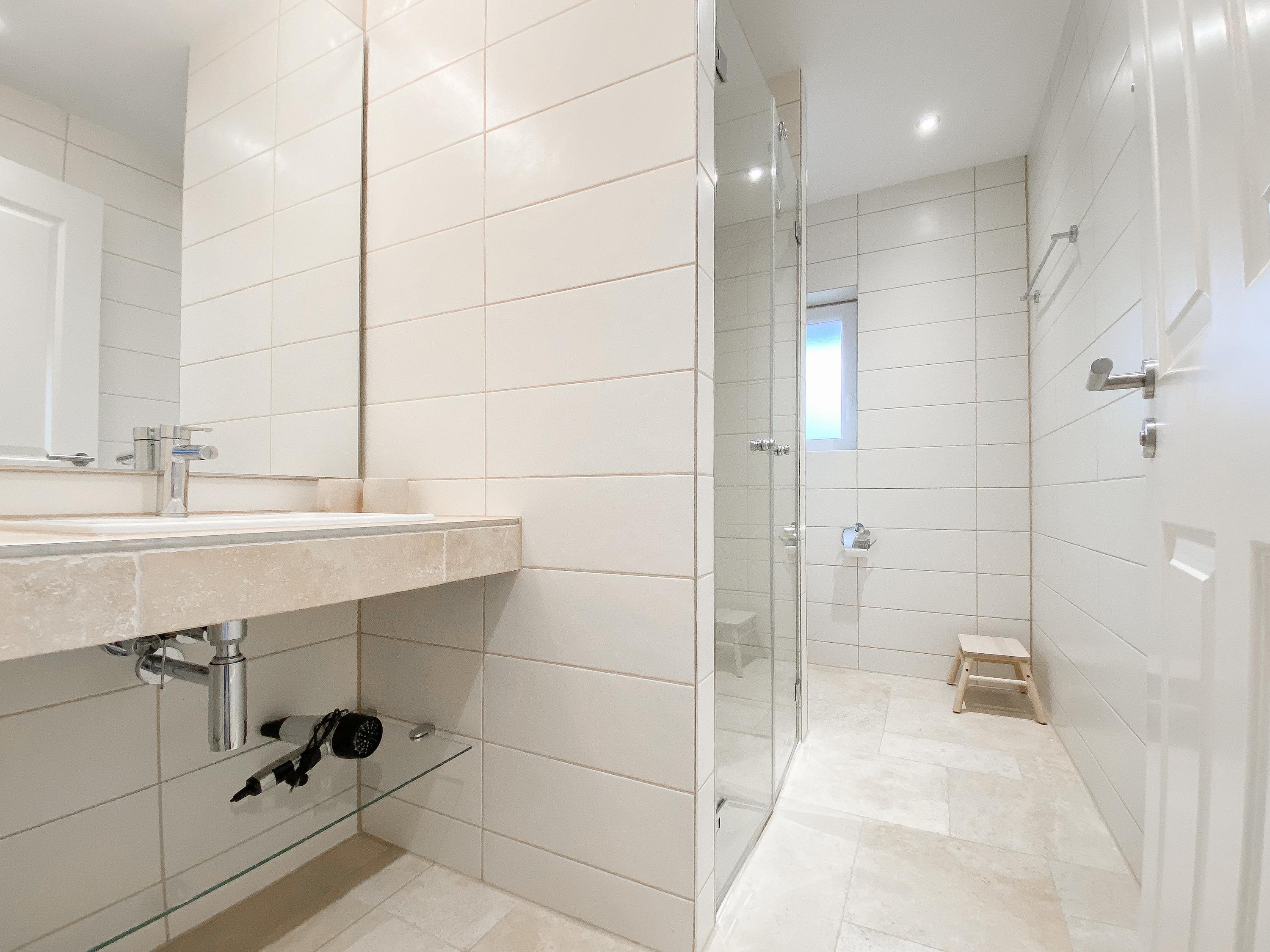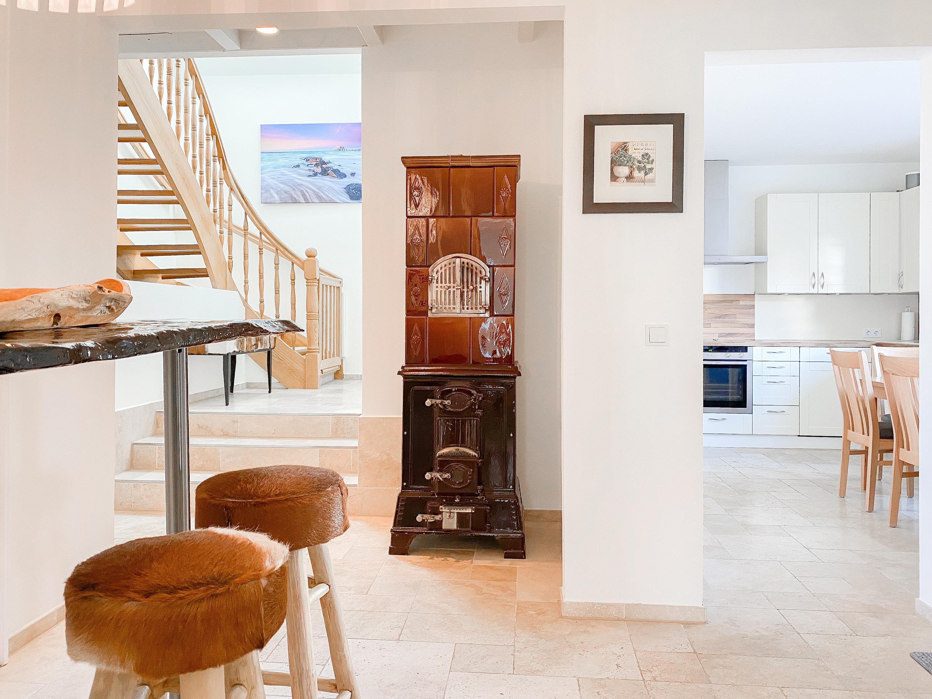Im Erdgeschoss befinden sich zwei geräumige Schlafzimmer mit Doppelbetten und TV, zwei moderne Duschbäder sowie ein weiteres Schlafzimmer mit Einzelbett, Kinderbett und Wickelkommode für die Kleinsten. Weiter eine abgeschlossene, gut ausgestattete Küche mit gemütlichem Frühstücksbereich. Über den Flur ist das für 9 Personen ausgelegte Esszimmer sowie das großzügige, angeschlossene Wohnzimmer (TV, Sonosanlage, WLAN) zu erreichen. Im Obergeschoss sind zwei weitere große Schlafzimmer mit Doppelbetten, Balkon und TV sowie das Masterbad mit Badewanne, Dusche und integrierter Sauna. Alle Fenster sind mit elektrischen Außenjalousien versehen. Waschmaschine und Trockner sind im Keller untergebracht. Auf dem Grundstück befinden sich drei PKW Stellplätze. Am Haus befindet sich eine Wallbox zum Laden von E -Fahrzeugen (vorherige Anmeldung notwendig).
