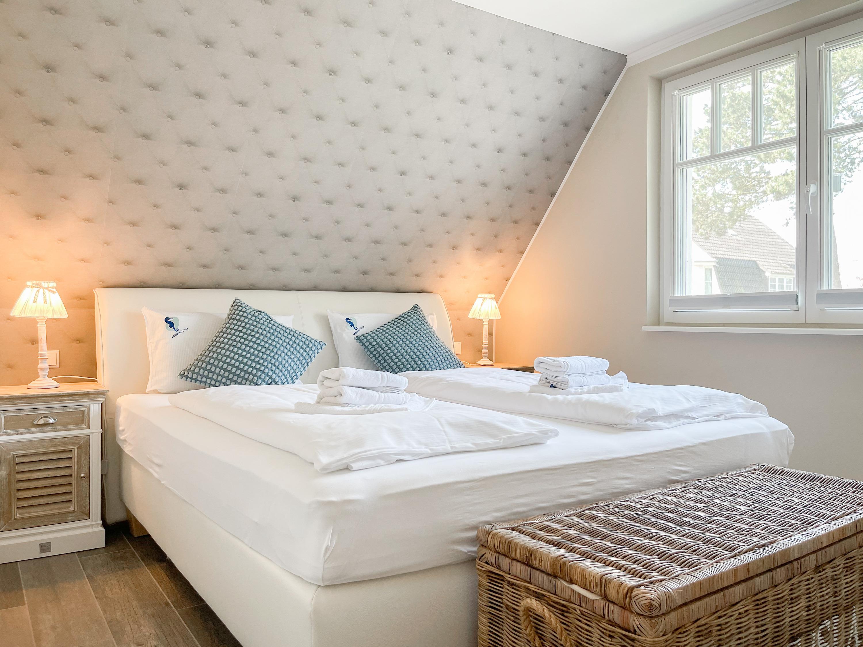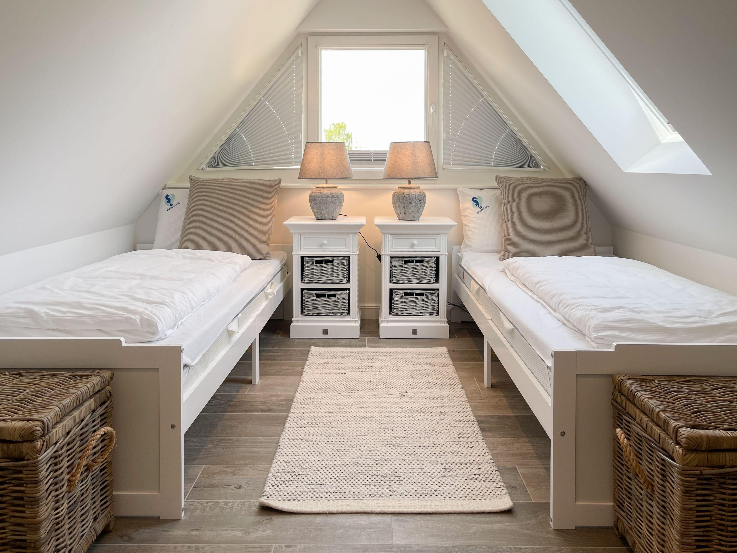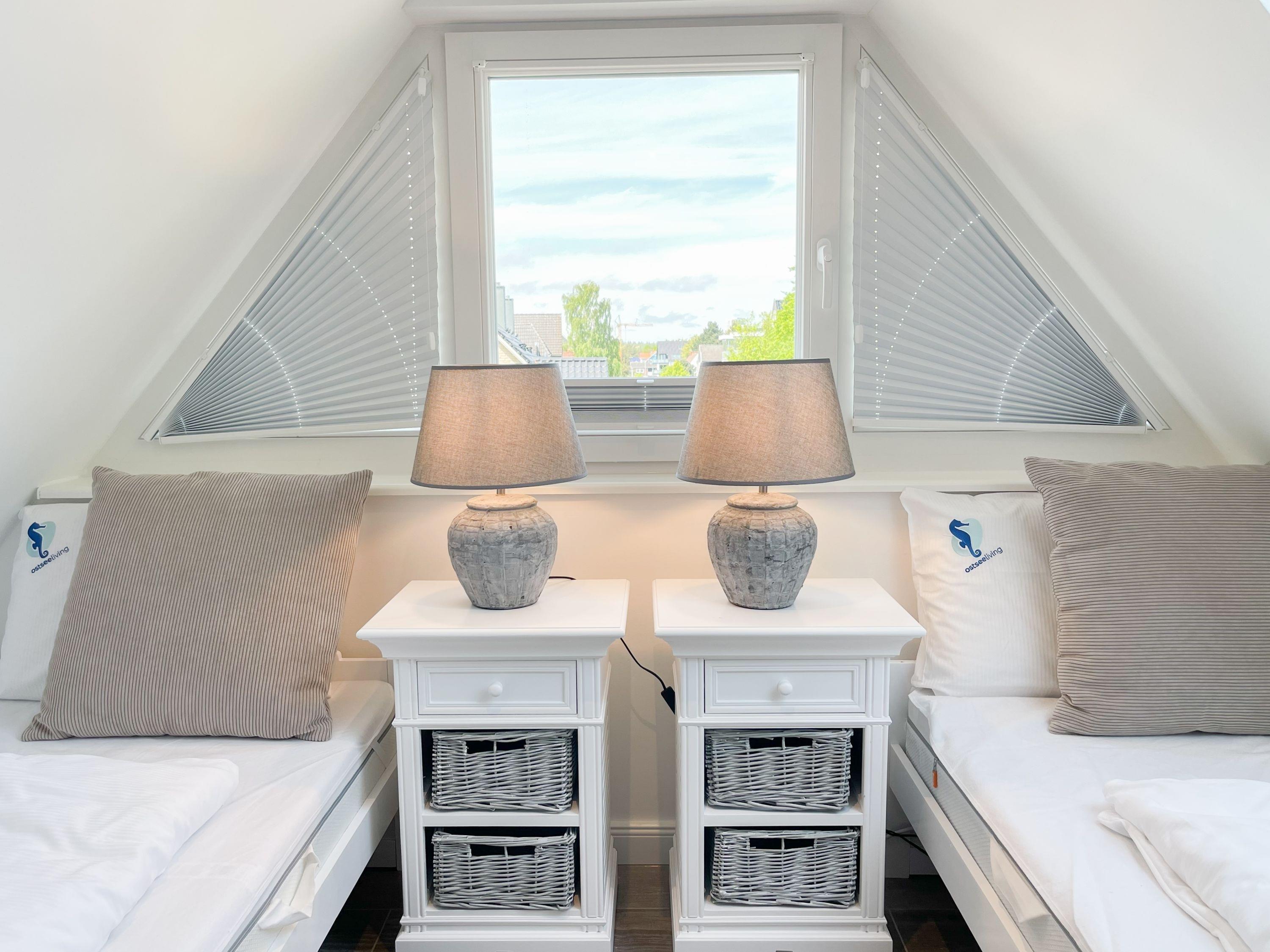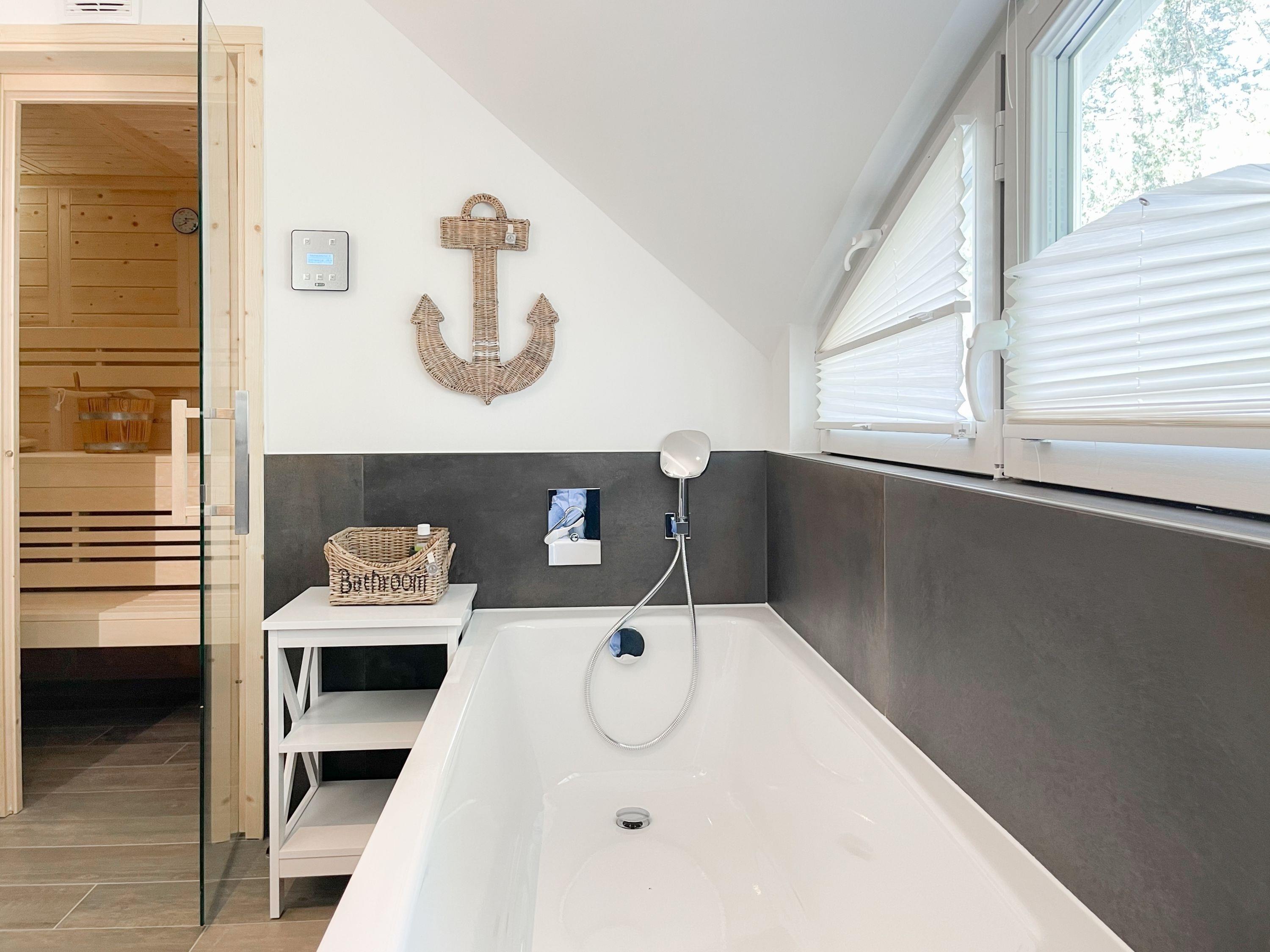 Es erwartet Sie eine wunderschönes Doppelhaus, das bereits beim Eintreten Behaglichkeit und Wohlbefinden spüren läßt. Warme Farben, viel Licht und die hochwertige Einrichtung sorgen für einen hohen Wohnstandard in einer wunderbaren Atmosphäre. Mit 4 Schlafzimmern, zwei Bädern und Sauna bietet das Haus auf[nbsp] über 100 qm Wohnfläche ausreichend Raum für 6 Personen, um einen erholsamen Ostseeurlaub ganz nah am Strand zu verleben. Im Erdgeschoss erwartet Sie ein lichtdurchfluteter Wohn- Essbereich, großzügig geschnitten und hochwertig möbliert. Die integrierte Einbauküche in perfekter Ausstattung eignet sich hervorragend für gemeinsames Kochen. Die vorgelagerte Sonnenterrasse in Südausrichtung ist mit Gartenmöbeln und Sonnenliegen ausgestattet und von einem privaten Gartengrundstück umgeben, das vollständig eingezäunt ist. Im Eingangsbereich befindet sich die Garderobe und ein modernes Bad mit Walk-In Dusche und Fenster. Die Waschmaschine ist im Spitzboden untergebracht. Im Obergeschoss gibt es zwei separate Schlafzimmer, die mit Boxspringbetten (180x200), TV und Kleiderschrank eingerichtet sind. Der Zugang zu dem dritten Einzelschlafzimmer mit kleinem Kleiderschrank, das ebenfalls über ein Boxspringbett verfügt (90x200), erfolgt über eines der Doppelschlafzimmer. Das exklusive Wellnessbad mit Badewanne, Walk-In Dusche und integrierter Sauna befindet sich ebenfalls im Obergeschoss. Das vierte Schlafzimmer mit zwei Einzelbetten ist im Dachgeschoss untergebracht, indem sich auch die kleine Waschmaschine[nbsp] befindet. Alle Fenster der Schlafräume sind mit Verdunkelungsplissees versehen.