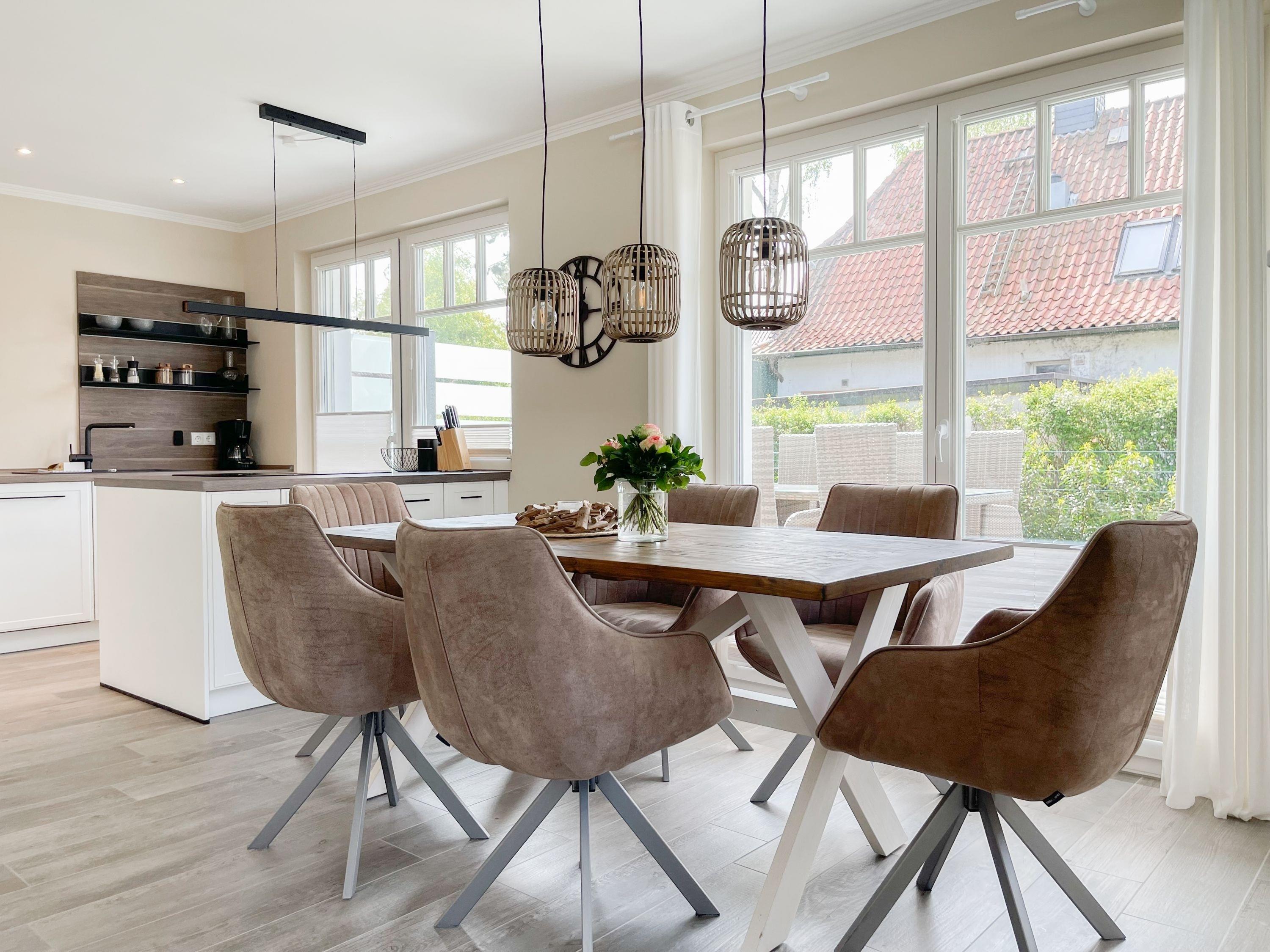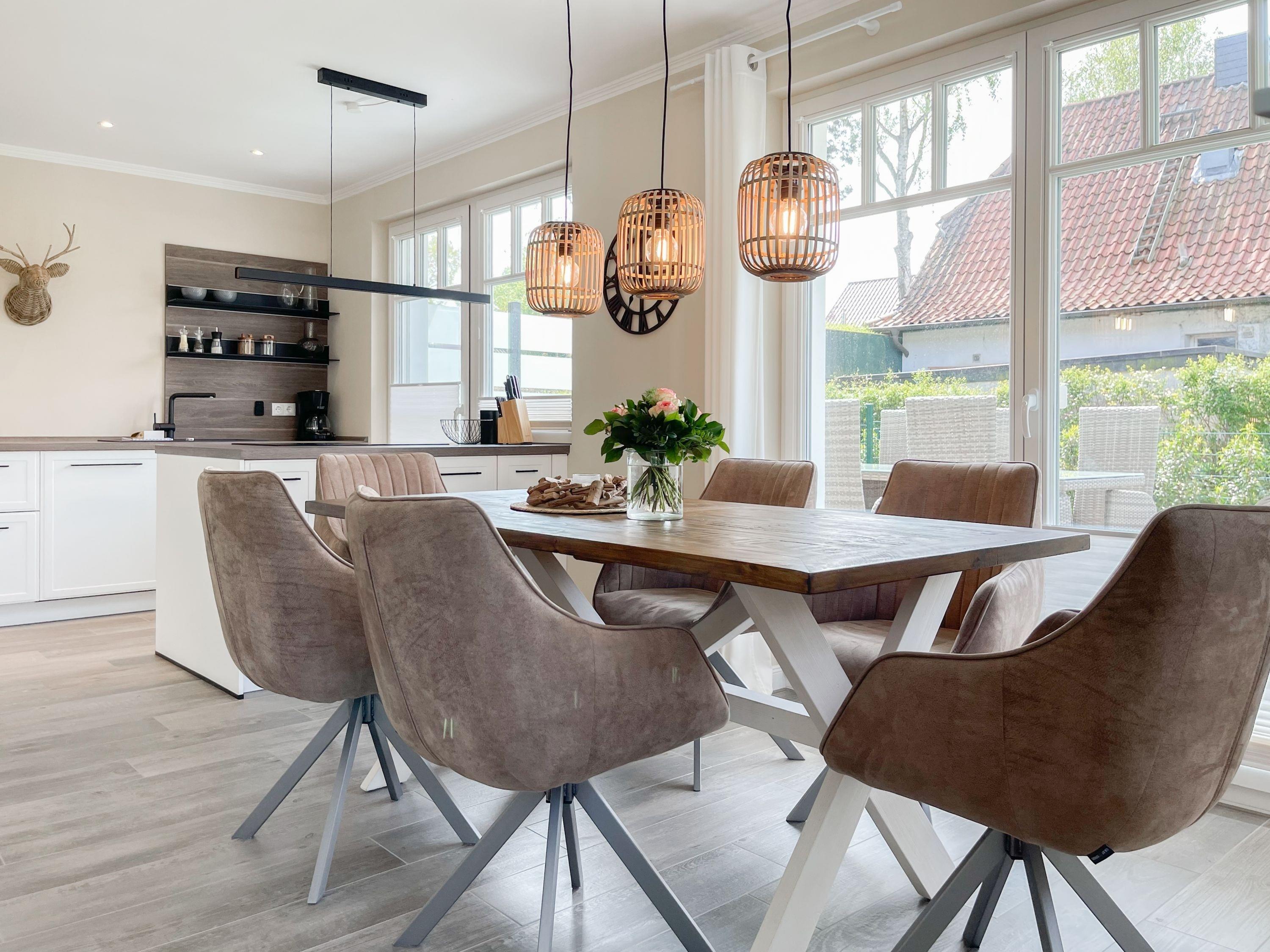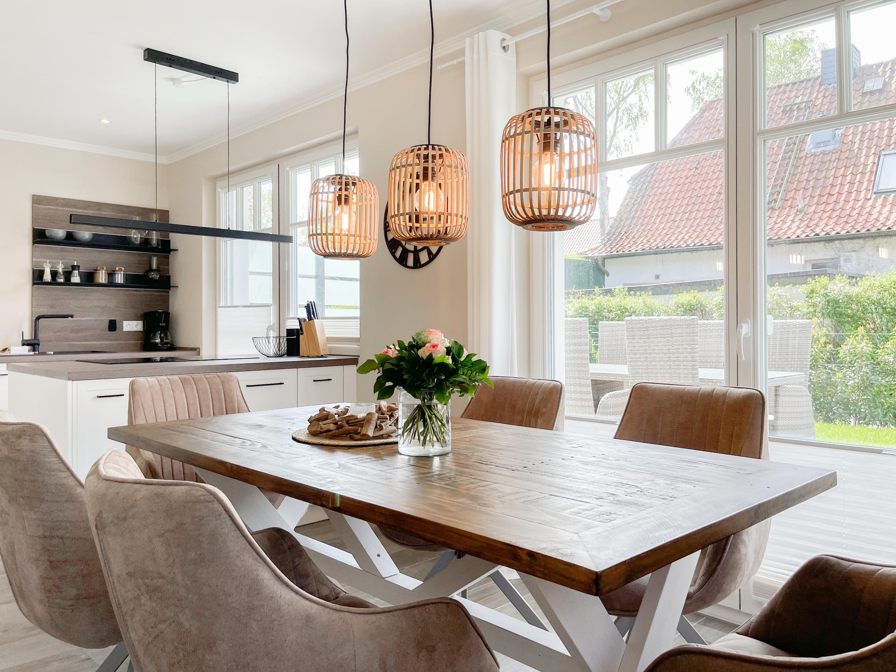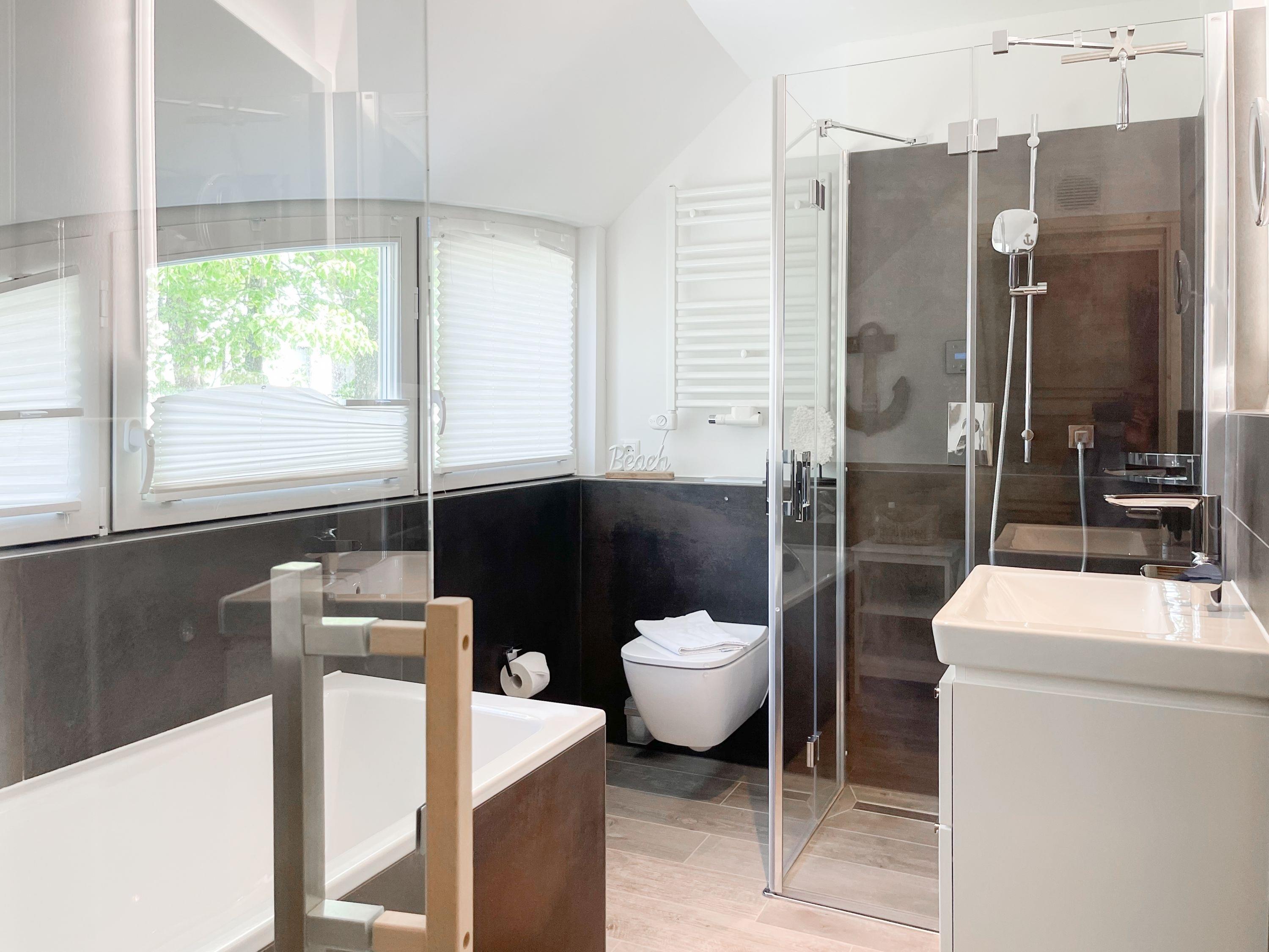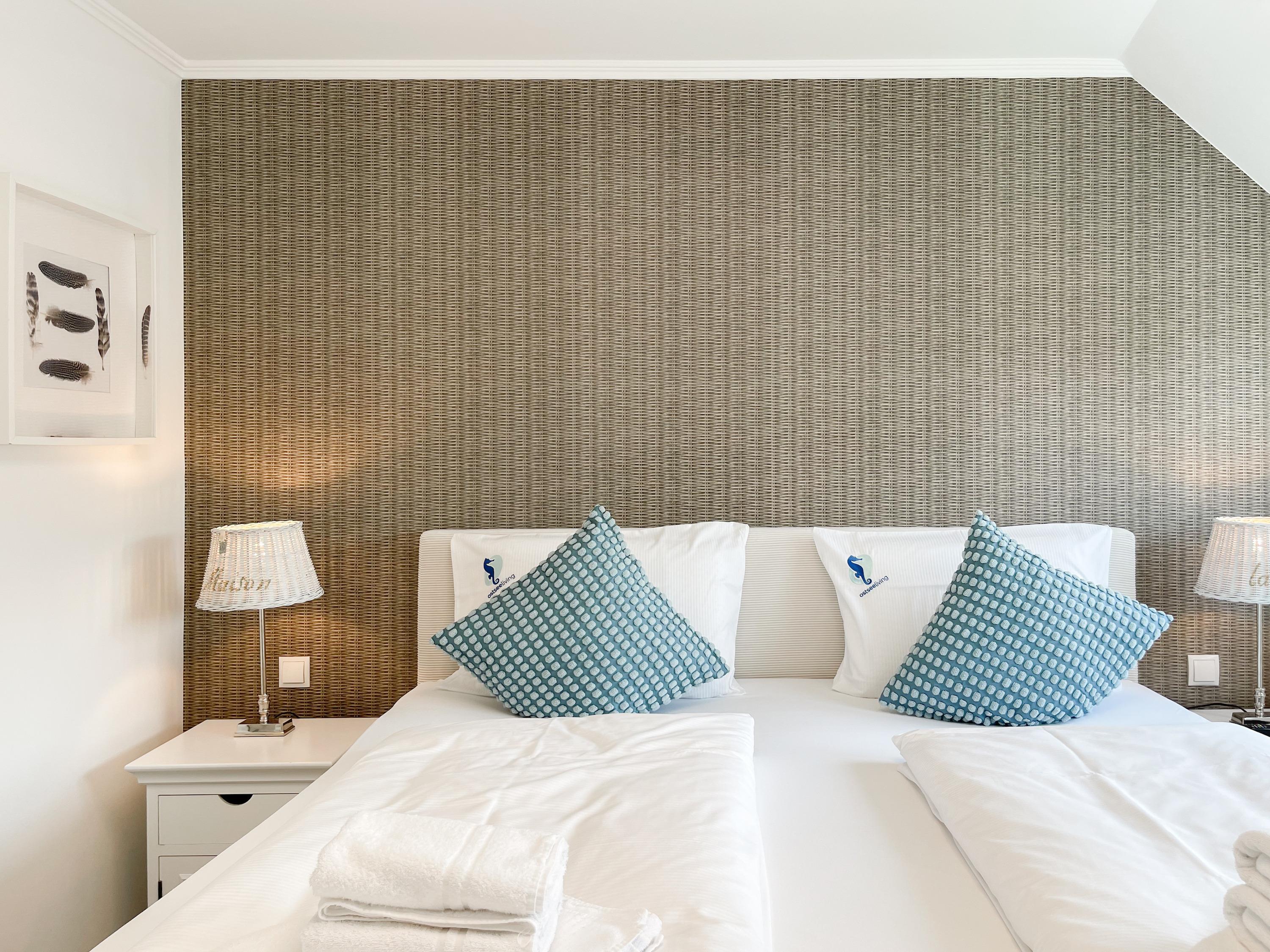 Es erwartet Sie eine wunderschönes Doppelhaus, das bereits beim Eintreten Behaglichkeit und Wohlbefinden spüren läßt. Warme Farben, viel Licht und die hochwertige Einrichtung sorgen für einen hohen Wohnstandard in einer wunderbaren Atmosphäre. Mit 4 Schlafzimmern, zwei Bädern und Sauna bietet das Haus auf[nbsp] über 100 qm Wohnfläche ausreichend Raum für 6 Personen, um einen erholsamen Ostseeurlaub ganz nah am Strand zu verleben. Im Erdgeschoss erwartet Sie ein lichtdurchfluteter Wohn- Essbereich, großzügig geschnitten und hochwertig möbliert. Die integrierte Einbauküche in perfekter Ausstattung eignet sich hervorragend für gemeinsames Kochen. Die vorgelagerte Sonnenterrasse in Südausrichtung ist mit Gartenmöbeln und Sonnenliegen ausgestattet und von einem privaten Gartengrundstück umgeben, das vollständig eingezäunt ist. Im Eingangsbereich befindet sich die Garderobe und ein modernes Bad mit Walk-In Dusche und Fenster. Die Waschmaschine ist im Spitzboden untergebracht. Im Obergeschoss gibt es zwei separate Schlafzimmer, die mit Boxspringbetten (180x200), TV und Kleiderschrank eingerichtet sind. Der Zugang zu dem dritten Einzelschlafzimmer mit kleinem Kleiderschrank, das ebenfalls über ein Boxspringbett verfügt (90x200), erfolgt über eines der Doppelschlafzimmer. Das exklusive Wellnessbad mit Badewanne, Walk-In Dusche und integrierter Sauna befindet sich ebenfalls im Obergeschoss. Das vierte Schlafzimmer mit zwei Einzelbetten ist im Dachgeschoss untergebracht, indem sich auch die kleine Waschmaschine[nbsp] befindet. Alle Fenster der Schlafräume sind mit Verdunkelungsplissees versehen.