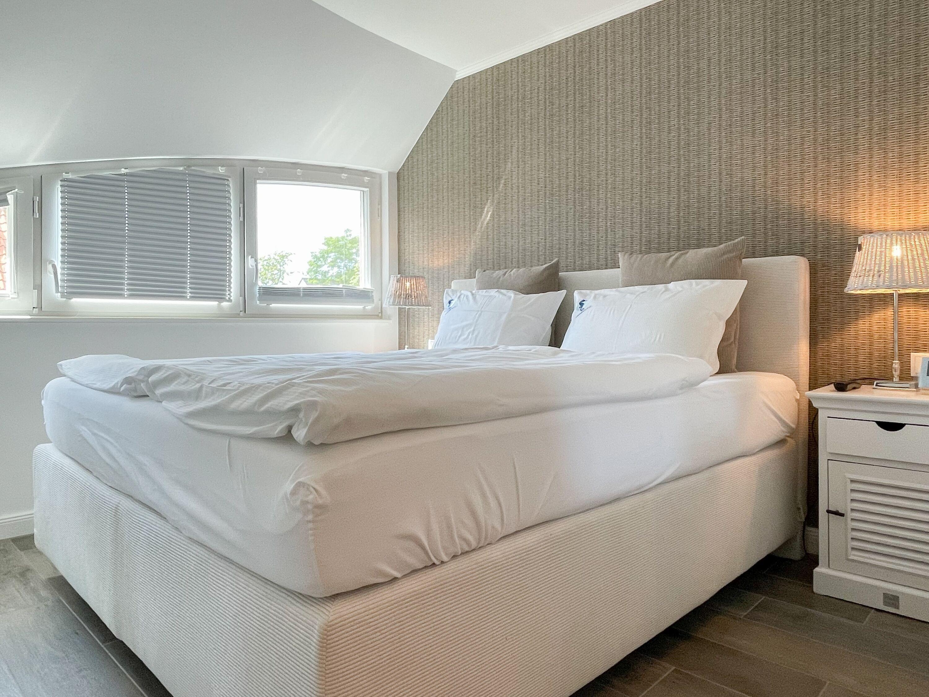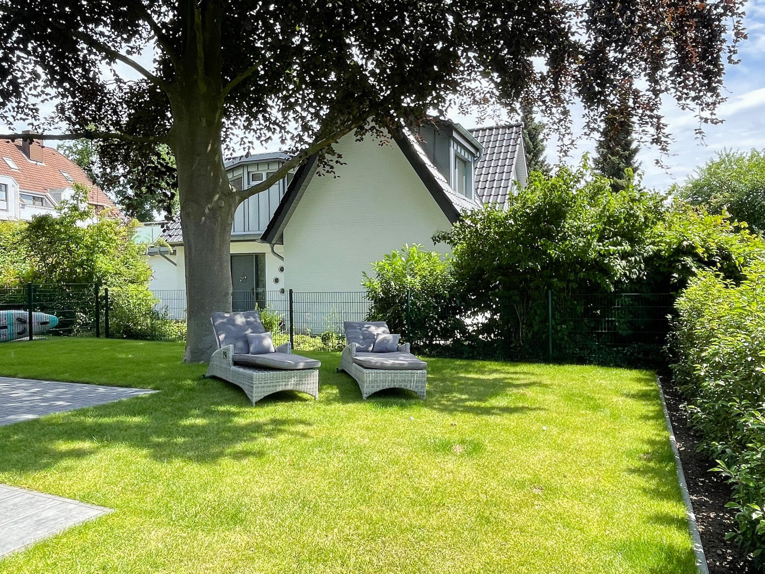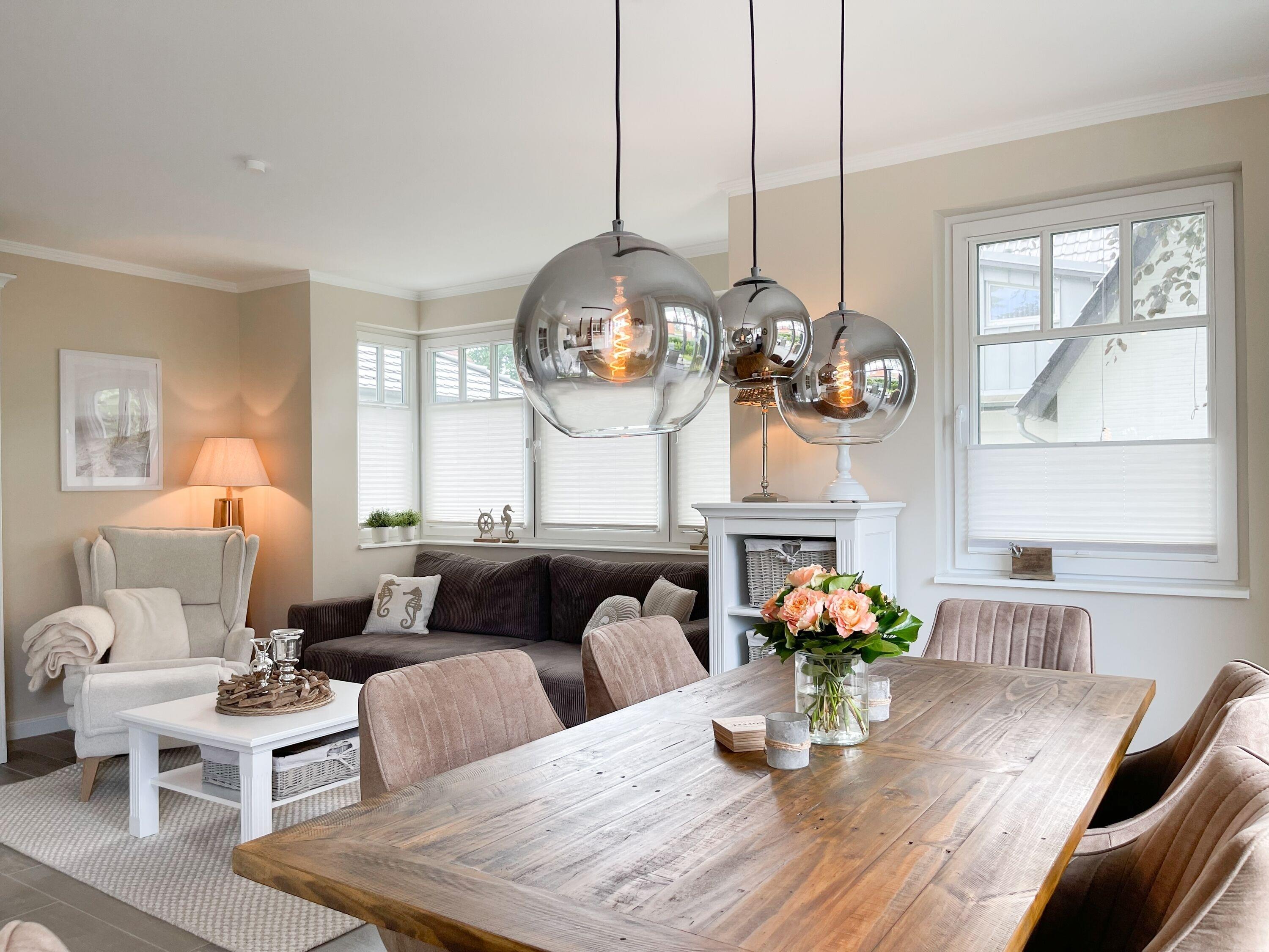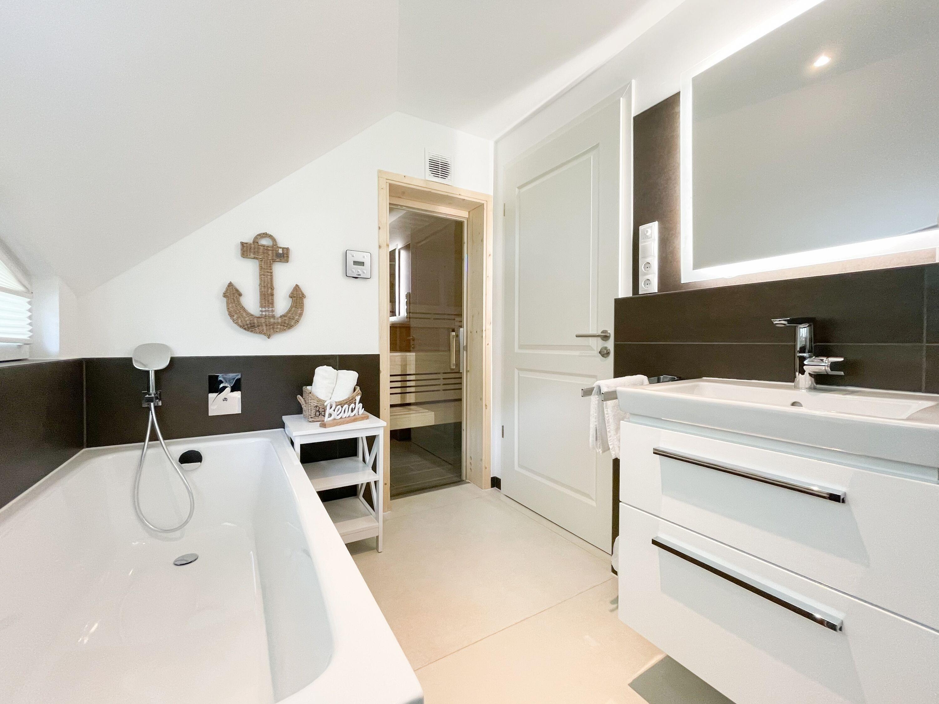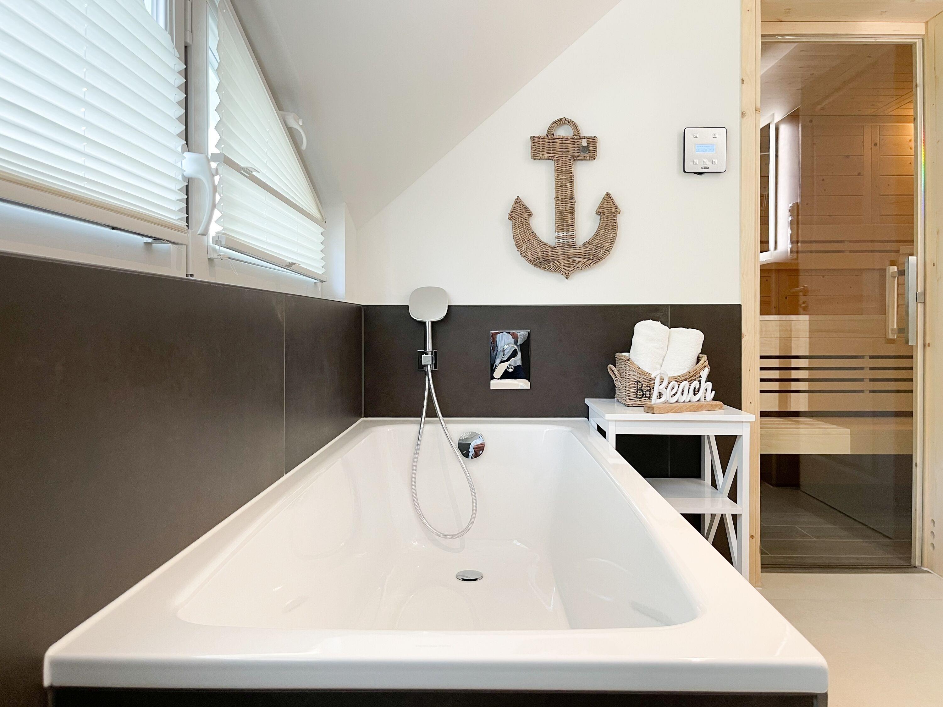 Es erwartet Sie eine wunderschönes Doppelhaus, das bereits beim Eintreten Behaglichkeit und Wohlbefinden spüren läßt. Warme Farben, viel Licht und die hochwertige Einrichtung sorgen für einen hohen Wohnstandard in einer wunderbaren Atmosphäre. Mit 3 Schlafzimmern, zwei Bädern und Sauna bietet das Haus auf[nbsp] über 100 qm Wohnfläche ausreichend Raum für 5 Personen, um einen erholsamen Ostseeurlaub ganz nah am Strand zu verleben. Im Erdgeschoss erwartet Sie ein lichtdurchfluteter Wohn- Essbereich, großzügig geschnitten und hochwertig möbliert. Die integrierte Einbauküche in perfekter Ausstattung eignet sich hervorragend für gemeinsames Kochen. Die vorgelagerte Sonnenterrasse in Südausrichtung ist mit Gartenmöbeln und Sonnenliegen ausgestattet und von einem privaten Gartengrundstück umgeben, das vollständig eingezäunt ist. Im Eingangsbereich befindet sich die Garderobe und ein modernes Bad mit Walk-In Dusche und Fenster. Die Waschmaschine ist im separaten Hauswirtschaftsraum untergebracht. Im Obergeschoss gibt es zwei separate Schlafzimmer, die mit Boxspringbetten (180x200), Kleiderschränken und TV eingerichtet sind. Der Zugang zu dem dritten kleinen Einzelschlafzimmer, das ebenfalls über ein Boxspringbett verfügt (90x200), erfolgt über eines der Doppelschlafzimmer. Das exklusive Wellnessbad mit Badewanne, Walk-In Dusche und integrierter Sauna befindet sich ebenfalls im Obergeschoss. Das Dachgeschoss ist für das home office mit einem Schreibtisch eingerichtet. Alle Fenster der Schlafräume sind mit Blackout Plissees versehen.
