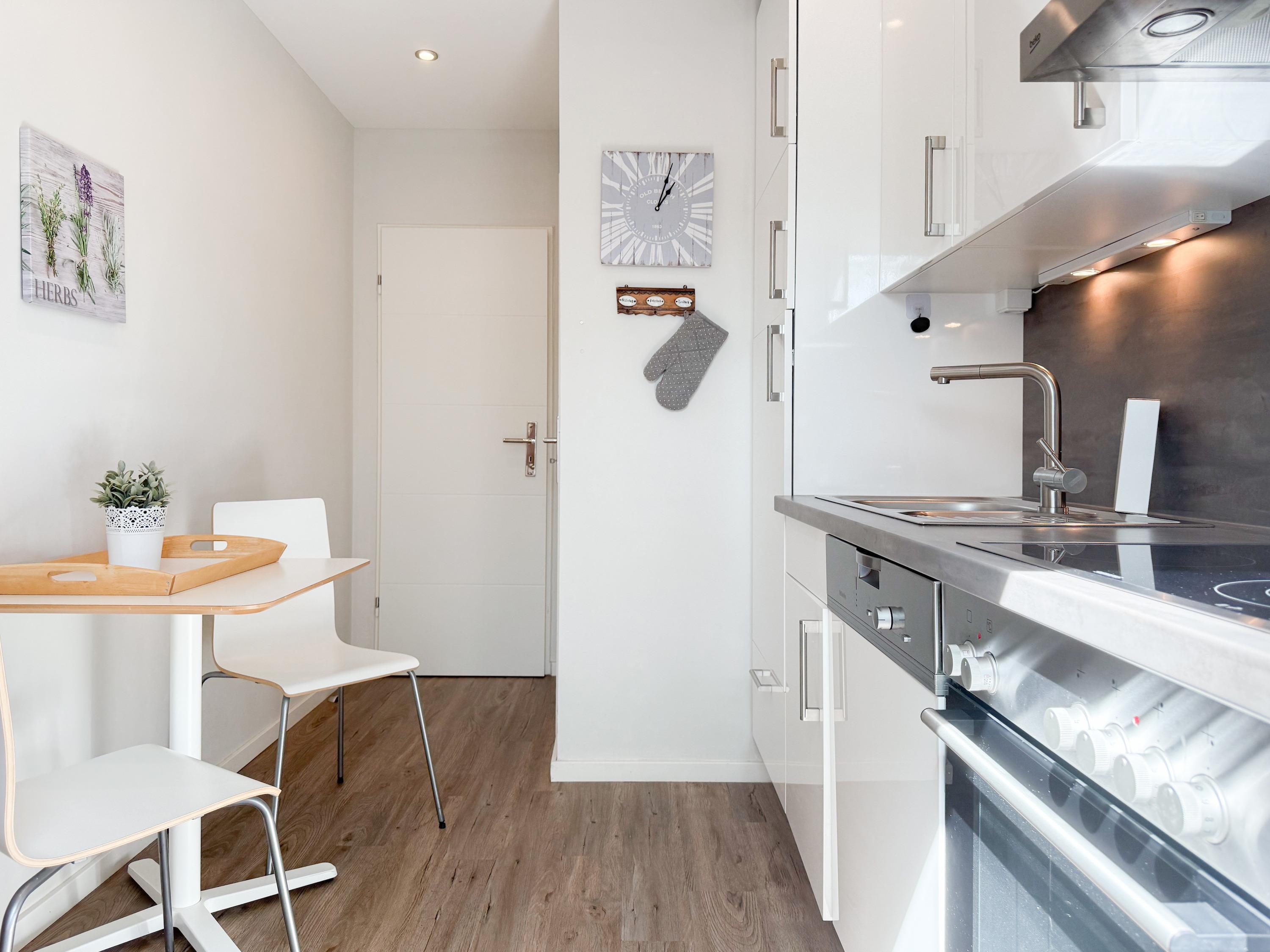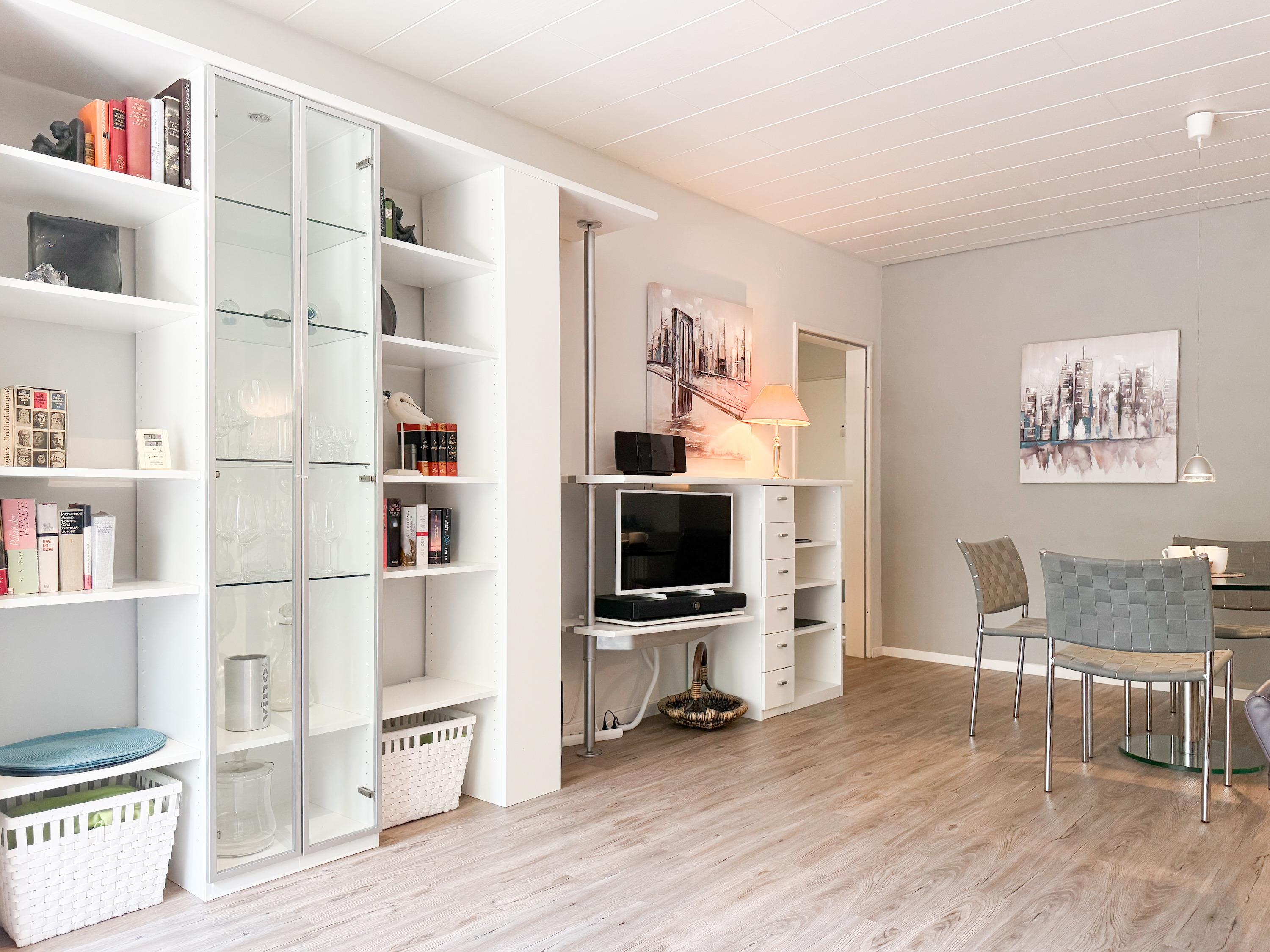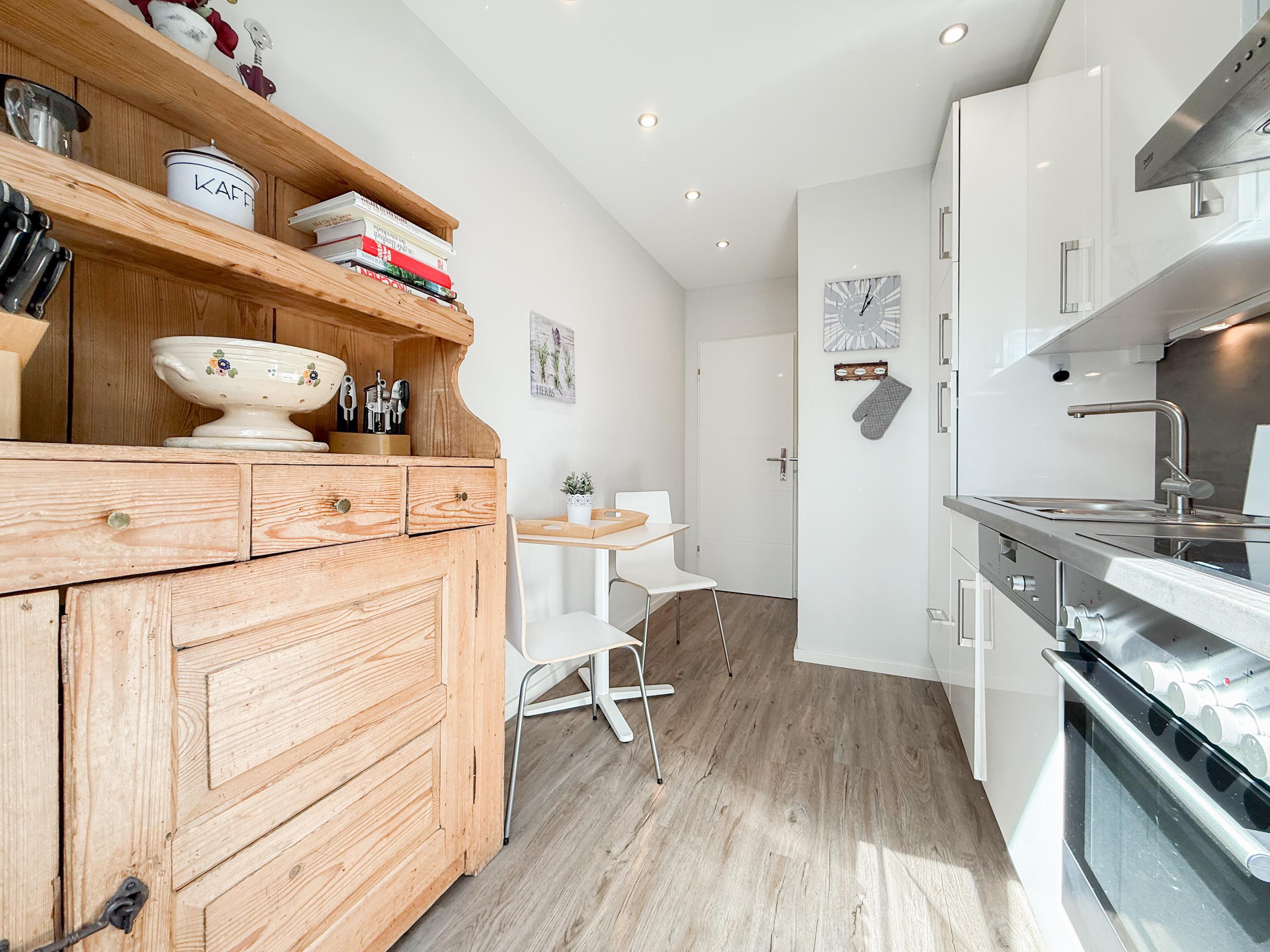 Der geschmackvoll gestaltete, helle Wohnbereich ist mit Sofa, TV, WLAN und Essbereich für 4 Personen ausgestattet. Von hier ist der Südwestbalkon zu erreichen, der über Markise, Gartenmöbel und Sonnenliege verfügt. Genießen Sie die Sonne von früh bis spät und entspannen mit einem schönen Blick ins Grüne. Die separate, moderne Einbauküche ist bestens ausgestattet und verfügt über einen kleinen Frühstücksbereich. Ein großes Schlafzimmer mit Doppelbett (180x200) und TV, ein kleineres Schlafzimmer mit 2 Einzelbetten (100x200) und ein modernes, neues Duschbad stehen den Gästen zur Verfügung. Alle Fenster sind mit Außenjalousien versehen. Waschmaschine und Trockner sind im Keller untergebracht und stehen zur kostenlosen Nutzung zur Verfügung.