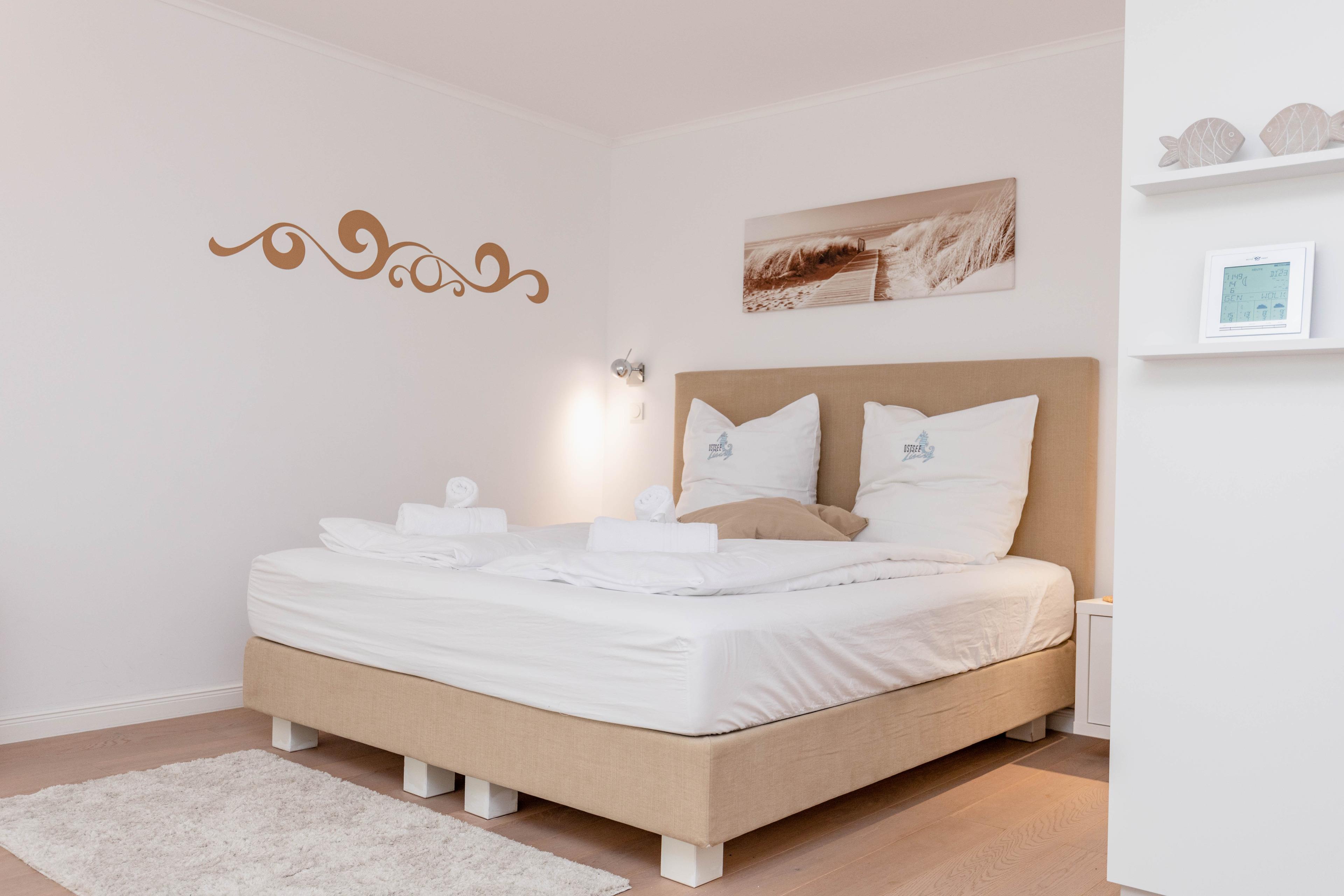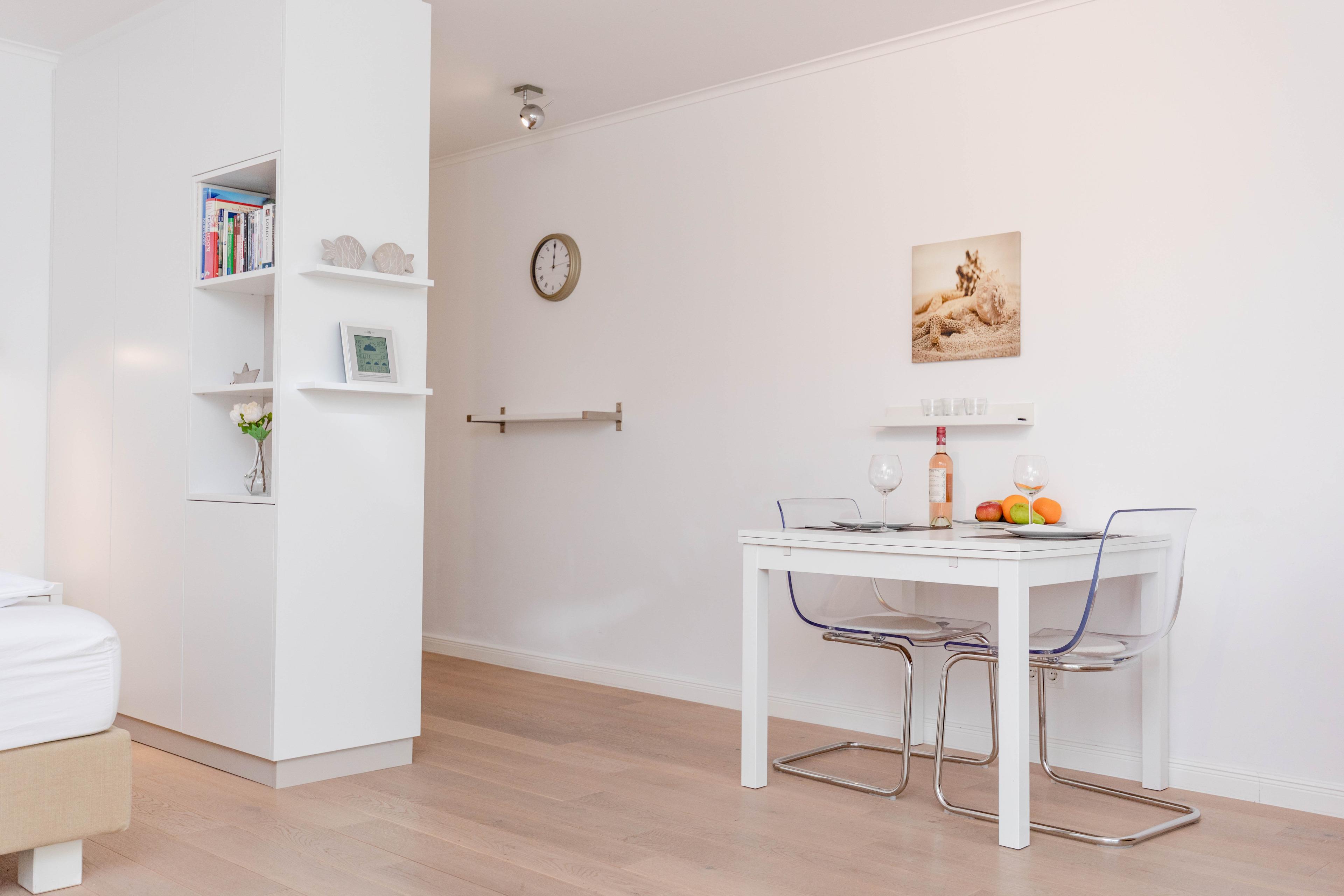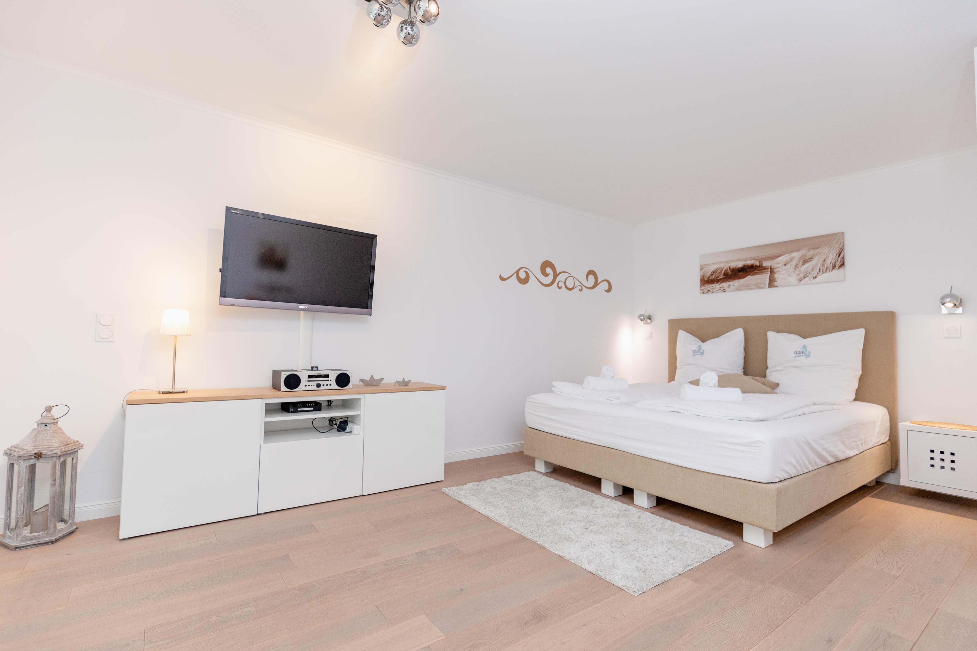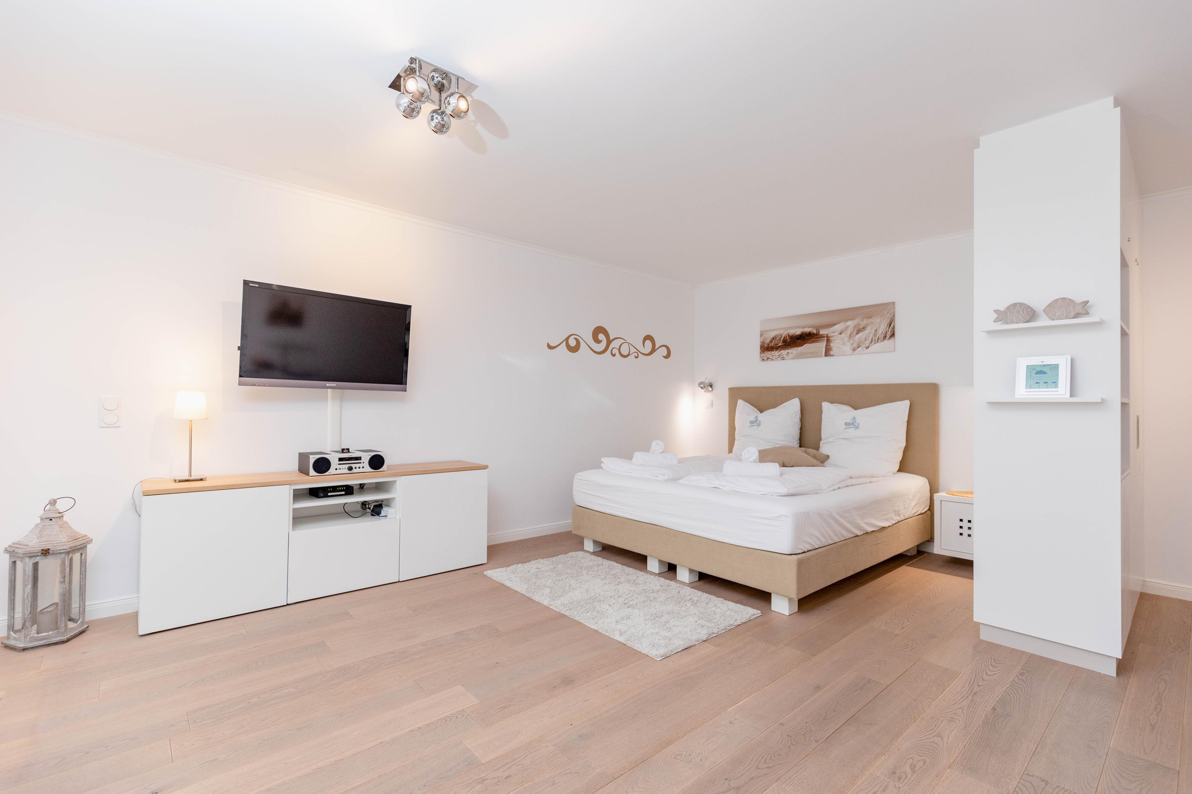 Bodentiefe Fensterelemente, Echtholzparkett und die hochwertige Einrichtung schaffen eine helle und freundliche Wohnatmosphäre. Die 42 qm wurden optimal genutzt und bieten ausreichend Platz für 2 Personen. Es steht ein geschmackvoller, großzügiger Wohn- Schlafbereich mit einem bequemen Sofa[nbsp][nbsp]und ein Essbereich für 2 Personen zur Verfügung. Das hochwertige Luxusbett aus der Bettenmanufaktur Sleep[&]Dream superior in Hotelqualität (180x200) ist besonders hervorzuheben und Garant für einen erholsamen Schlaf. Unterhaltung bieten der Sony TV 50 Zoll (127 cm) schwenkbar mit USB Anschluß, Blue-Ray Player, Hifi-Anlage mit Bluetooth und kostenloser Internetzugang über WLAN. Die moderne individuell eingerichtete Küchenzeile ist bestens ausgestattet und verfügt über Geschirrspülmaschine und Mikrowelle mit Backfunktion.[nbsp] Das moderne, geräumige Bad verfügt über eine Dusche, Waschtisch, WC, Handtuchwärmer und Fön. Tiefgaragenstellplatz (Einfahrtshöhe 1,75 m), Aufzug, Fahrradkeller (eine Platzgarantie für Ihre Fahrräder besteht nicht) sowie Waschmaschine und Trockner (Münzgeräte) sind vorhanden.