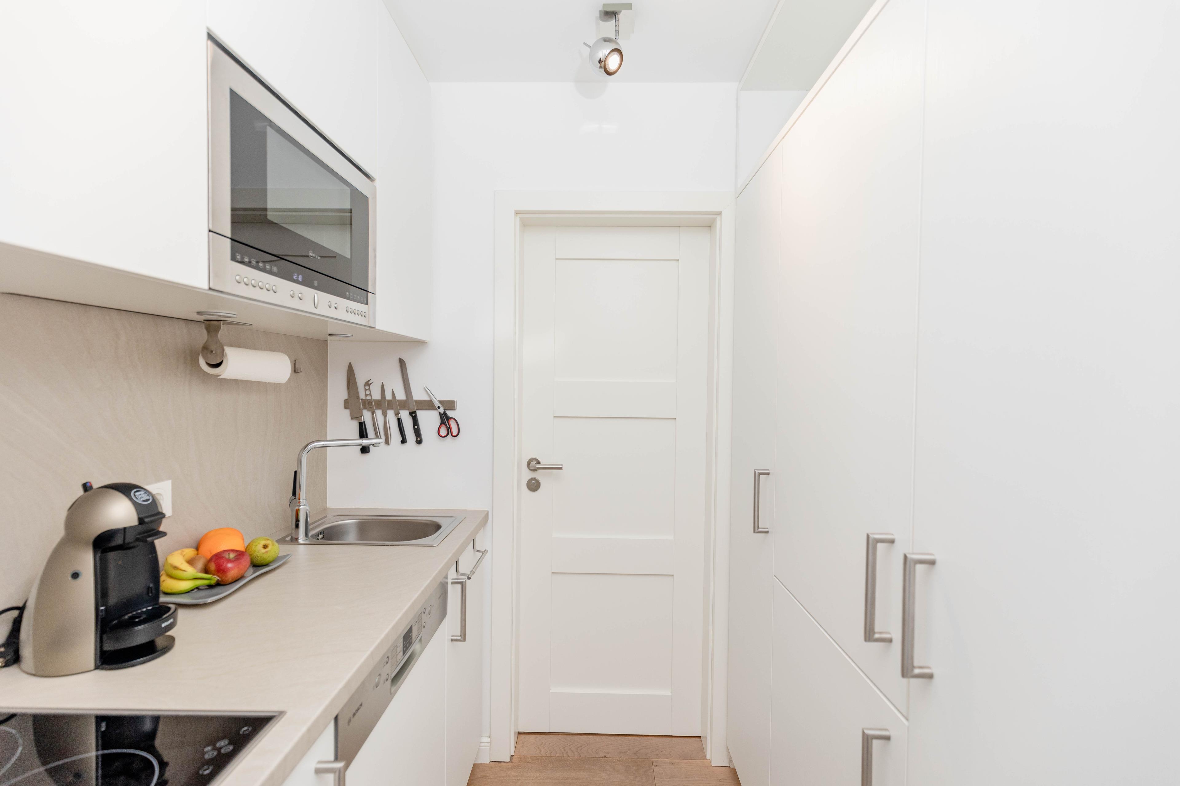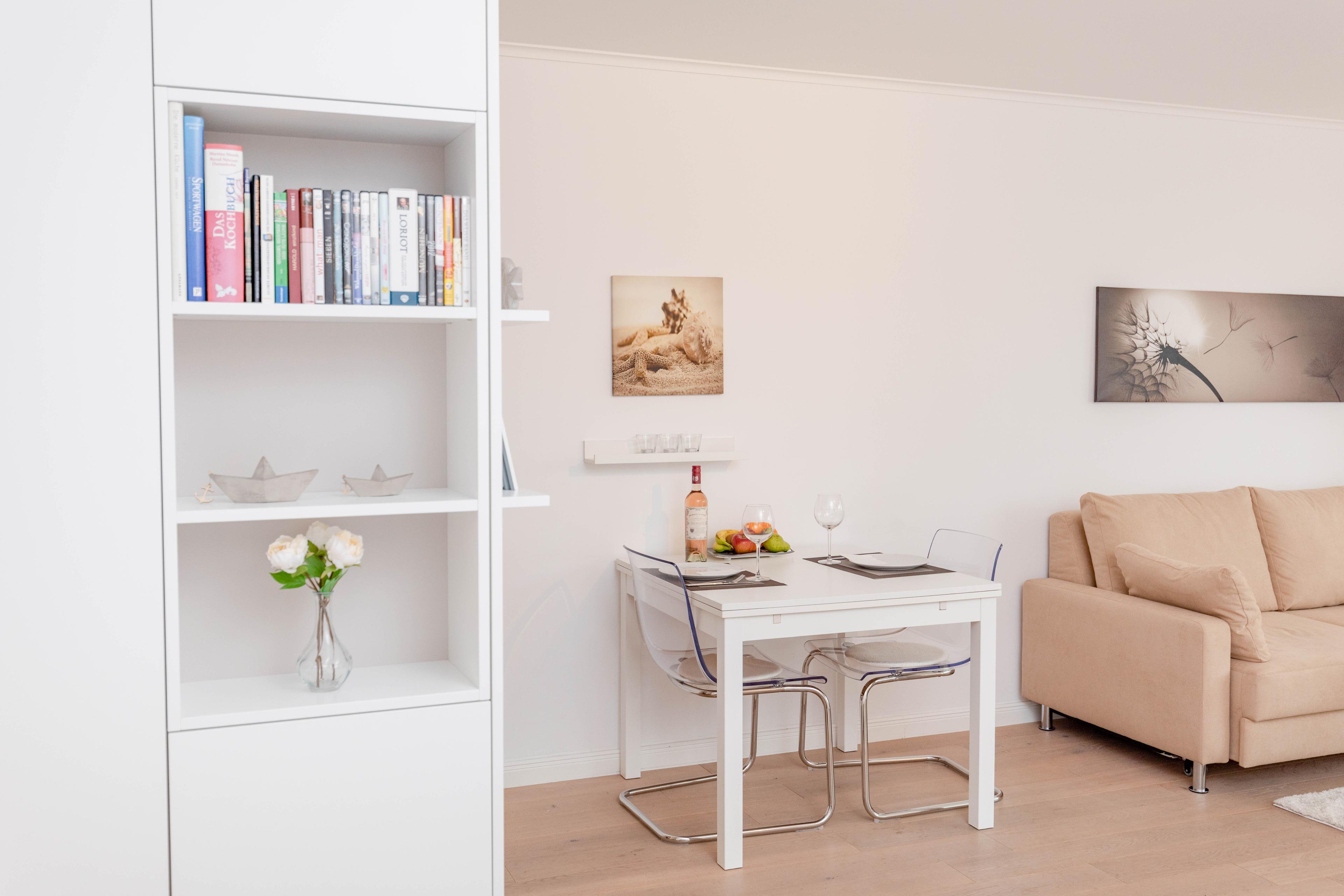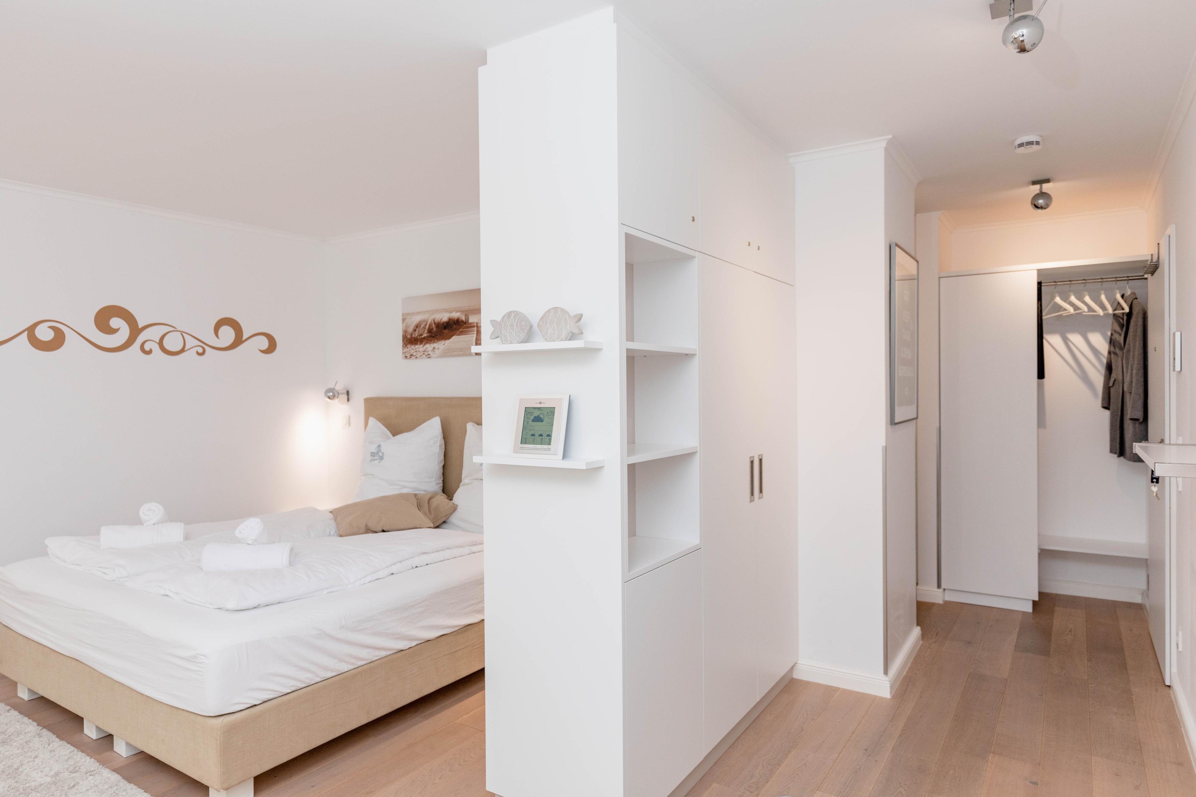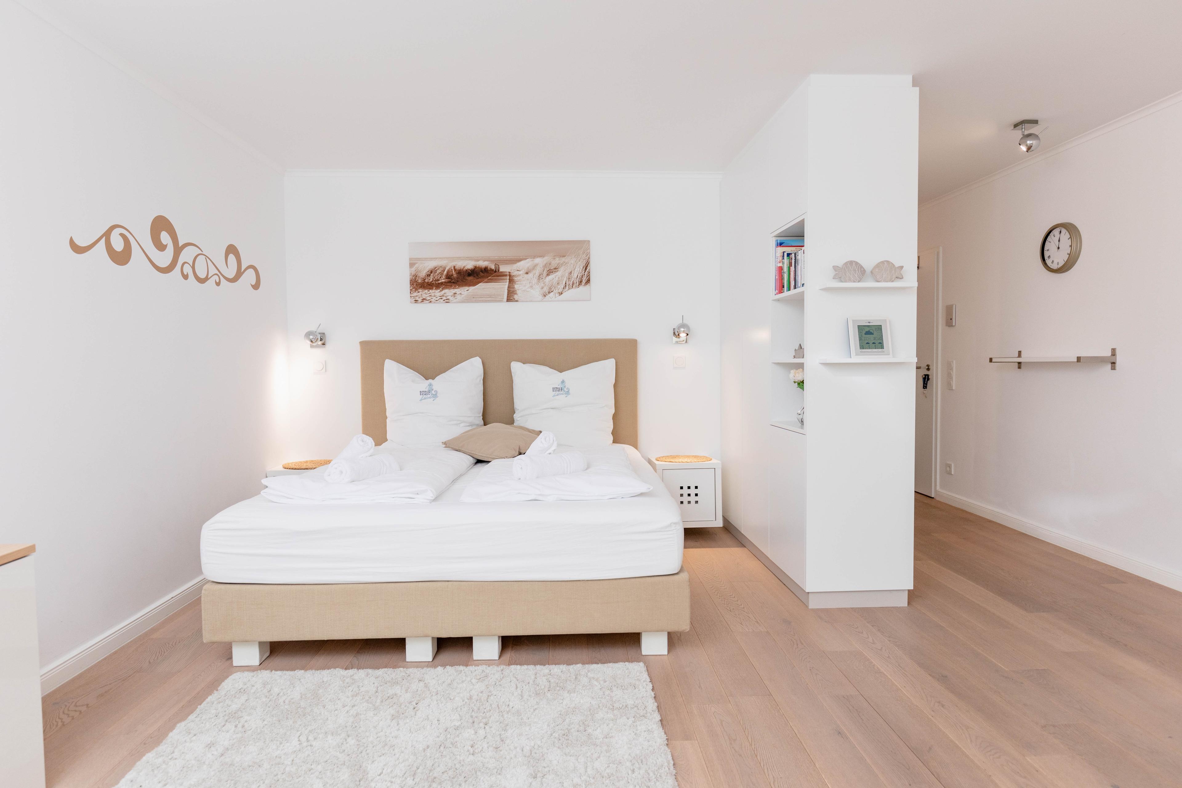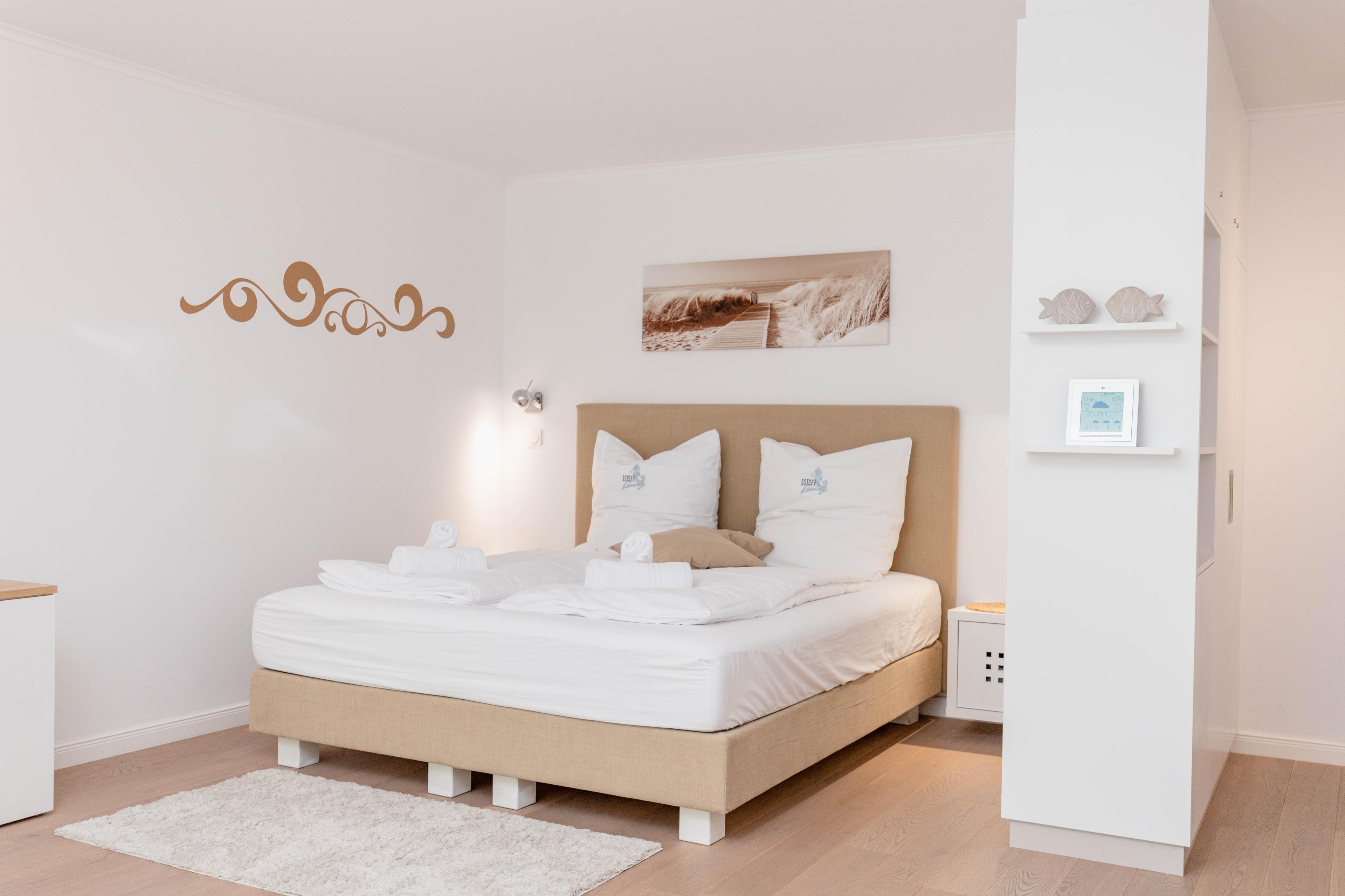 Bodentiefe Fensterelemente, Echtholzparkett und die hochwertige Einrichtung schaffen eine helle und freundliche Wohnatmosphäre. Die 42 qm wurden optimal genutzt und bieten ausreichend Platz für 2 Personen. Es steht ein geschmackvoller, großzügiger Wohn- Schlafbereich mit einem bequemen Sofa[nbsp][nbsp]und ein Essbereich für 2 Personen zur Verfügung. Das hochwertige Luxusbett aus der Bettenmanufaktur Sleep[&]Dream superior in Hotelqualität (180x200) ist besonders hervorzuheben und Garant für einen erholsamen Schlaf. Unterhaltung bieten der Sony TV 50 Zoll (127 cm) schwenkbar mit USB Anschluß, Blue-Ray Player, Hifi-Anlage mit Bluetooth und kostenloser Internetzugang über WLAN. Die moderne individuell eingerichtete Küchenzeile ist bestens ausgestattet und verfügt über Geschirrspülmaschine und Mikrowelle mit Backfunktion.[nbsp] Das moderne, geräumige Bad verfügt über eine Dusche, Waschtisch, WC, Handtuchwärmer und Fön. Tiefgaragenstellplatz (Einfahrtshöhe 1,75 m), Aufzug, Fahrradkeller (eine Platzgarantie für Ihre Fahrräder besteht nicht) sowie Waschmaschine und Trockner (Münzgeräte) sind vorhanden.