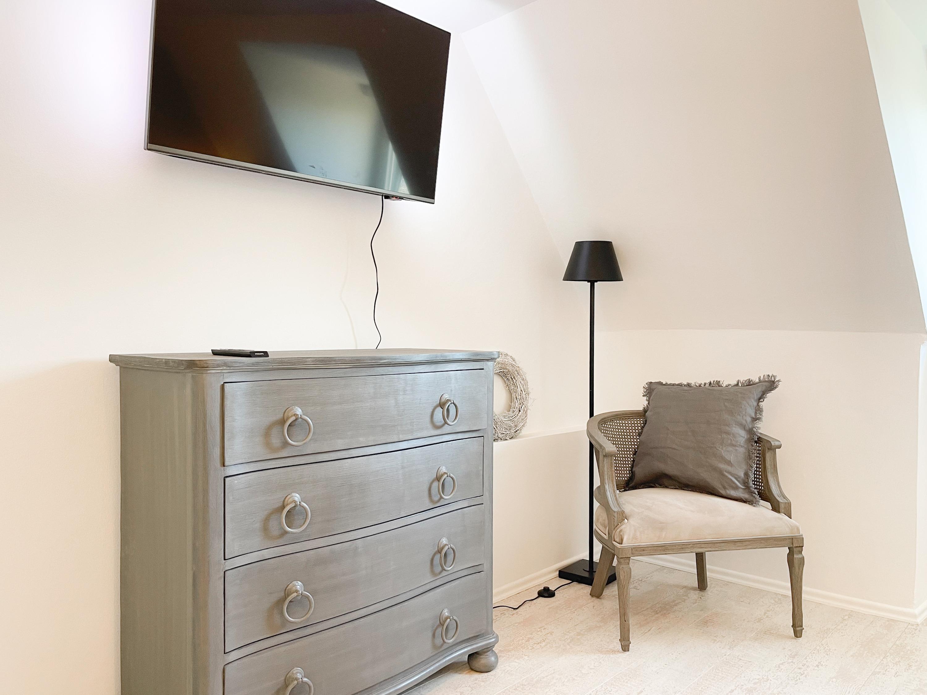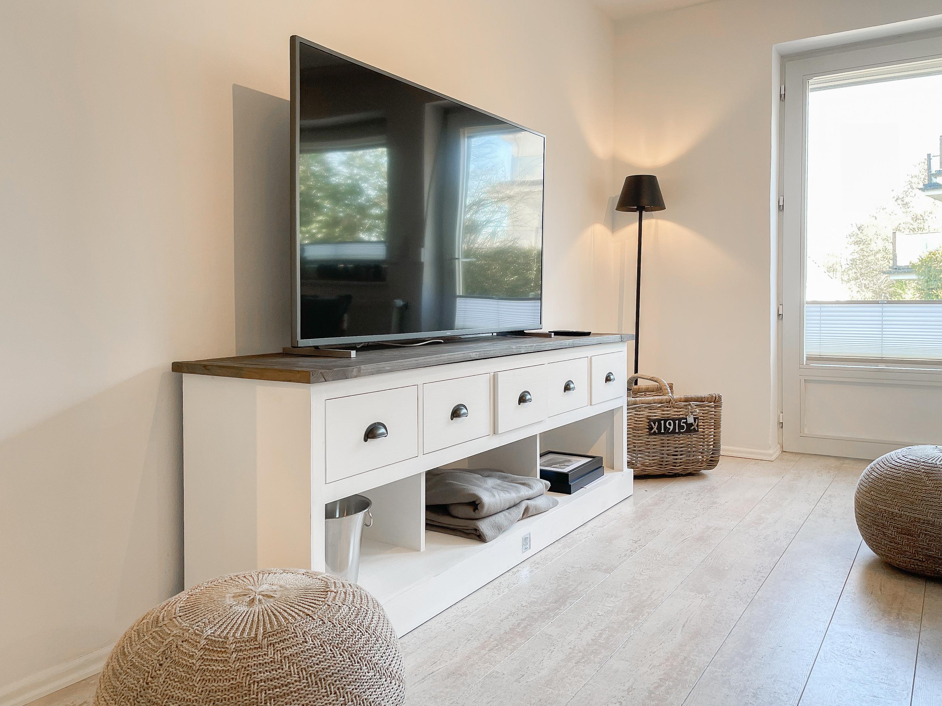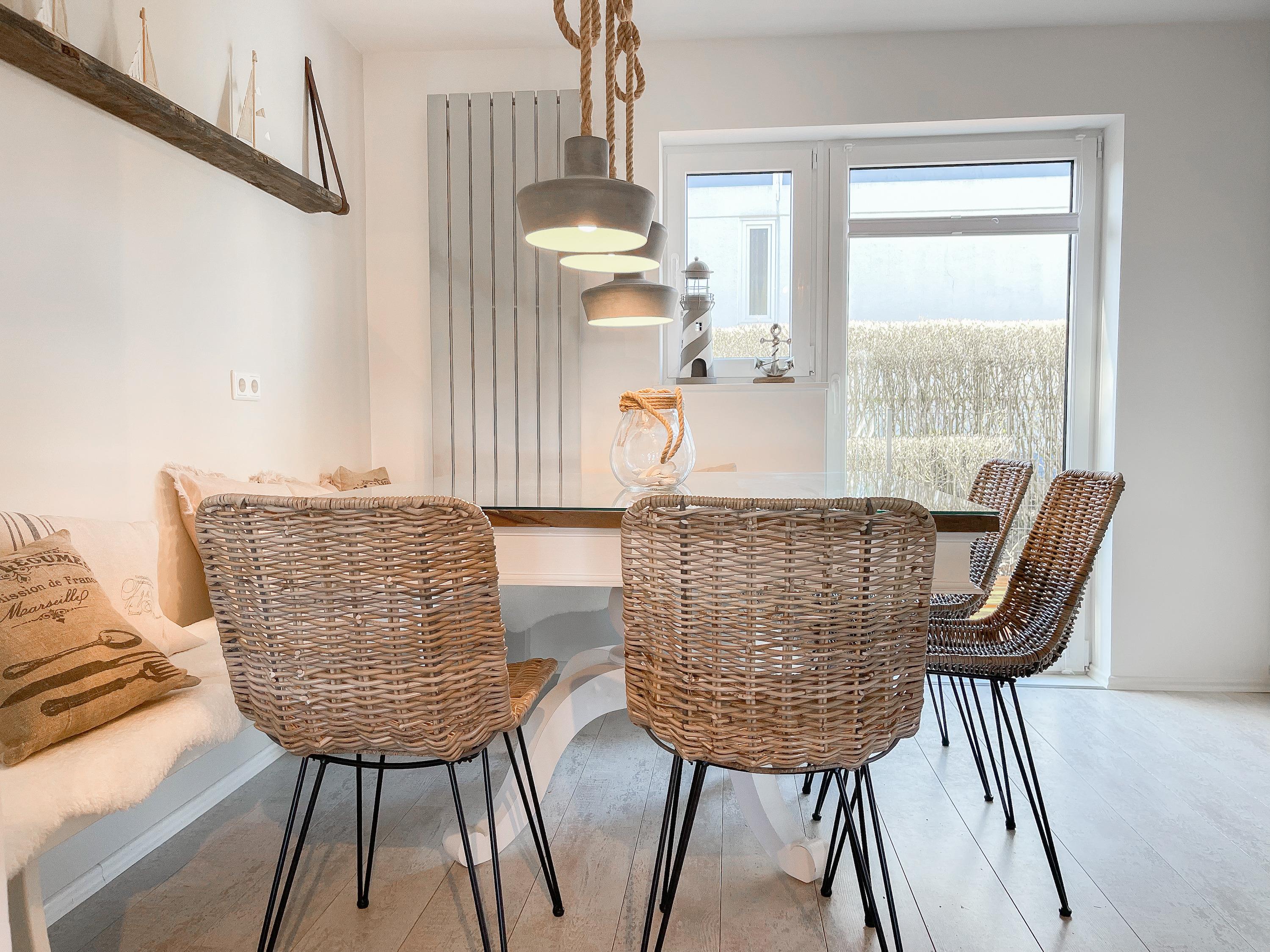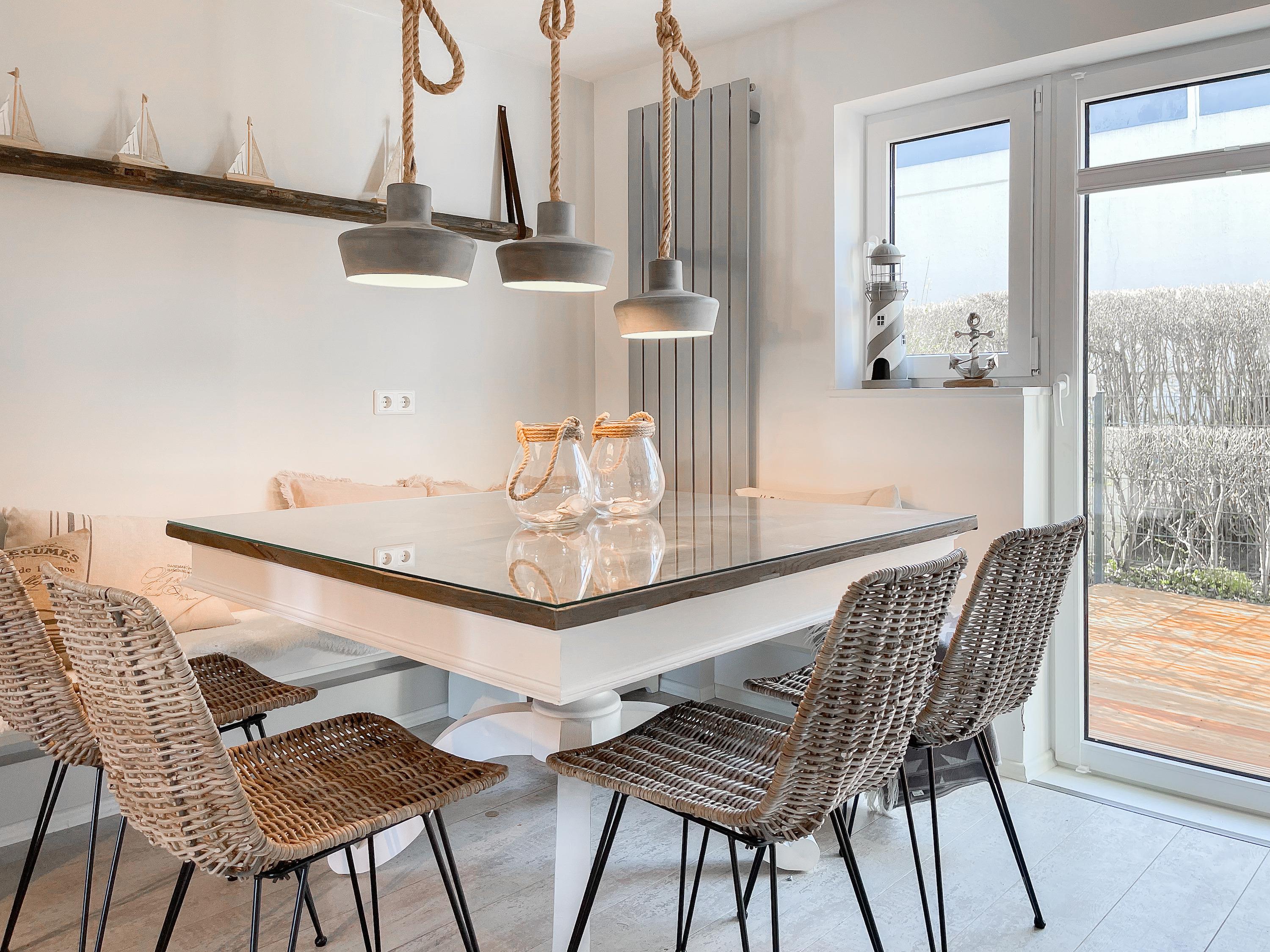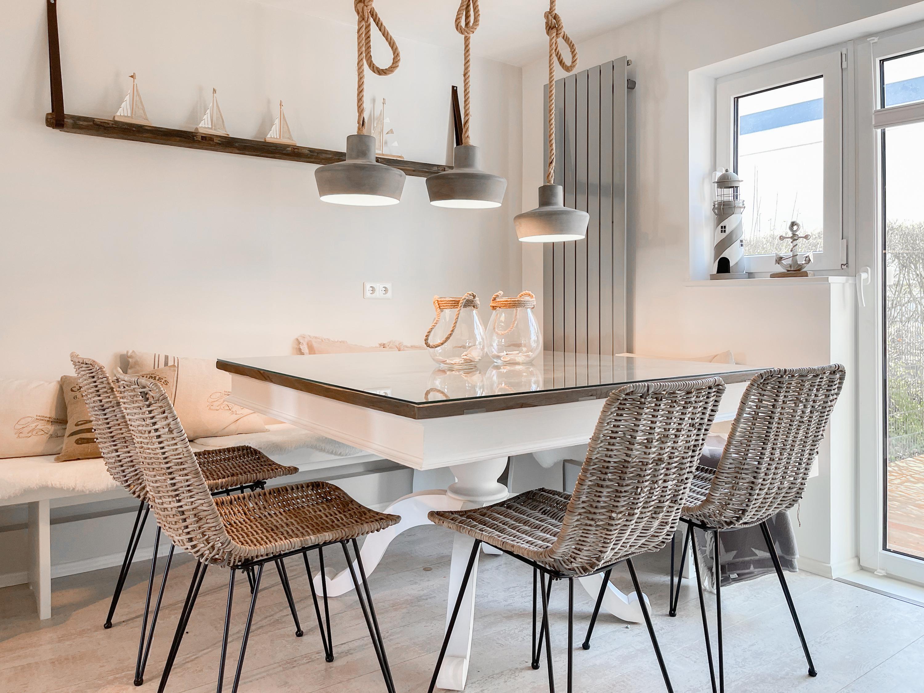 Strandflair pur! Das renovierte und mit viel Liebe zum Detail ausgestattete Ferienhaus Strandbude bietet tolles Strandambiente, um einen entspannten Urlaub in Ostseenähe zu verleben. Natürliche Materialien und die äußerst geschmackvolle Einrichtung des Altbaus sorgen für eine herrliche Wohnatmosphäre im Hampton Style. Es erwartet Sie ein charmanter Wohnbereich mit einem hochwertigen Sofa, Sessel und XL TV. Auf der vorgelagerten Terrasse 1 können sie bereits die ersten Sonnenstrahlen beim Morgenkaffee genießen. Die anschließende Küche ist gut ausgestattet und der geschmackvoll gestaltete Essbereich ist ebenso Treffpunkt für gemütliches Beisammensein wie auch die[nbsp][nbsp]anschließende Terrasse 2 mit Sonne satt. Die Außenbereiche sind mit Gartenmöbeln und einem Strandkorb ausgestattet. Im Obergeschoss befindet sich ein Schlafzimmer mit einem Boxspringdoppelbett (180x200), Kleiderschrank und TV und ein weiteres Schlafzimmer mit einem Einzelbett, kleinem Kleiderschrank und einem Schreibtisch. Im Spitzboden (Deckenhöhe 1,80 m), der über eine Raumspartreppe zu erreichen ist, befindet sich das 3. Schlafzimmer mit einem Doppelbett (180x200) und eine Kleiderstange auf Rollen. Die Fenster der Schlafräume lassen sich verdunkeln. Ein Bad mit Badewanne befindet sich im Erdgeschoss, das zweite Bad mit Dusche im Obergeschoss. WLAN steht selbstverständlich zur kostenlosen Nutzung zur Verfügung. Eine Waschmaschine und ein Trockner sind im Keller untergebracht. Ein Parkplatz und ein abschließbarer Fahrradschuppen befinden sich direkt am Haus.