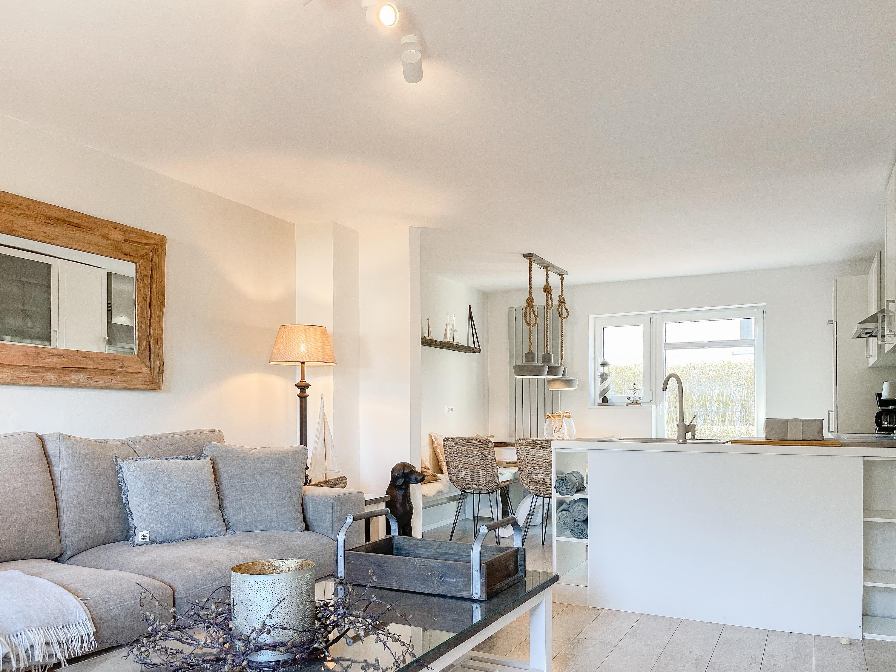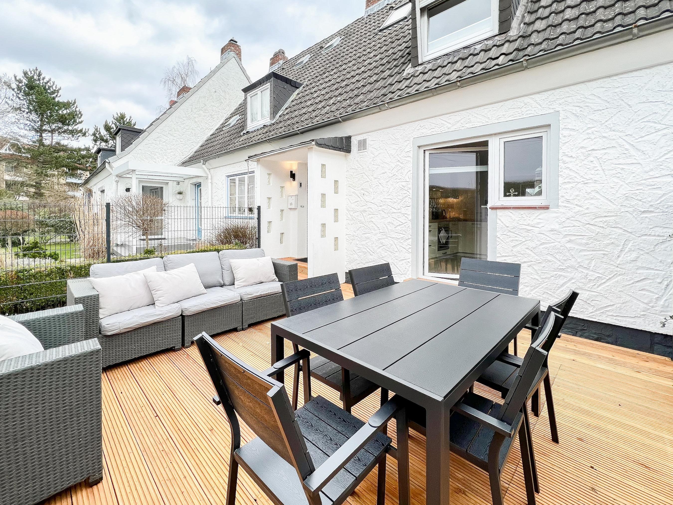 Charmantes Reihenhaus "Strandbude" in Timmendorfer Strand mit Strandkorb und stilvoller Einrichtung für entspannte Urlaubstage.