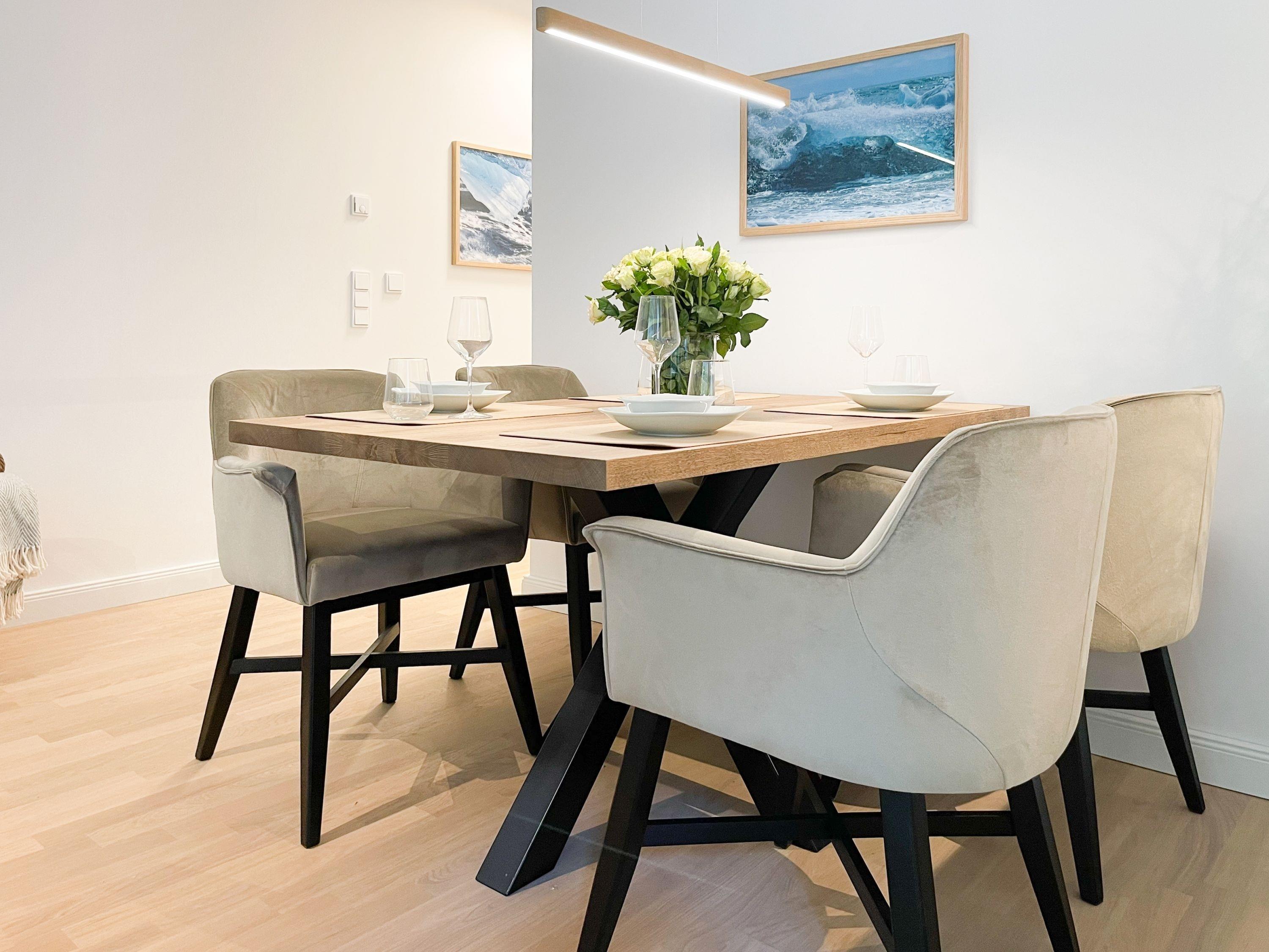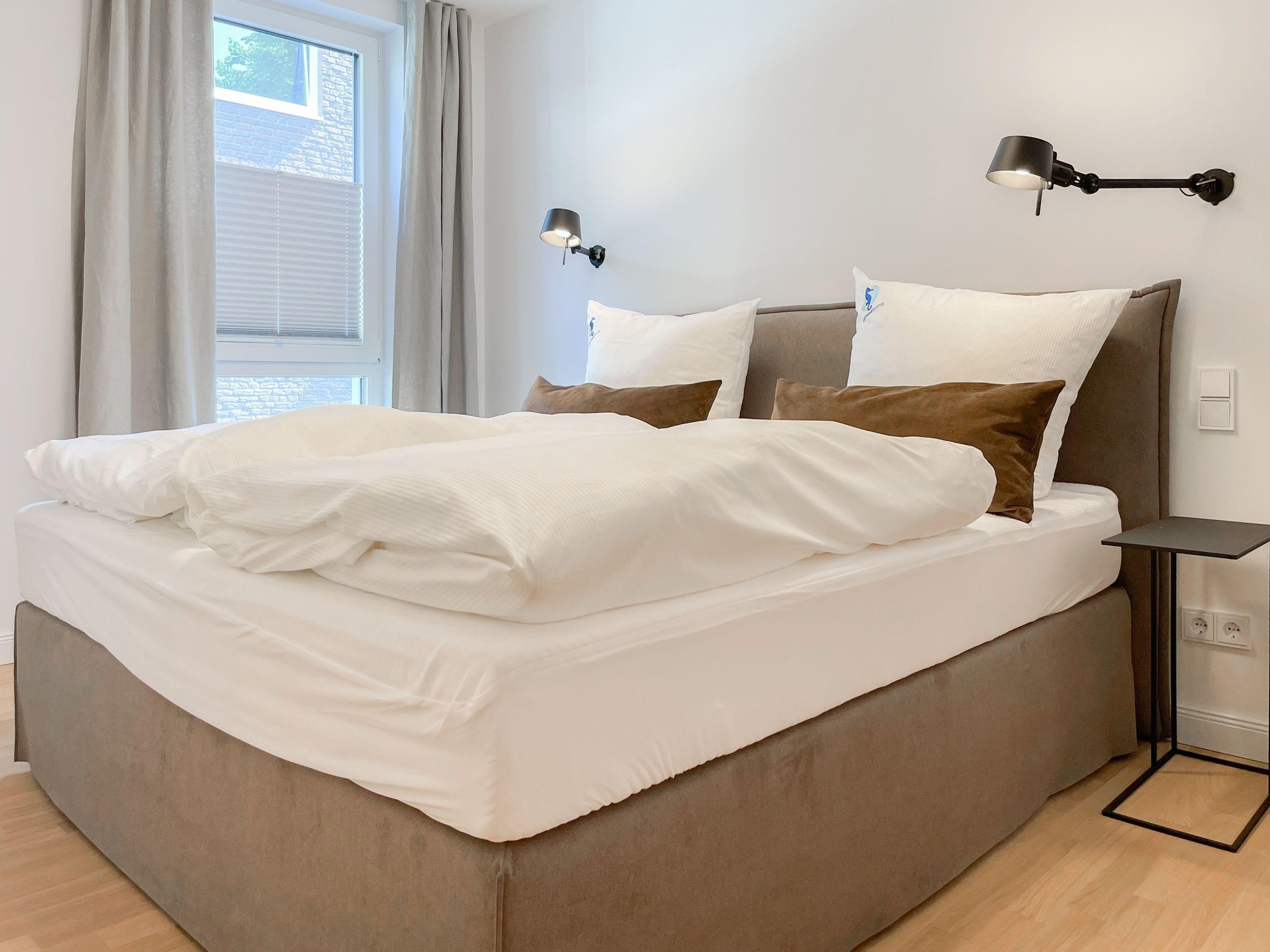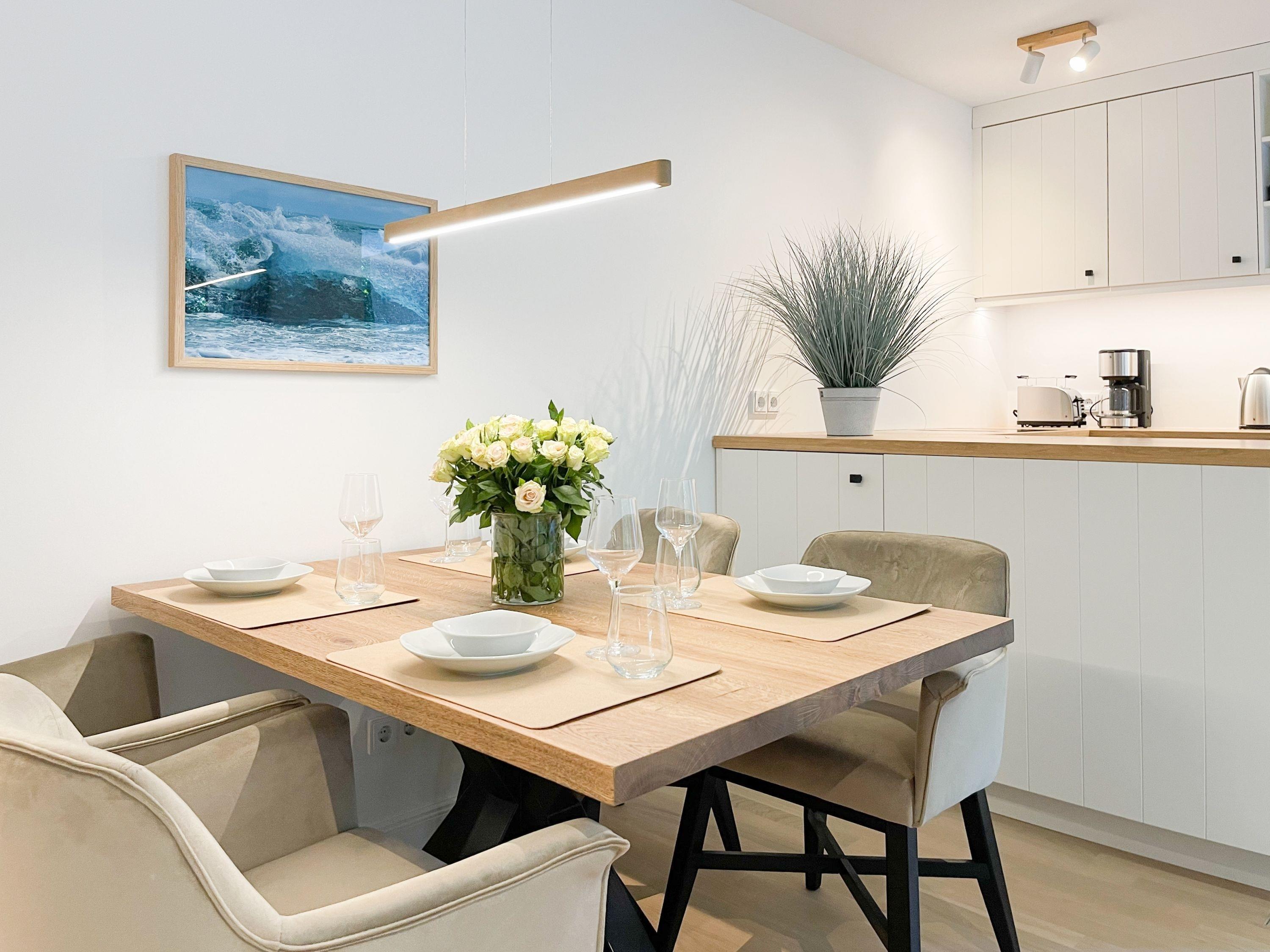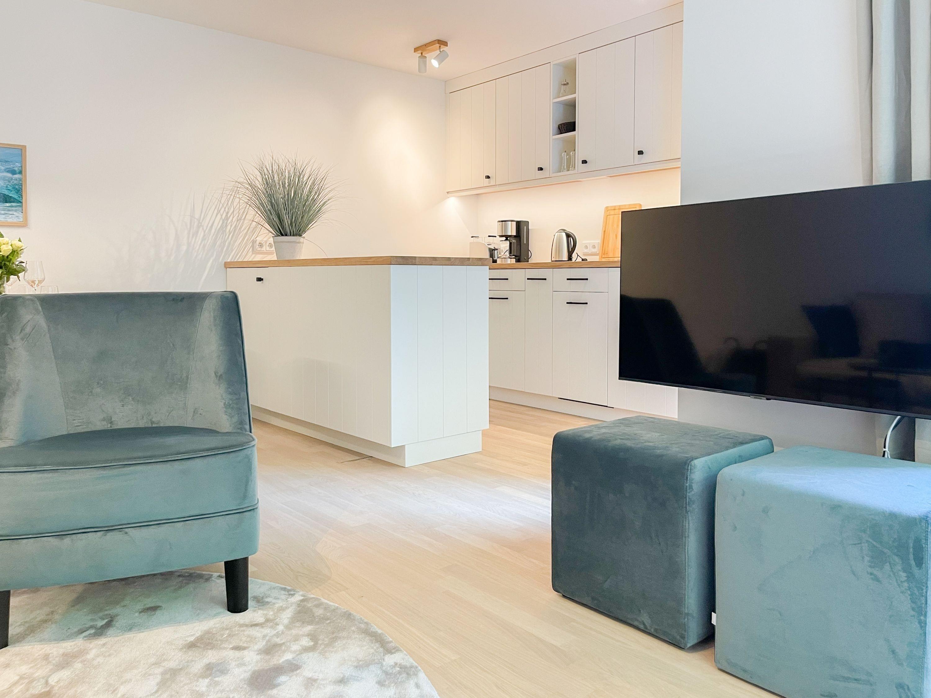 Es erwartet Sie eine äußerst hochwertig eingerichtete und bestens ausgestattete Ferienwohnung in der 1. Etage, die einen hohen Wohnstandard in einem schönen Ambiente gewährleistet. Mittelpunkt der Strandkoje bildet der Wohnbereich mit vorgelagertem Balkon und schönem Blick ins Grüne, der mit einem hochwertigen Sofa mit Schlaffunktion (140x200) ausgestattet ist. Der Essbereich bietet ausreichend Platz für 4 Personen zum gemütlichen Beisammensein und die großzügig angelegte Wohnküche ist bestens ausgestattet (Miele-Geräte) und lädt zum gemeinsamen Kochen ein. Das Schlafzimmer ist mit einem Boxspringbett (180x200), einem Kleiderschrank mit reichlich Stauraum, Plissees zur Verdunkelung und einem zusätzlichen TV eingerichtet. Das Bad ist großzügig und modern mit Walk In Dusche, Waschtisch, WC, Handtuchtrockner und Fenster sowie einem integriertem Waschtrockner. WLAN steht selbstverständlich zur kostenlosen Nutzung bereit.
