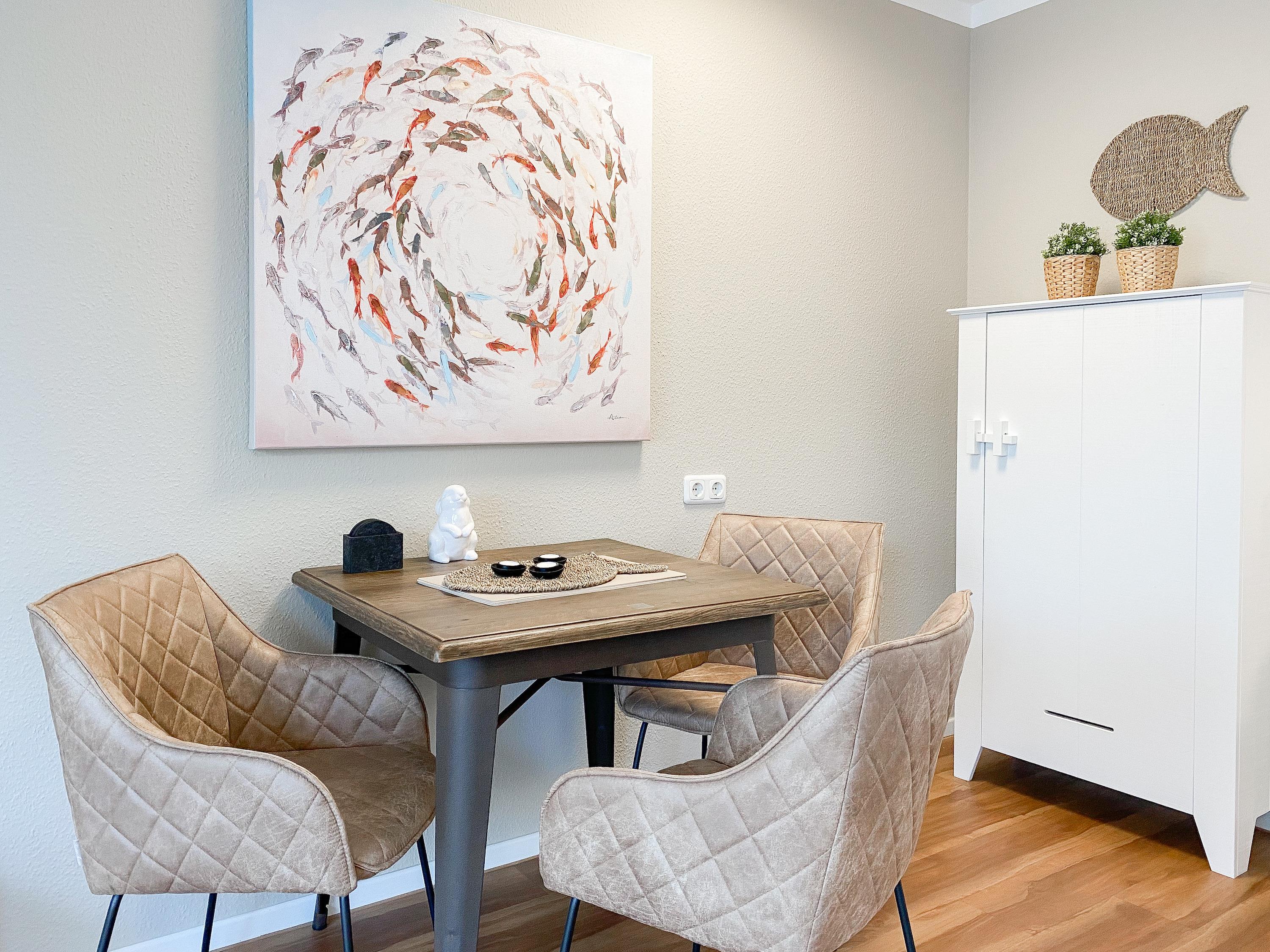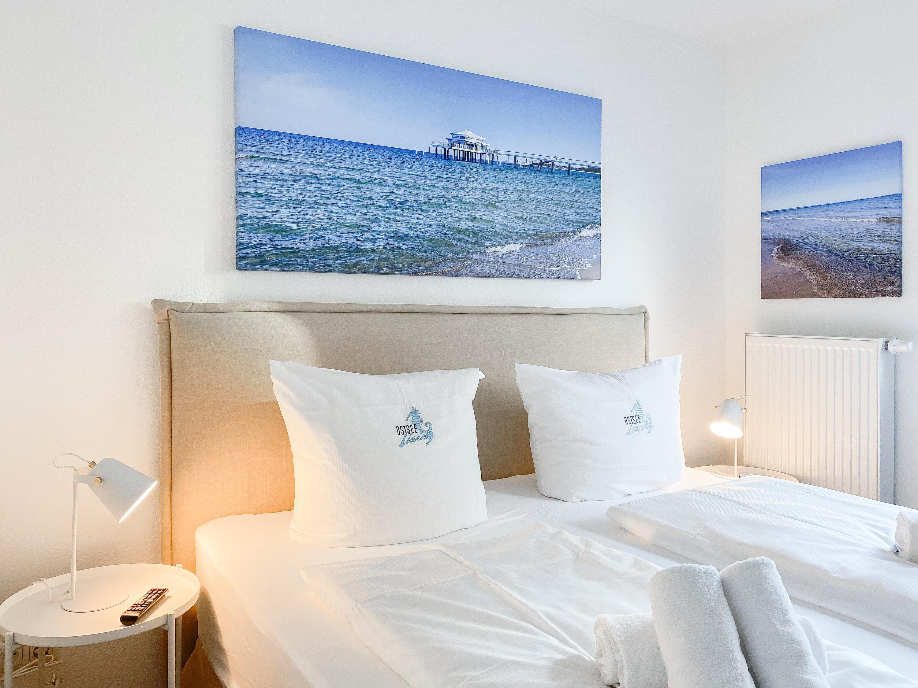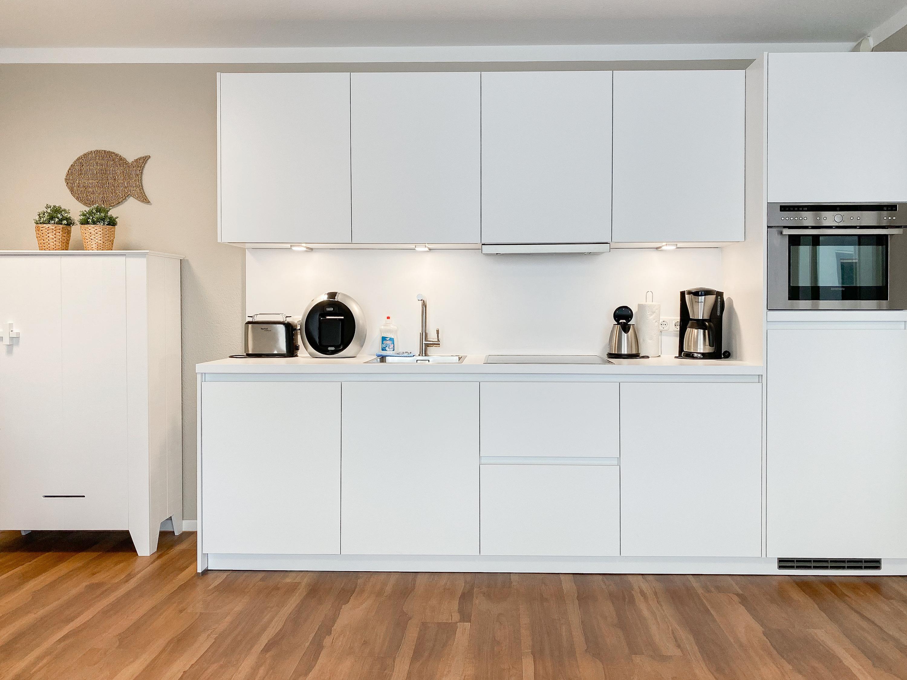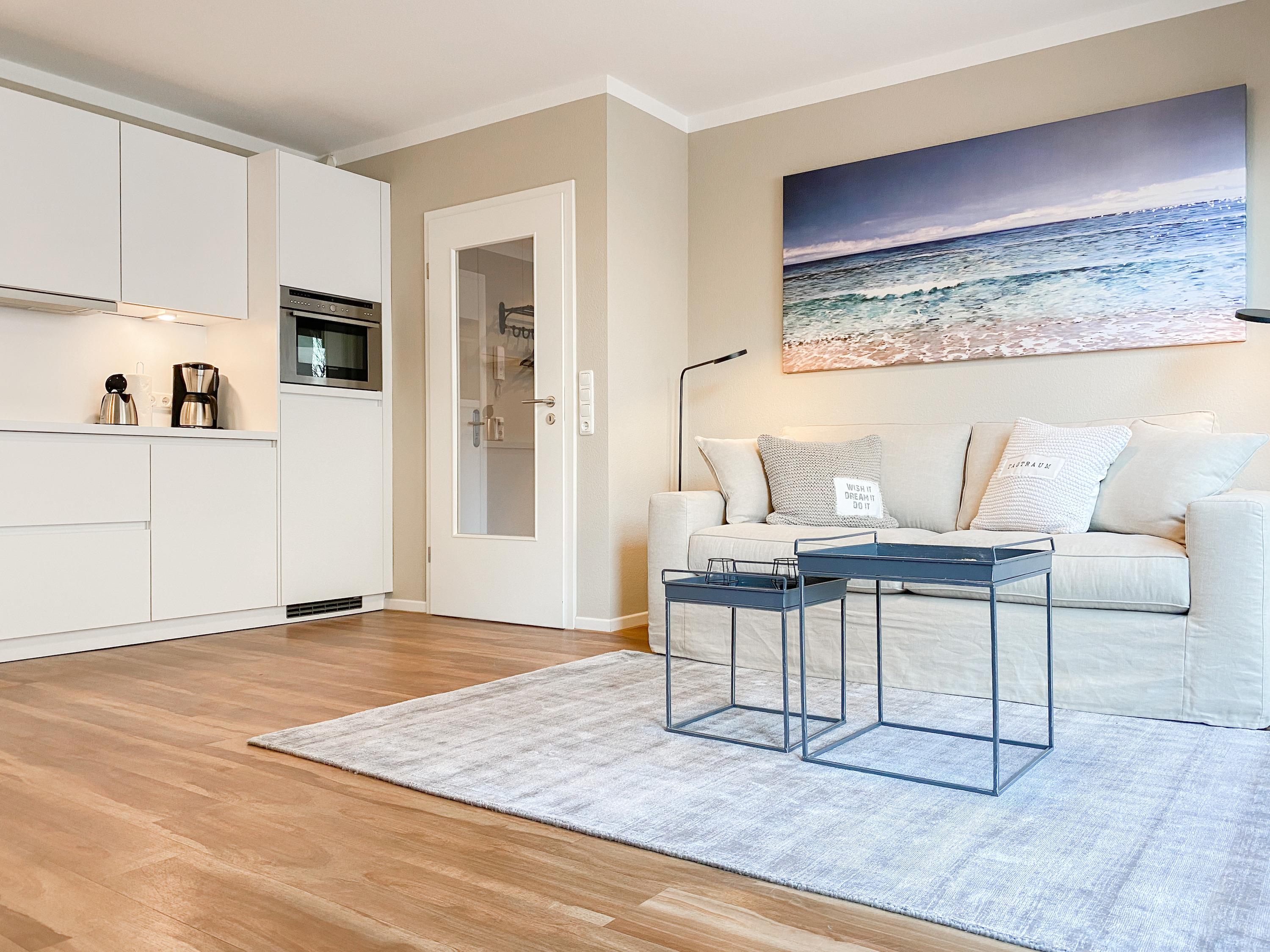 Die Ferienwohnung im 1. Obergeschoss ist hervorragend für[nbsp] 2-3 Personen geeignet und besticht durch ihr durchdachtes Raumkonzept. Es erwartet Sie ein gemütlicher Wohnbereich mit einem hochwertigen Sofa mit Schlaffunktion (140x180), ein anschließender Essbereich für 2 - 3 Personen und eine offene Designküche in bester Ausstattung. Die äußerst hochwertige neue Möblierung im Hampton Style vermittelt Strandflair und lädt zum Wohlfühlen in Strandnähe ein. Der Sonnenbalkon in Südausrichtung ist mit Gartenmöbeln und einer elektrischen Markise ausgestattet. Im Schlafzimmer befindet sich ein hochwertiges Boxspringbett (180x200), ein weiterer TV und die Fenster sind mit Insektenschutz und elektrischen Außenjalousien versehen, sodass ein hoher Schlafkomfort gewährleistet ist. Der Kleiderschrank bietet ausreichend Stauraum für Ihre Urlaubsgarderobe. Das Duschbad verfügt über einen Spiegelschrank mit entsprechender Ablagefläche, einen Handtuchwärmer und Föhn. Ein großer Flatscreen-TV und Radio im Wohnzimmer als auch die kostenlose Nutzung des WLAN gehören zum Entertainmentpaket. Ein fester Parkplatz befindet sich am Haus. Ein Fahrradkeller befindet sich im Untergeschoss und ist über die Treppe im Hausflur zu erreichen. Waschmaschine und Trockner stehen im Keller zur gemeinschaftlichen Nutzung zur Verfügung.