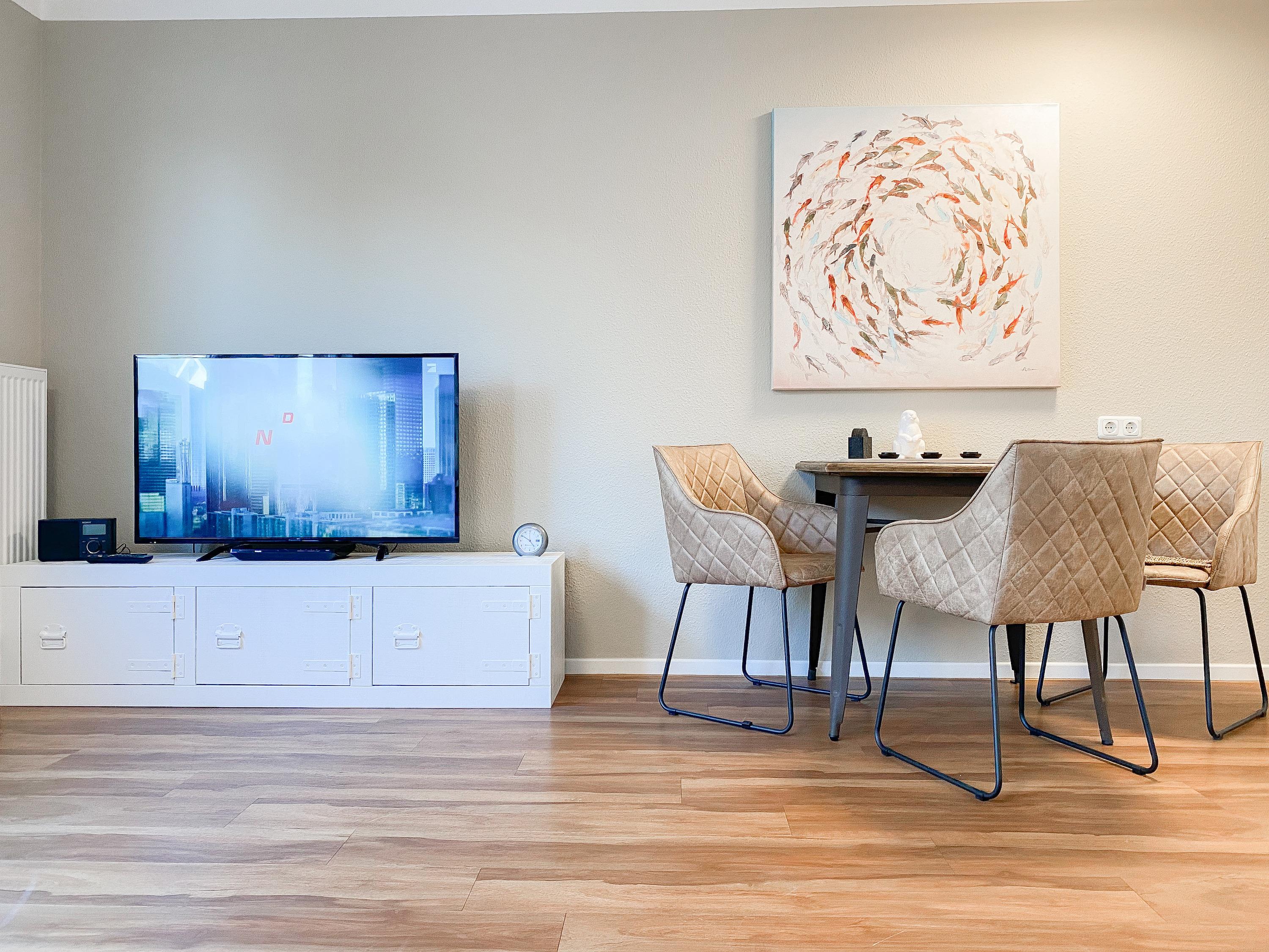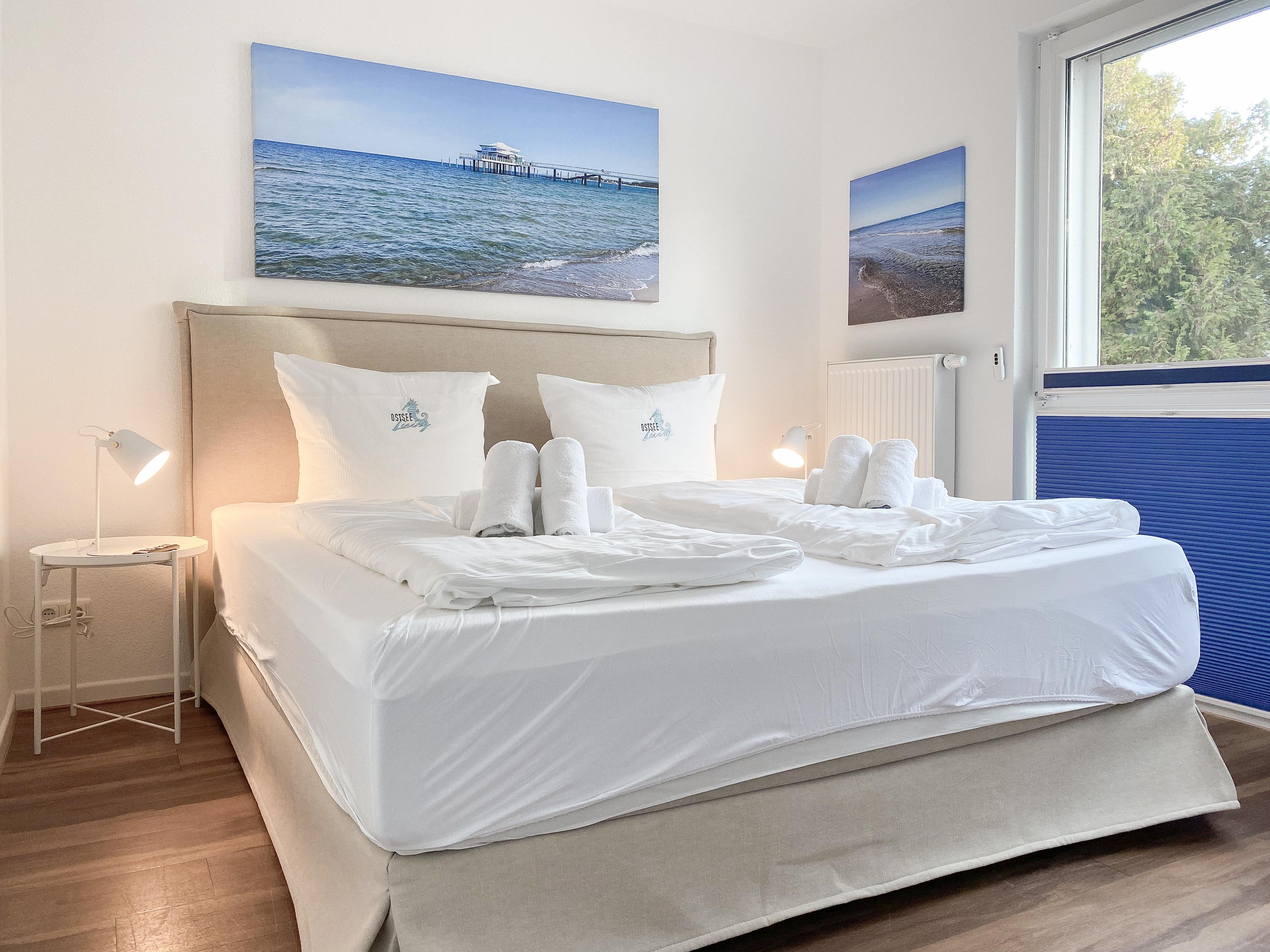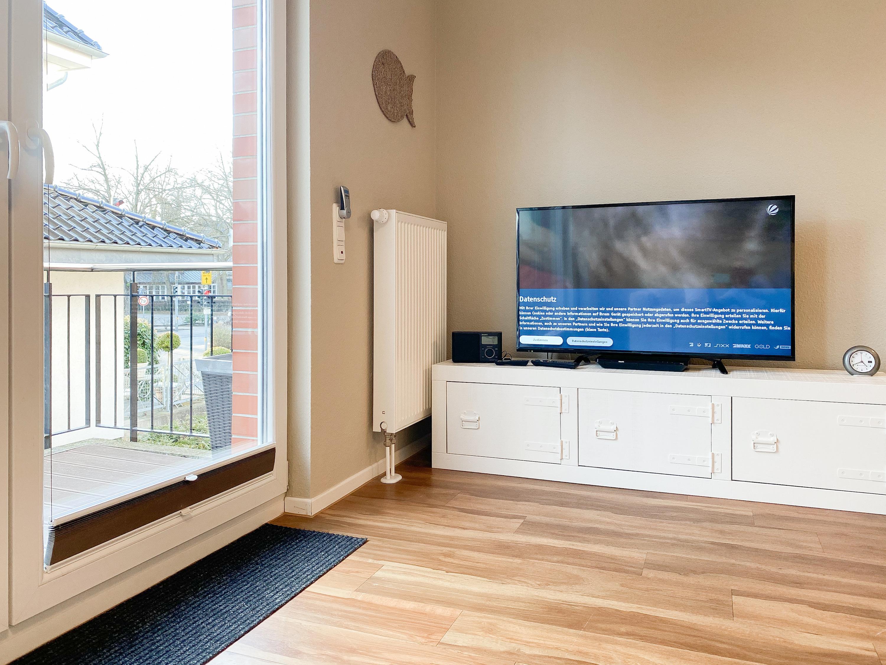 Die Ferienwohnung im 1. Obergeschoss ist hervorragend für[nbsp] 2-3 Personen geeignet und besticht durch ihr durchdachtes Raumkonzept. Es erwartet Sie ein gemütlicher Wohnbereich mit einem hochwertigen Sofa mit Schlaffunktion (140x180), ein anschließender Essbereich für 2 - 3 Personen und eine offene Designküche in bester Ausstattung. Die äußerst hochwertige neue Möblierung im Hampton Style vermittelt Strandflair und lädt zum Wohlfühlen in Strandnähe ein. Der Sonnenbalkon in Südausrichtung ist mit Gartenmöbeln und einer elektrischen Markise ausgestattet. Im Schlafzimmer befindet sich ein hochwertiges Boxspringbett (180x200), ein weiterer TV und die Fenster sind mit Insektenschutz und elektrischen Außenjalousien versehen, sodass ein hoher Schlafkomfort gewährleistet ist. Der Kleiderschrank bietet ausreichend Stauraum für Ihre Urlaubsgarderobe. Das Duschbad verfügt über einen Spiegelschrank mit entsprechender Ablagefläche, einen Handtuchwärmer und Föhn. Ein großer Flatscreen-TV und Radio im Wohnzimmer als auch die kostenlose Nutzung des WLAN gehören zum Entertainmentpaket. Ein fester Parkplatz befindet sich am Haus. Ein Fahrradkeller befindet sich im Untergeschoss und ist über die Treppe im Hausflur zu erreichen. Waschmaschine und Trockner stehen im Keller zur gemeinschaftlichen Nutzung zur Verfügung.