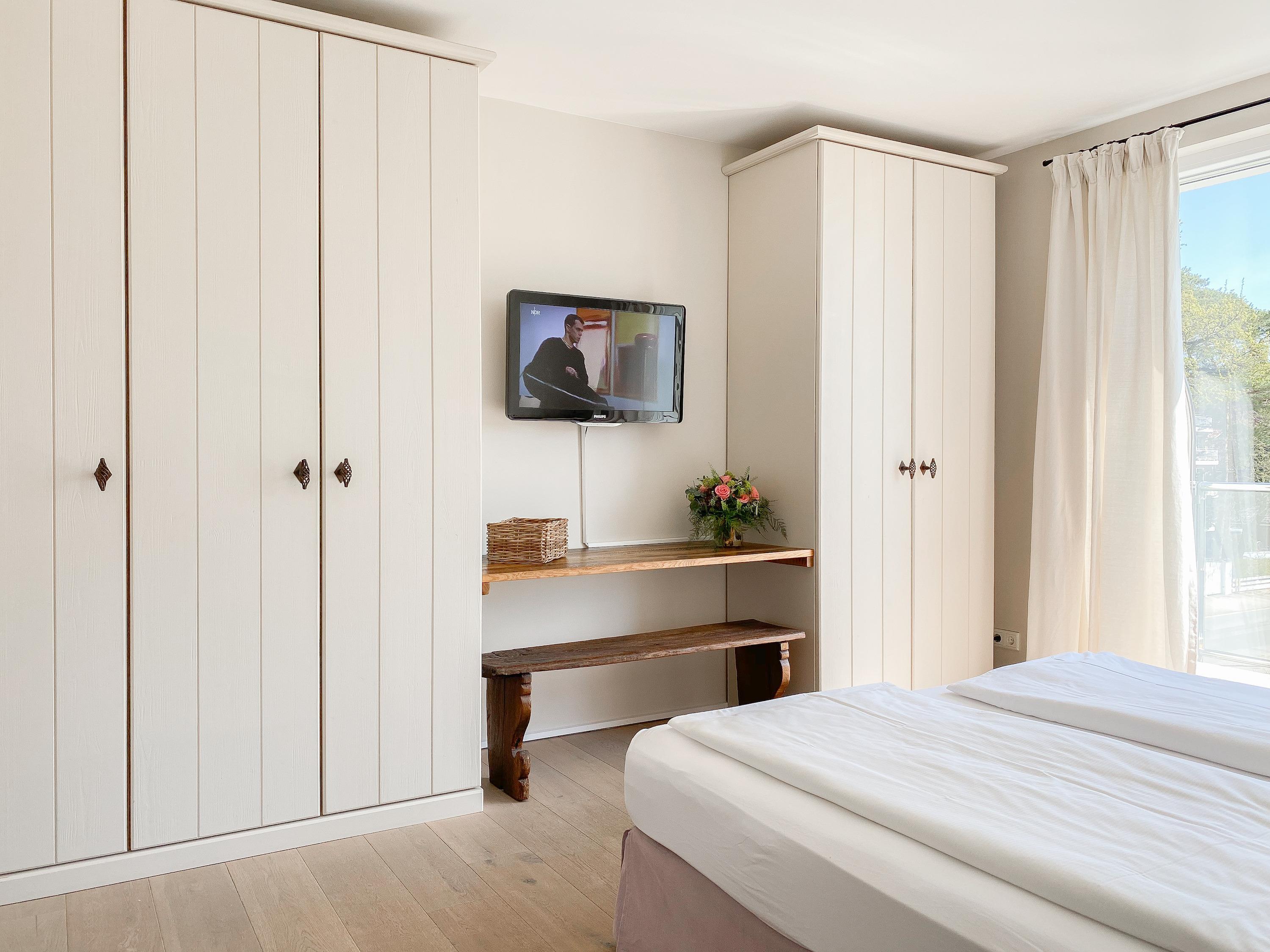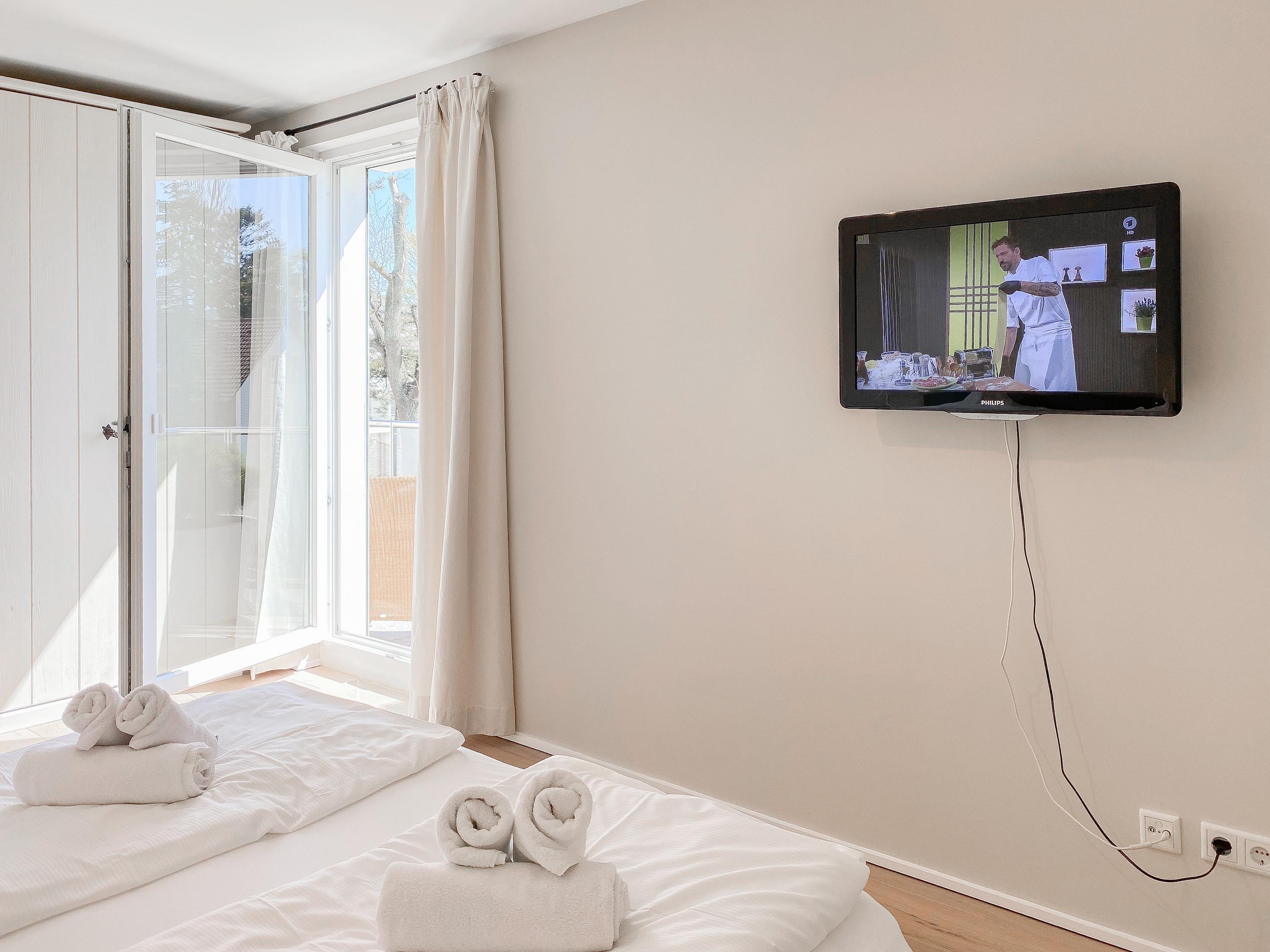 Die Wohnung bietet zeitgemäßen Luxus auf 106 qm Wohnfläche im 2. Obergeschoss des Hauses Timmare I. Mit zwei separaten Schlafzimmern mit Doppelbetten (jeweils 180x200), elektrischen Außenjalousien und TV sowie zwei separaten, hochwertigen Bädern, eines ist mit einer geräumigen Dusche, das andere mit einer großen Badewanne, finden hier 4 Personen reichlich Platz zum Entfalten. Das geschmackvoll gestaltete Wohnzimmer mit Sylter Flair ist mit 2 gemütlichen Sofas, TV, Stereoanlage und kostenlosem Internetzugang über WLAN ausgestattet. Der integrierte Küchenbereich mit einem großen freistehenden Küchenblock zum Essen bilden das Herzstück der Ferienwohnung. Bei der Ausstattung und Einrichtung des Objektes wurde sehr viel Wert auf hochwertige Materialen gelegt. Zwei großzügige Balkone sorgen vom Frühstück bis in die Abendstunden für schöne, sonnige Aussichten.