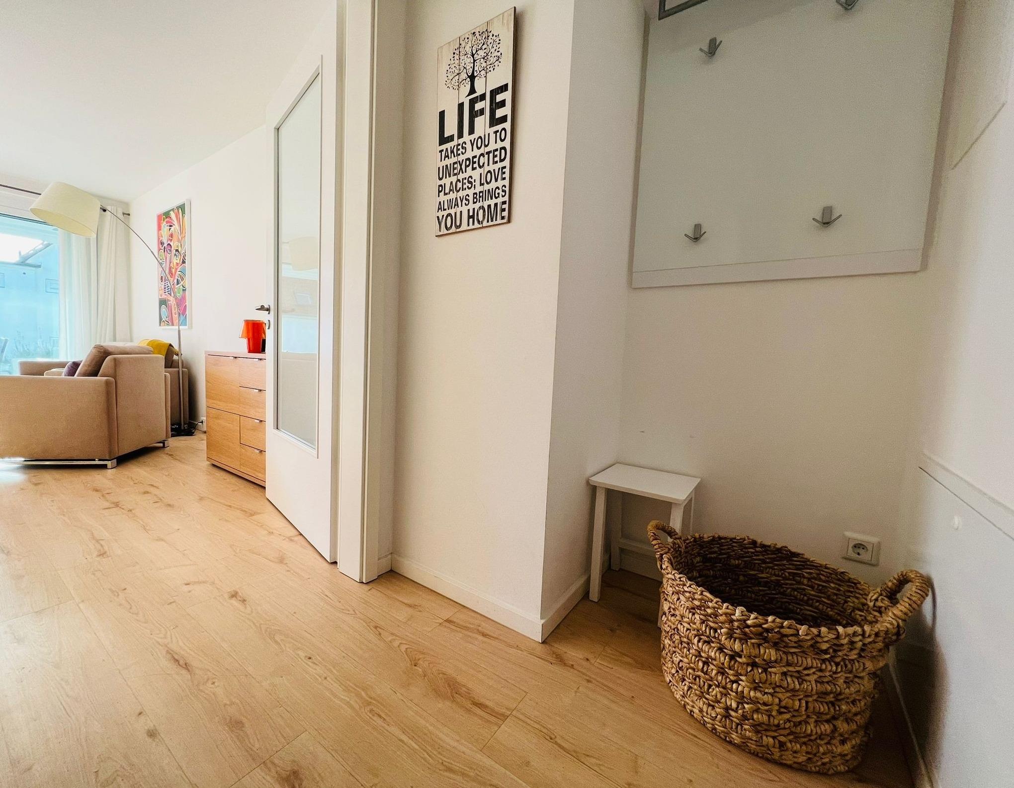 Moderne Ferienwohnung am Timmendorfer Strand mit Terrasse, Strandkorb und hochwertiger Ausstattung für erholsame Tage.