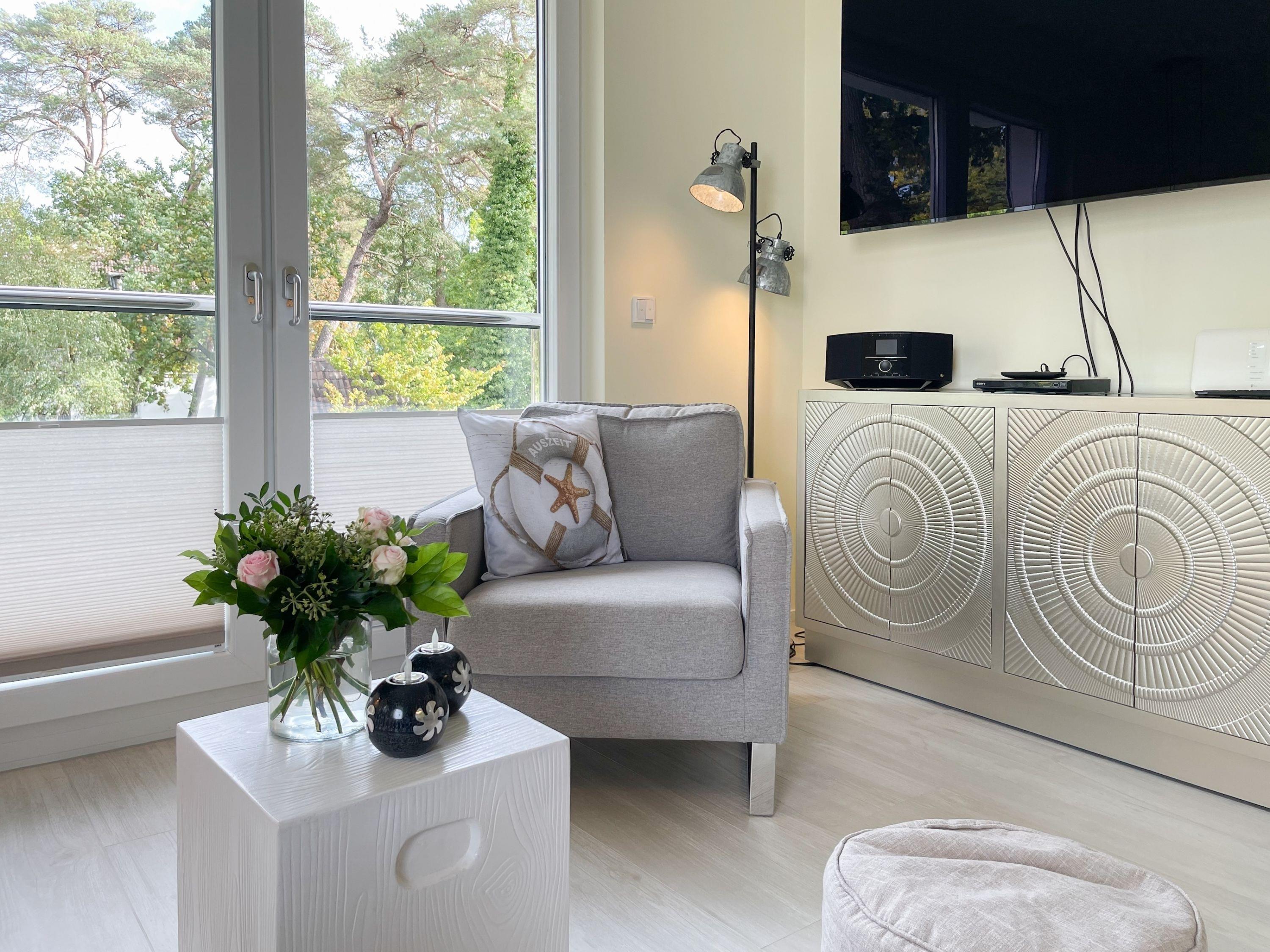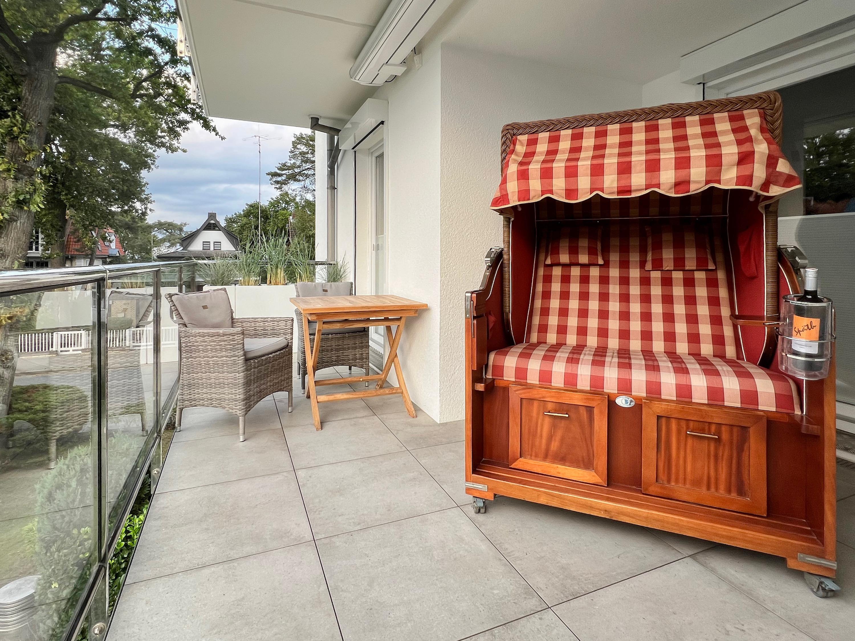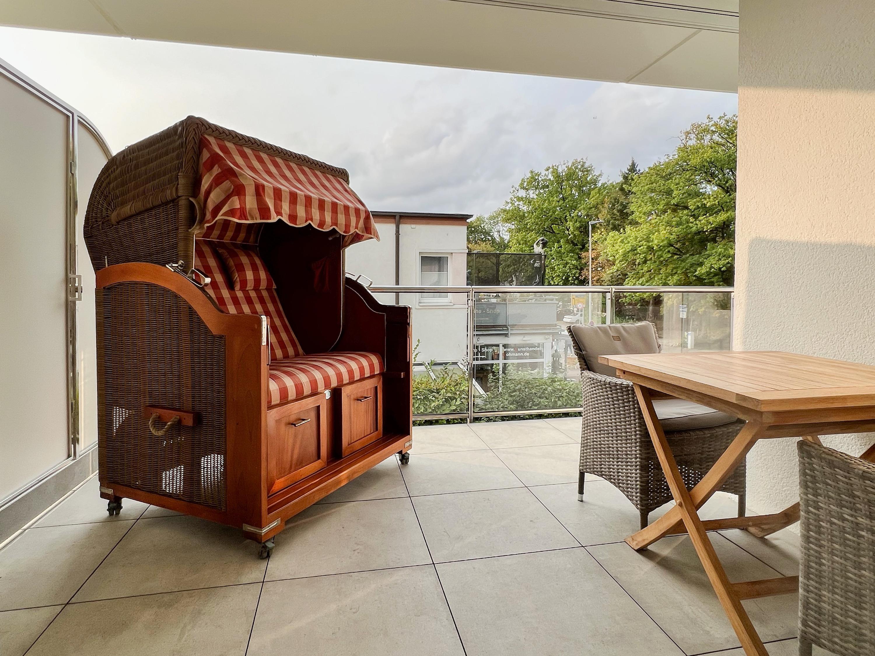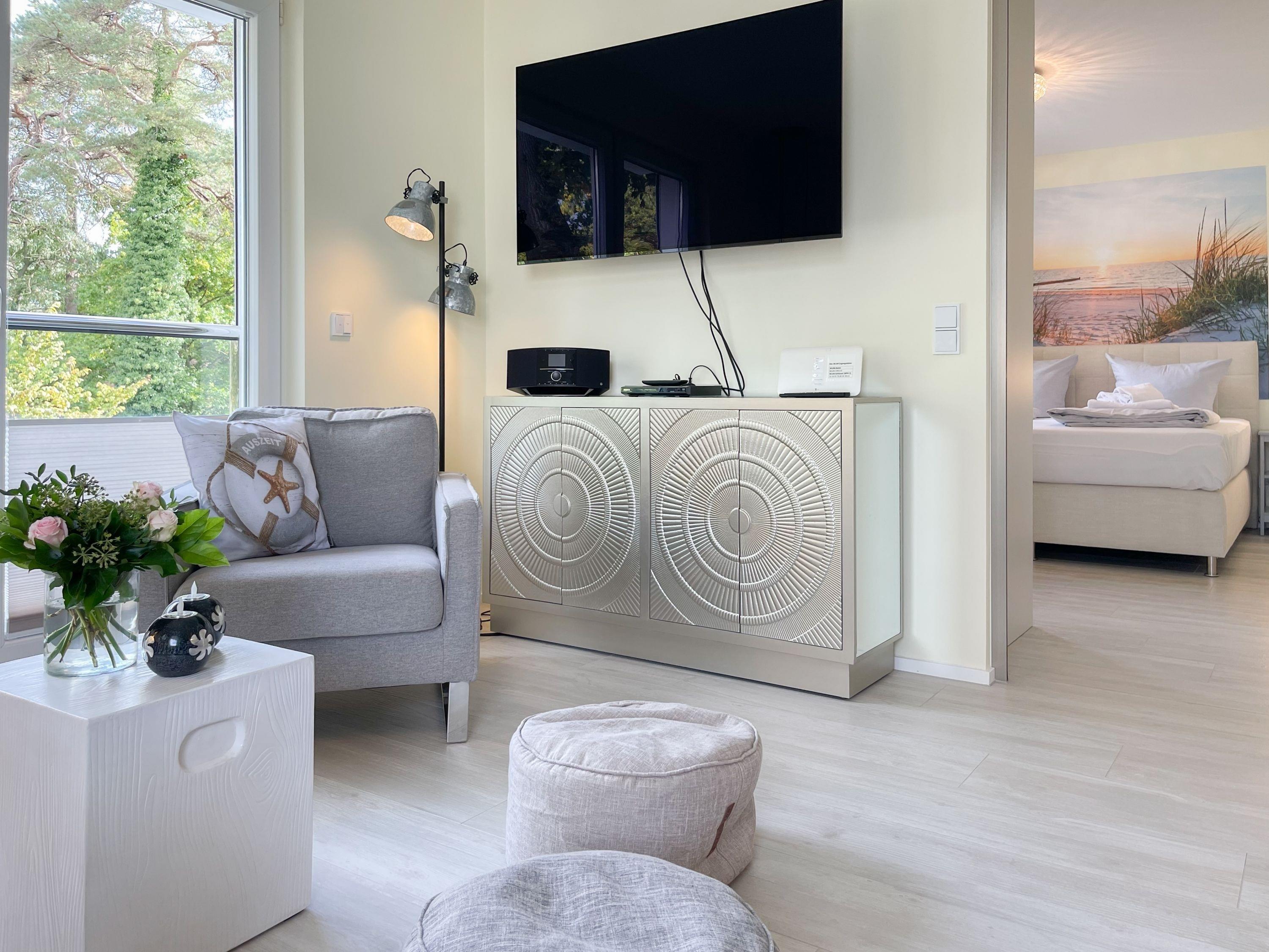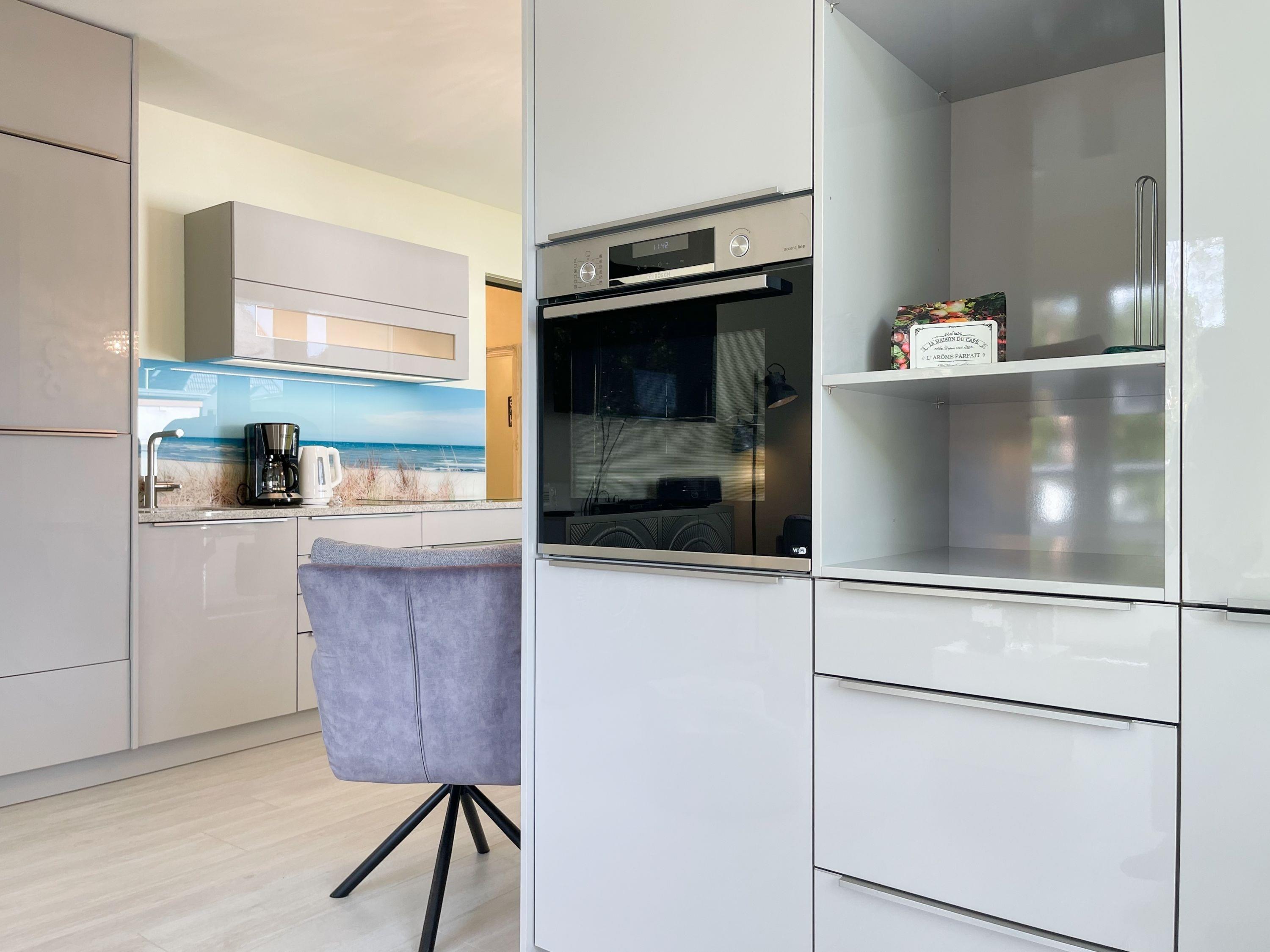 Es erwartet Sie ein heller Wohnbereich zur Seeseite, der mit einem bequemen Boxspring-Sofa mit Schlaffunktion, Smart TV und einem gemütlichen Cocktail-Sessel eingerichtet ist. Genießen Sie den schönen Ausblick bis auf die Ostsee, die durch die Bäume blitzt. Die hochwertige Küche in perfekter Ausstattung läßt definitiv keine Wünsche offen. Das Bora-Kochfeld sorgt für geruchs- und dunstfreies Kochvergnügen und die Kühl-Gefrierkombination bietet ausreichend Platz für Ihre Leckereien. Umluftbackofen und Geschirrspüler befinden sich angenehm auf Armhöhe. Der anschließende Essbereich mit gemütlichen Sesseln bietet ausreichend Raum für gemeinsame Mahlzeiten. Ein Highlight ist der 14 qm große Balkon mit windgeschützter Loggia in Nordwestausrichtung, der sowohl vom Wohnbereich als auch von der Küche zu betreten ist. Ein Strandkorb und Gartenmöbel laden nach einem ereignisreichen Urlaubstag zum Entspannen ein. Genießen Sie die Nachmittagssonne bis zum Sonnenuntergang mit schönem Blick teilweise bis zur Ostsee. Das Schlafzimmer verfügt über ein Boxspringbett (180x200), einen Kleiderschrank mit reichlich Stauraum und Smart TV. Das neue Luxusbad bietet Ihnen eine Waschtischanlage mit 2 Waschplätzen und die großzügige Dusche verfügt über einen Regen- und eine verstellbare Funktions-Handbrause. Direkt am Eingang der Dusche ist ein Handtuchwärmer angebracht, der für kuschelig warme Badetücher sorgt. Eine Waschmaschine ist ebenfalls im Bad untergebracht.