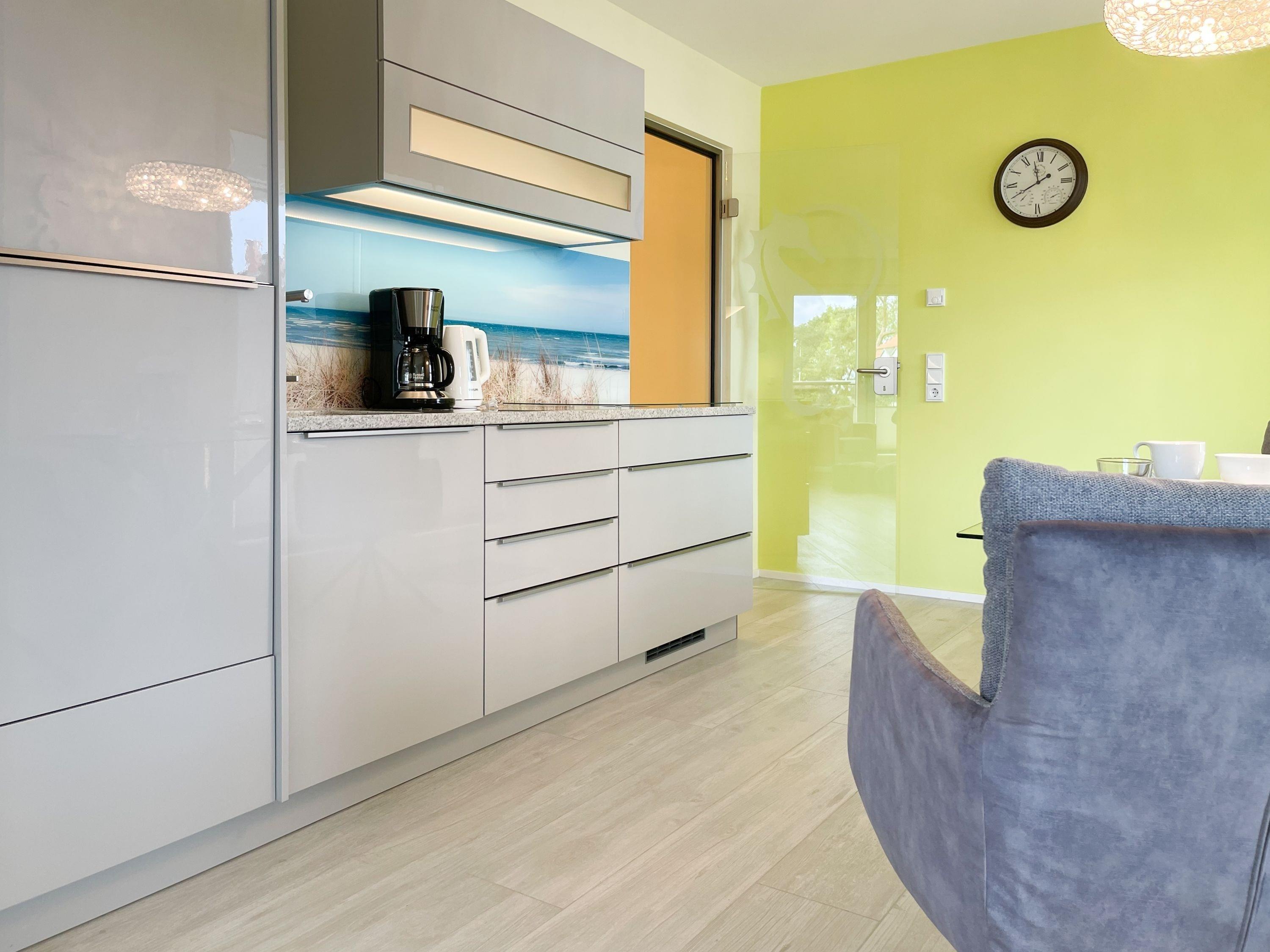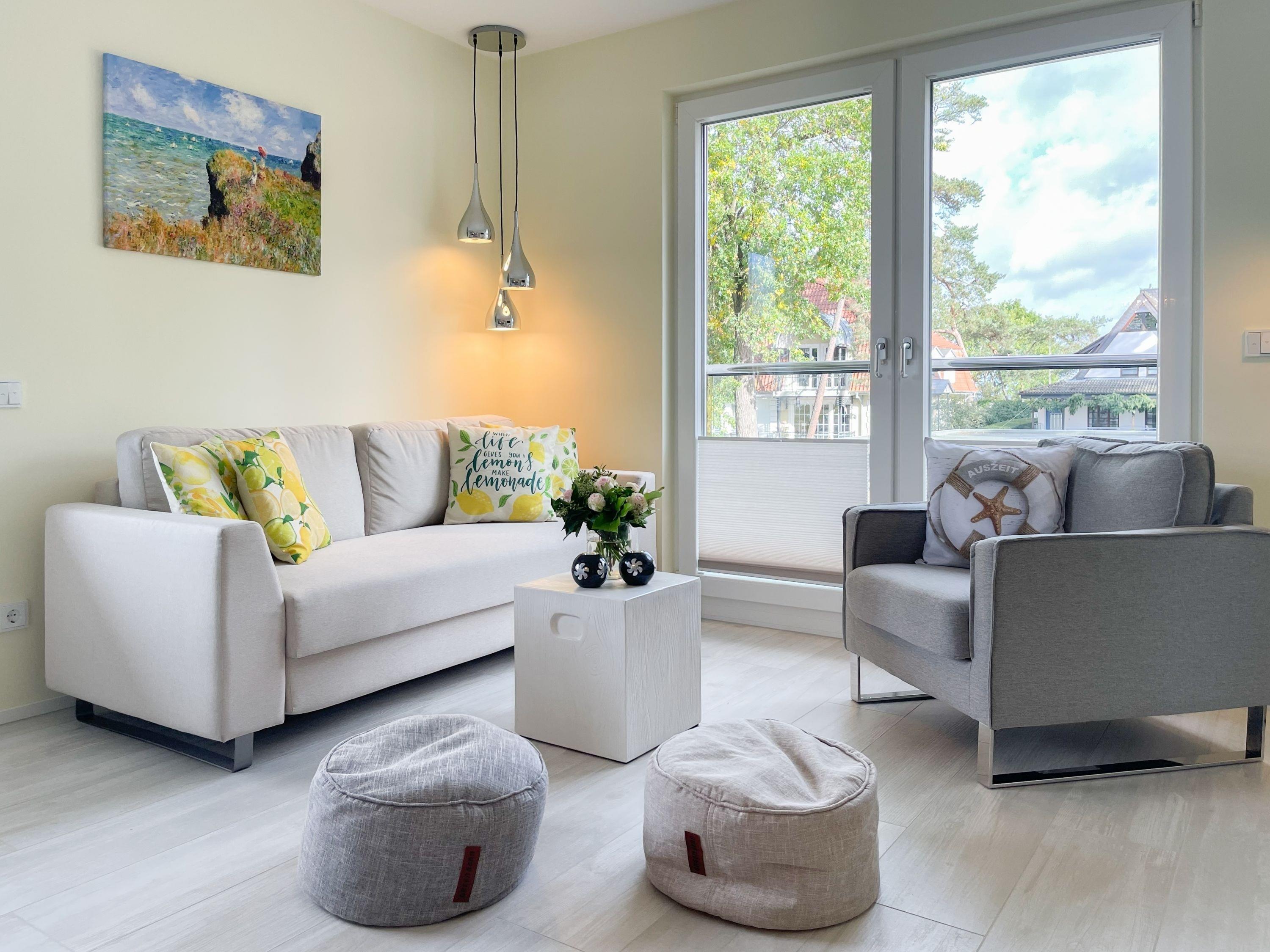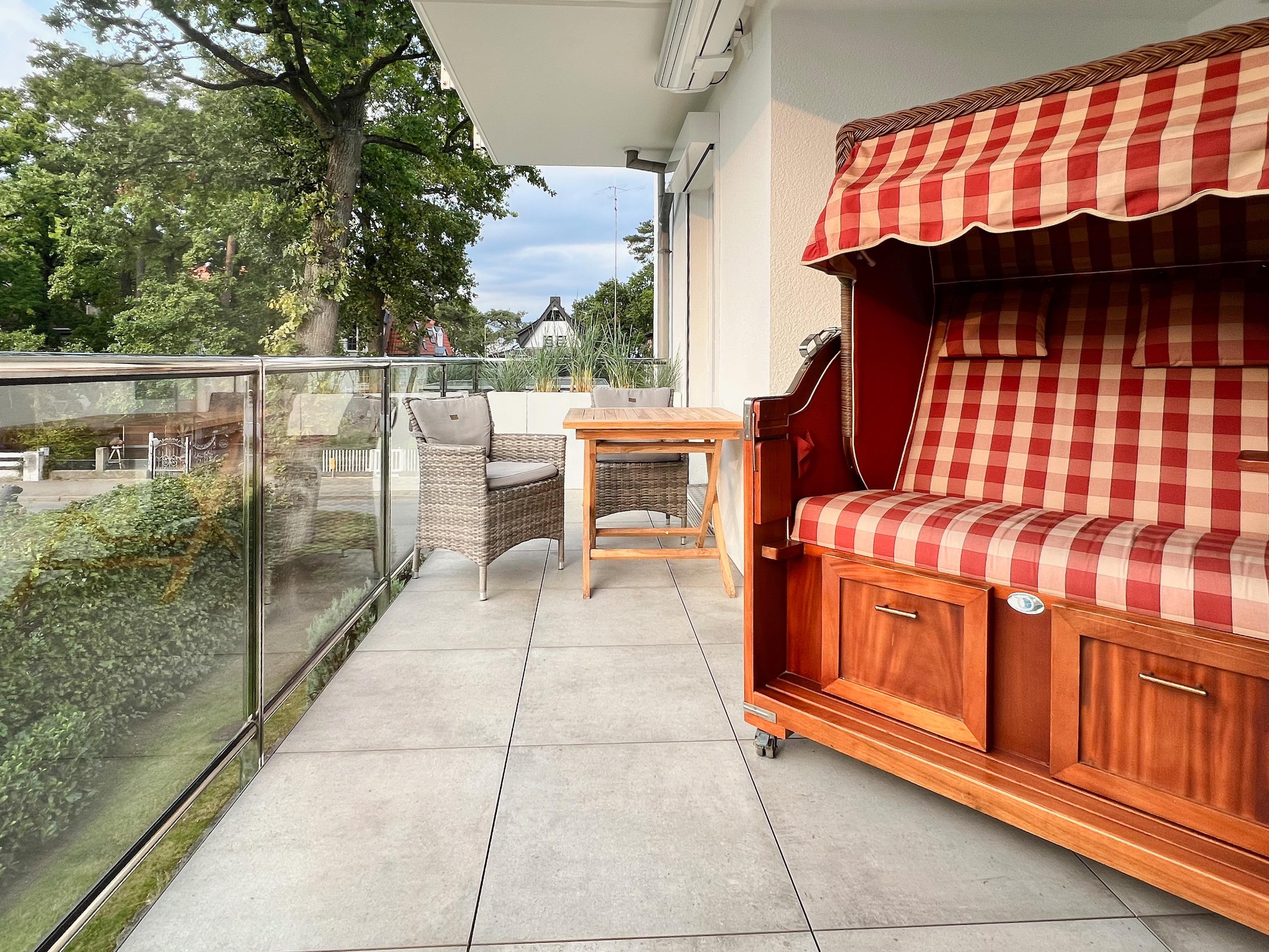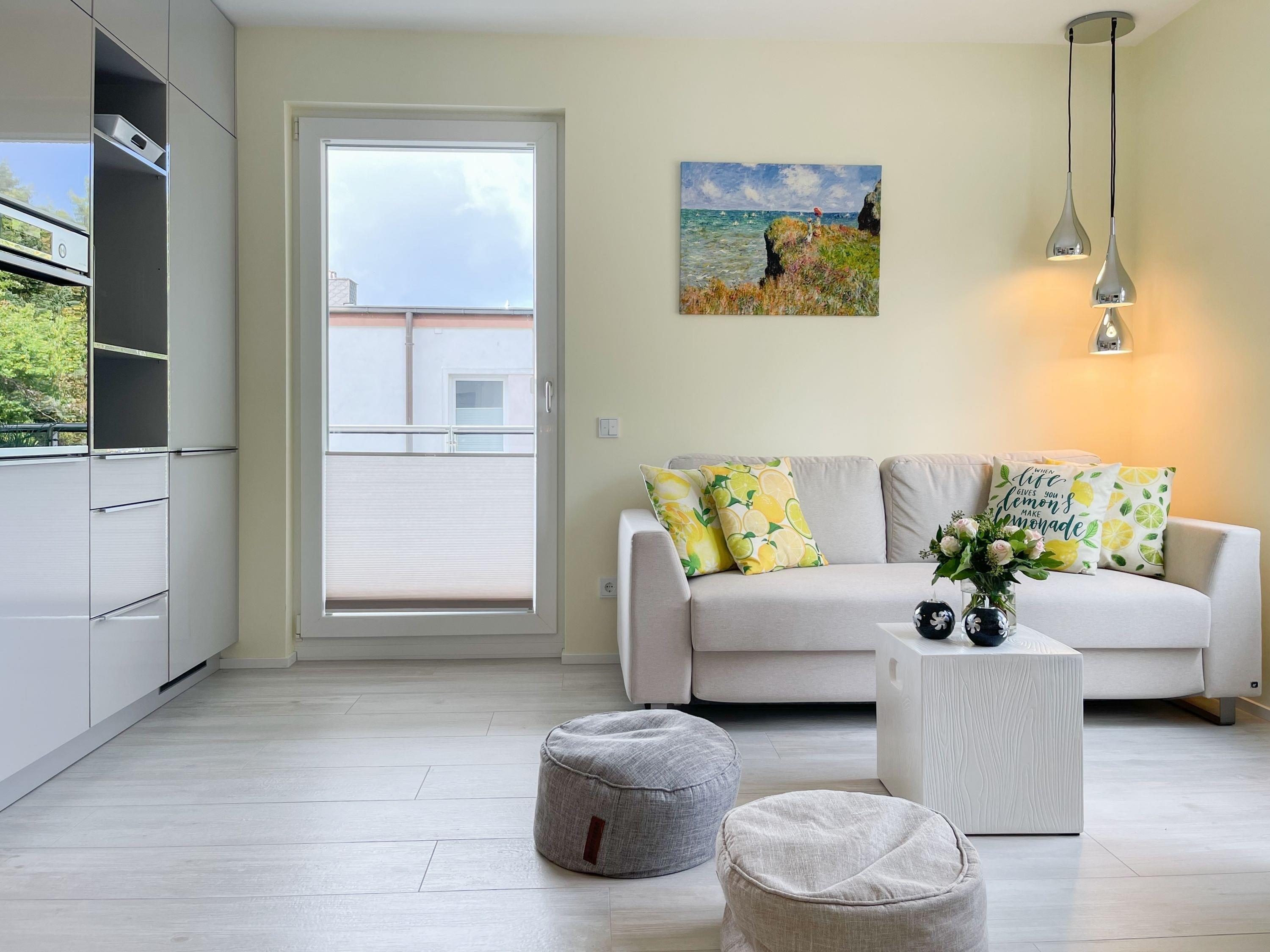 Es erwartet Sie ein heller Wohnbereich zur Seeseite, der mit einem bequemen Boxspring-Sofa mit Schlaffunktion, Smart TV und einem gemütlichen Cocktail-Sessel eingerichtet ist. Genießen Sie den schönen Ausblick bis auf die Ostsee, die durch die Bäume blitzt. Die hochwertige Küche in perfekter Ausstattung läßt definitiv keine Wünsche offen. Das Bora-Kochfeld sorgt für geruchs- und dunstfreies Kochvergnügen und die Kühl-Gefrierkombination bietet ausreichend Platz für Ihre Leckereien. Umluftbackofen und Geschirrspüler befinden sich angenehm auf Armhöhe. Der anschließende Essbereich mit gemütlichen Sesseln bietet ausreichend Raum für gemeinsame Mahlzeiten. Ein Highlight ist der 14 qm große Balkon mit windgeschützter Loggia in Nordwestausrichtung, der sowohl vom Wohnbereich als auch von der Küche zu betreten ist. Ein Strandkorb und Gartenmöbel laden nach einem ereignisreichen Urlaubstag zum Entspannen ein. Genießen Sie die Nachmittagssonne bis zum Sonnenuntergang mit schönem Blick teilweise bis zur Ostsee. Das Schlafzimmer verfügt über ein Boxspringbett (180x200), einen Kleiderschrank mit reichlich Stauraum und Smart TV. Das neue Luxusbad bietet Ihnen eine Waschtischanlage mit 2 Waschplätzen und die großzügige Dusche verfügt über einen Regen- und eine verstellbare Funktions-Handbrause. Direkt am Eingang der Dusche ist ein Handtuchwärmer angebracht, der für kuschelig warme Badetücher sorgt. Eine Waschmaschine ist ebenfalls im Bad untergebracht.
