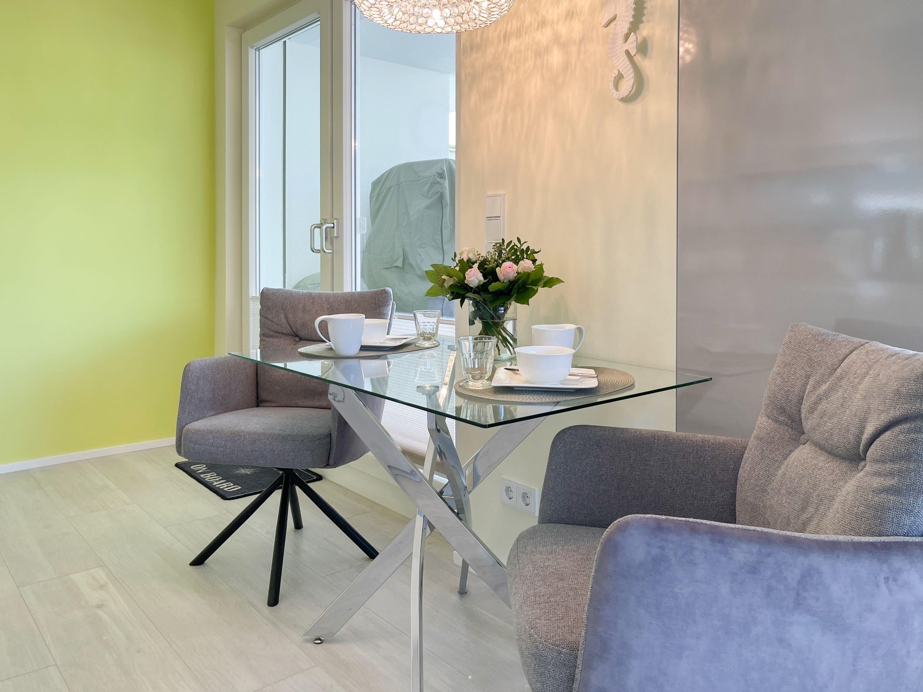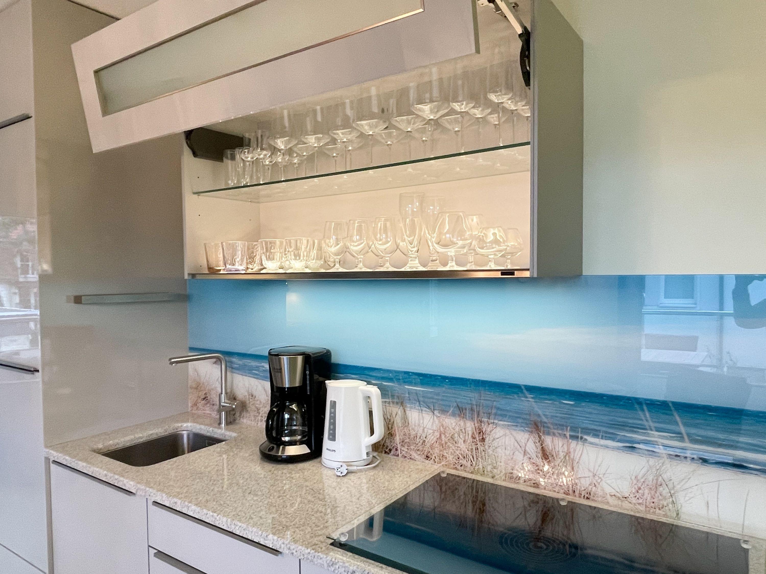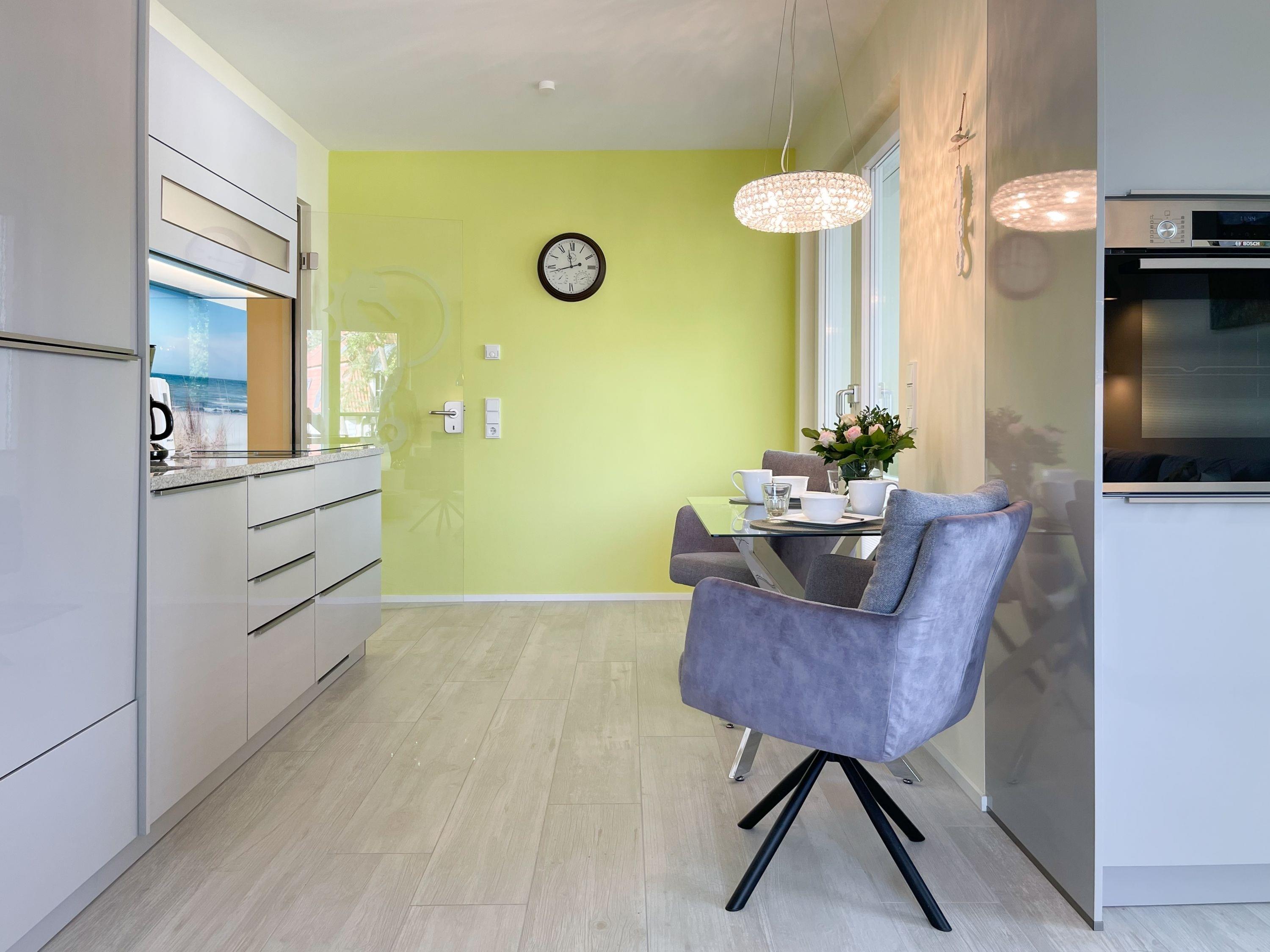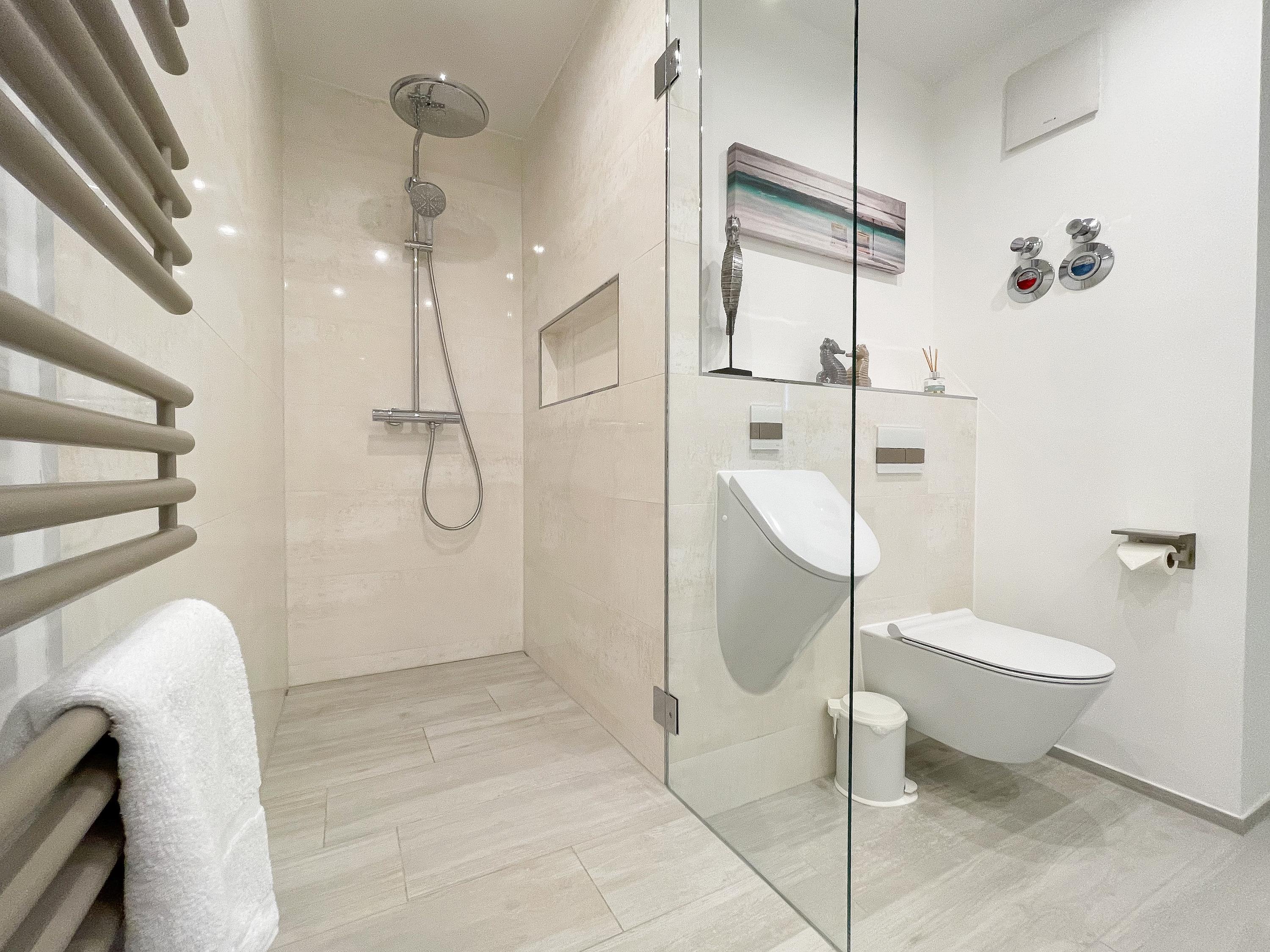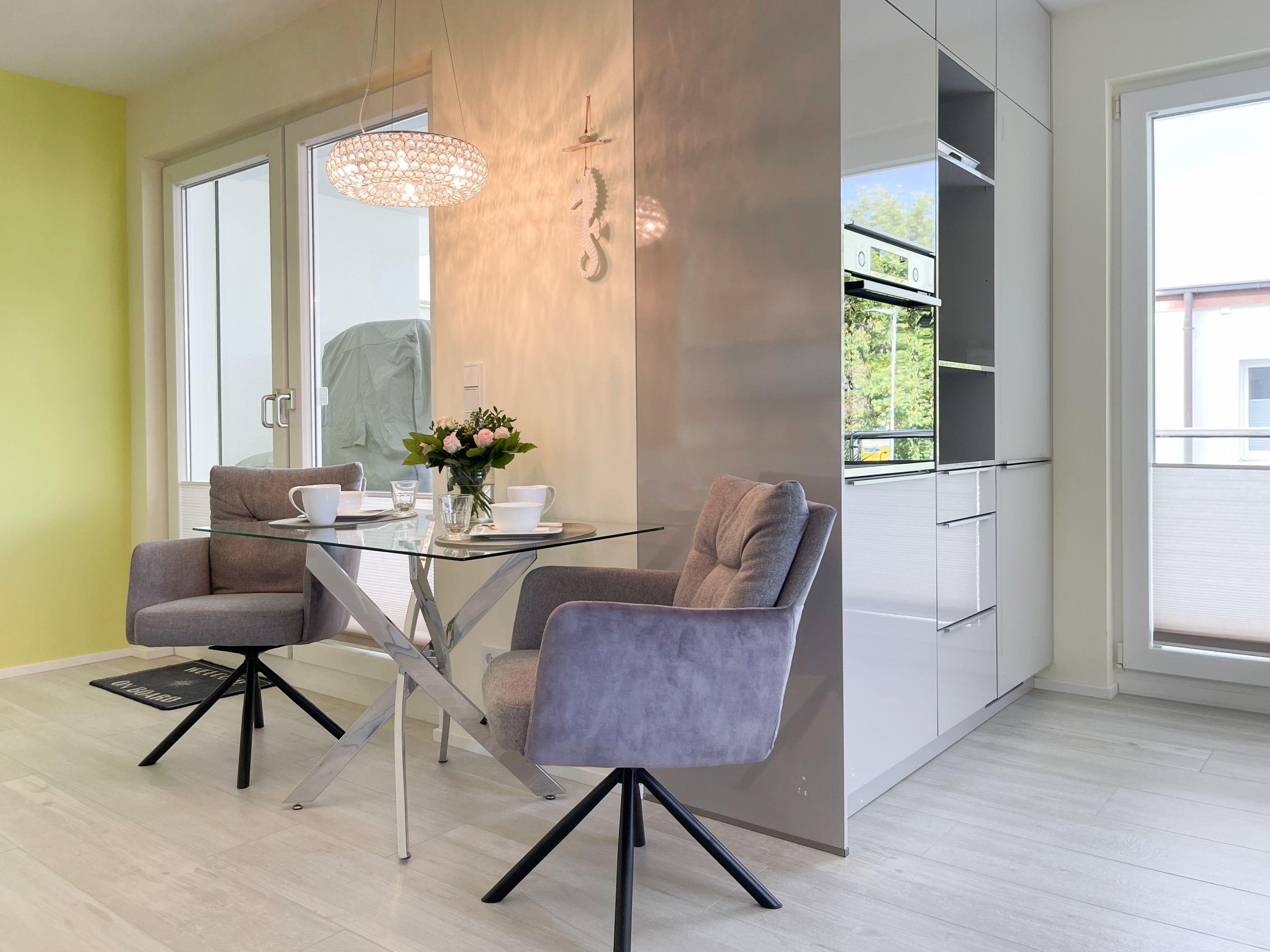 Es erwartet Sie ein heller Wohnbereich zur Seeseite, der mit einem bequemen Boxspring-Sofa mit Schlaffunktion, Smart TV und einem gemütlichen Cocktail-Sessel eingerichtet ist. Genießen Sie den schönen Ausblick bis auf die Ostsee, die durch die Bäume blitzt. Die hochwertige Küche in perfekter Ausstattung läßt definitiv keine Wünsche offen. Das Bora-Kochfeld sorgt für geruchs- und dunstfreies Kochvergnügen und die Kühl-Gefrierkombination bietet ausreichend Platz für Ihre Leckereien. Umluftbackofen und Geschirrspüler befinden sich angenehm auf Armhöhe. Der anschließende Essbereich mit gemütlichen Sesseln bietet ausreichend Raum für gemeinsame Mahlzeiten. Ein Highlight ist der 14 qm große Balkon mit windgeschützter Loggia in Nordwestausrichtung, der sowohl vom Wohnbereich als auch von der Küche zu betreten ist. Ein Strandkorb und Gartenmöbel laden nach einem ereignisreichen Urlaubstag zum Entspannen ein. Genießen Sie die Nachmittagssonne bis zum Sonnenuntergang mit schönem Blick teilweise bis zur Ostsee. Das Schlafzimmer verfügt über ein Boxspringbett (180x200), einen Kleiderschrank mit reichlich Stauraum und Smart TV. Das neue Luxusbad bietet Ihnen eine Waschtischanlage mit 2 Waschplätzen und die großzügige Dusche verfügt über einen Regen- und eine verstellbare Funktions-Handbrause. Direkt am Eingang der Dusche ist ein Handtuchwärmer angebracht, der für kuschelig warme Badetücher sorgt. Eine Waschmaschine ist ebenfalls im Bad untergebracht.