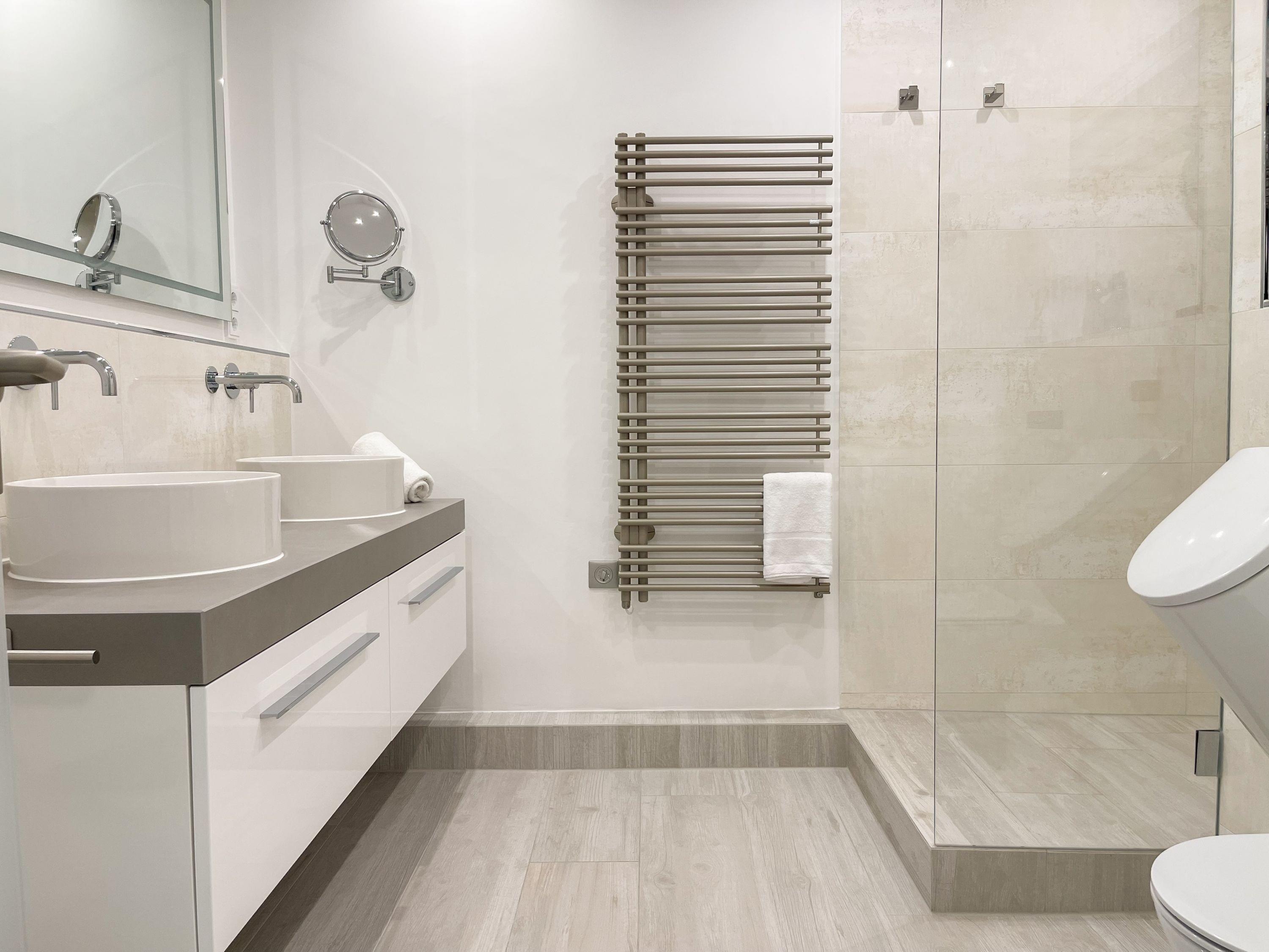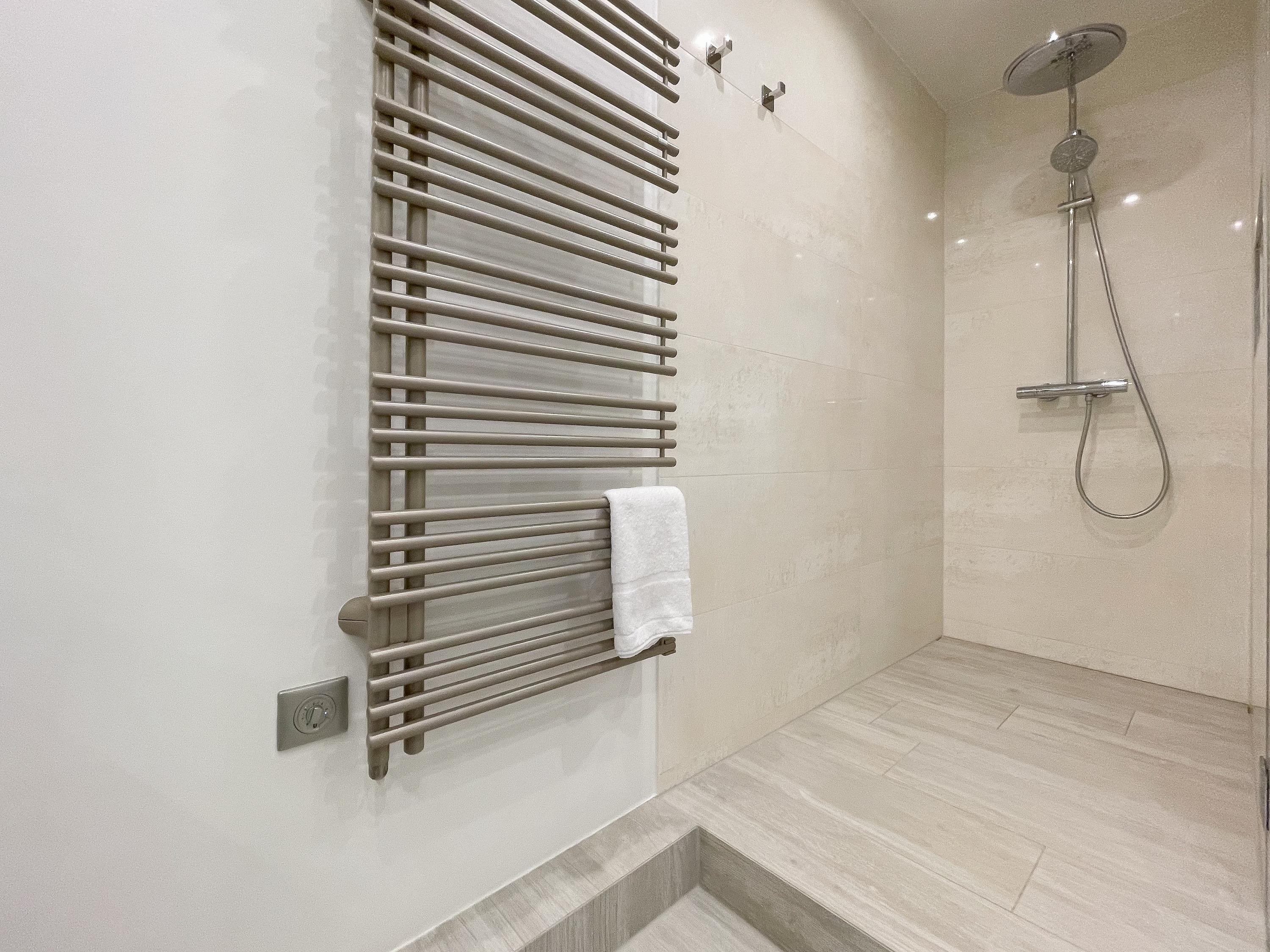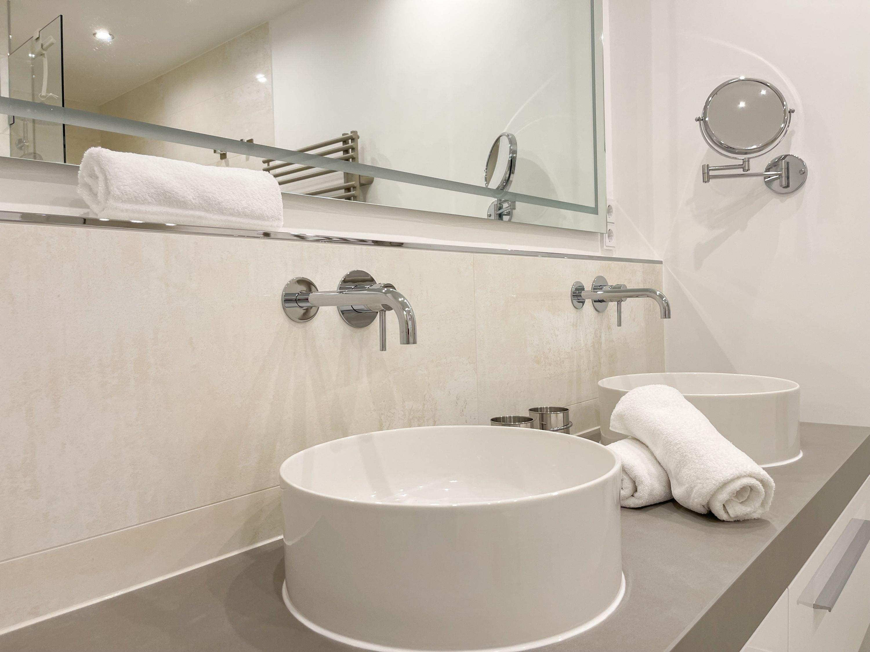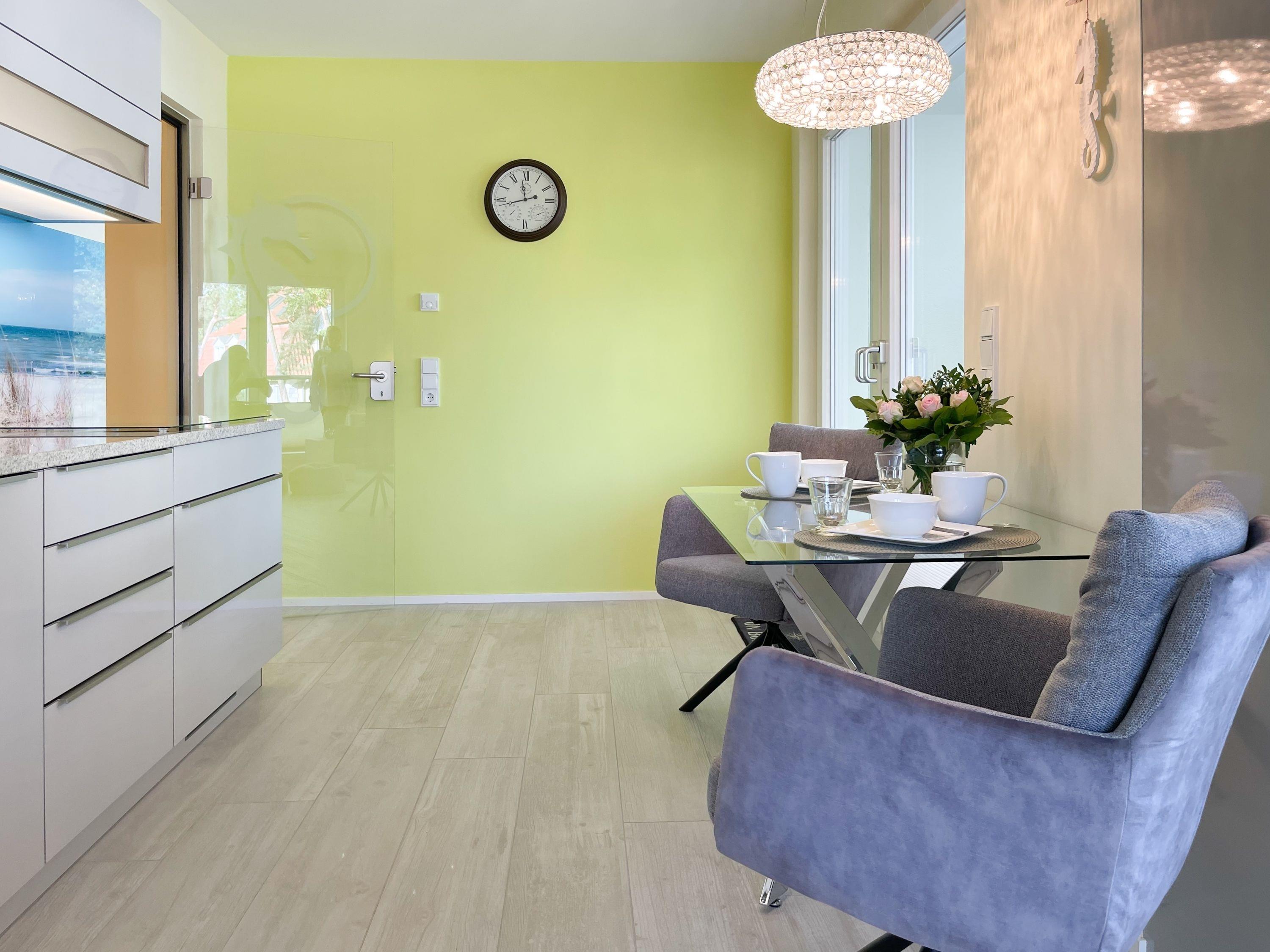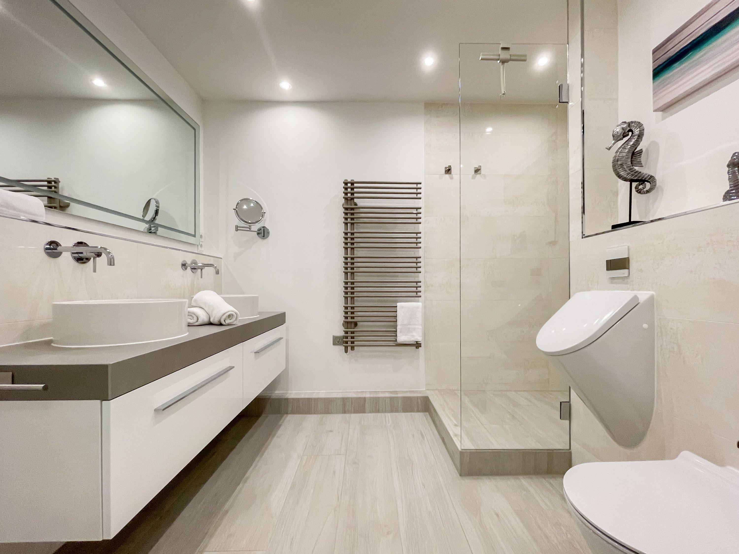 Es erwartet Sie ein heller Wohnbereich zur Seeseite, der mit einem bequemen Boxspring-Sofa mit Schlaffunktion, Smart TV und einem gemütlichen Cocktail-Sessel eingerichtet ist. Genießen Sie den schönen Ausblick bis auf die Ostsee, die durch die Bäume blitzt. Die hochwertige Küche in perfekter Ausstattung läßt definitiv keine Wünsche offen. Das Bora-Kochfeld sorgt für geruchs- und dunstfreies Kochvergnügen und die Kühl-Gefrierkombination bietet ausreichend Platz für Ihre Leckereien. Umluftbackofen und Geschirrspüler befinden sich angenehm auf Armhöhe. Der anschließende Essbereich mit gemütlichen Sesseln bietet ausreichend Raum für gemeinsame Mahlzeiten. Ein Highlight ist der 14 qm große Balkon mit windgeschützter Loggia in Nordwestausrichtung, der sowohl vom Wohnbereich als auch von der Küche zu betreten ist. Ein Strandkorb und Gartenmöbel laden nach einem ereignisreichen Urlaubstag zum Entspannen ein. Genießen Sie die Nachmittagssonne bis zum Sonnenuntergang mit schönem Blick teilweise bis zur Ostsee. Das Schlafzimmer verfügt über ein Boxspringbett (180x200), einen Kleiderschrank mit reichlich Stauraum und Smart TV. Das neue Luxusbad bietet Ihnen eine Waschtischanlage mit 2 Waschplätzen und die großzügige Dusche verfügt über einen Regen- und eine verstellbare Funktions-Handbrause. Direkt am Eingang der Dusche ist ein Handtuchwärmer angebracht, der für kuschelig warme Badetücher sorgt. Eine Waschmaschine ist ebenfalls im Bad untergebracht.