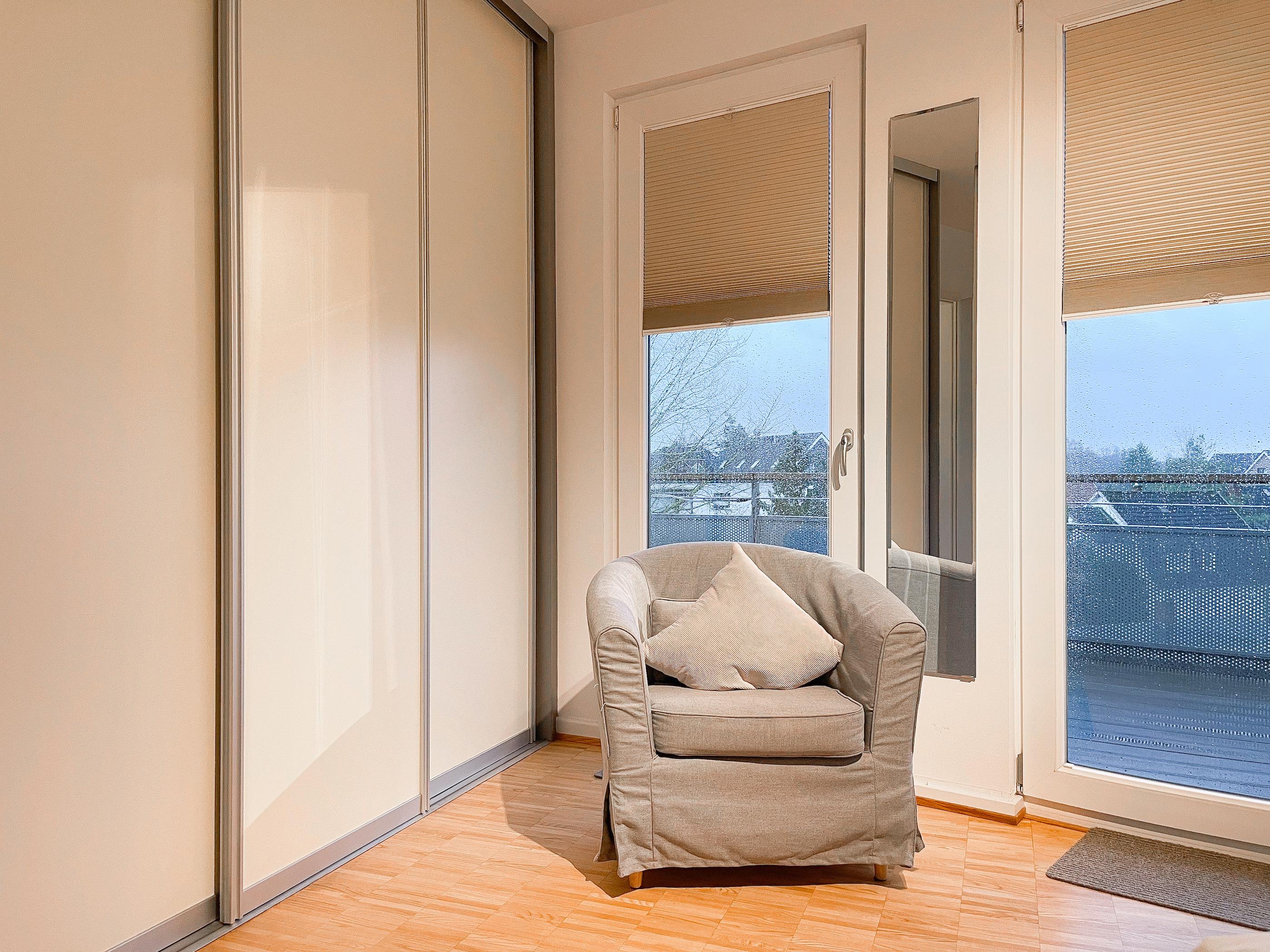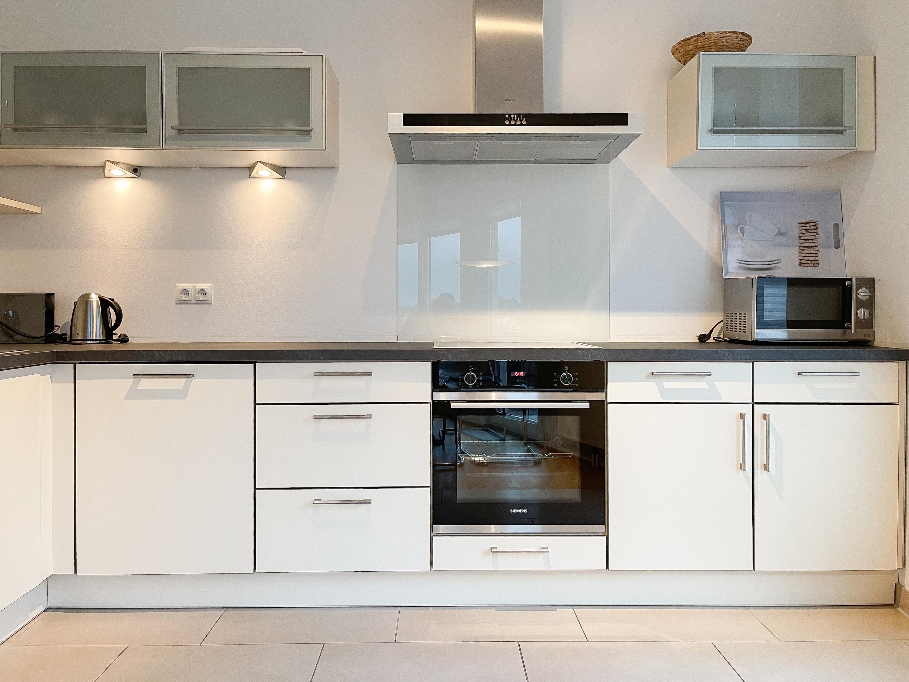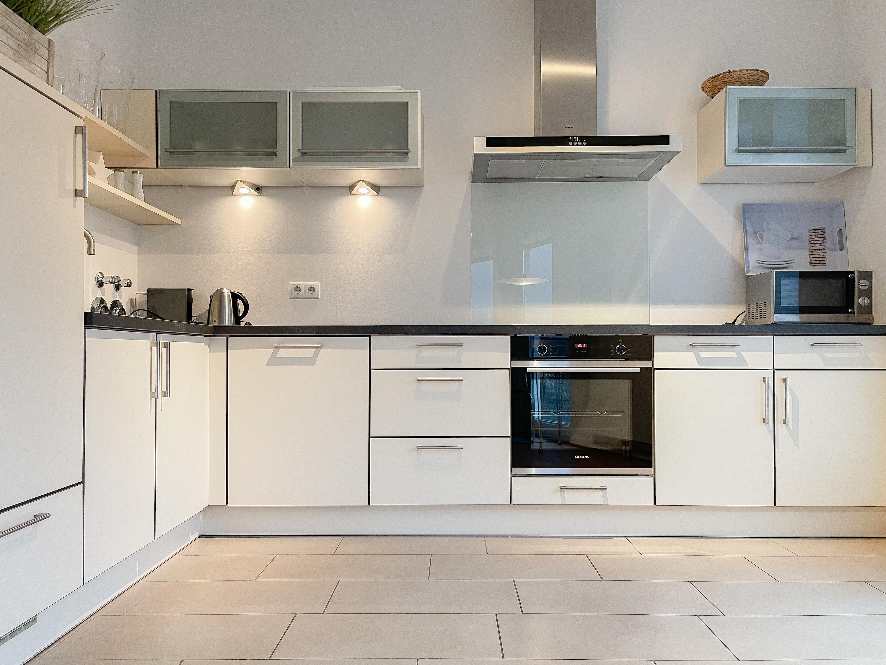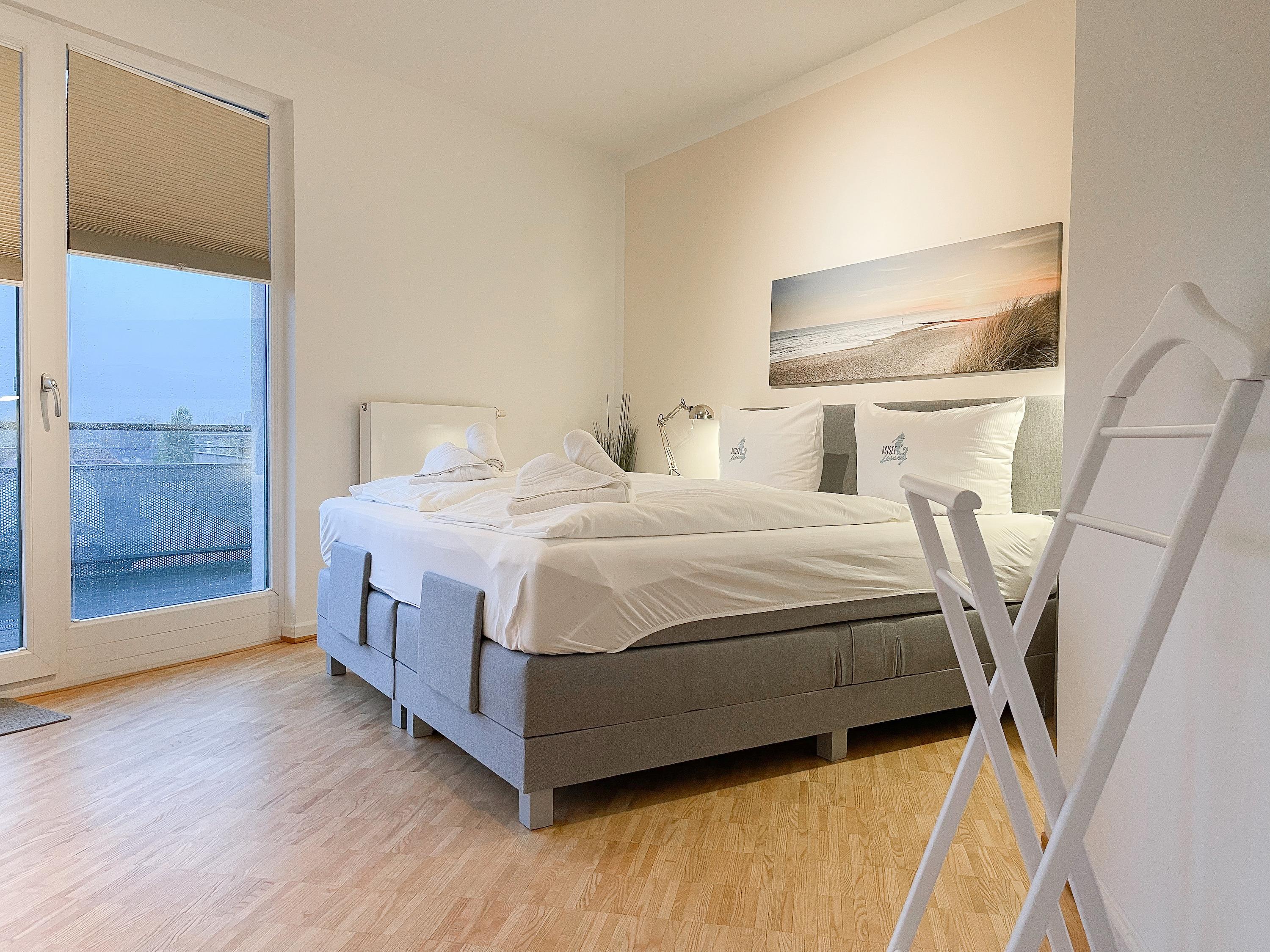 Es erwartet Sie ein heller, geschmackvoll gestalteter Wohnraum mit integriertem Schlafsofa (140x200), TV und kostenlosem Internetzugang über WLAN/LAN sowie die moderne, offene Einbauküche, bestens ausgestattet mit Kochfeld, Backofen, Mikrowelle und Geschirrspüler. Im großen Schlafraum mit Doppelbett (180x200) [nbsp]befindet sich ein hochwertiger Einbauschrank mit ausreichend Staufläche. Die Fenster sind mit Verdunkelungsplissees versehen. Im modernen Duschbad ist zusätzlich eine Waschmaschine integriert. Der gesamte Wohn- und Schlafbereich ist mit Echtholzparkett ausgestattet. Große, bodentiefe Fensterelemente im gesamten Penthouse, alle mit maßgeschneiderten Plissees versehen, geben viel Licht und ermöglichen einen phantastischen Ausblick.