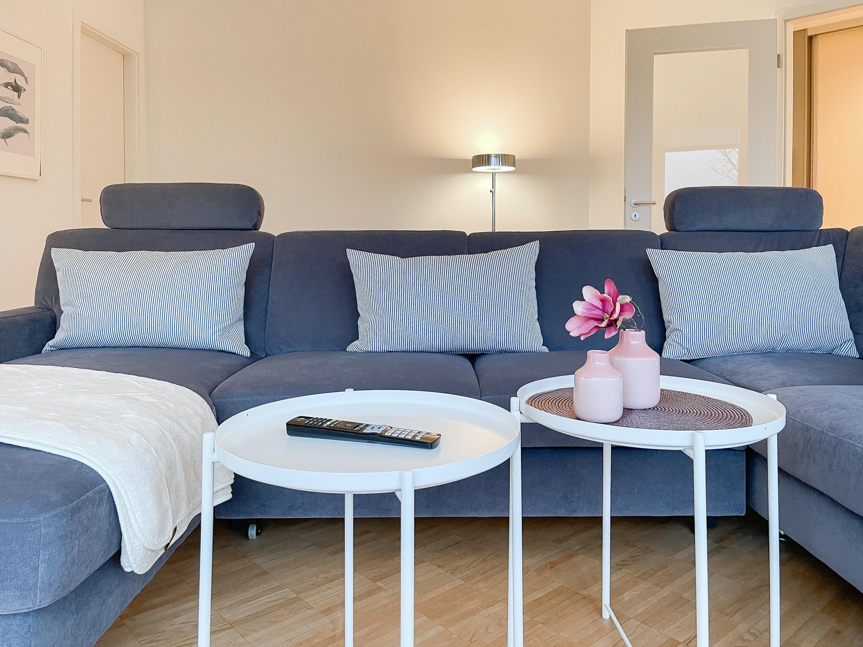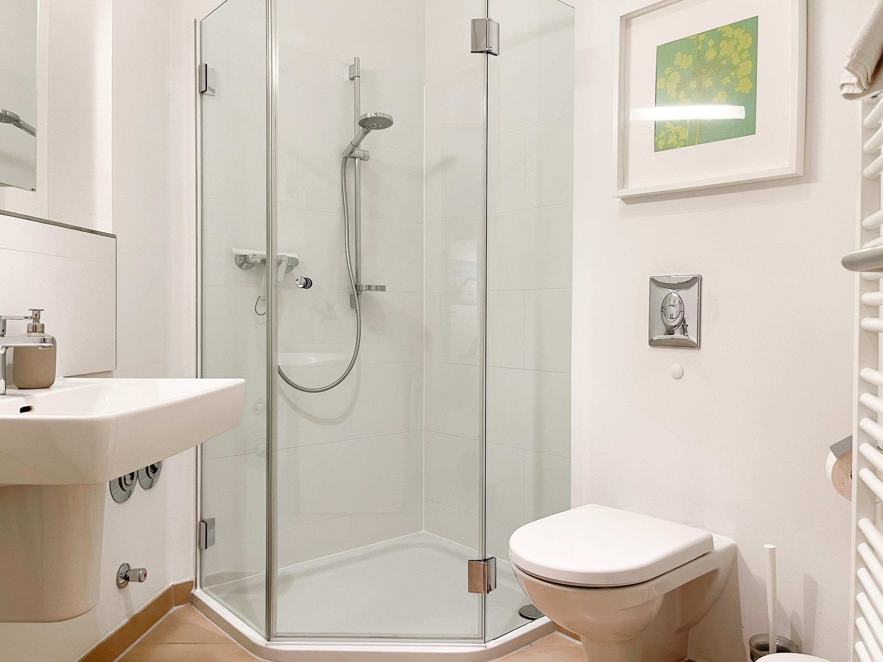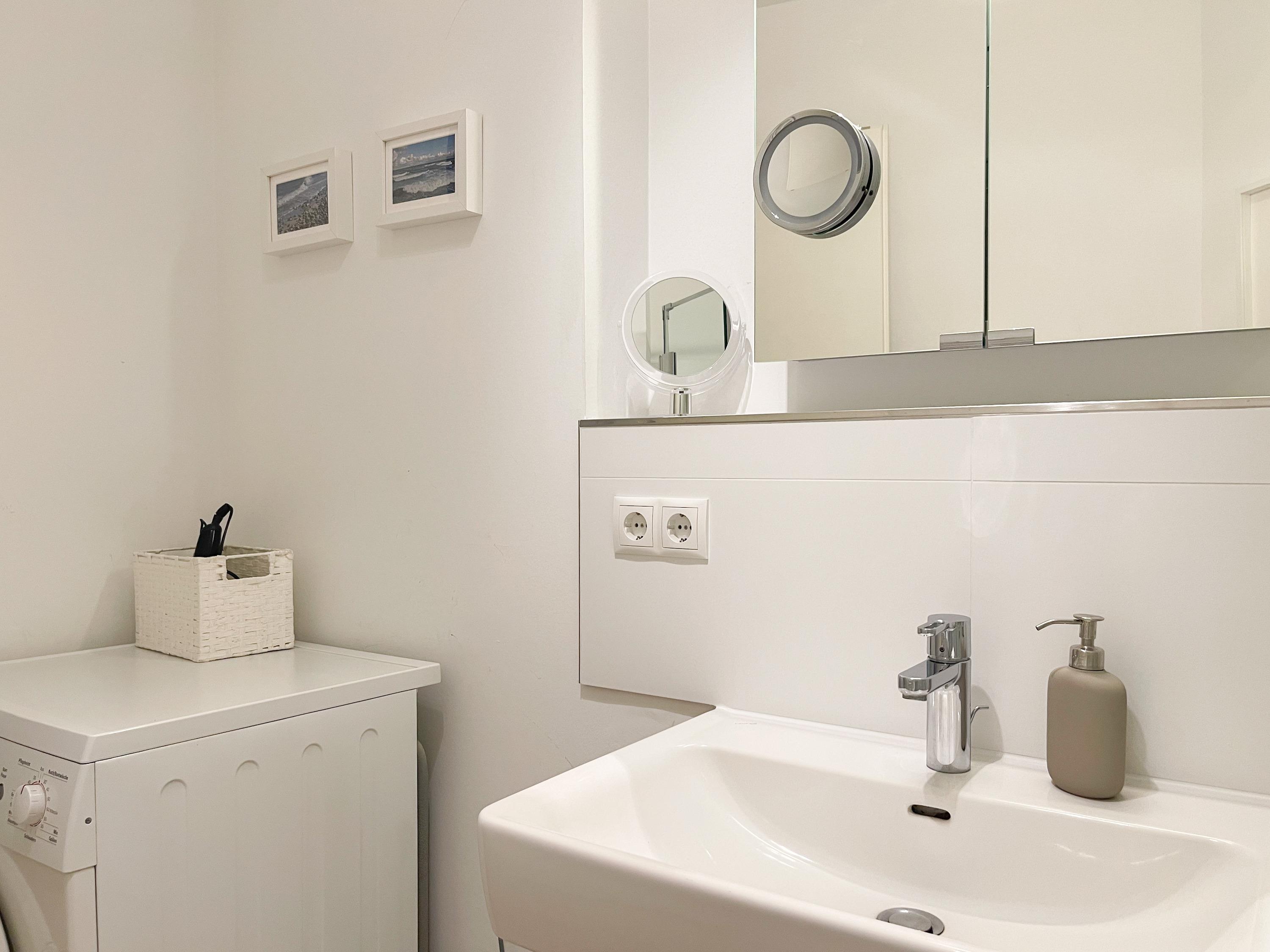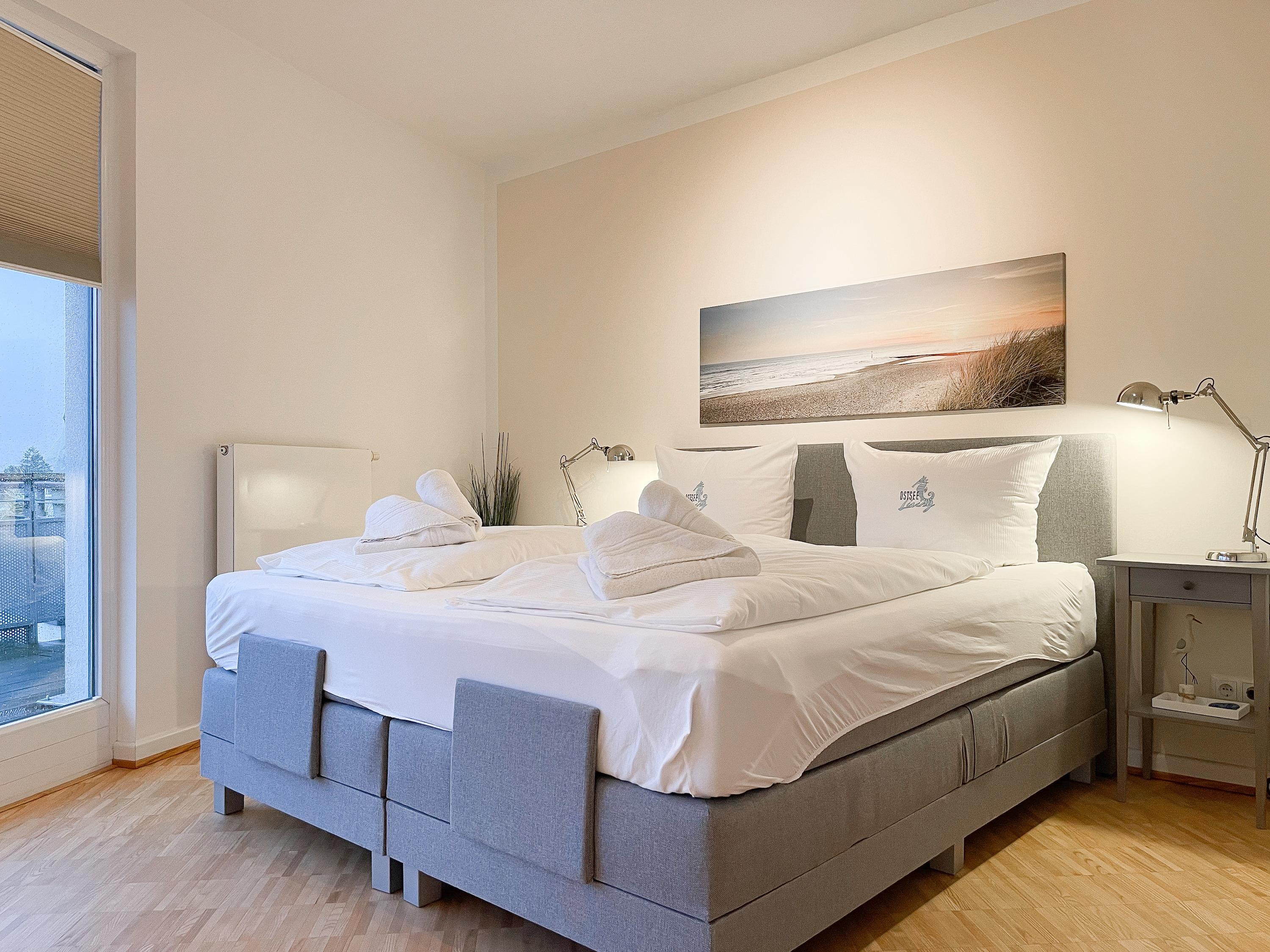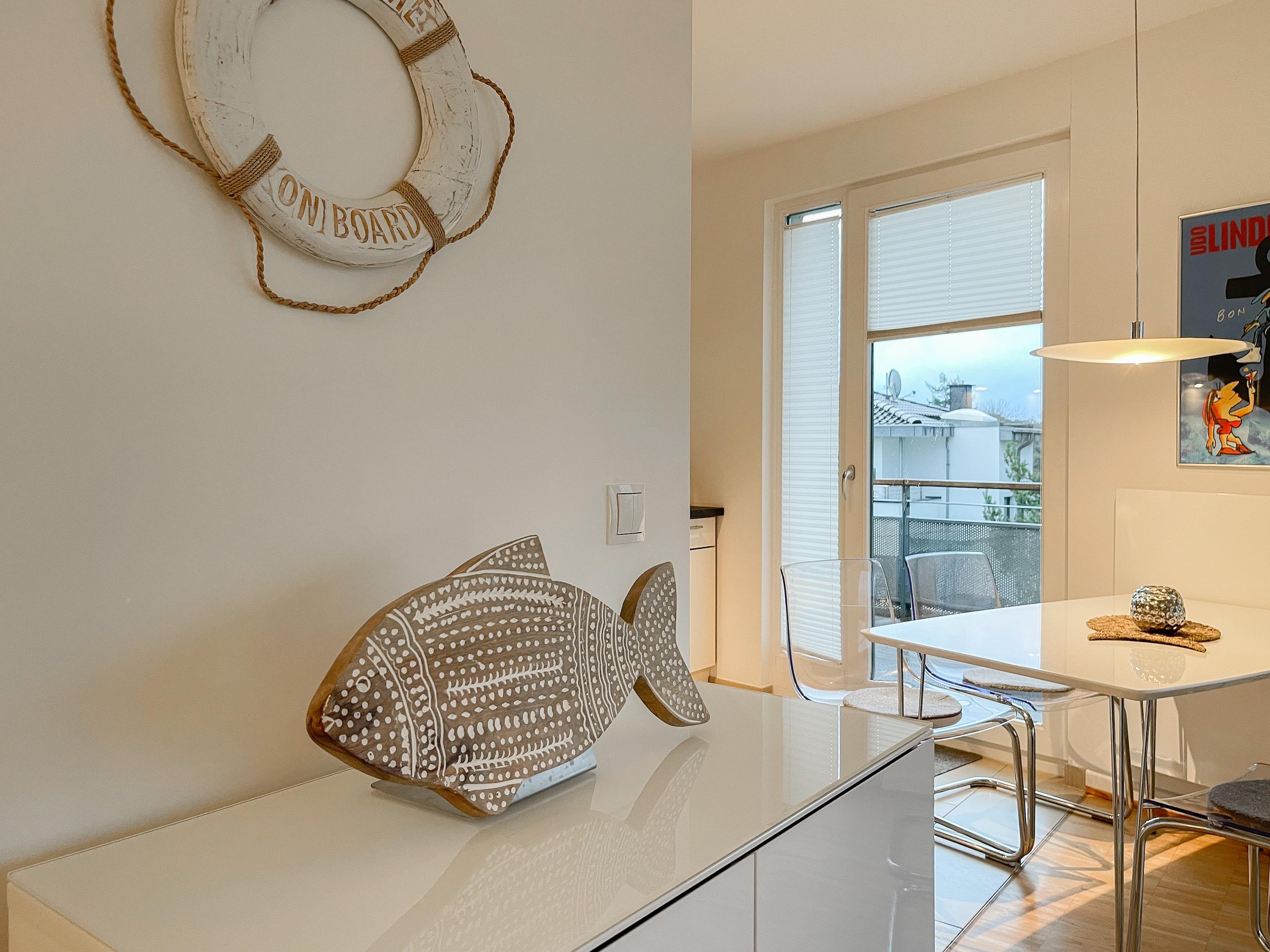 Es erwartet Sie ein heller, geschmackvoll gestalteter Wohnraum mit integriertem Schlafsofa (140x200), TV und kostenlosem Internetzugang über WLAN/LAN sowie die moderne, offene Einbauküche, bestens ausgestattet mit Kochfeld, Backofen, Mikrowelle und Geschirrspüler. Im großen Schlafraum mit Doppelbett (180x200) [nbsp]befindet sich ein hochwertiger Einbauschrank mit ausreichend Staufläche. Die Fenster sind mit Verdunkelungsplissees versehen. Im modernen Duschbad ist zusätzlich eine Waschmaschine integriert. Der gesamte Wohn- und Schlafbereich ist mit Echtholzparkett ausgestattet. Große, bodentiefe Fensterelemente im gesamten Penthouse, alle mit maßgeschneiderten Plissees versehen, geben viel Licht und ermöglichen einen phantastischen Ausblick.