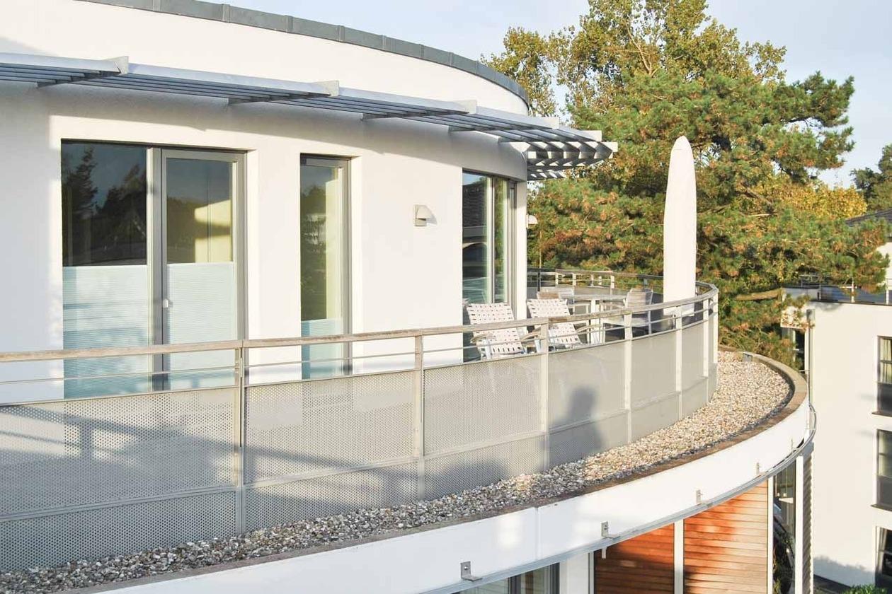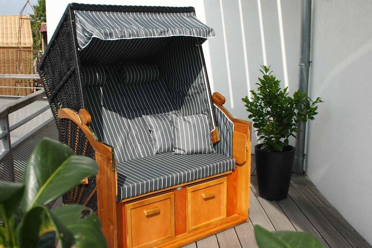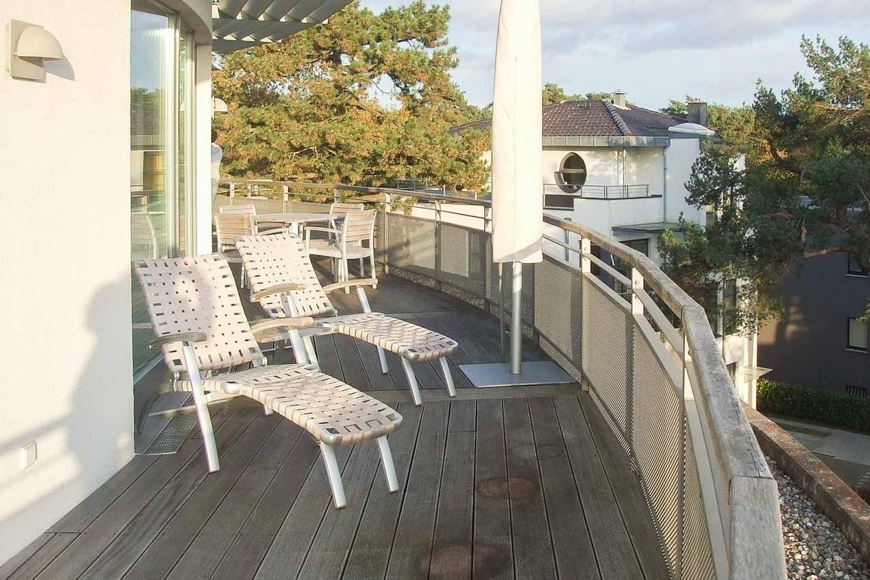 Penthousewohnung mit großer Dachterrasse, Meerblick und Strandkorb am Timmendorfer Strand für entspannte Urlaubstage.
