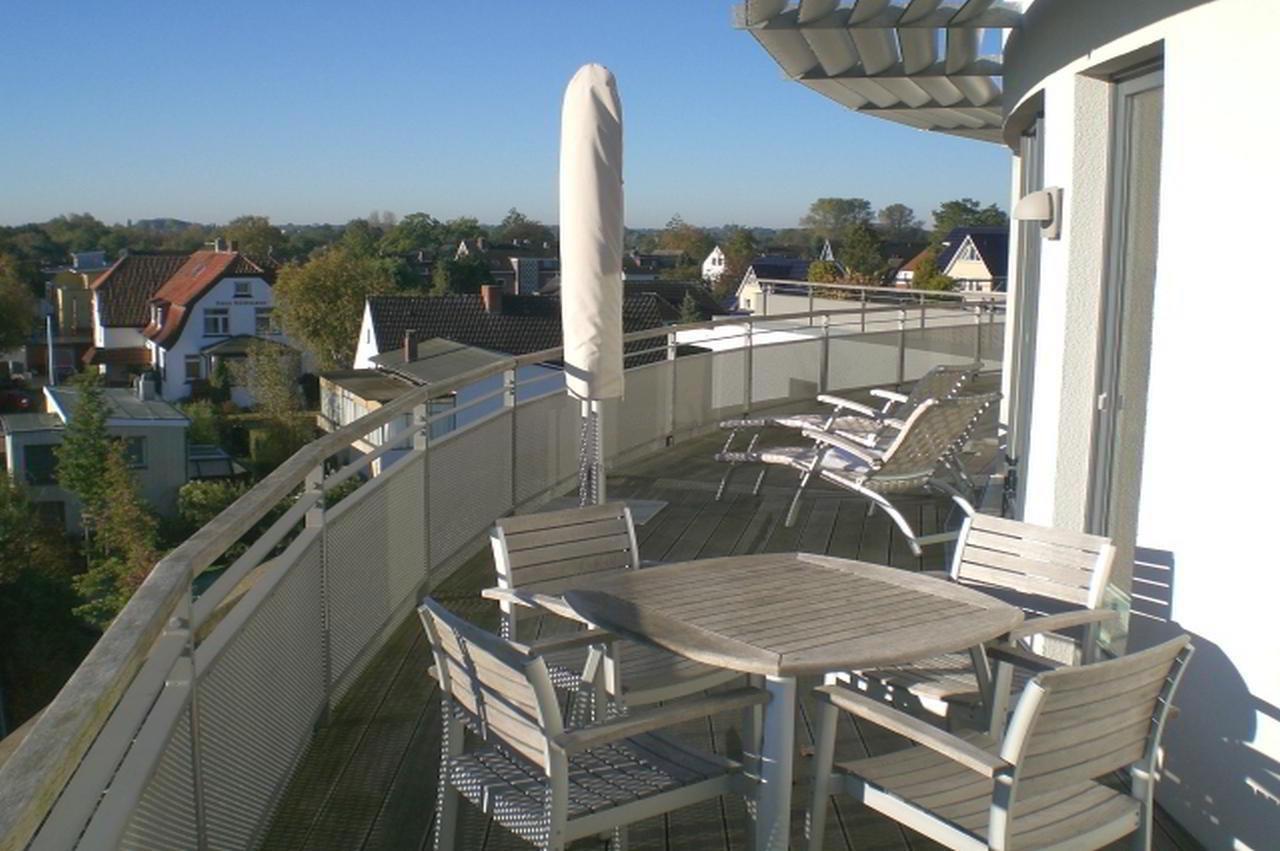 Traumhafte Penthousewohnung in erstklassiger Lage von Timmendorfer Strand nur wenige Meter vom Ostseestrand, der schönen Promenade und der Seeschlösschenbrücke entfernt. Riesige Fensterflächen und die knapp 50 qm große Dachterrasse, die sich um die gesamte Wohnung herumzieht und[nbsp] mit hochwertigen Gartenmöbeln und einem Strandkorb ausgestattet ist, machen dieses Objekt zu etwas Besonderem. Sonne von früh bis spät und ein kleiner Blick auf die Ostsee in östlicher Richtung von der Dachterrasse.