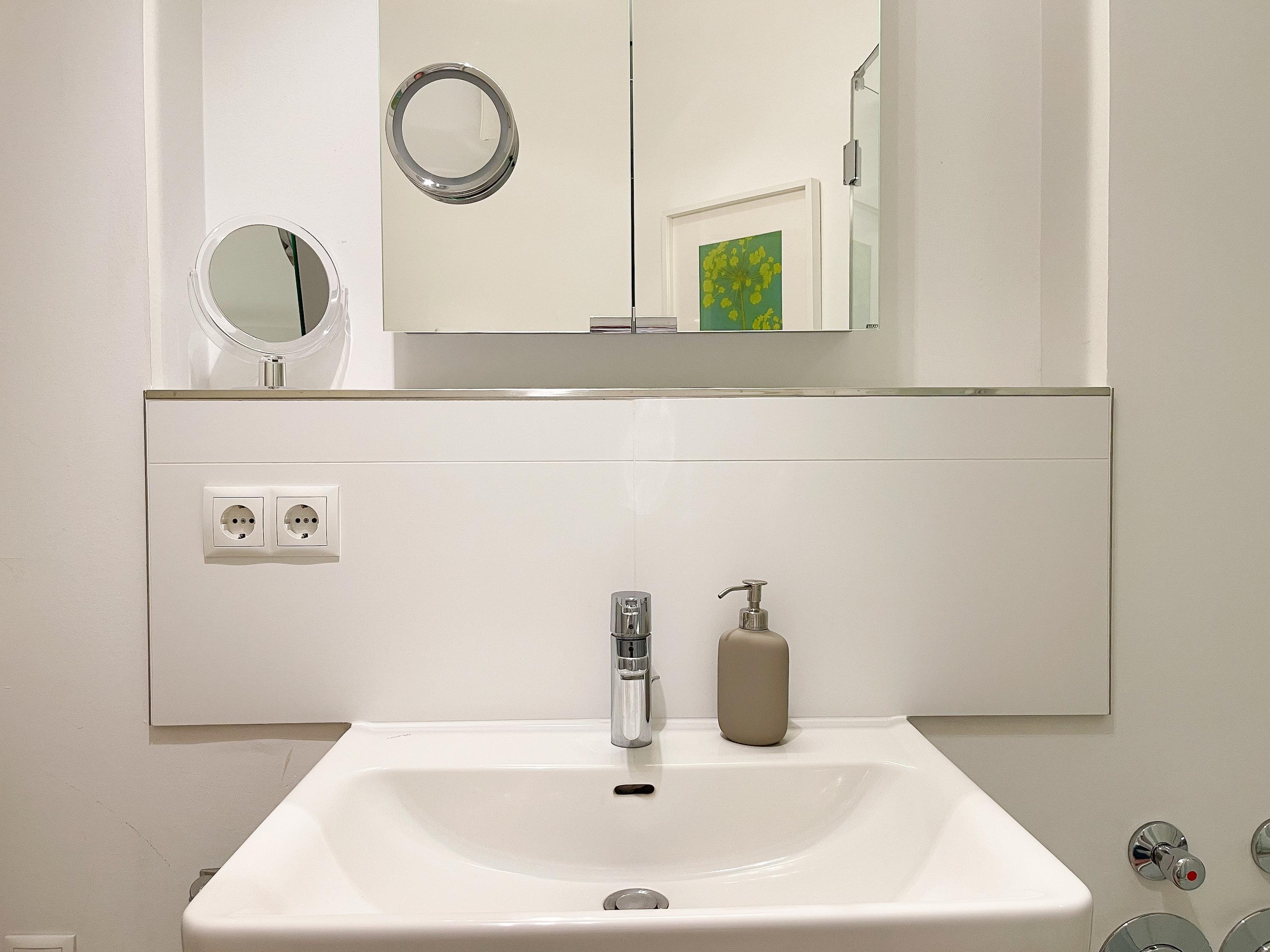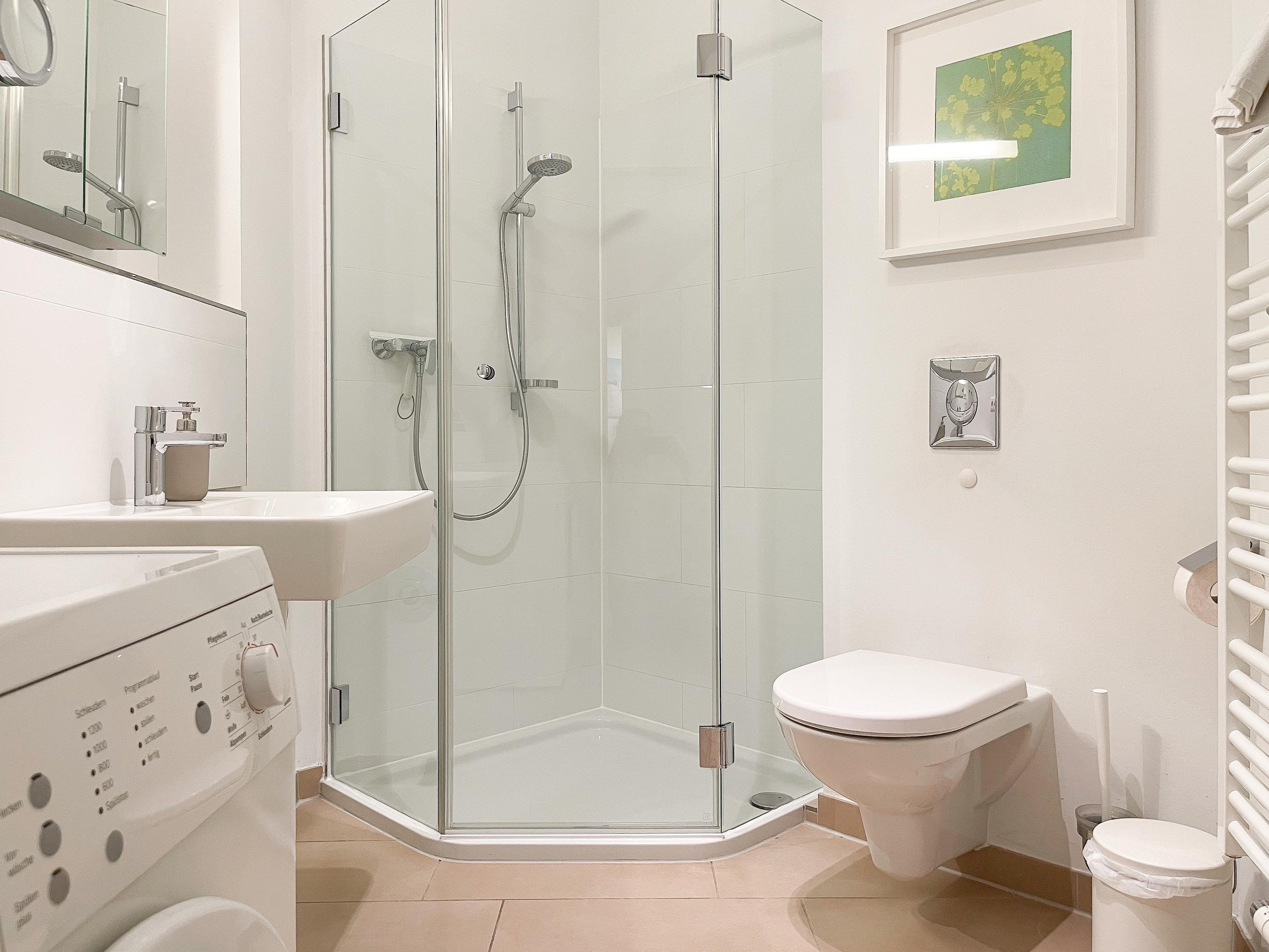 Zum Penthouse gehört ein Tiefgaragenstellplatz (Einfahrtshöhe 1,90 m). Das Haus verfügt über einen Fahrstuhl, Fahrradkeller sowie Fahrradstellplätze im Außenbereich. Münz-Waschmaschine und Trockner befinden sich im Gemeinschaftskeller.